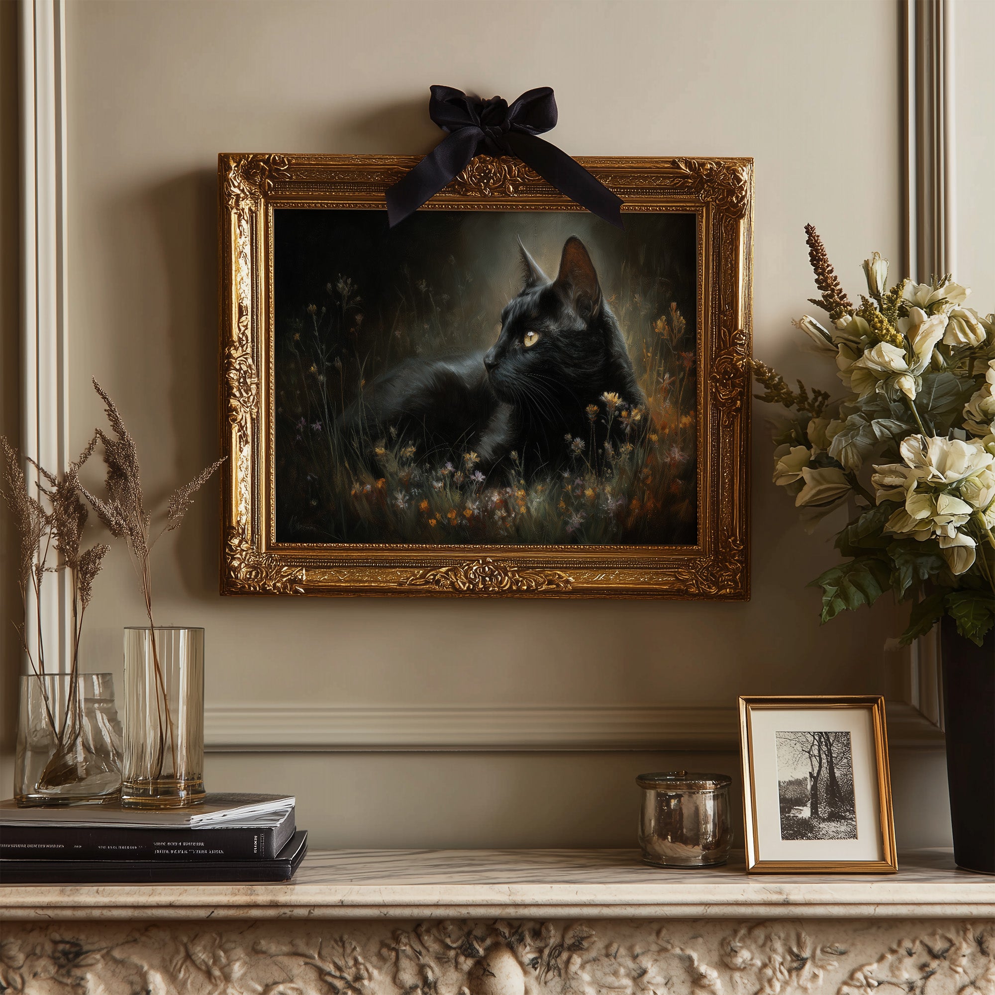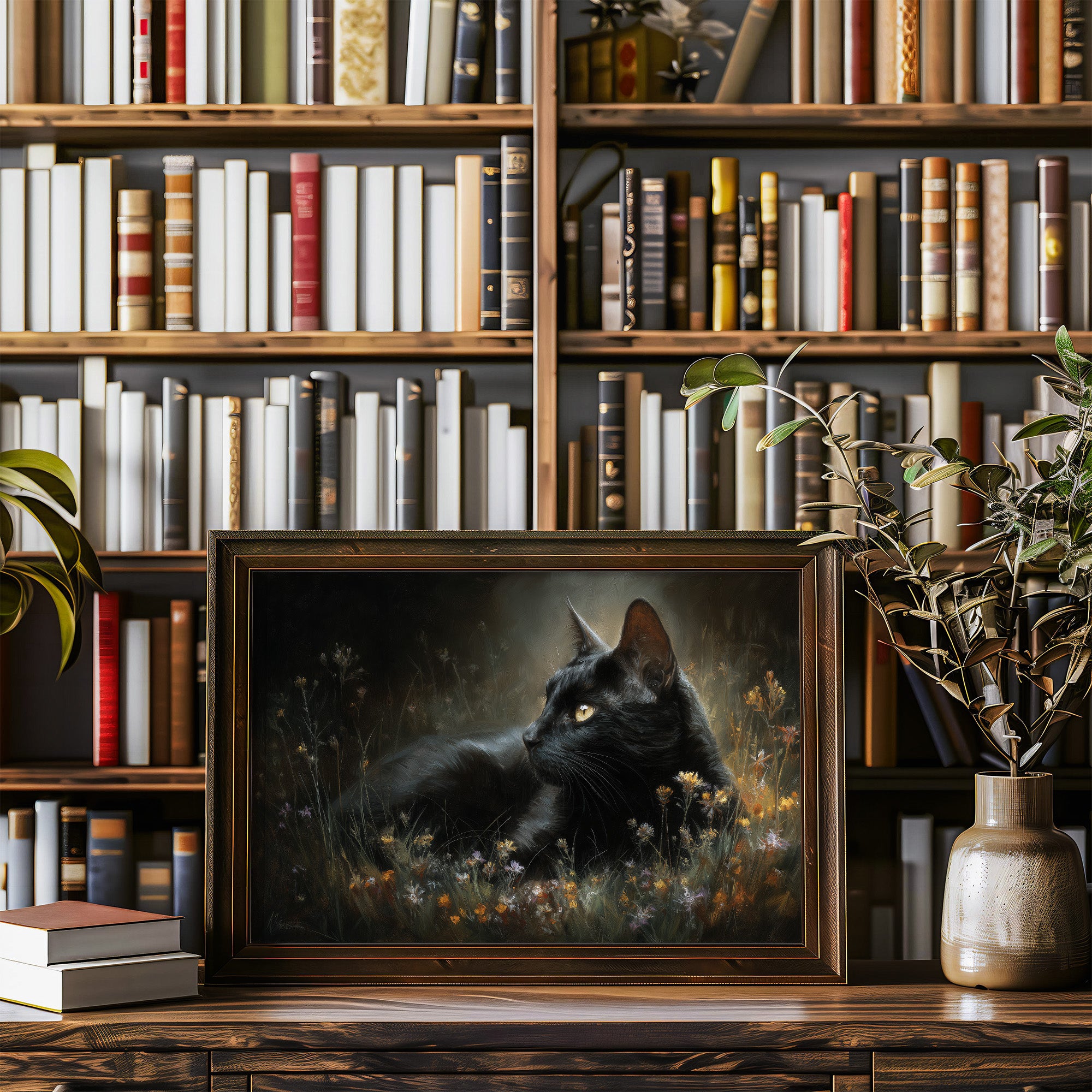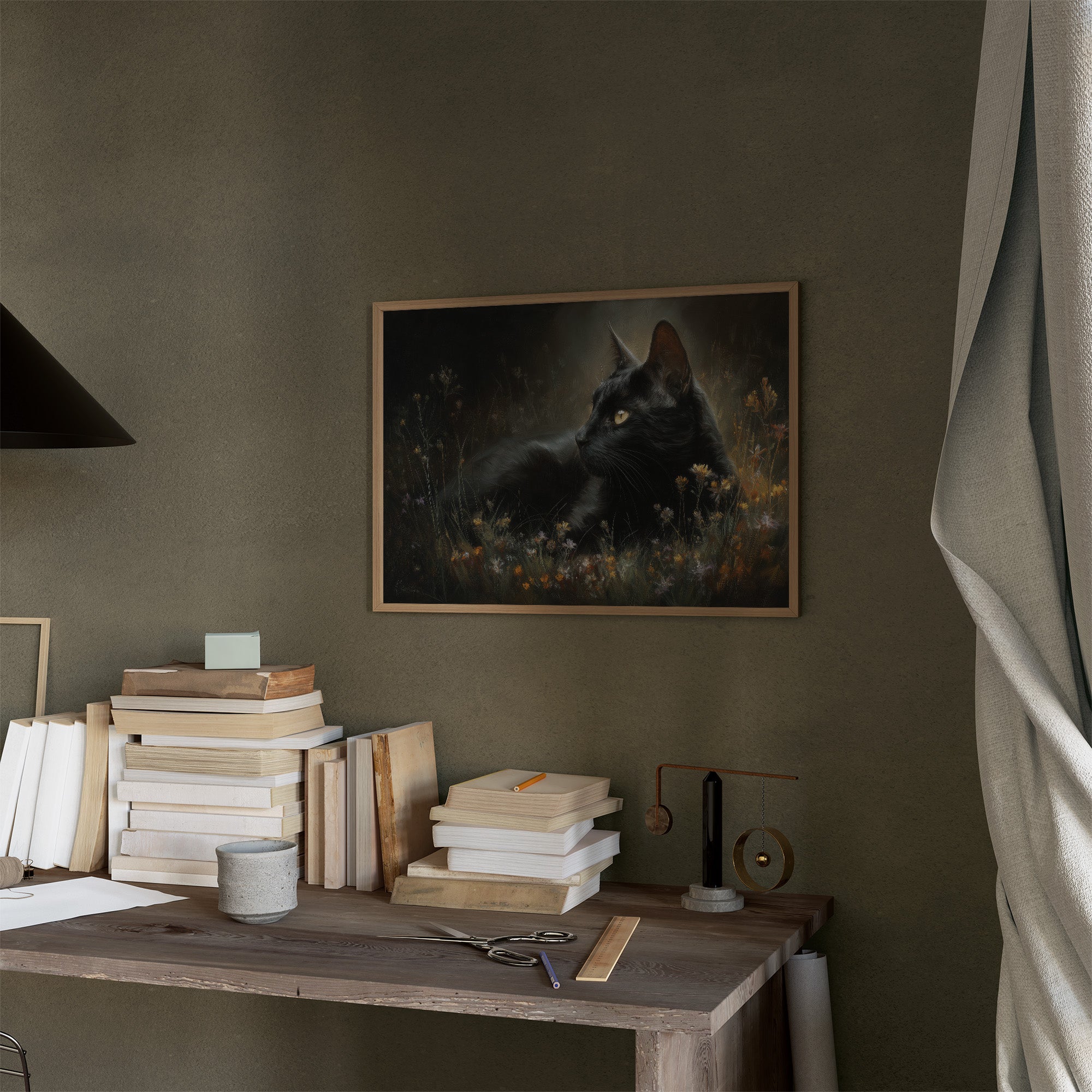 Amber eyes gleam with ancient knowing against a backdrop of twilight meadow blooms. The black cat's sleek form emerges from darkness, surrounded by delicate wildflowers that seem to glow with their own quiet light. Rich, moody tones create a mystical atmosphere where feline grace meets untamed nature, the portrait capturing that liminal space between domesticity and wilderness. Perfect for a home library or reading nook where thoughtful contemplation meets artistic expression.