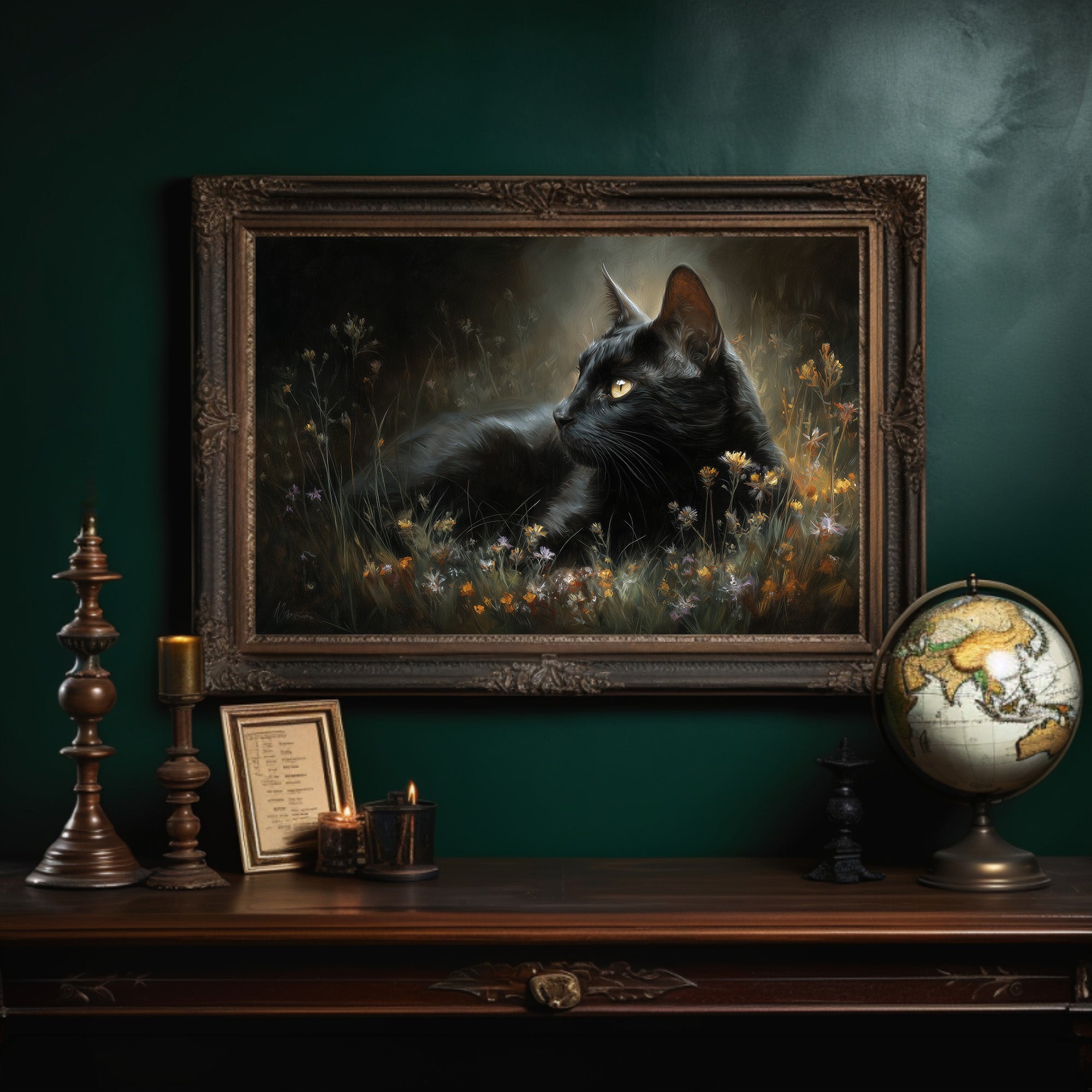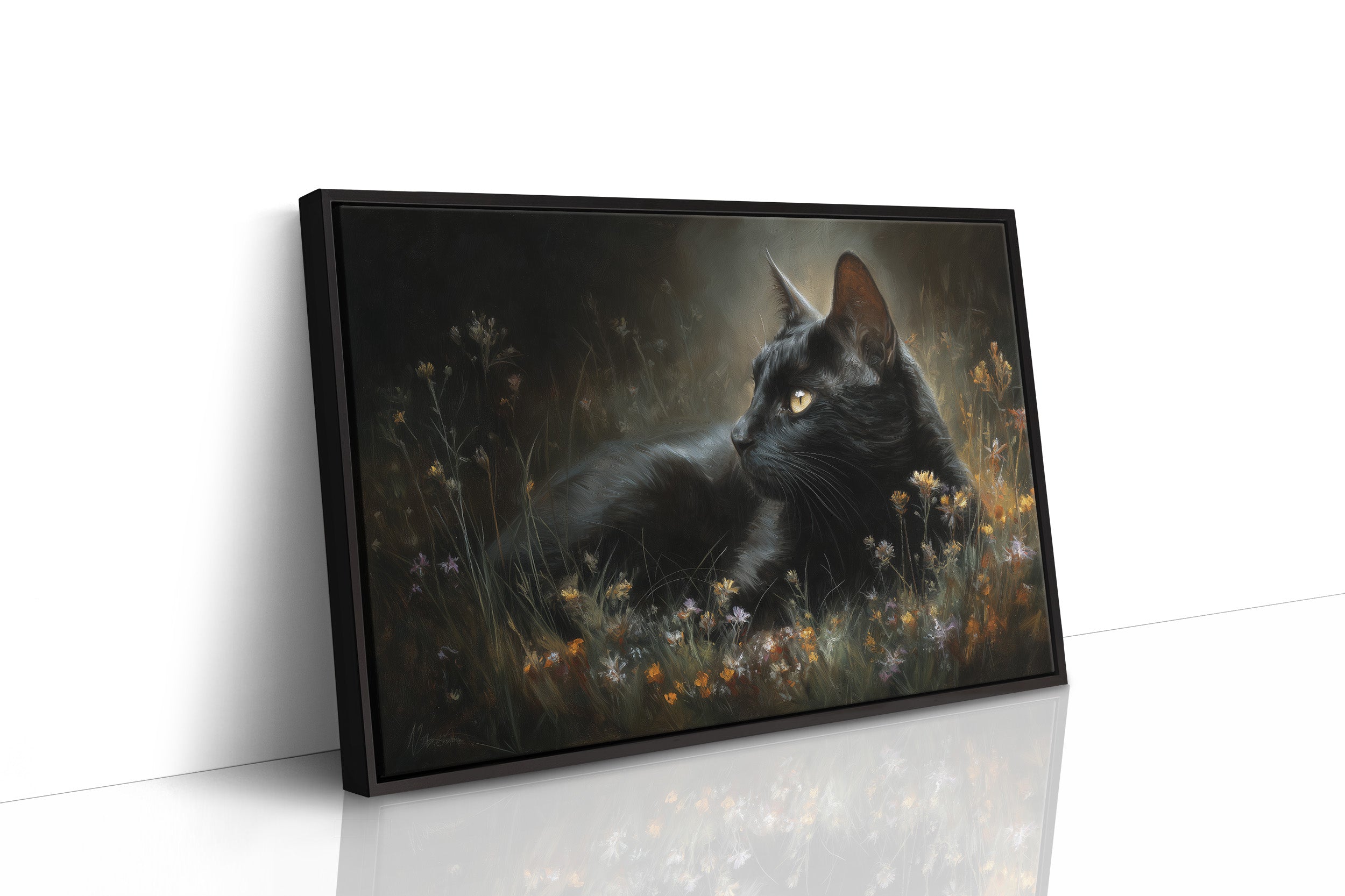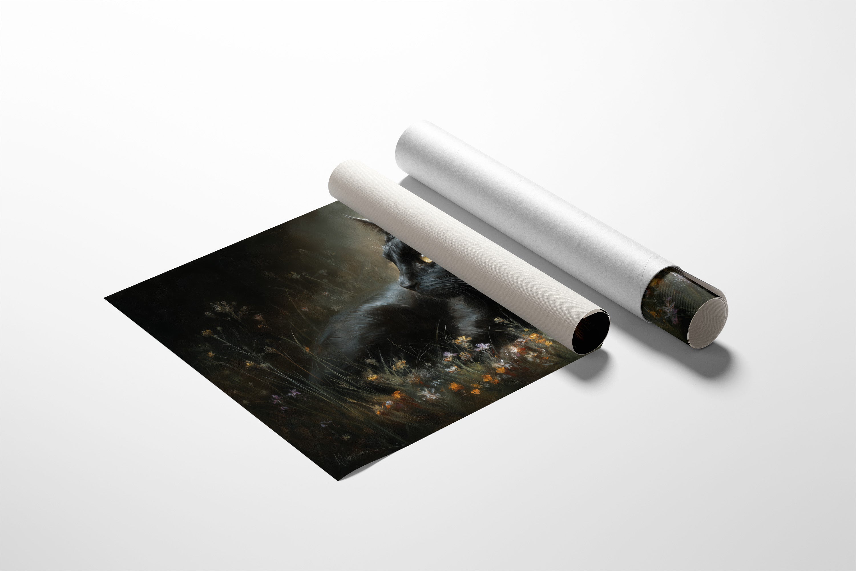 Amber eyes gleam with ancient knowing against a backdrop of twilight meadow blooms. The black cat's sleek form emerges from darkness, surrounded by delicate wildflowers that seem to glow with their own quiet light. Rich, moody tones create a mystical atmosphere where feline grace meets untamed nature, the portrait capturing that liminal space between domesticity and wilderness. Perfect for a home library or reading nook where thoughtful contemplation meets artistic expression.