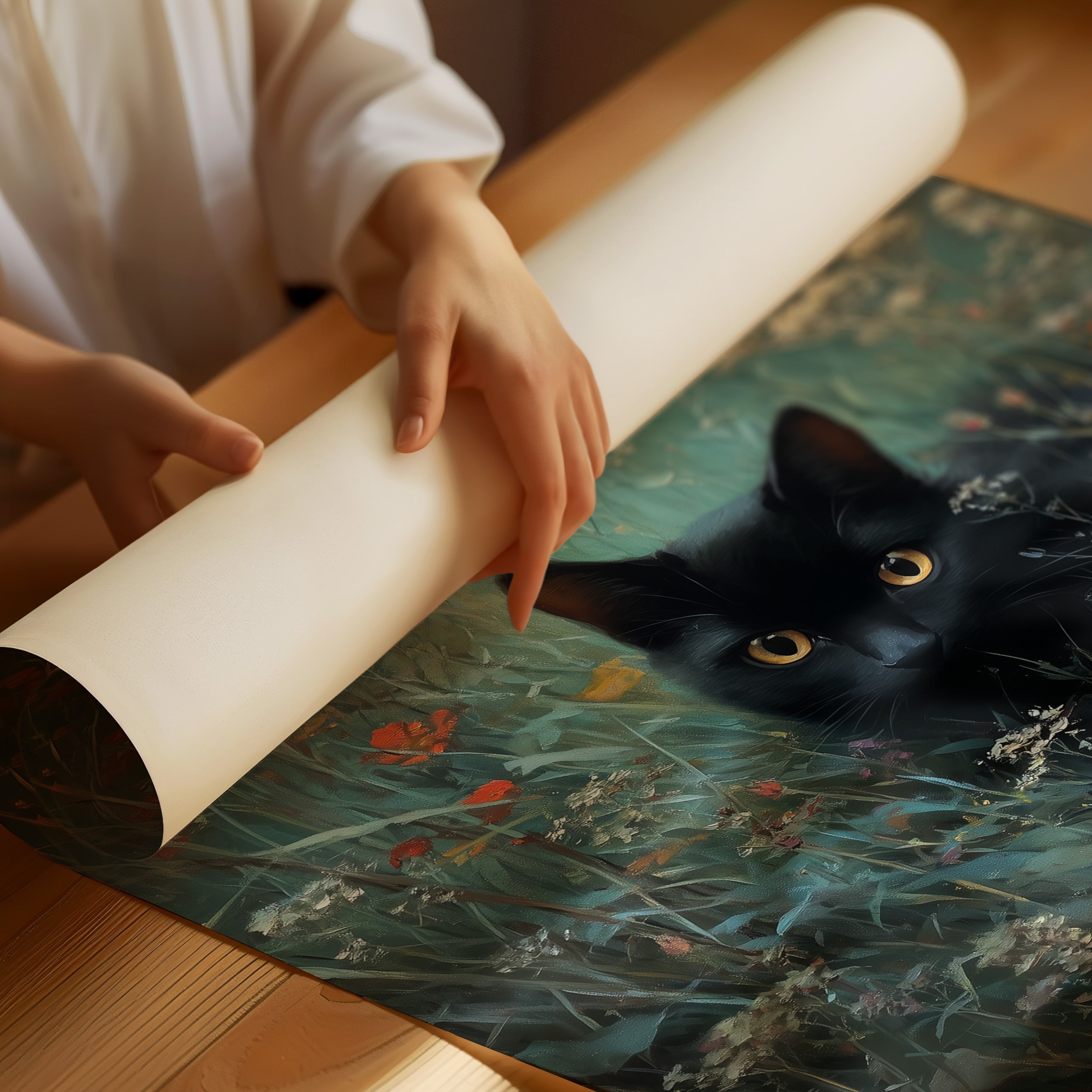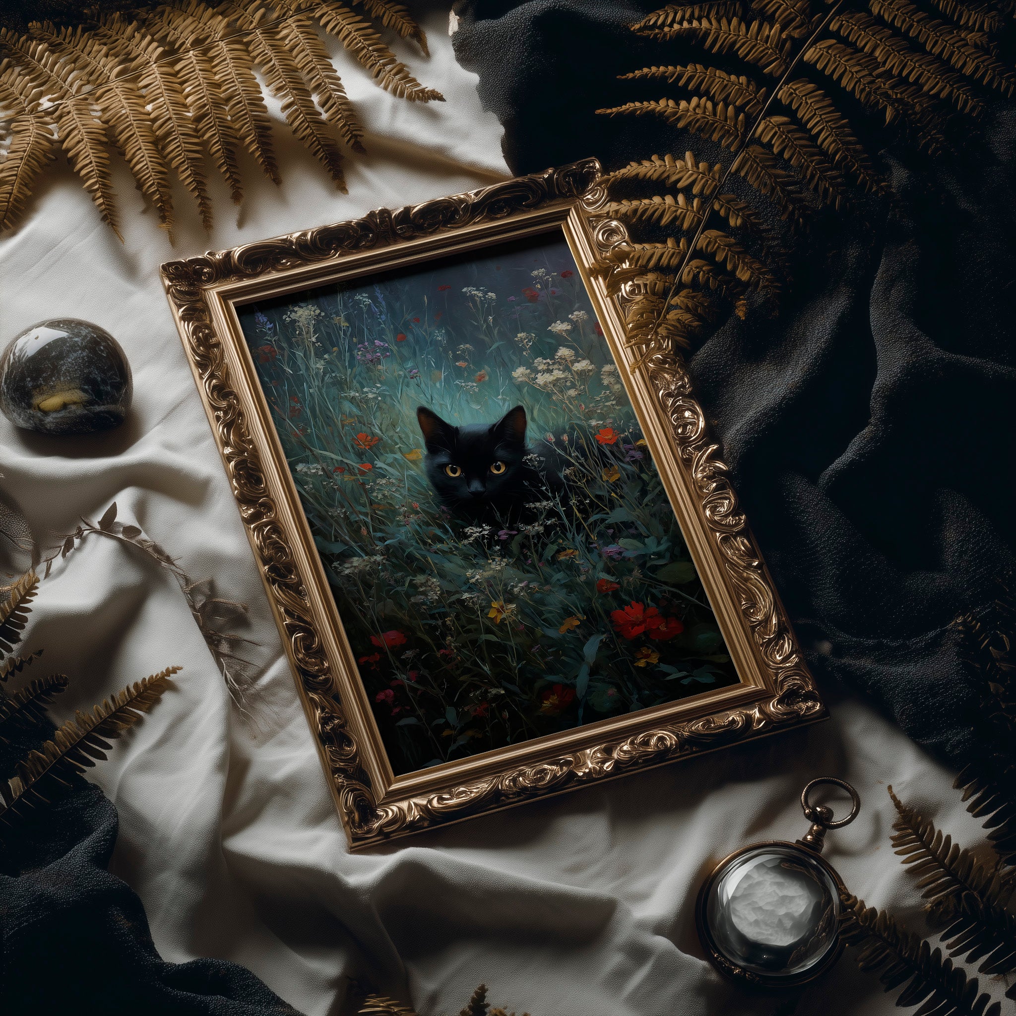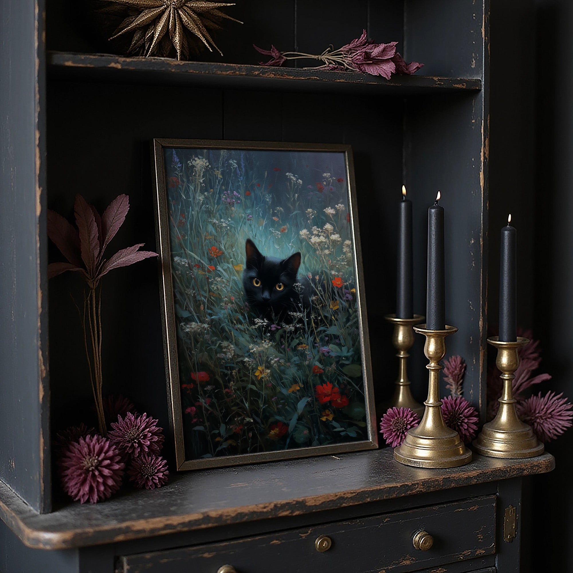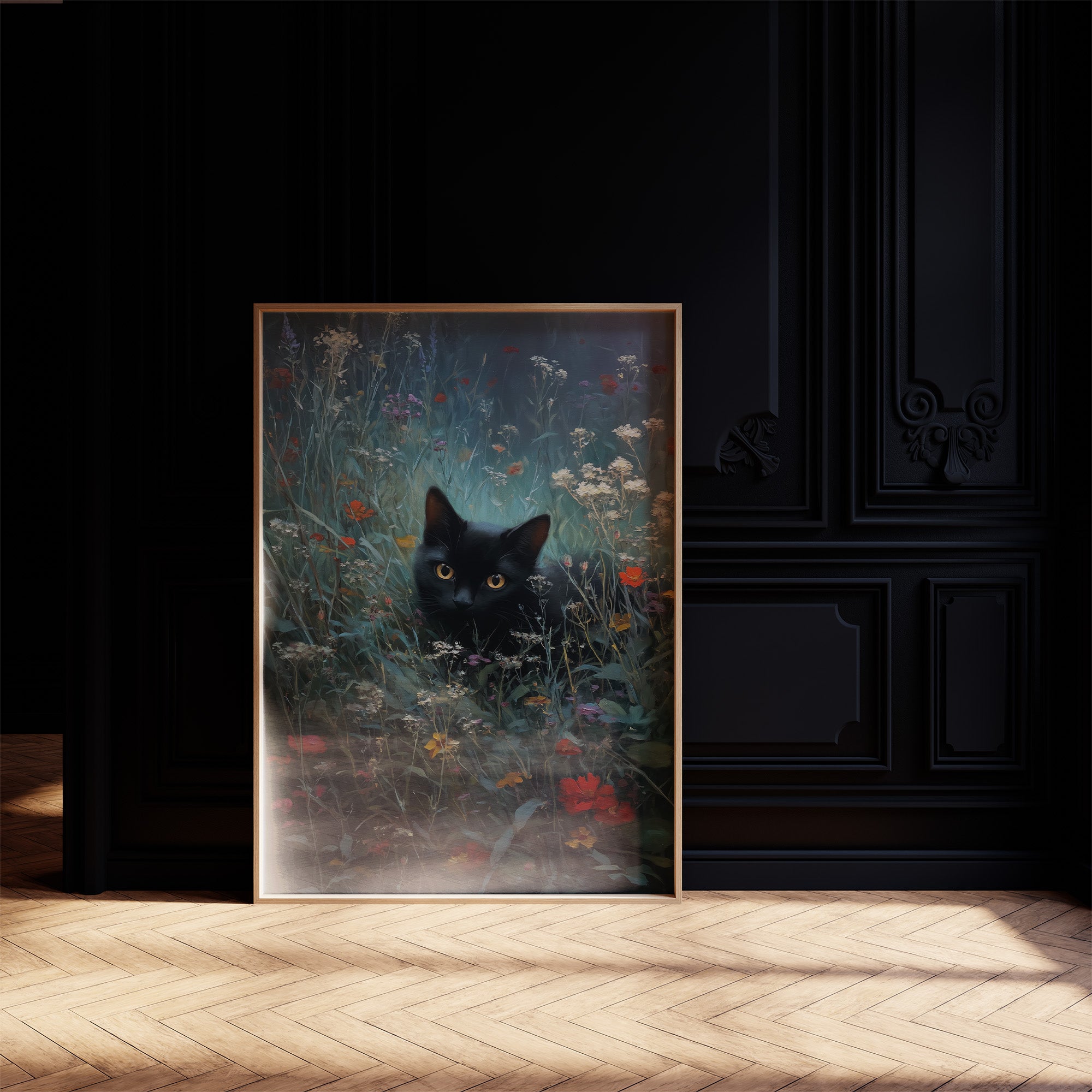 Golden eyes pierce through a veil of summer blooms, watching with quiet intensity. A black cat nestles among delicate white queen anne's lace and vibrant poppies, its sleek form almost becoming one with the twilight meadow surrounding it. The mysterious feline presence against the painterly wildflower backdrop creates a captivating contrast between the domestic and the wild, the dark and the colorful.