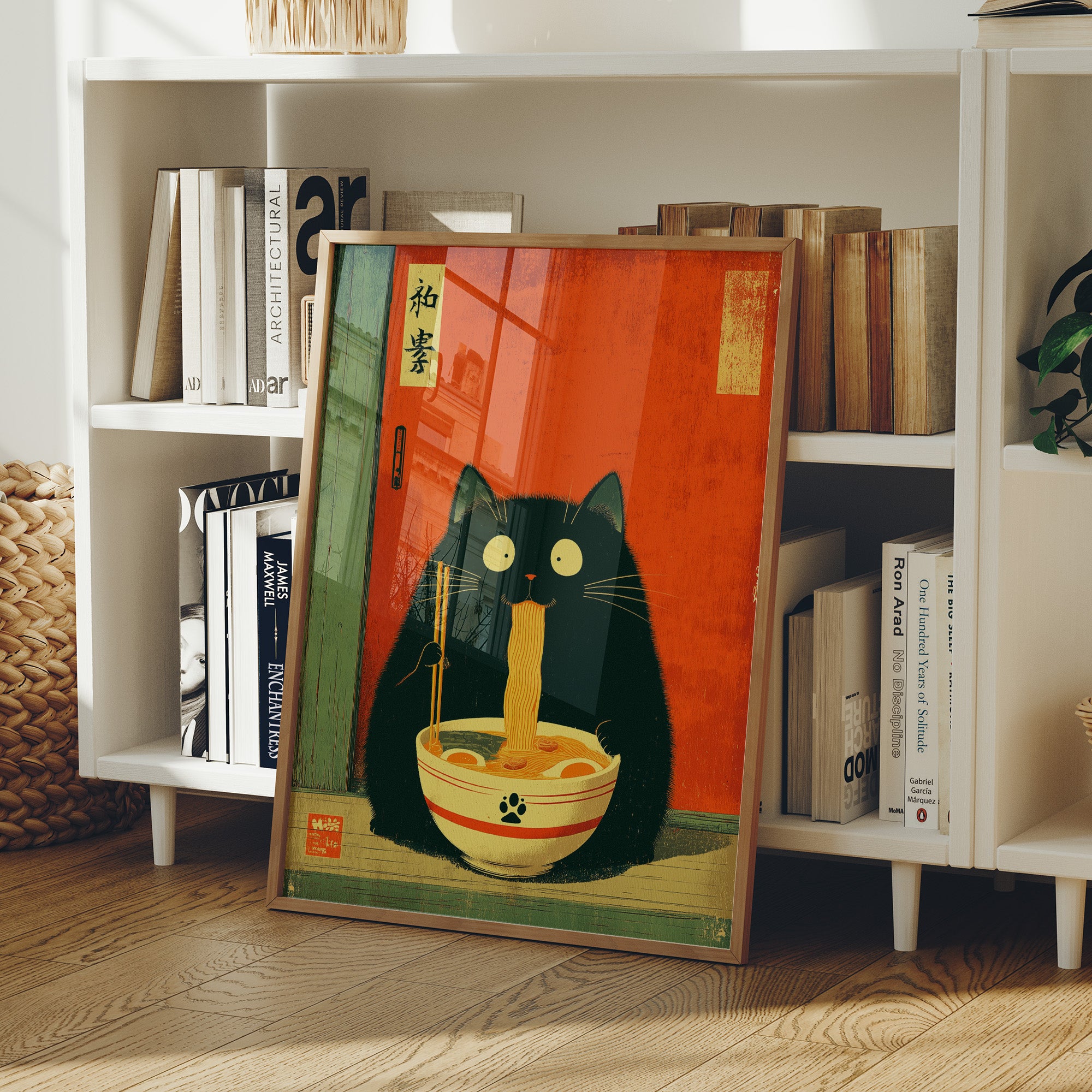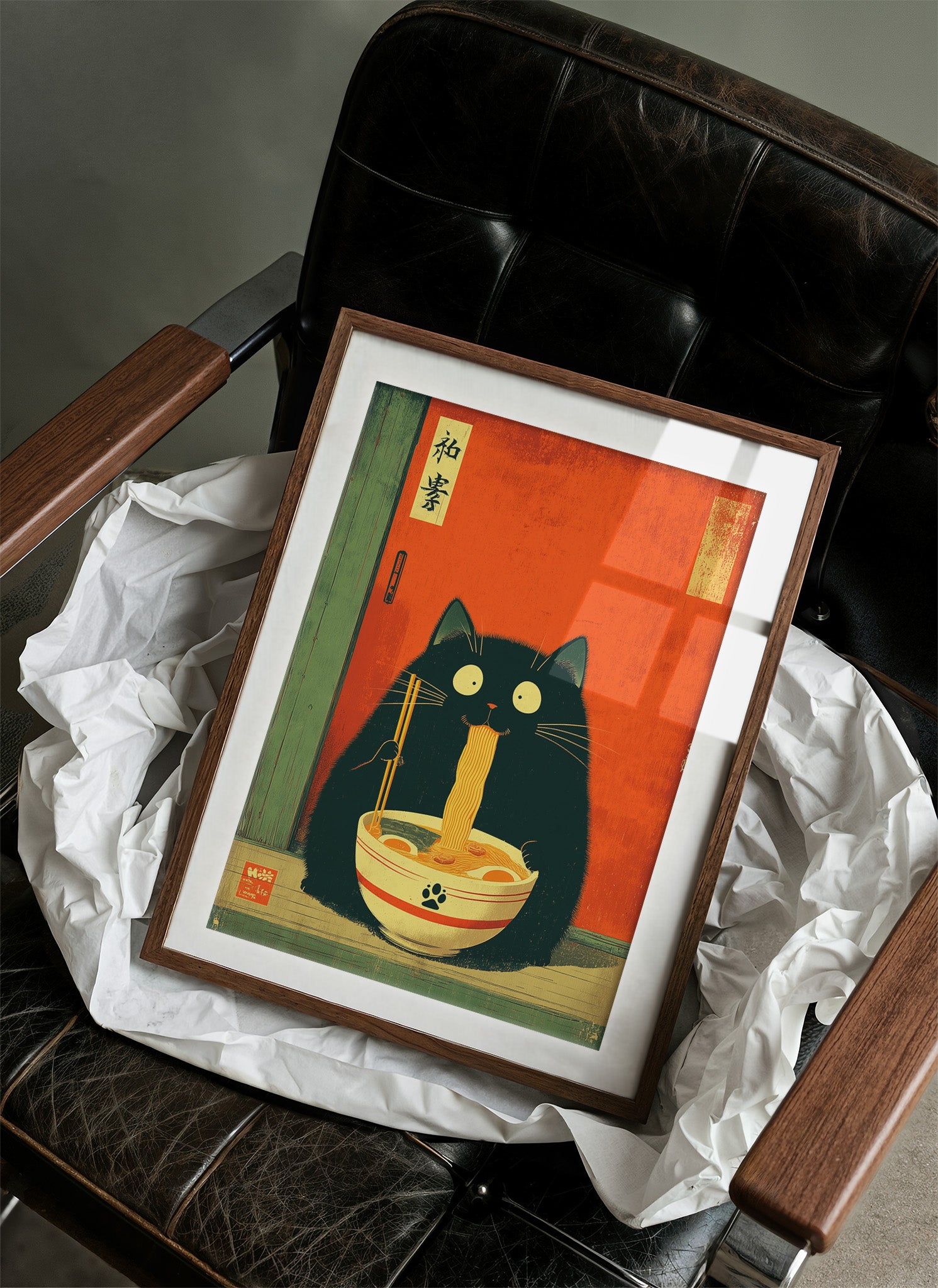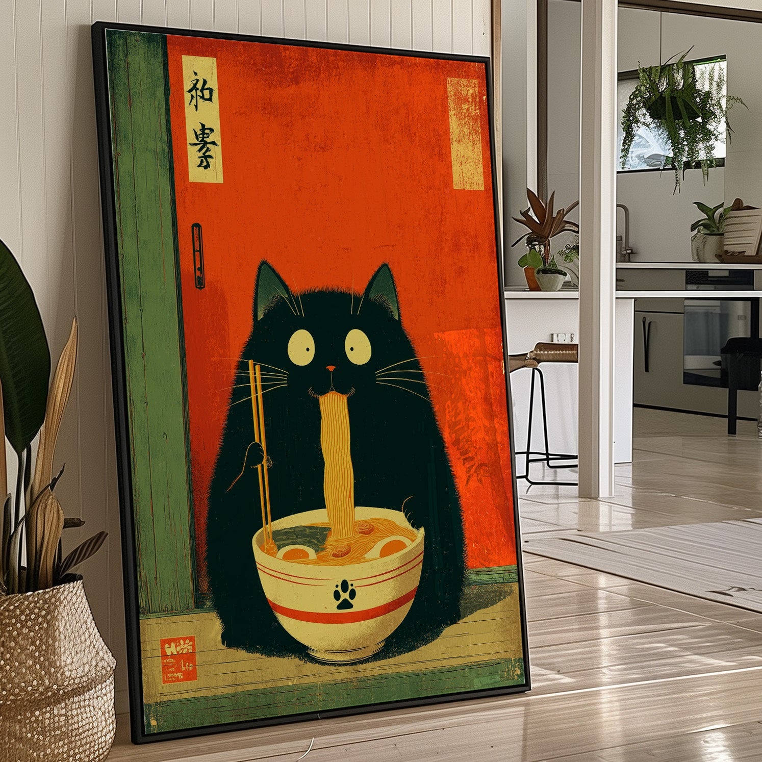 A playful moment captures a wide-eyed black cat savoring a steaming bowl of ramen against a vibrant red background. The illustration merges traditional Japanese aesthetics with modern whimsy, featuring bold colors and simple shapes that tell a story of comfort and contentment. The contrast between the cat's dark silhouette and the warm golden noodles creates a striking visual harmony, while Chinese characters and traditional elements add authentic cultural depth. This piece would bring a delightful pop of color and charm to a kitchen, dining room, or any space needing a touch of artistic joy.