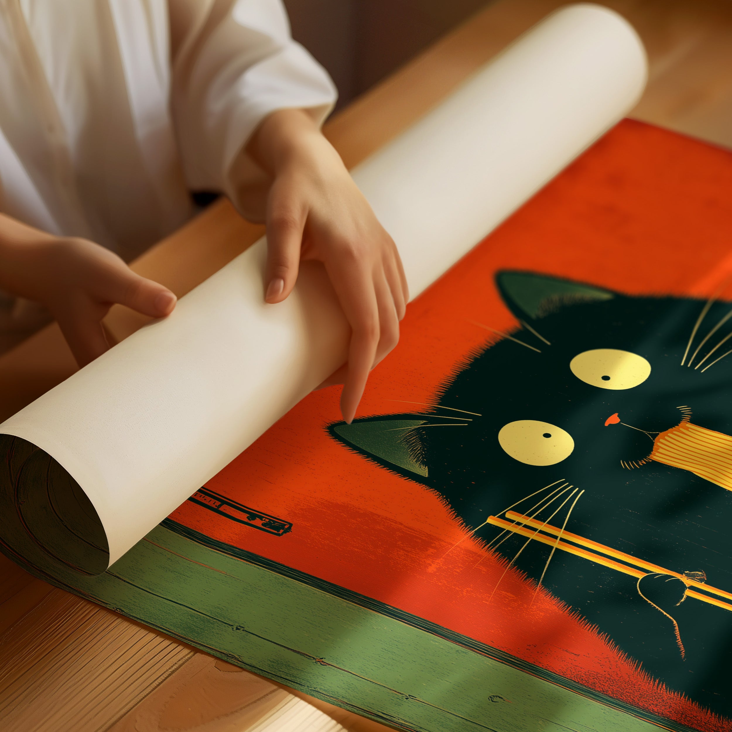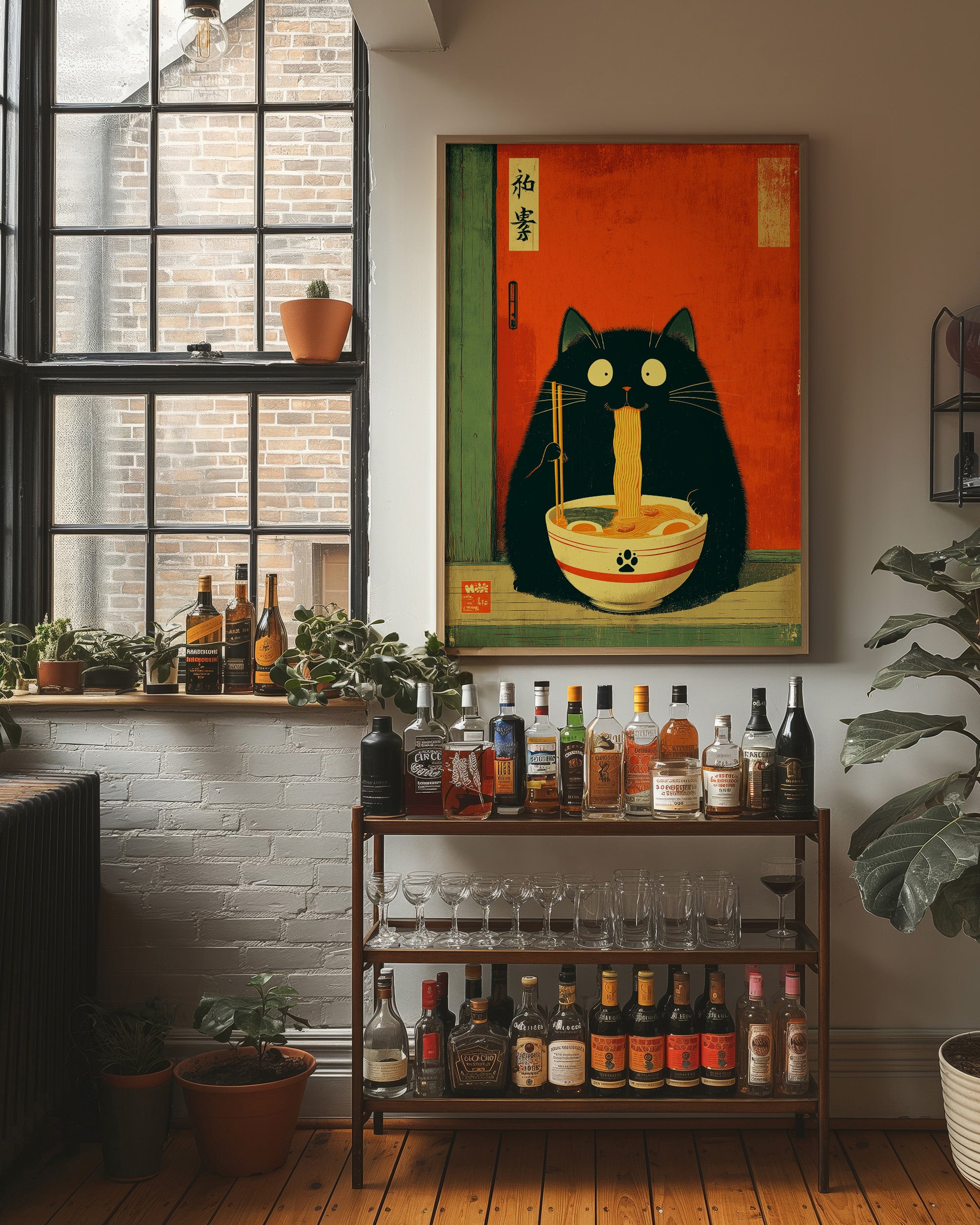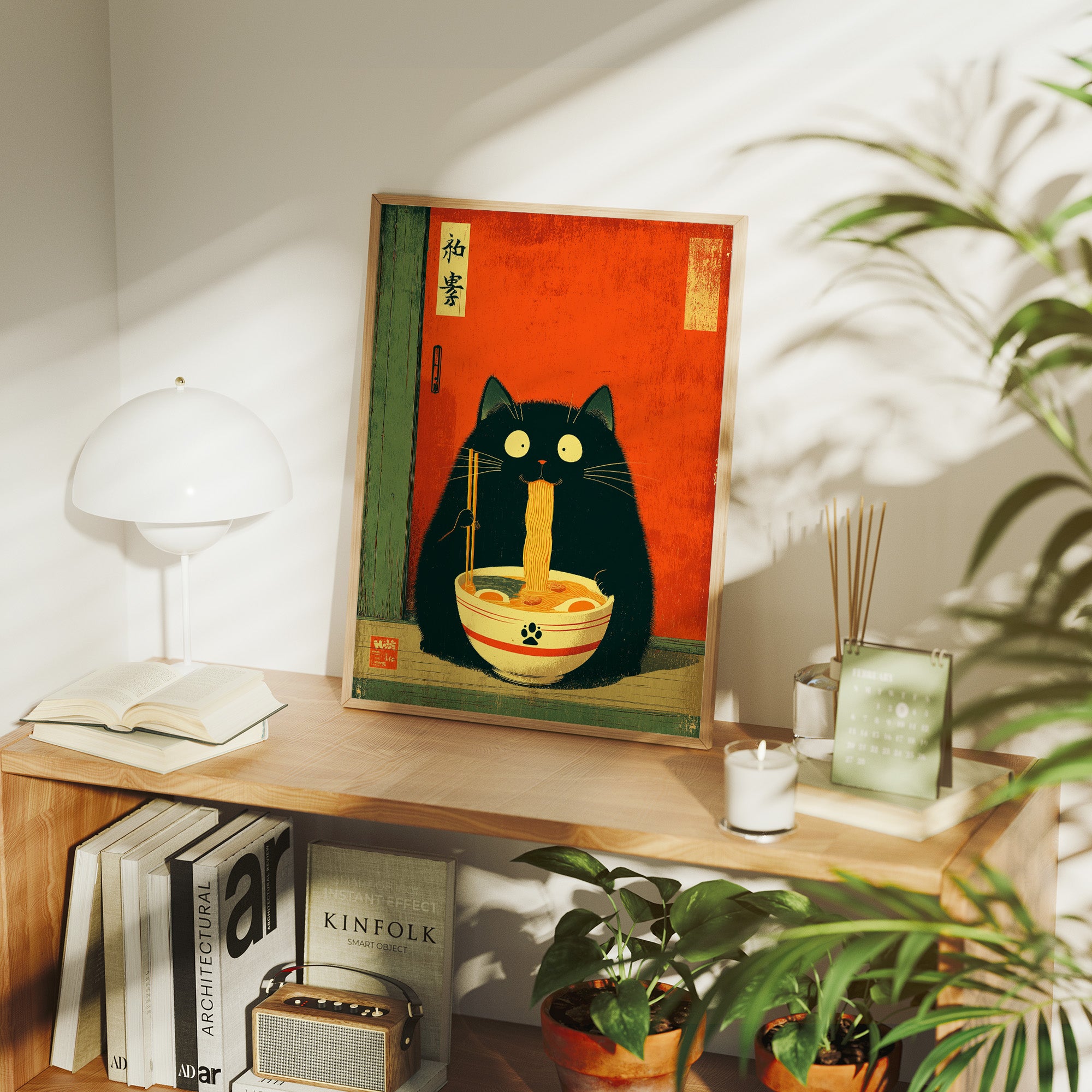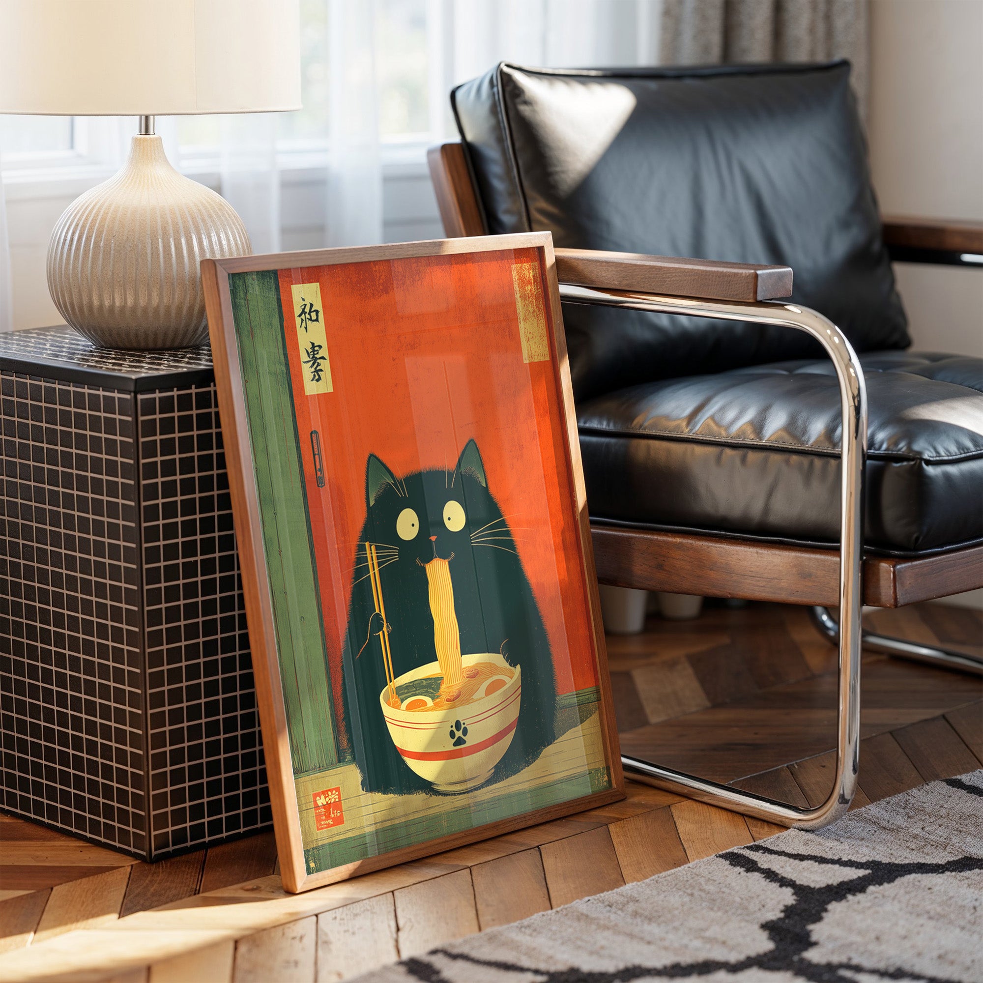 A playful moment captures a wide-eyed black cat savoring a steaming bowl of ramen against a vibrant red background. The illustration merges traditional Japanese aesthetics with modern whimsy, featuring bold colors and simple shapes that tell a story of comfort and contentment. The contrast between the cat's dark silhouette and the warm golden noodles creates a striking visual harmony, while Chinese characters and traditional elements add authentic cultural depth. This piece would bring a delightful pop of color and charm to a kitchen, dining room, or any space needing a touch of artistic joy.