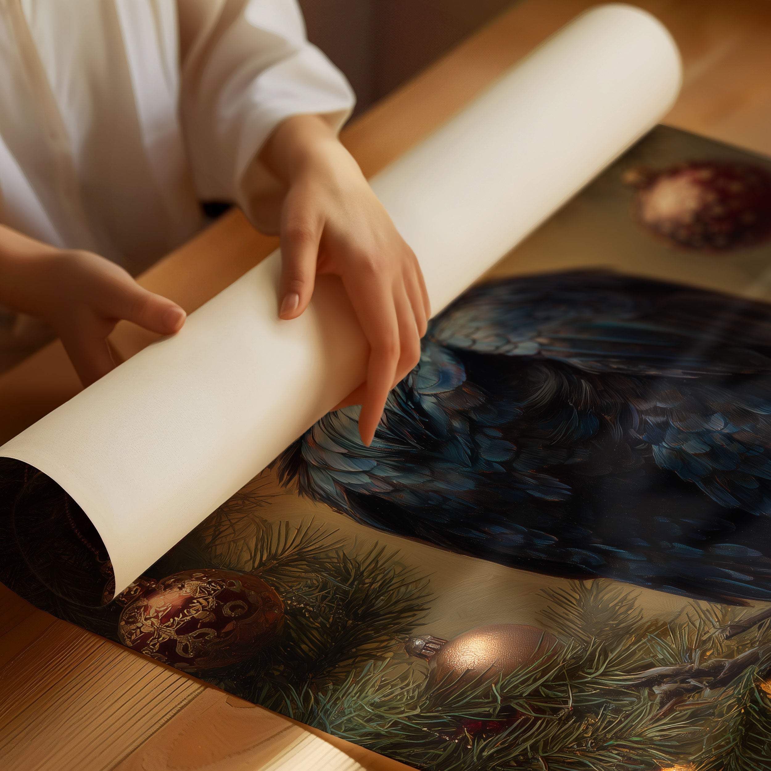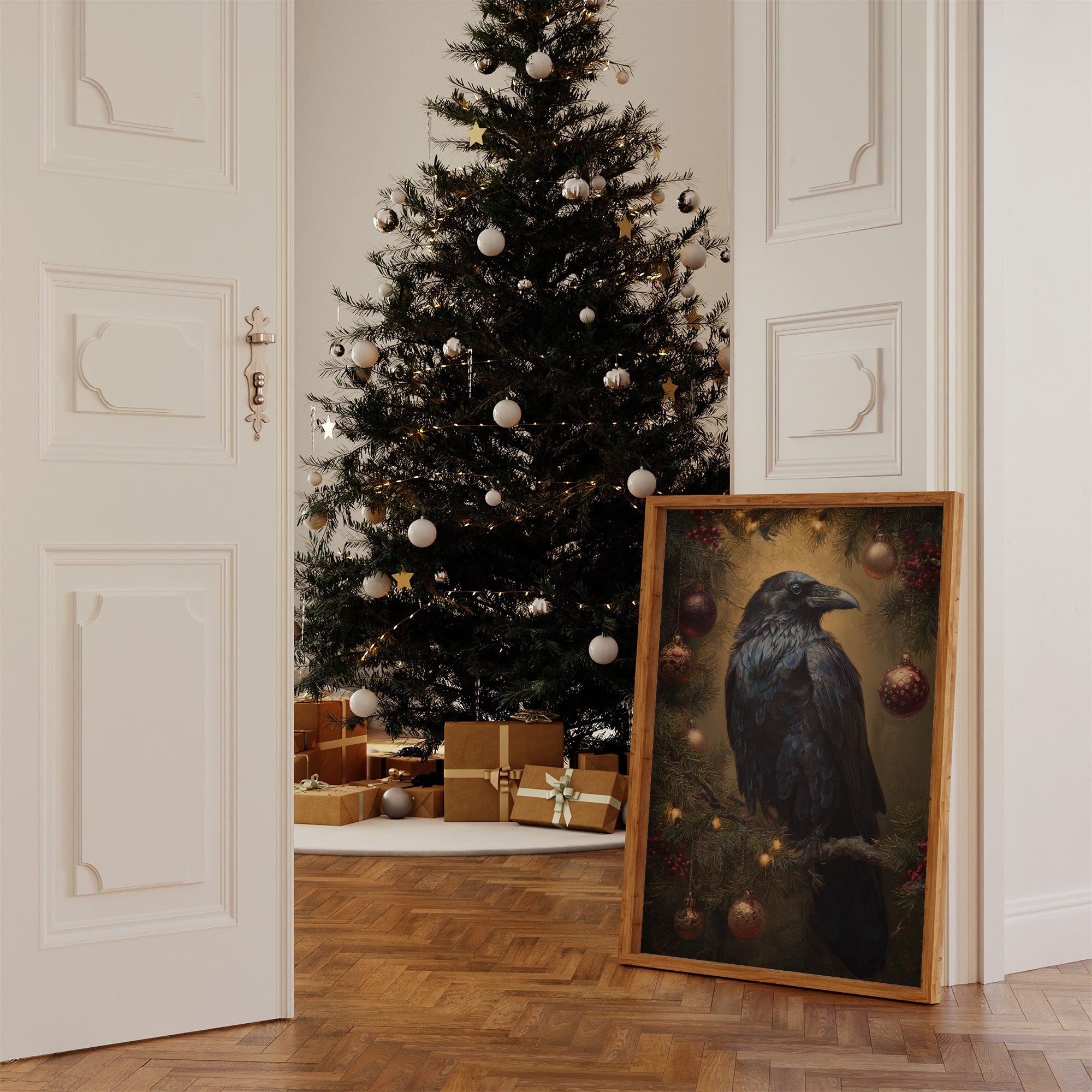 A majestic raven perches amid the glow of holiday enchantment, its iridescent feathers catching the warm light of twinkling ornaments. The contrast between the bird's mysterious dark plumage and the festive evergreen branches creates a compelling narrative of nature meeting celebration. Rich burgundy berries and golden baubles frame the scene, while the raven's knowing gaze suggests ancient wisdom against the atmospheric amber background. This striking piece brings sophisticated holiday charm to modern spaces, perfect for those seeking an unconventional yet elegant approach to seasonal decor.