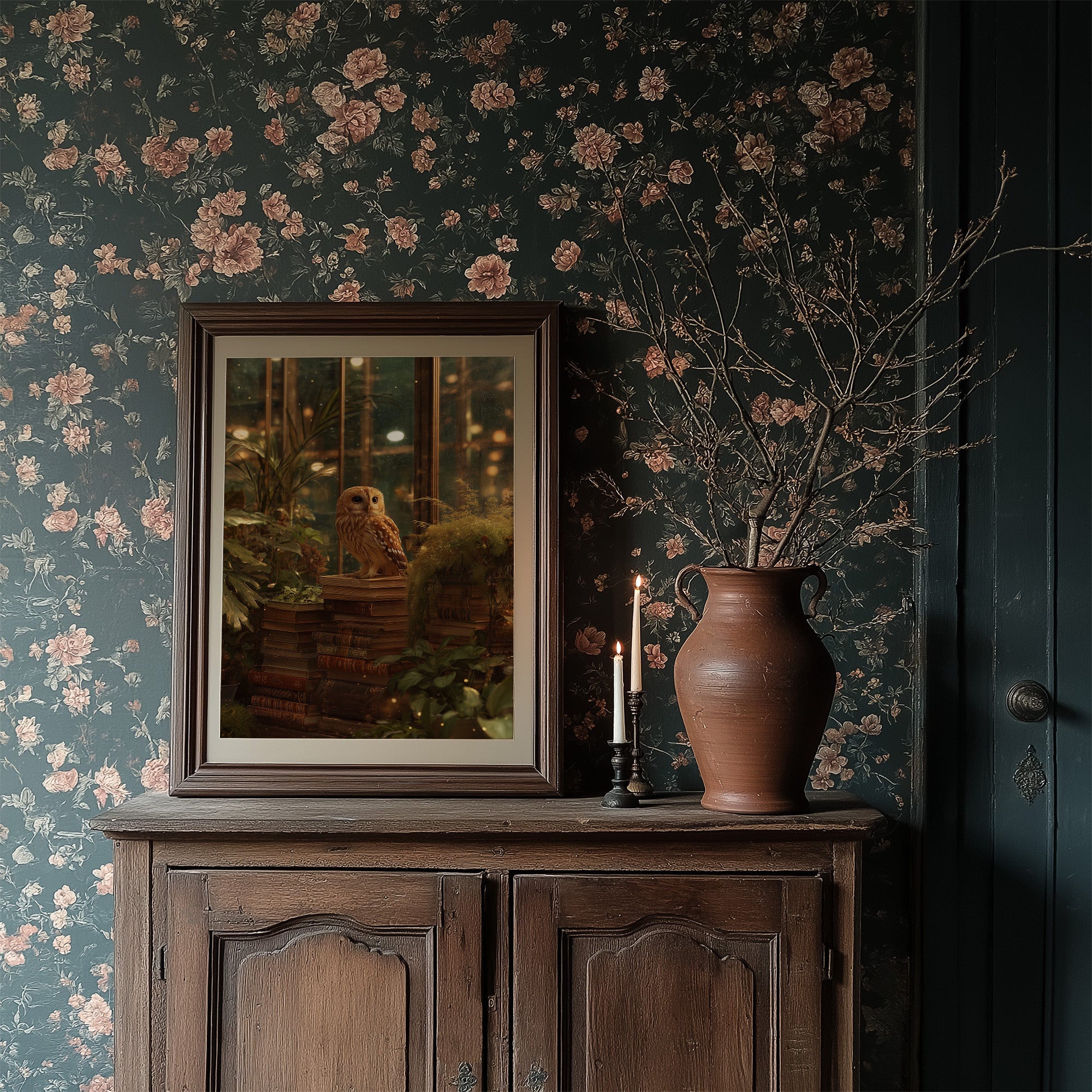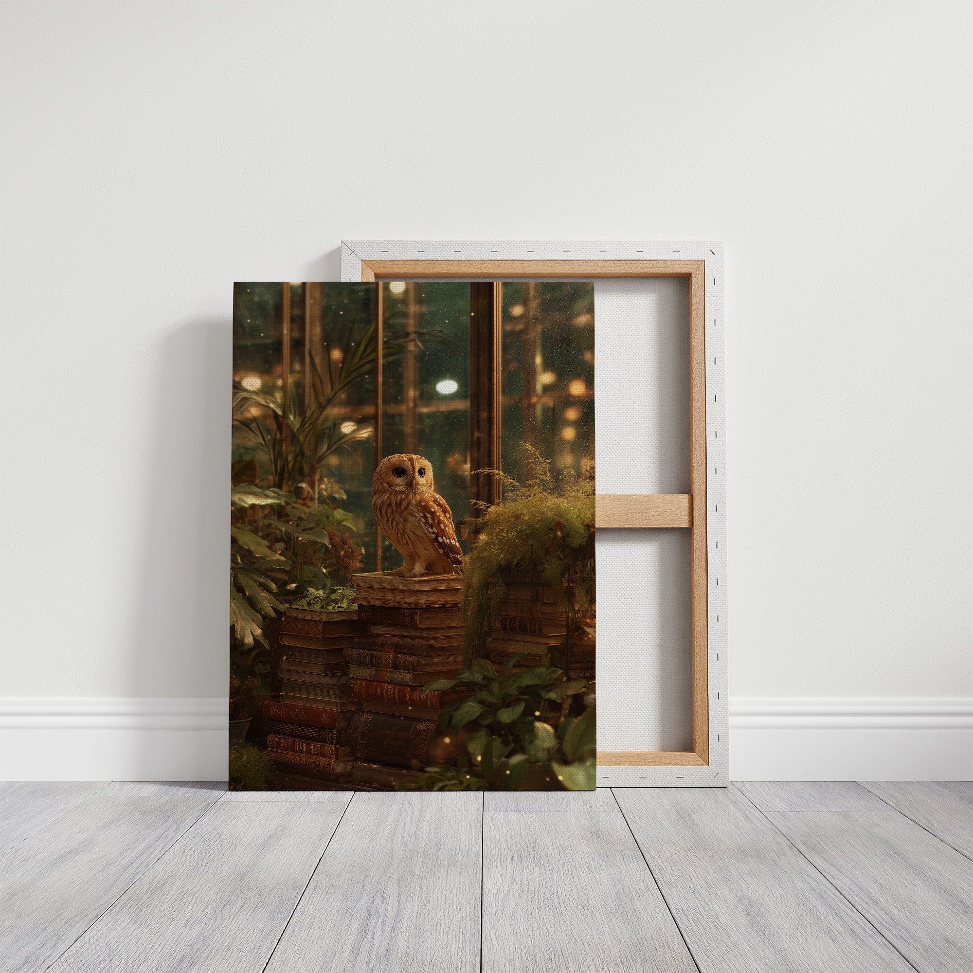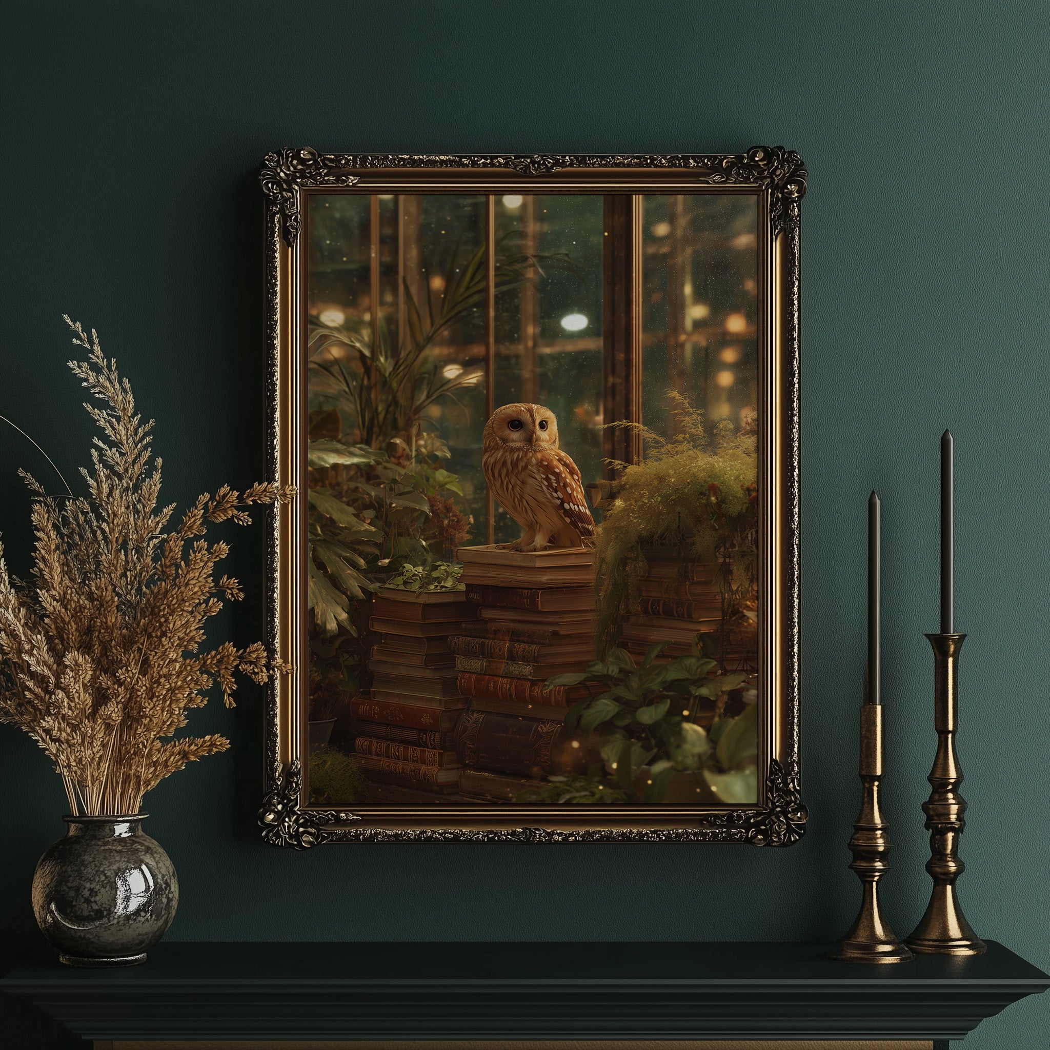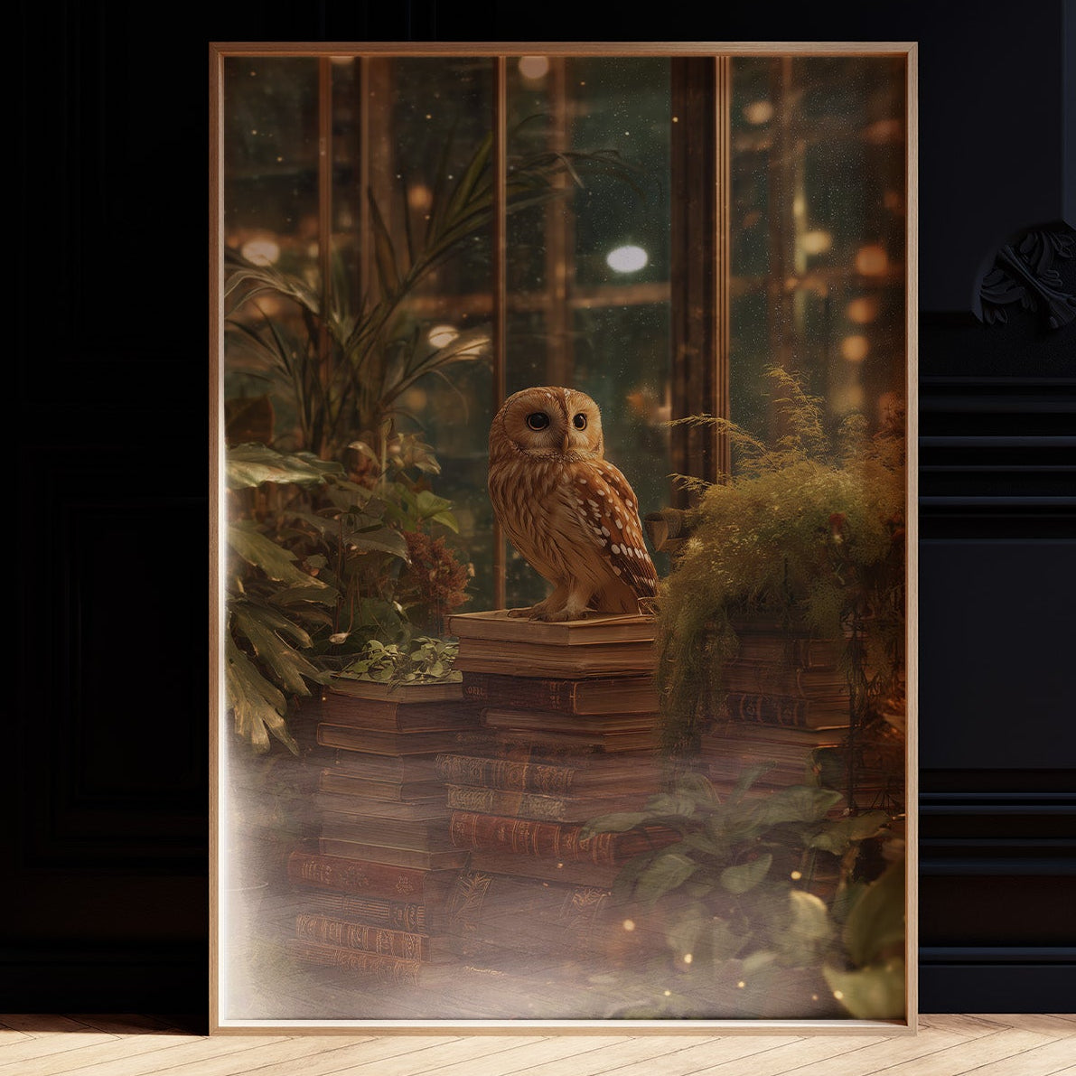 A tawny owl perches vigilantly atop weathered books, its round eyes gleaming with quiet wisdom in the amber glow of distant lights. Moss and ferns create a verdant sanctuary around the stacked volumes, blending the wild and scholarly worlds in mysterious harmony. The scene captures a moment where knowledge and nature converge, bathed in the soft bokeh of twilight filtering through unseen windows.