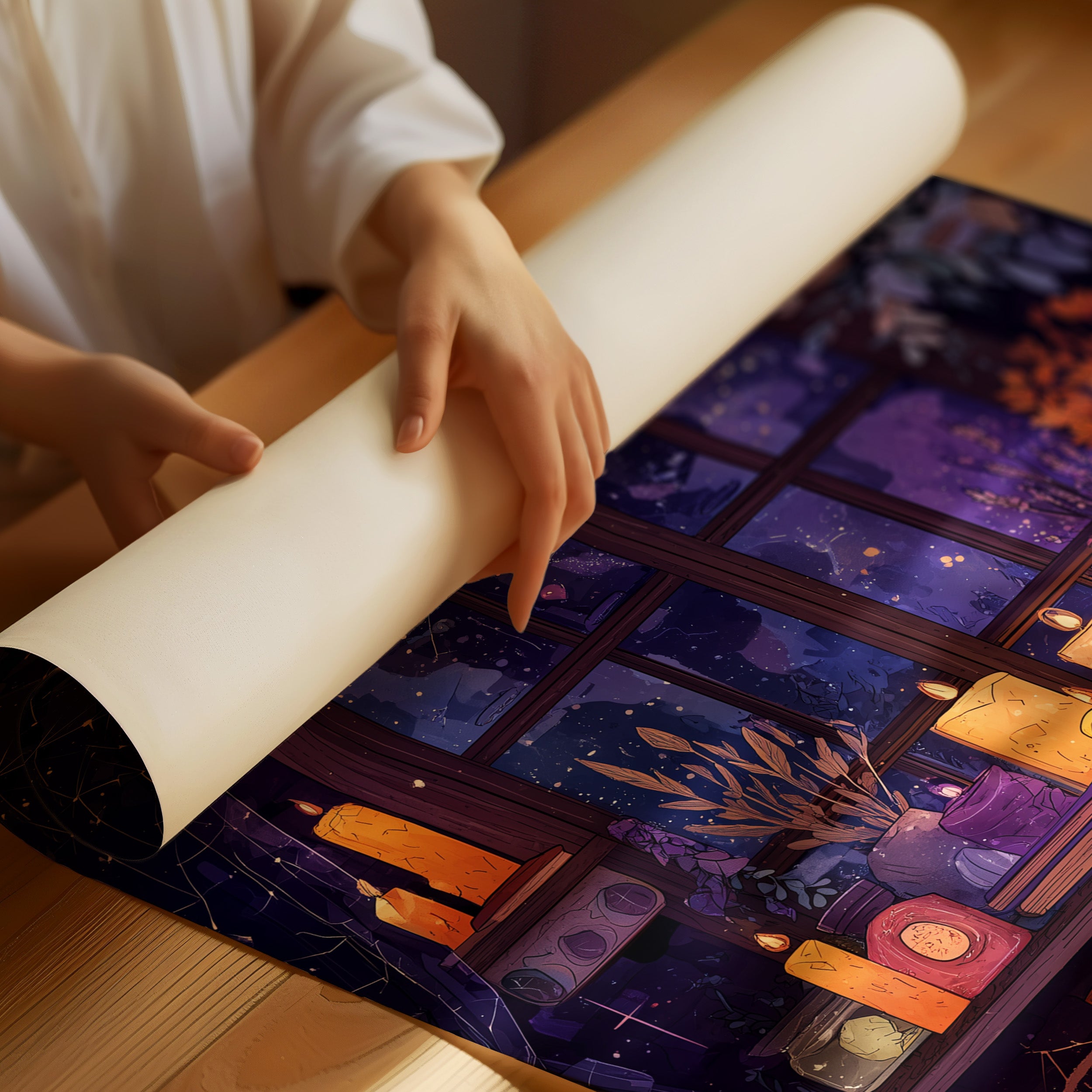 Candlelight dances across crystal points and ancient tomes, inviting you into a magical sanctuary where cosmic mysteries await. Rich purples and warm ambers blend in this enchanted altar space, where dried botanicals and glowing potions rest beneath a gothic window revealing the star-filled universe beyond. This mystical scene transforms any room into a portal to wonder, perfect for spaces where imagination and contemplation are cherished.
