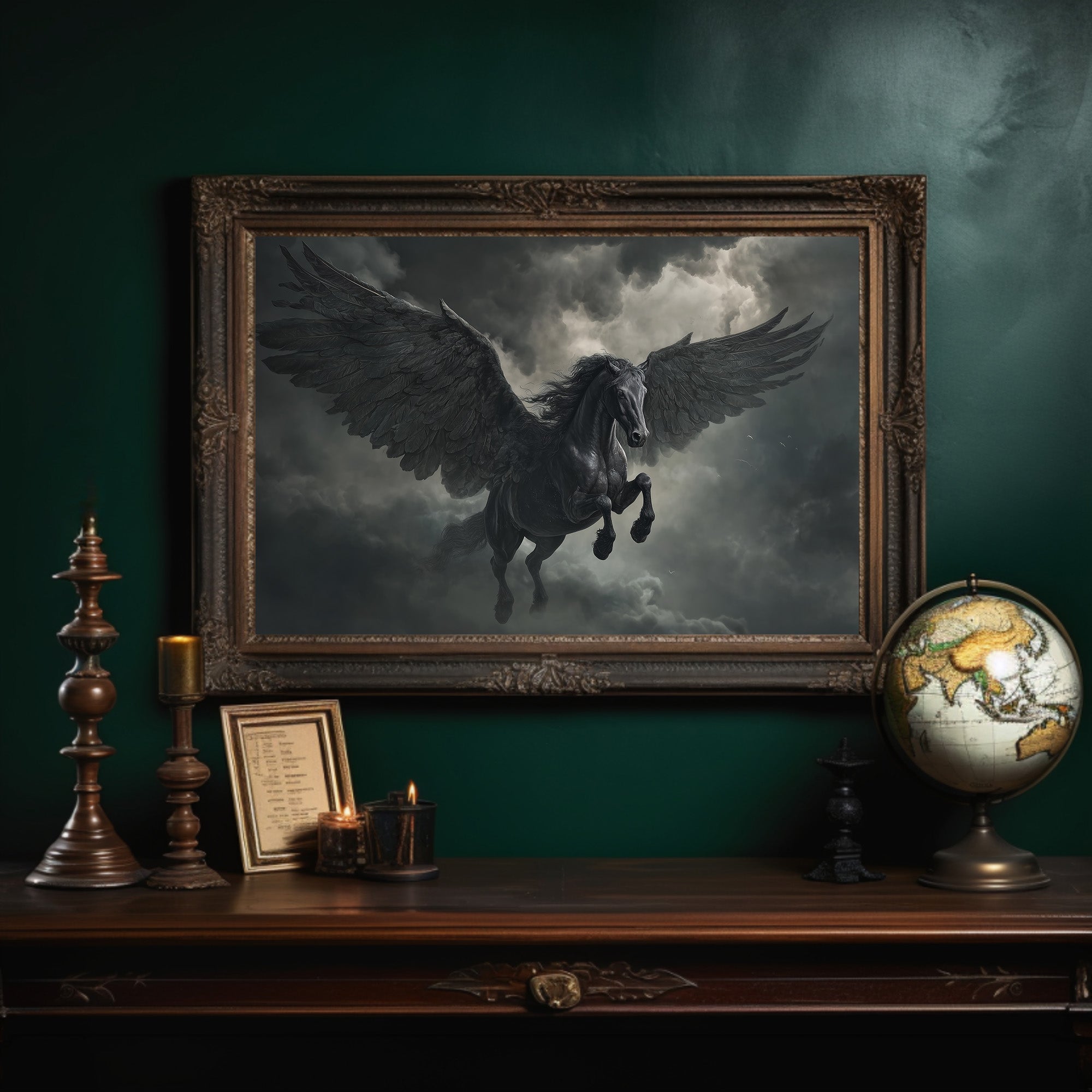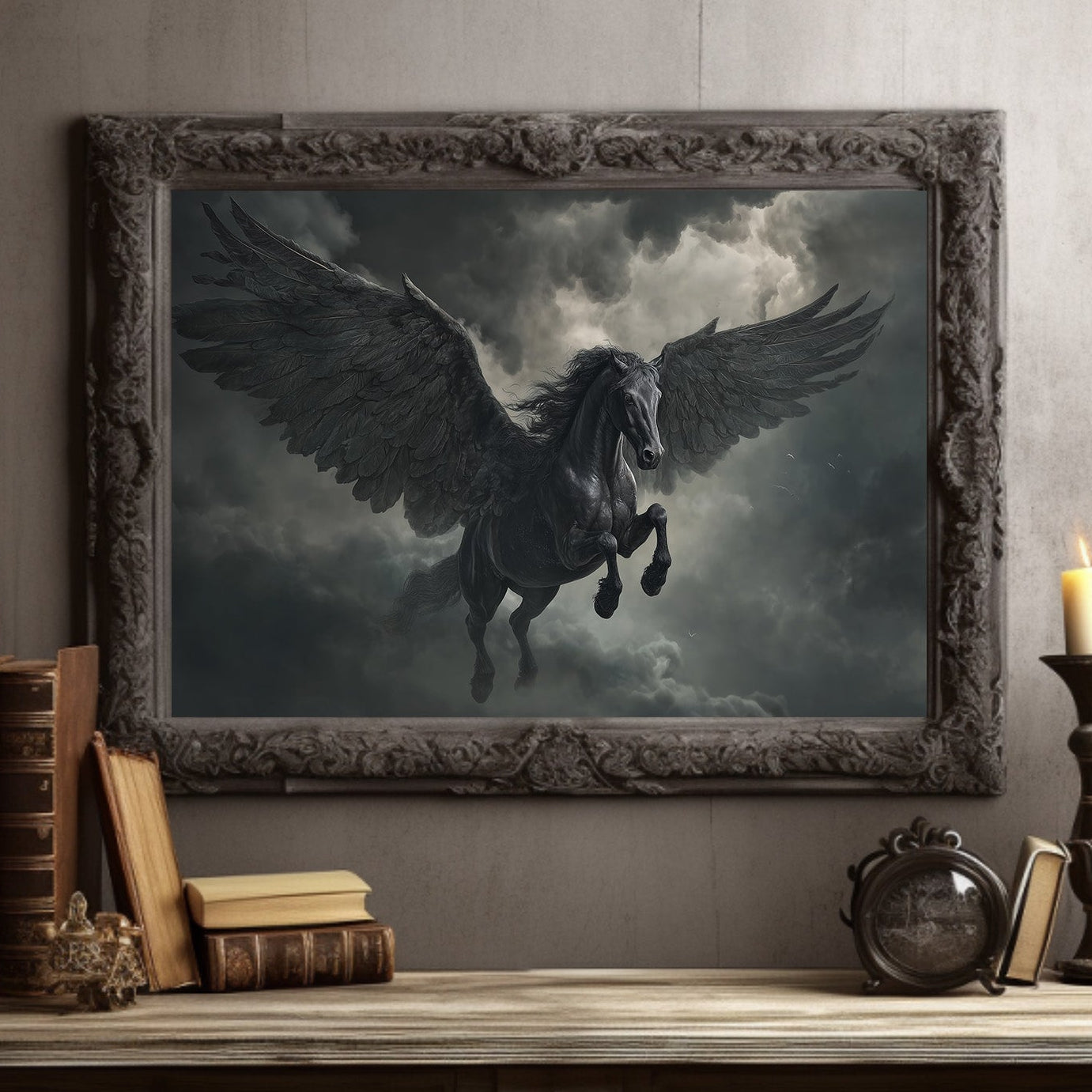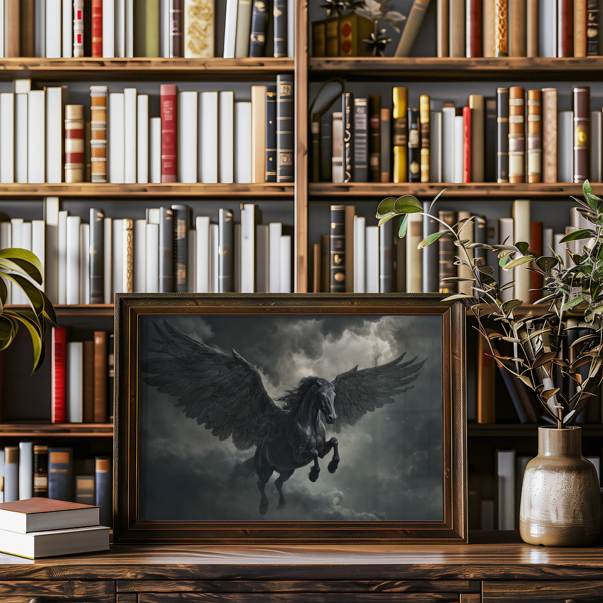 A powerful winged horse emerges from storm clouds, suspended in a moment of mythic transformation. The monochromatic palette captures the raw energy of the creaturemuscular and defiant, with feathered wings spread against turbulent skies. Displayed on a wooden console against a backdrop of carefully arranged bookshelves, this striking piece brings dramatic contrast to a sophisticated reading nook or study.
