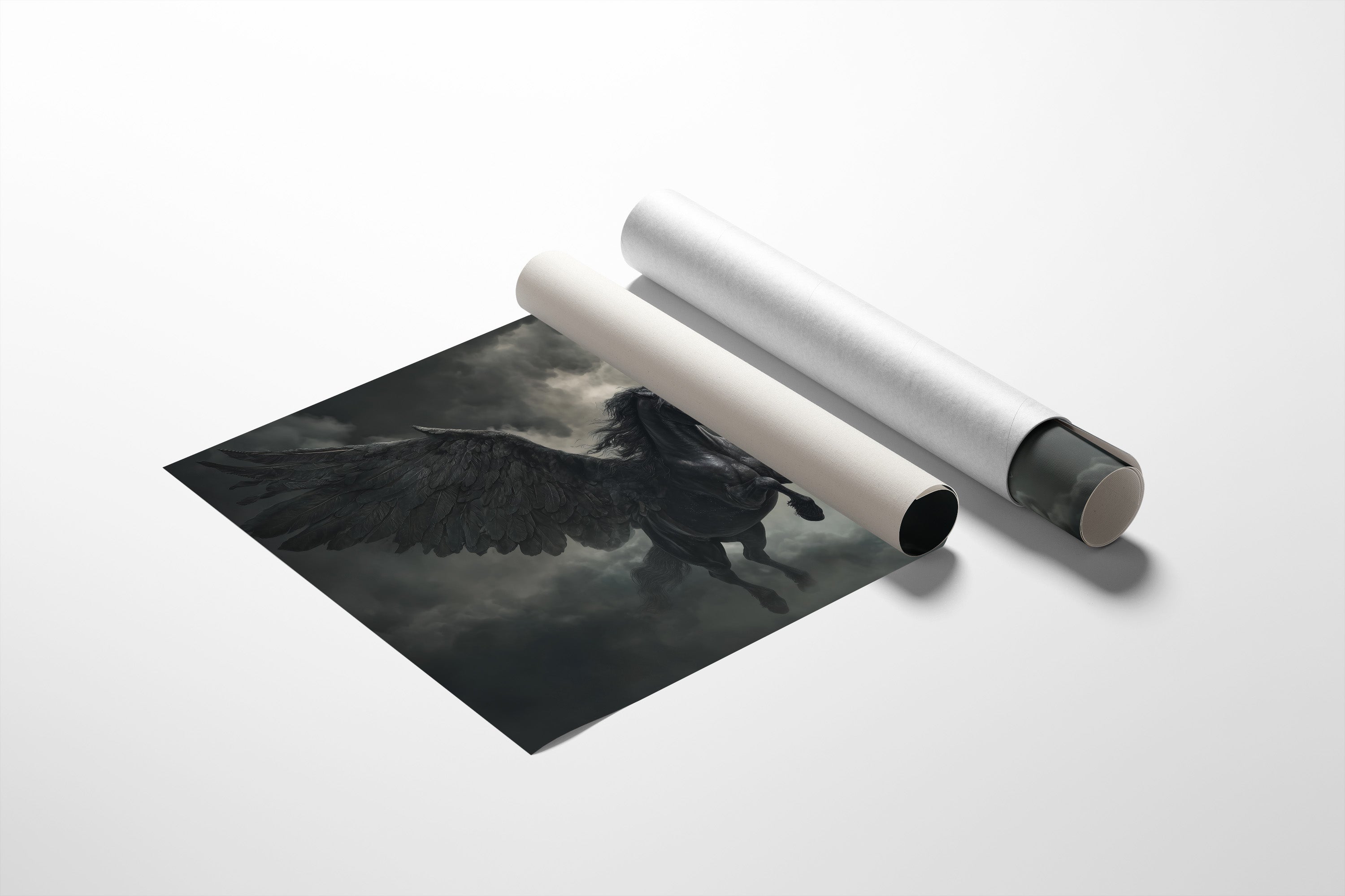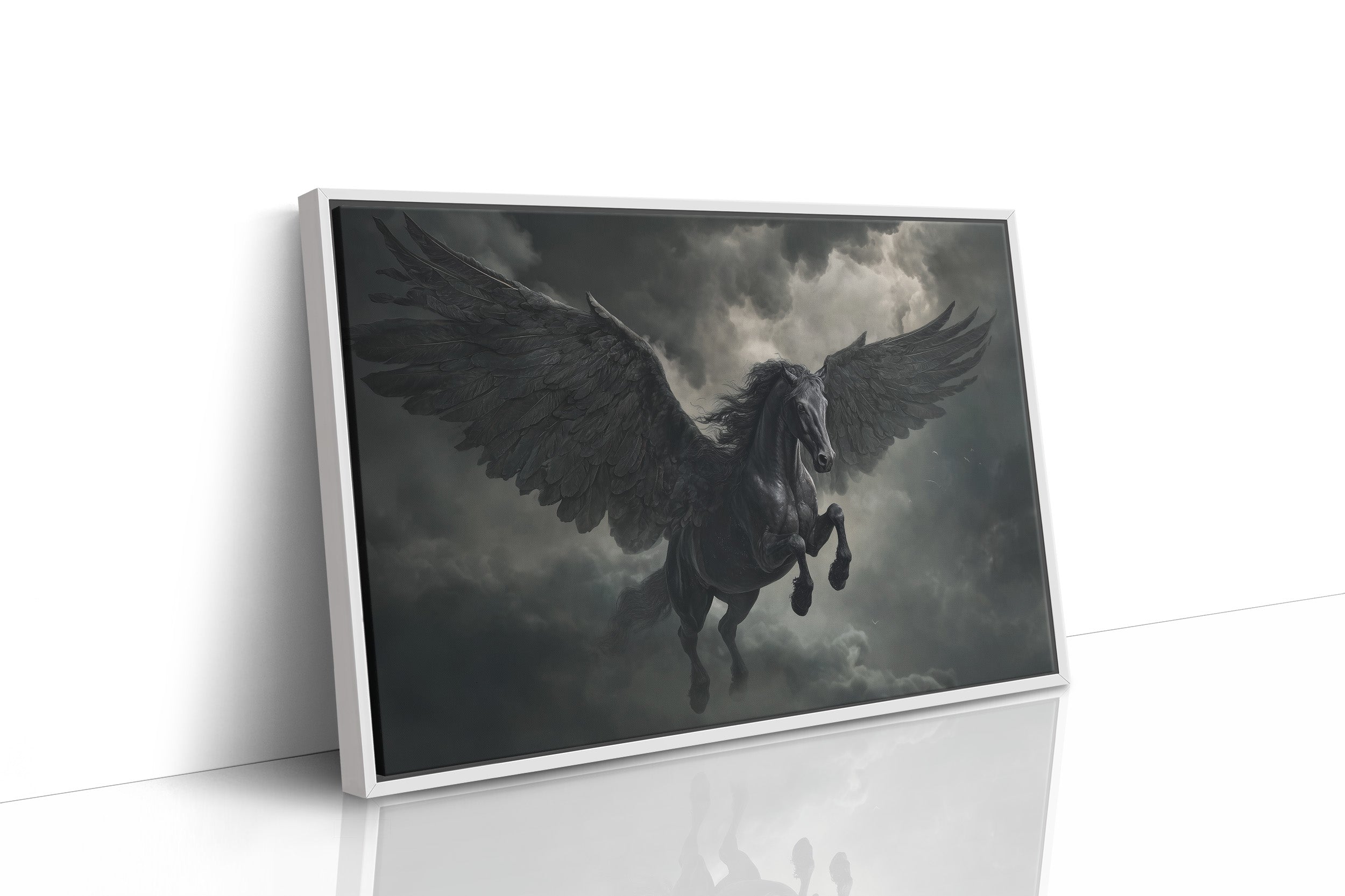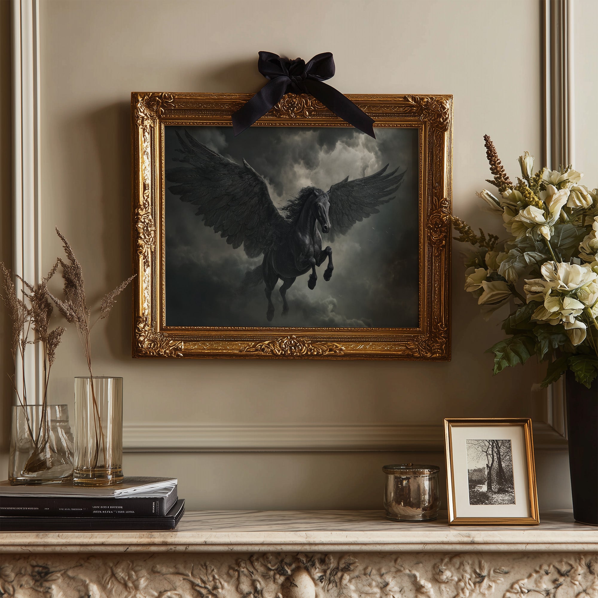A powerful winged horse emerges from storm clouds, suspended in a moment of mythic transformation. The monochromatic palette captures the raw energy of the creaturemuscular and defiant, with feathered wings spread against turbulent skies. Displayed on a wooden console against a backdrop of carefully arranged bookshelves, this striking piece brings dramatic contrast to a sophisticated reading nook or study.