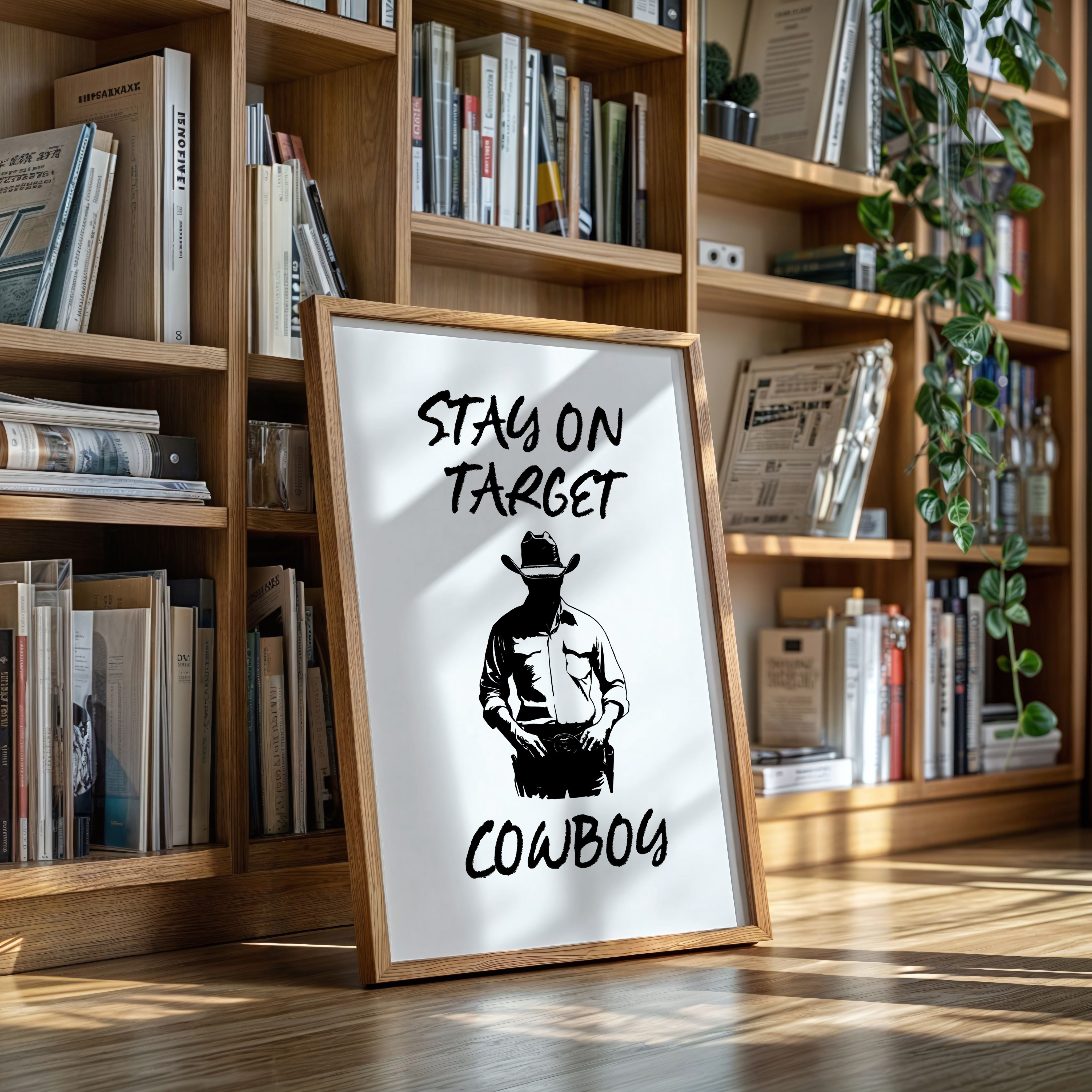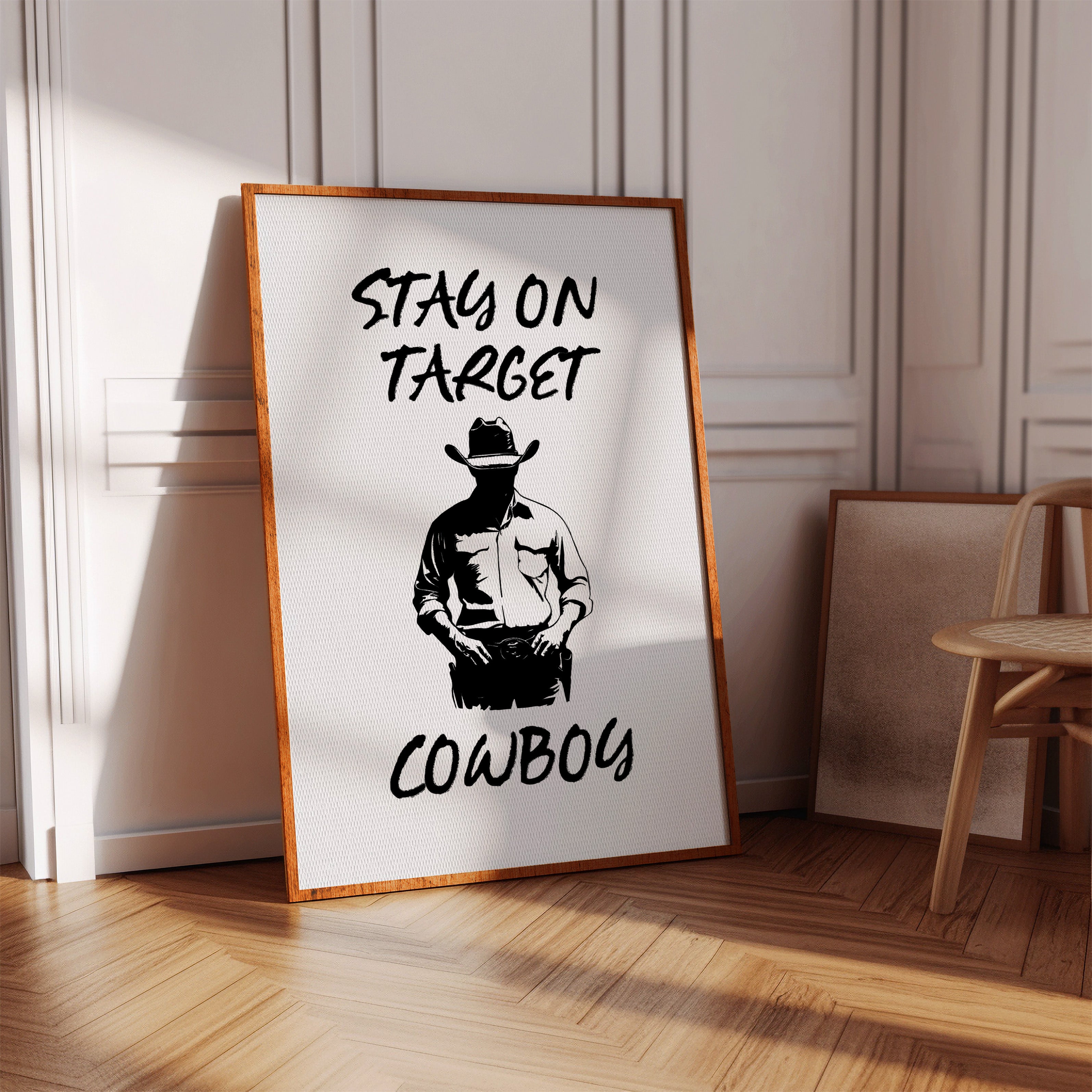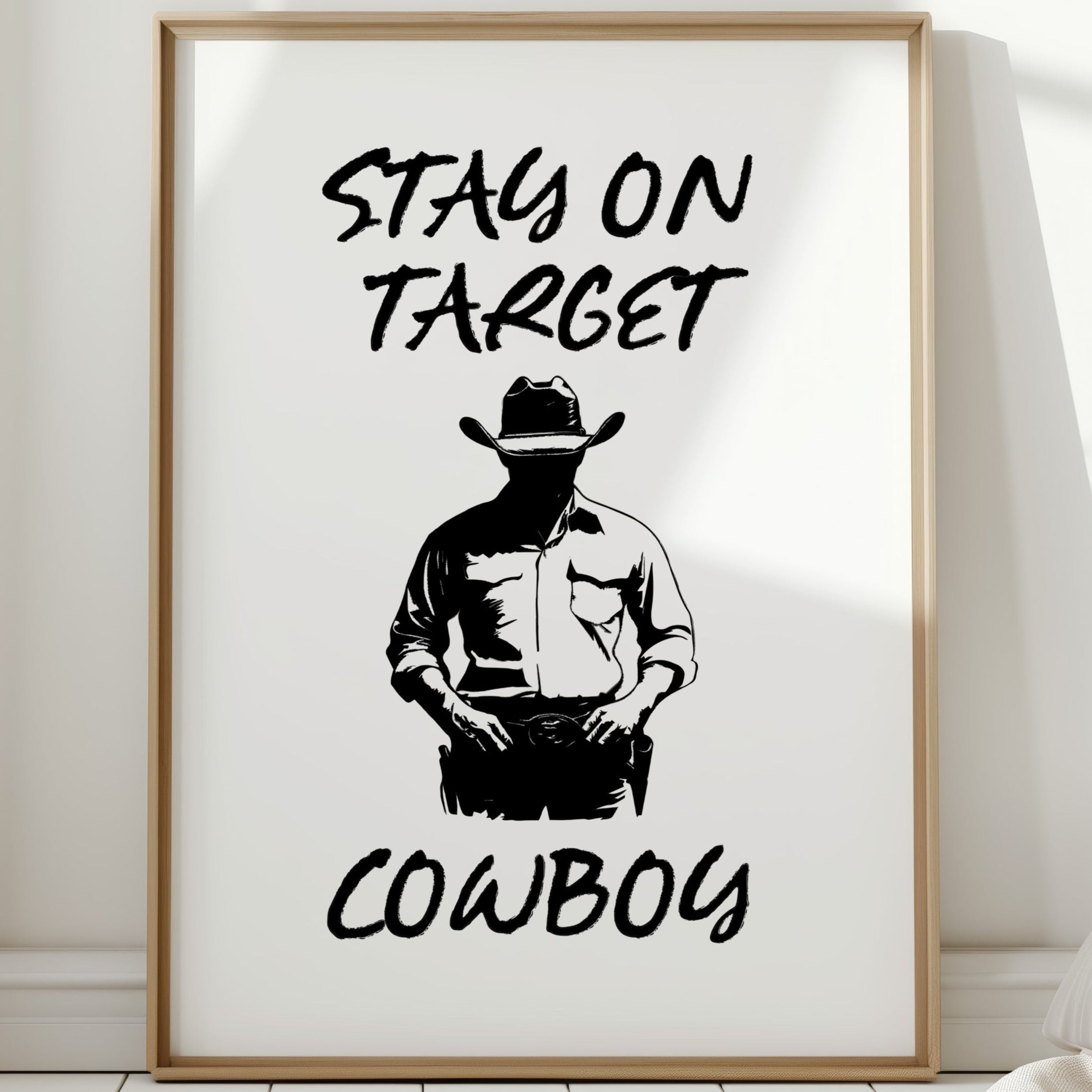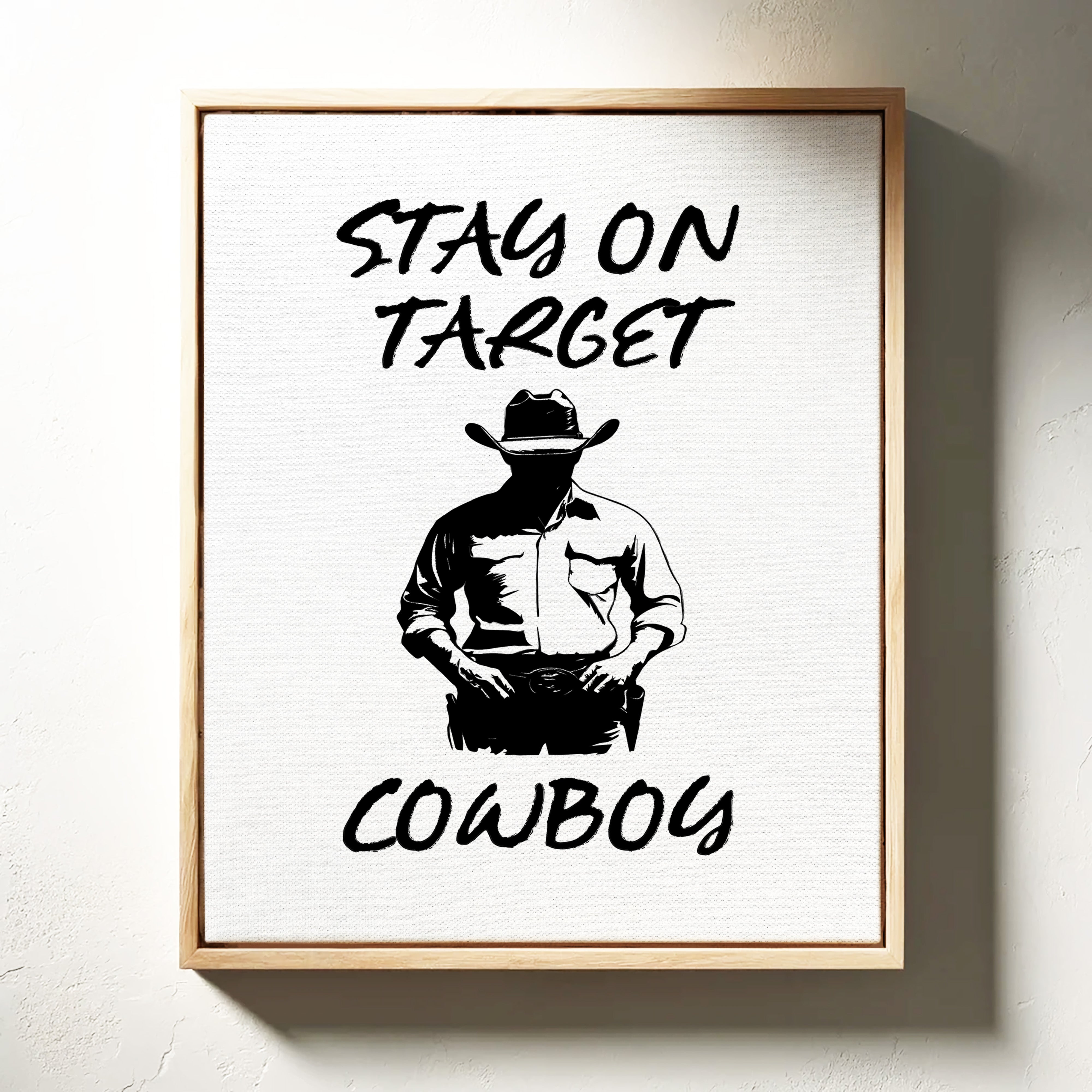 Standing in stark silhouette, determination carved into every line, a figure commands attention through simplicity and strength. This contemporary piece marries bold graphic design with timeless Western iconography. Black and white contrasts create a powerful narrative of focus and purpose, while the minimalist approach amplifies the commanding presence of the lone cowboy figure. The interplay of light and shadow speaks to both modern aesthetic sensibilities and classic American storytelling. Perfect for adding a bold statement to a home office or creating an anchor piece in a modern rustic living space. Each viewing reveals new details in the masterful balance of negative space and decisive brushwork.