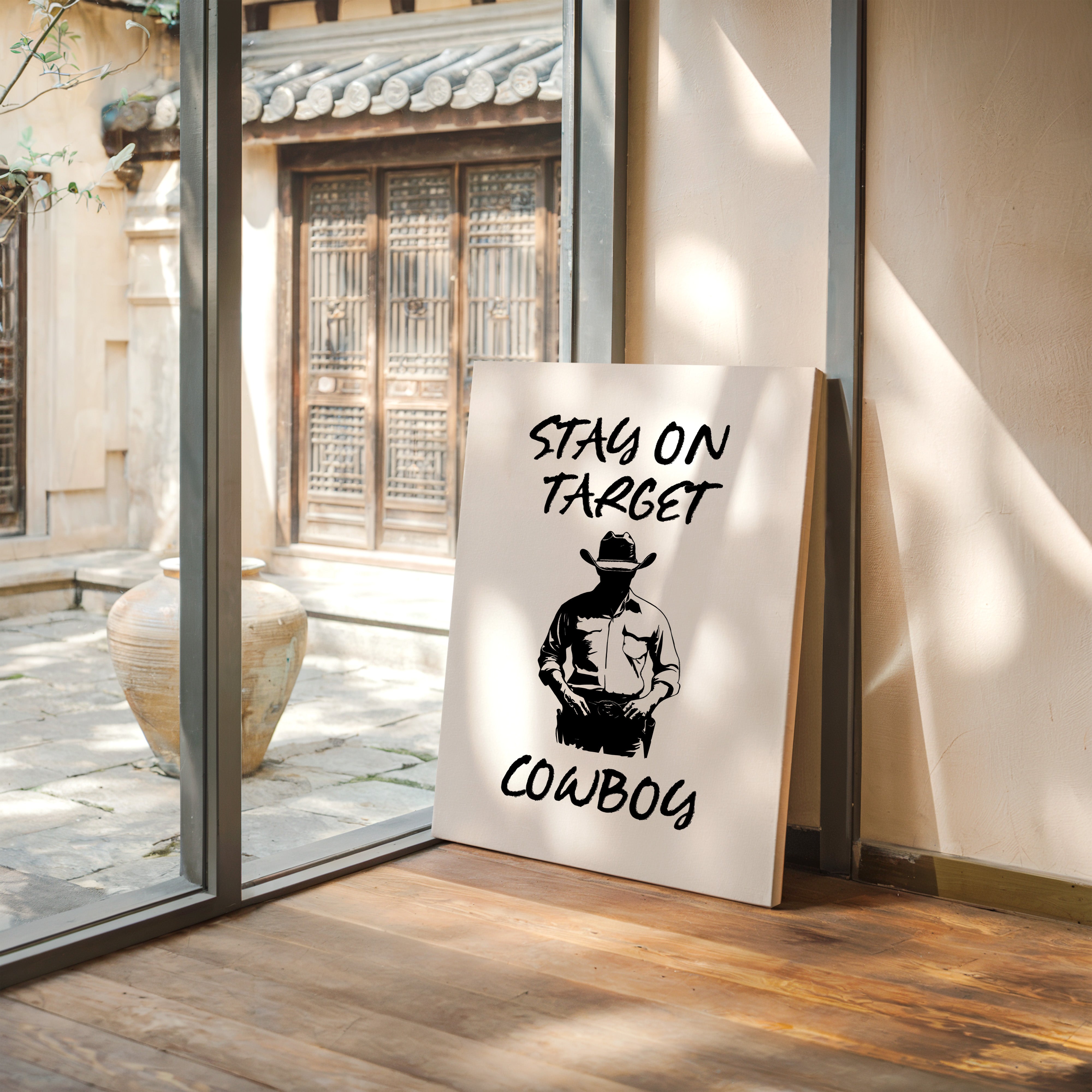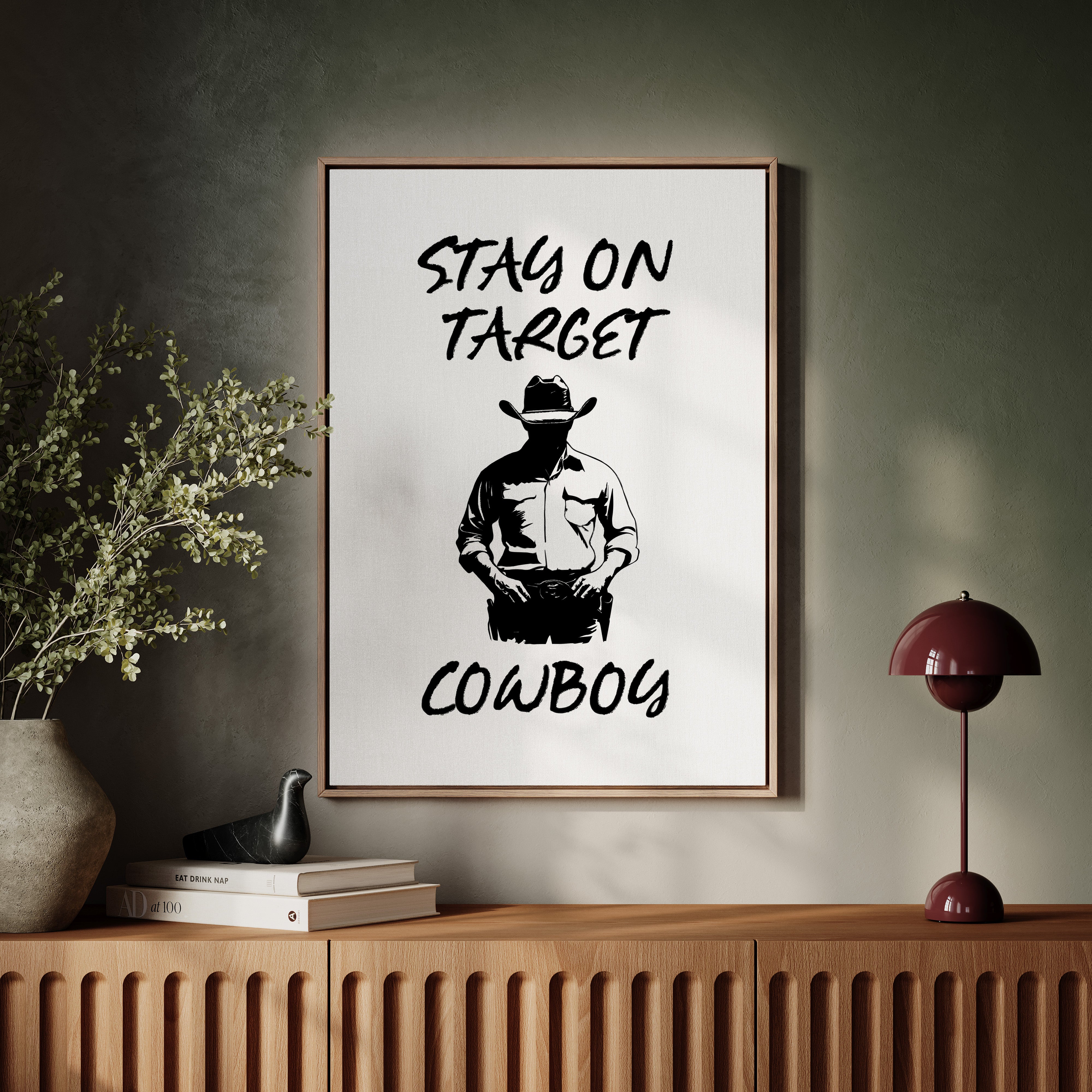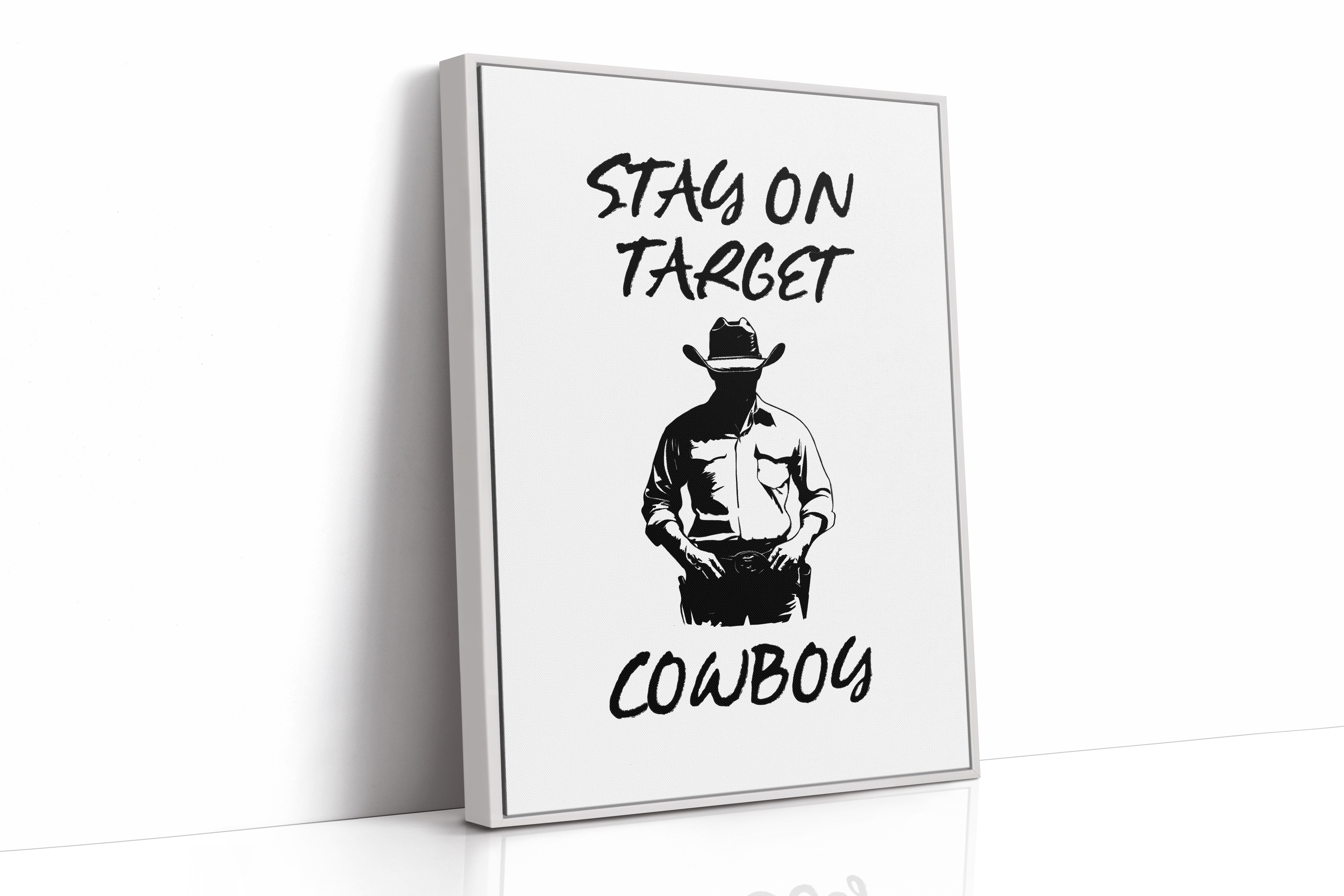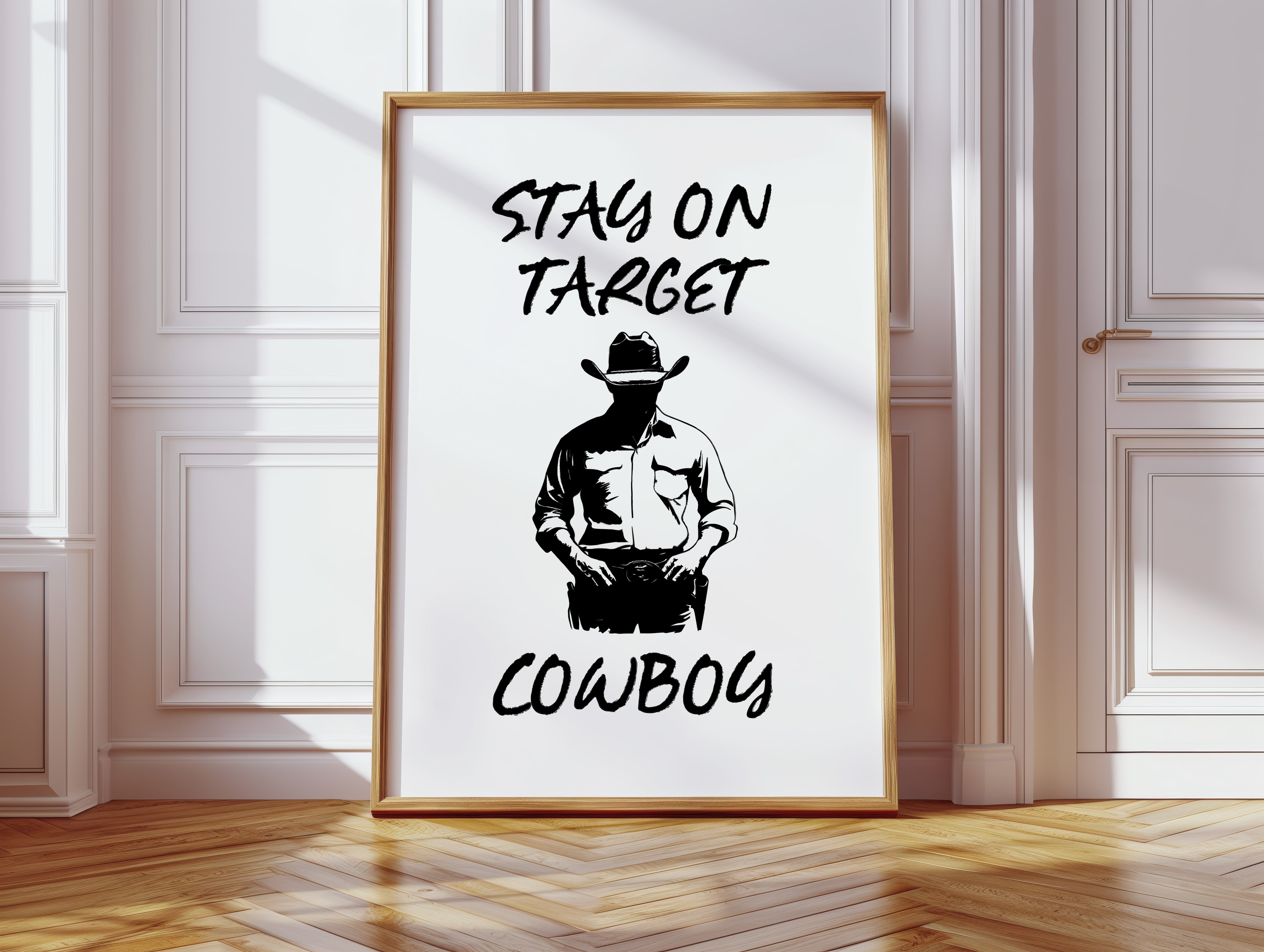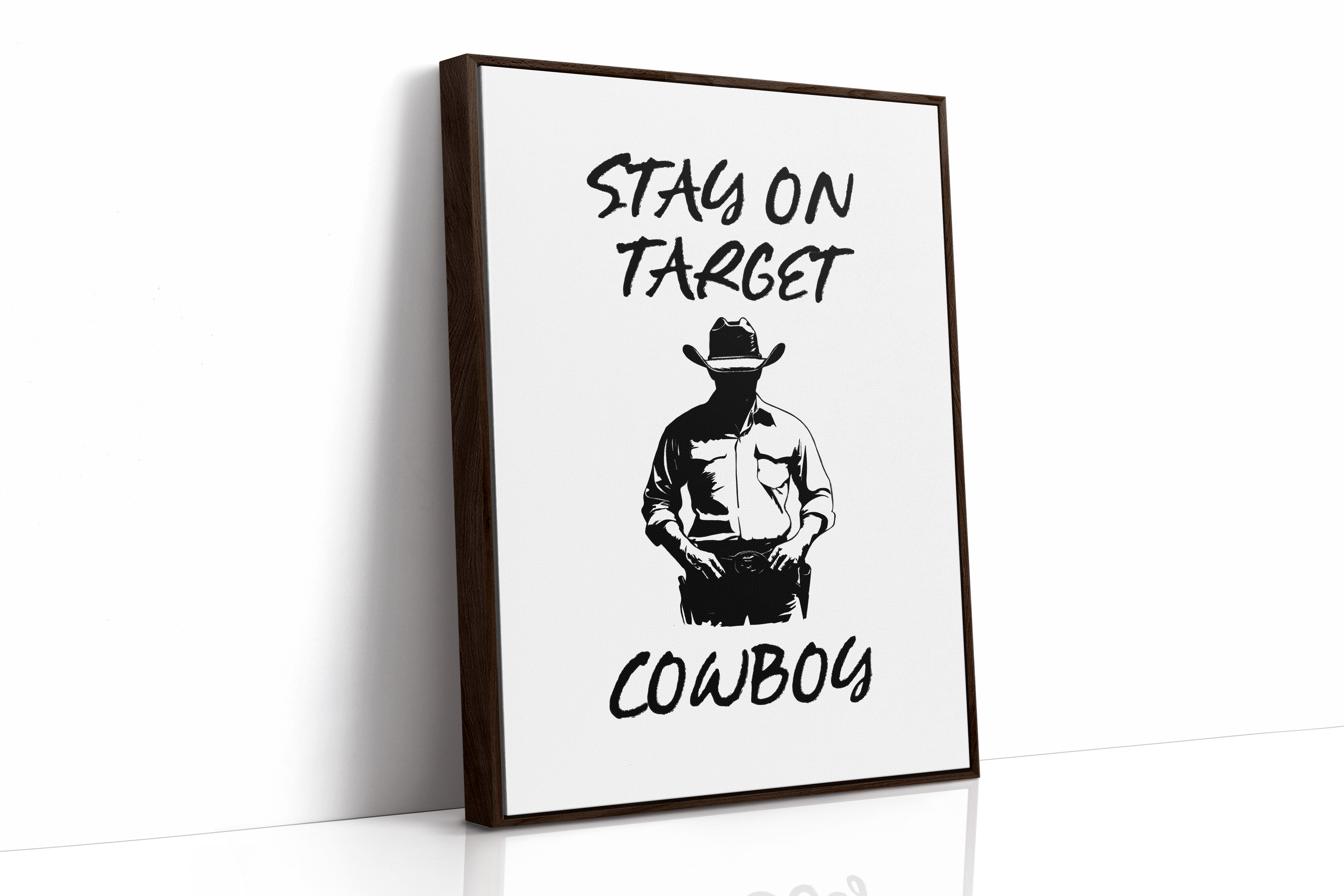 Standing in stark silhouette, determination carved into every line, a figure commands attention through simplicity and strength. This contemporary piece marries bold graphic design with timeless Western iconography. Black and white contrasts create a powerful narrative of focus and purpose, while the minimalist approach amplifies the commanding presence of the lone cowboy figure. The interplay of light and shadow speaks to both modern aesthetic sensibilities and classic American storytelling. Perfect for adding a bold statement to a home office or creating an anchor piece in a modern rustic living space. Each viewing reveals new details in the masterful balance of negative space and decisive brushwork.