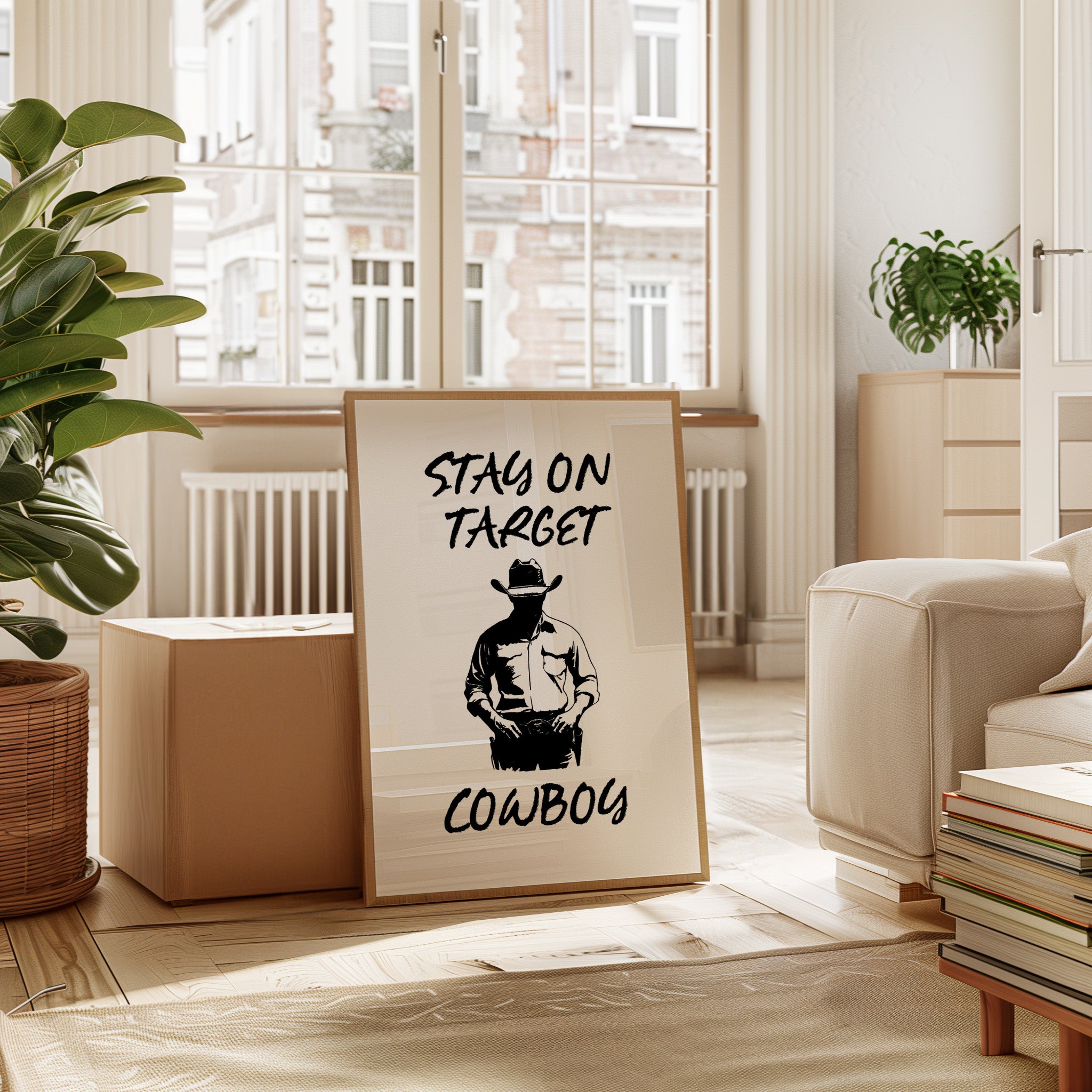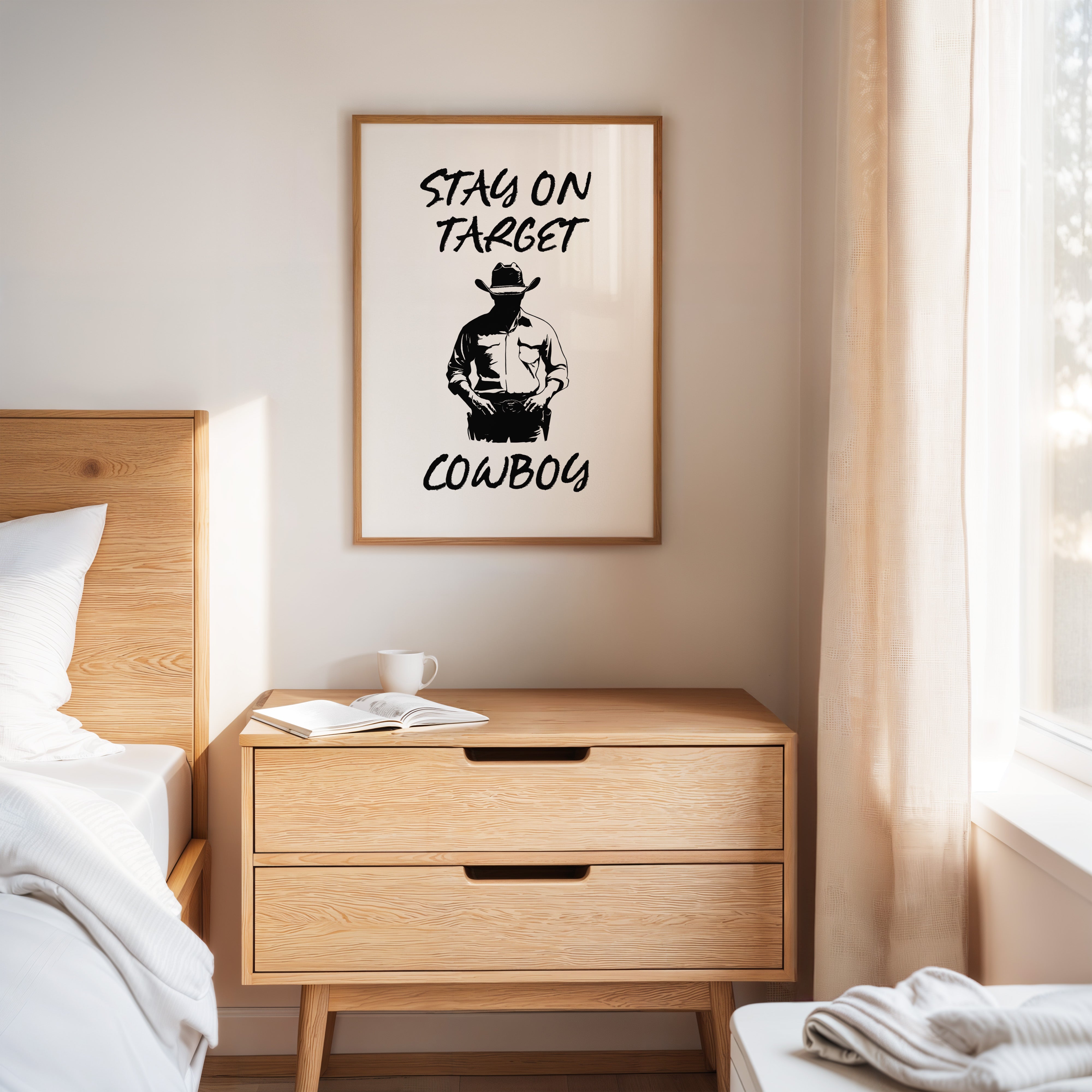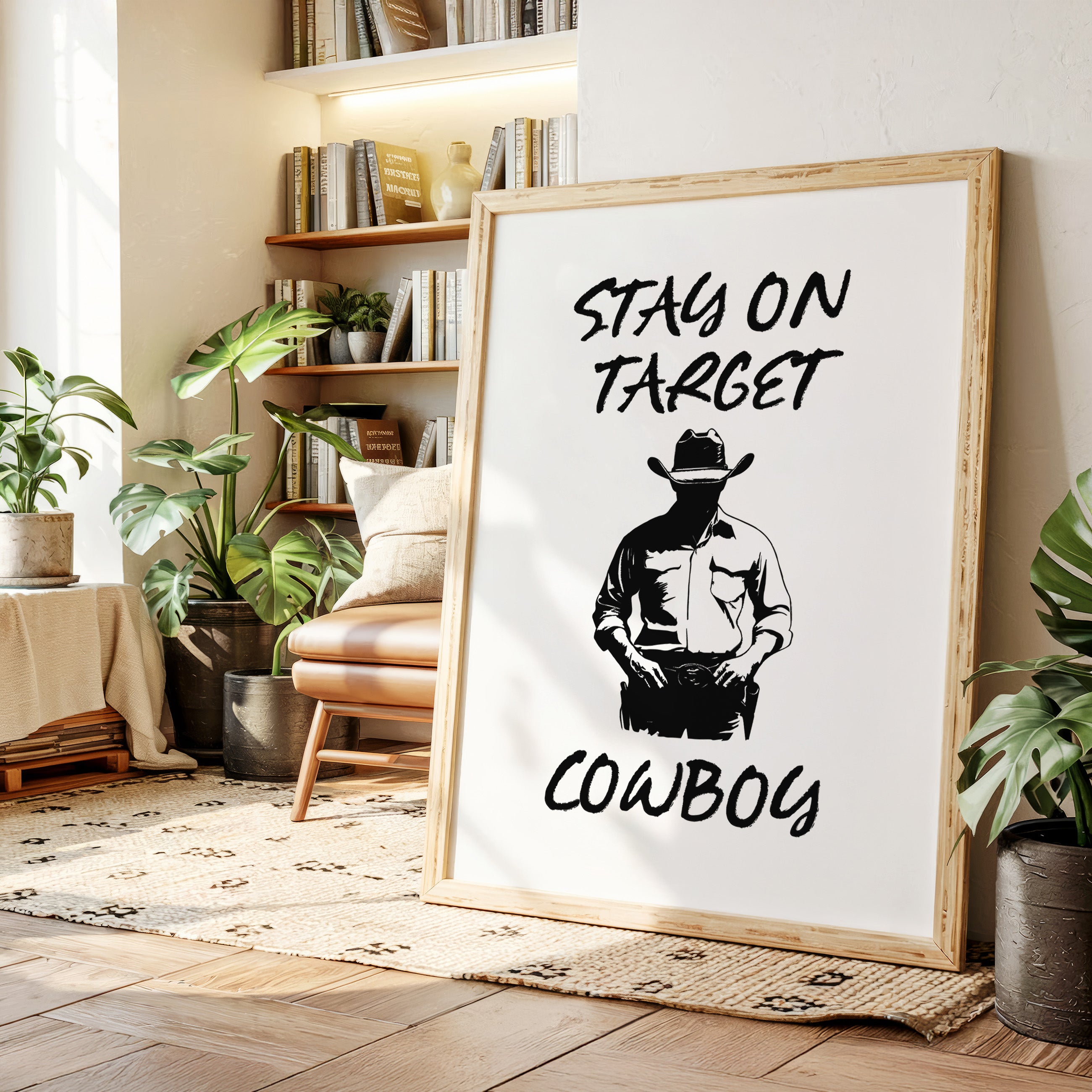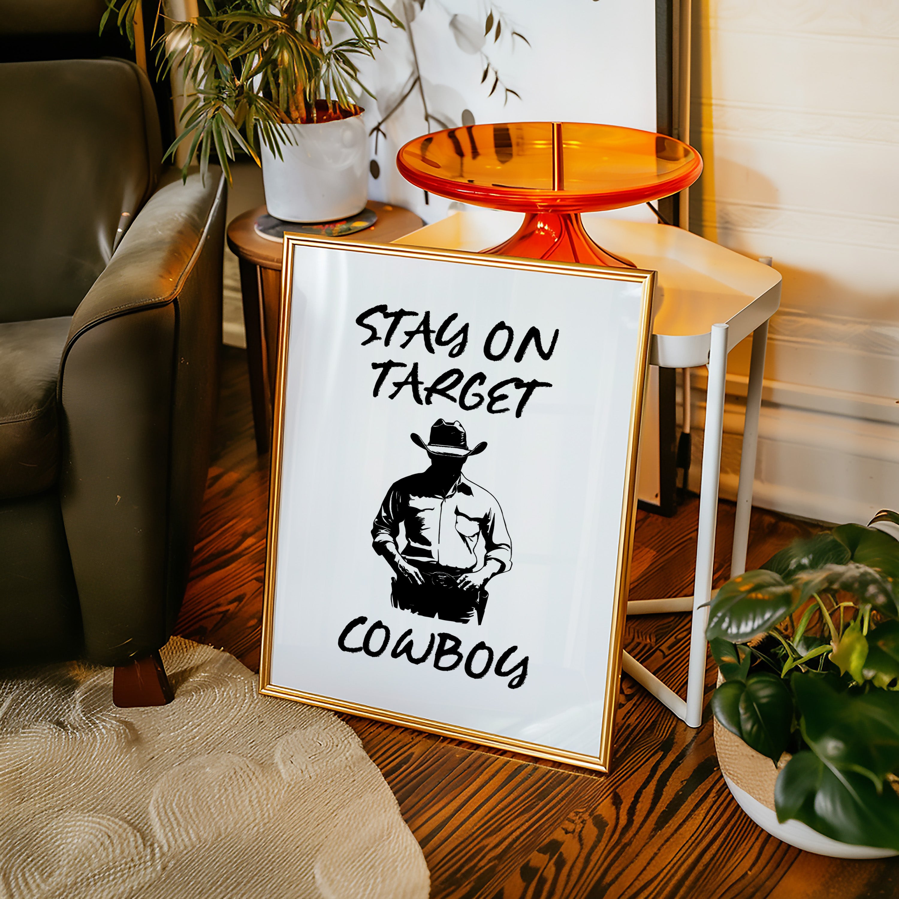 Standing in stark silhouette, determination carved into every line, a figure commands attention through simplicity and strength. This contemporary piece marries bold graphic design with timeless Western iconography. Black and white contrasts create a powerful narrative of focus and purpose, while the minimalist approach amplifies the commanding presence of the lone cowboy figure. The interplay of light and shadow speaks to both modern aesthetic sensibilities and classic American storytelling. Perfect for adding a bold statement to a home office or creating an anchor piece in a modern rustic living space. Each viewing reveals new details in the masterful balance of negative space and decisive brushwork.