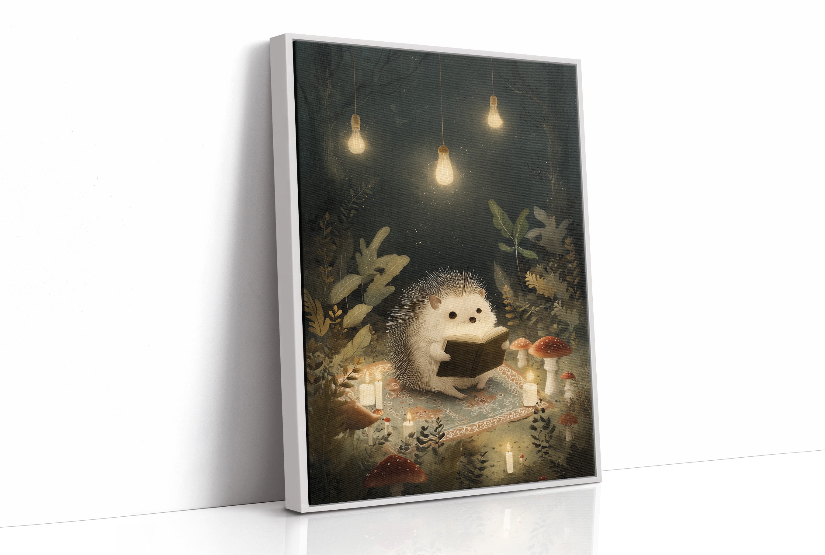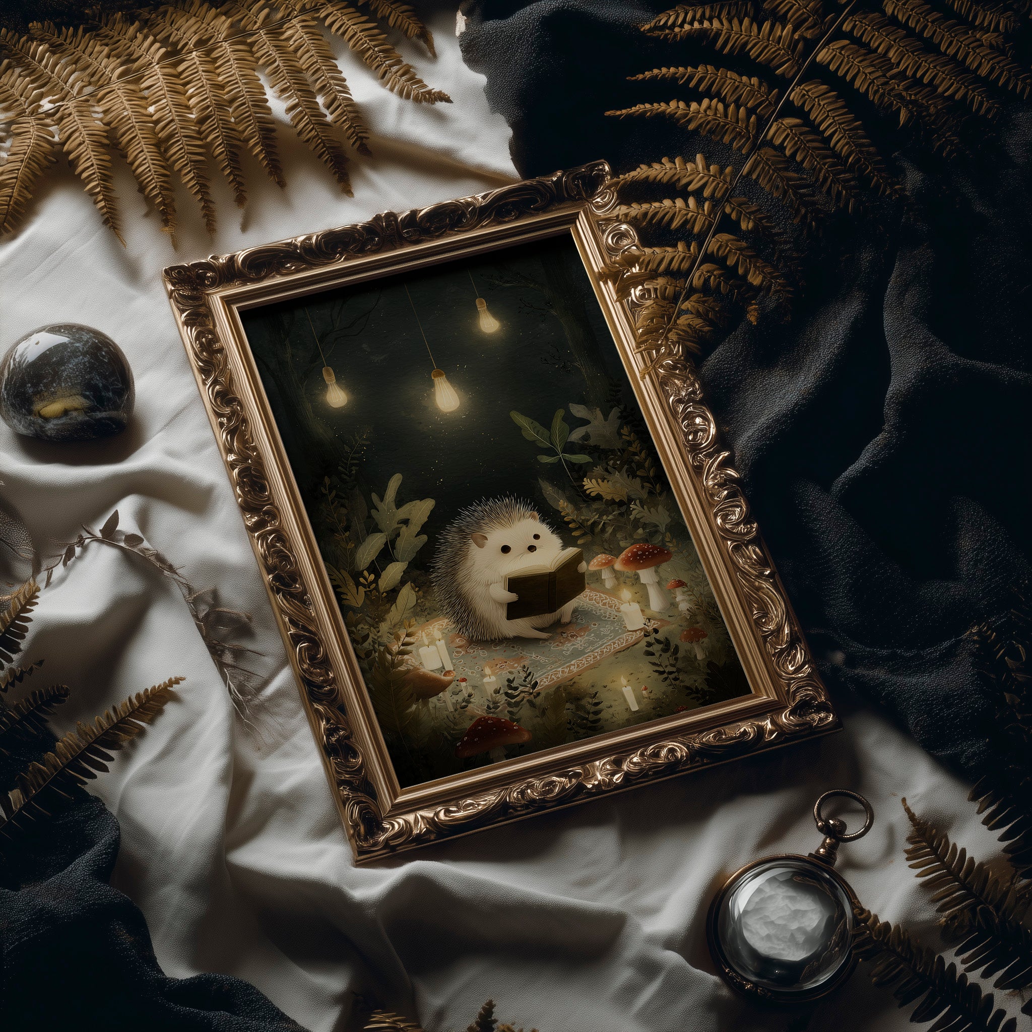 A gentle hedgehog sits in a forest clearing, absorbed in the pages of an open book. Warm light cascades from three simple bulbs hanging above, creating a cozy reading nook amid toadstools and forest foliage. The scene blends whimsical fantasy with tender solitude, where candlelight flickers around the small creature and mushrooms dot the forest floor in shades of soft coral and cream.