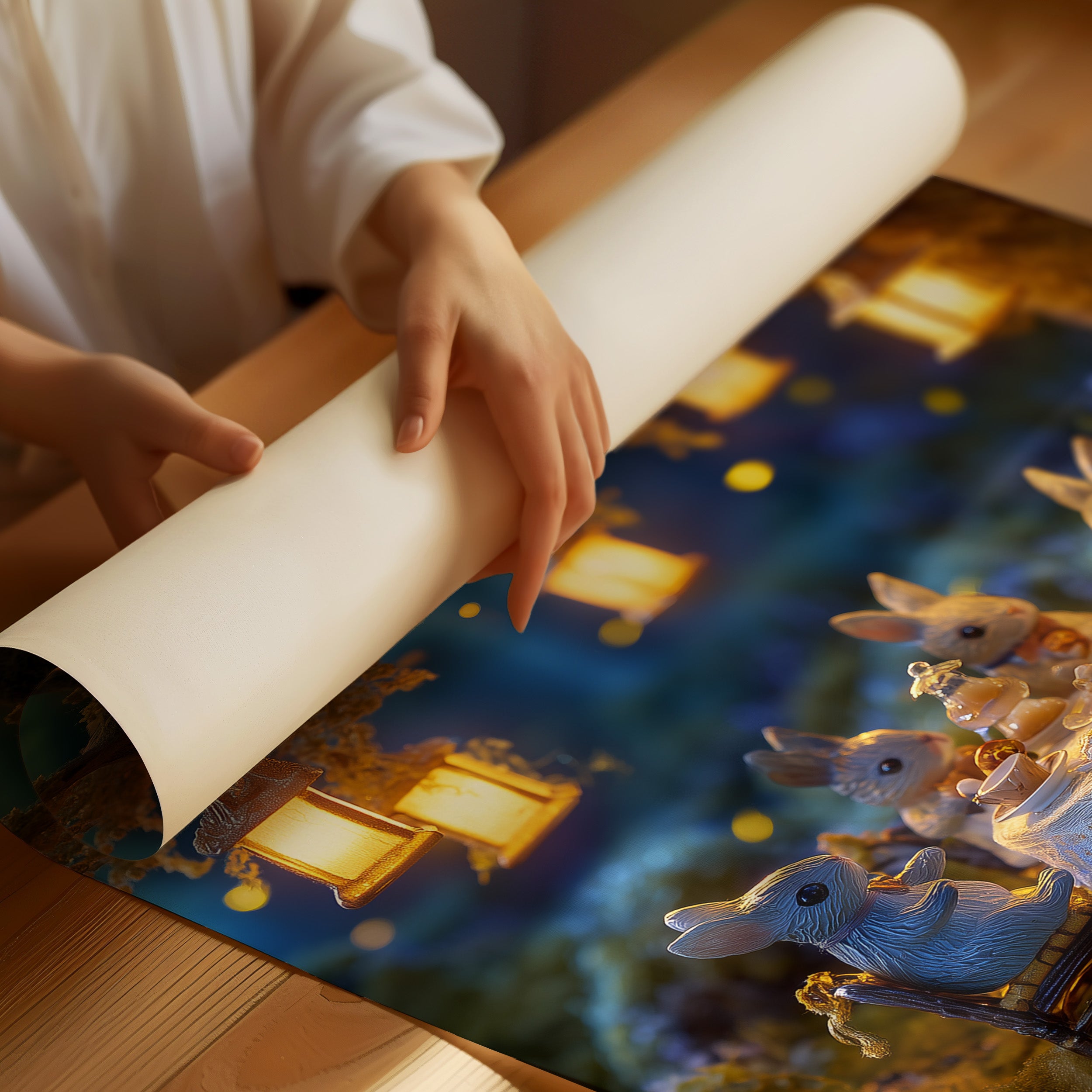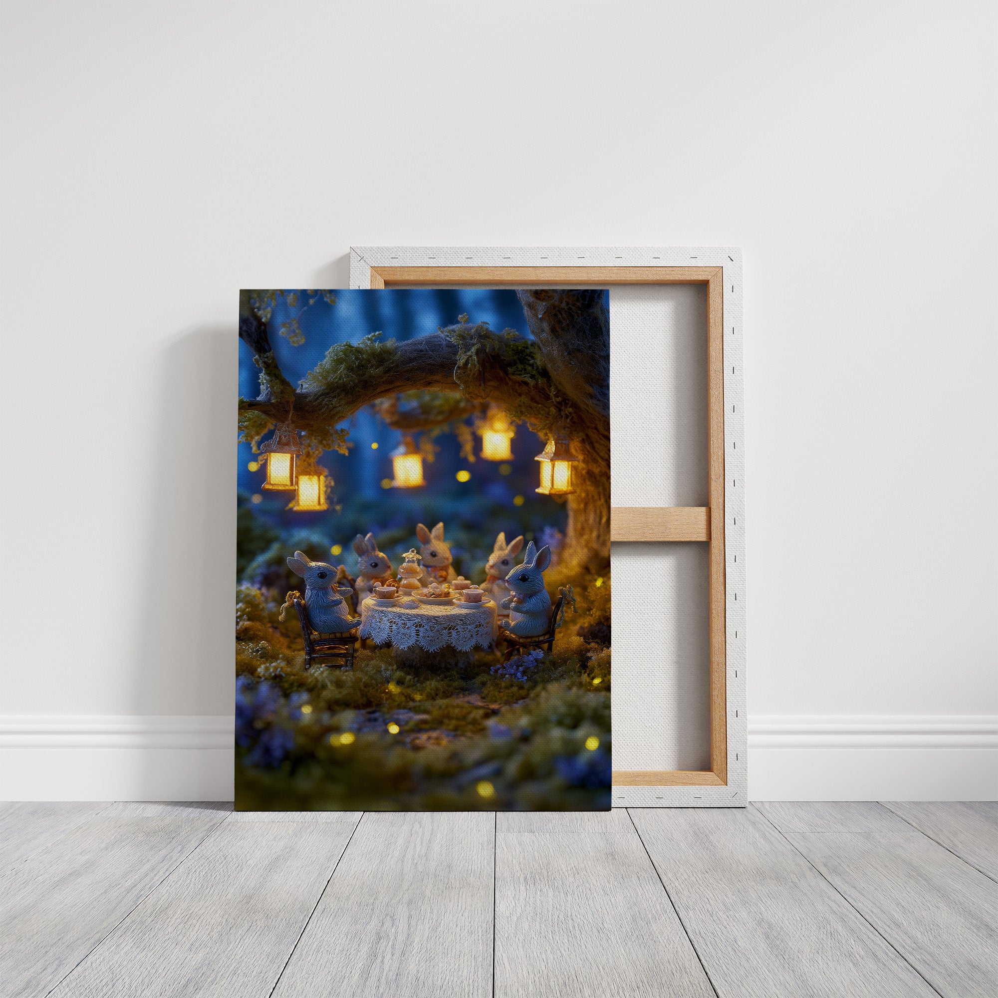 Tiny lanterns cast a golden glow over a secret gathering beneath the arched roots. Miniature rabbits sit patiently around a lace-trimmed table, their evening tea ceremony a ritual of woodland magic and camaraderie. The scene captures a moment frozen between fantasy and childhood wonder, where moss-covered branches form a natural cathedral and floating lights dance like fireflies in the twilight blue backdrop. This enchanting vignette would bring whimsical charm to a child's bedroom or create a conversation piece in a reading nook where imagination is celebrated.