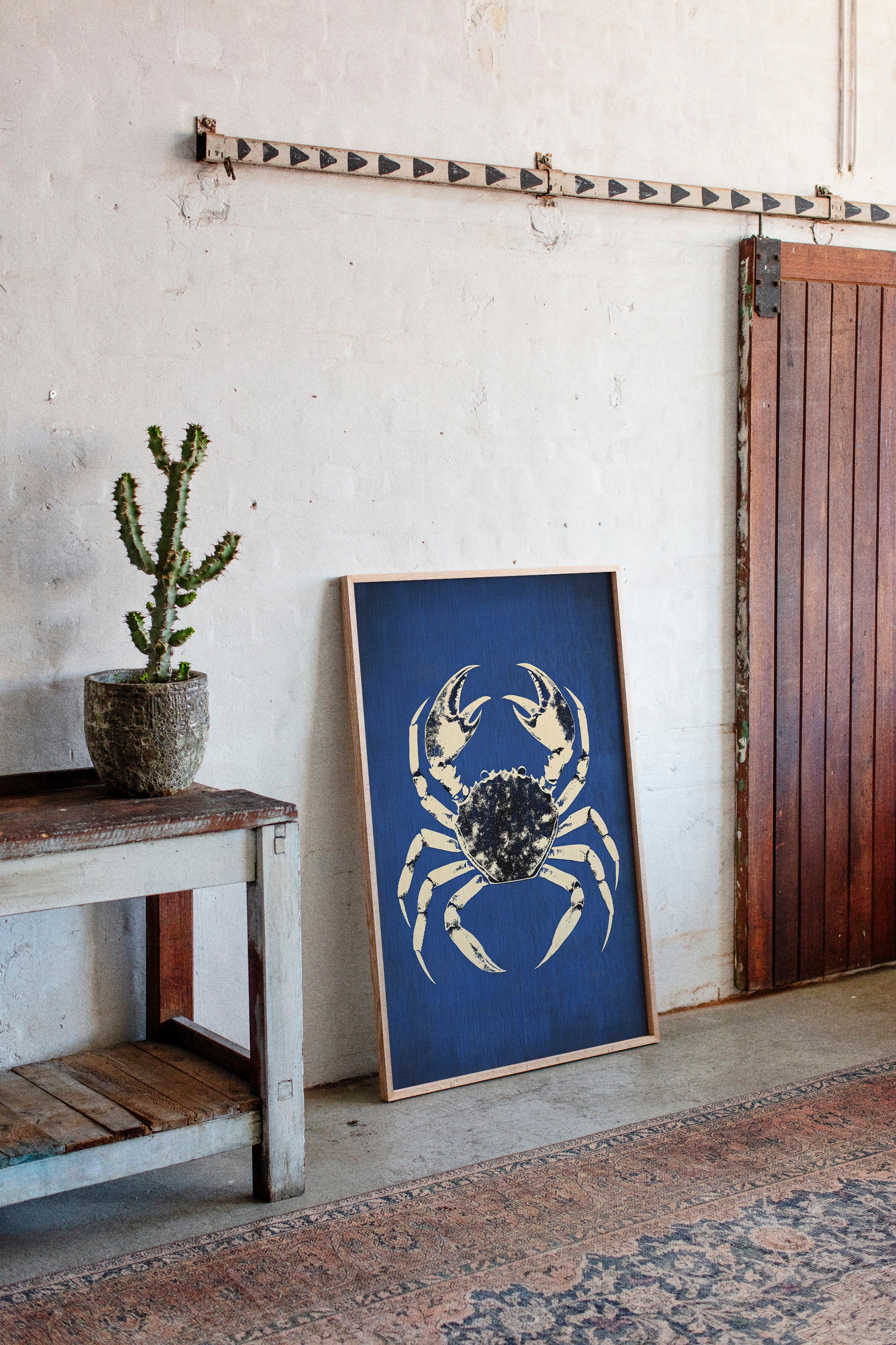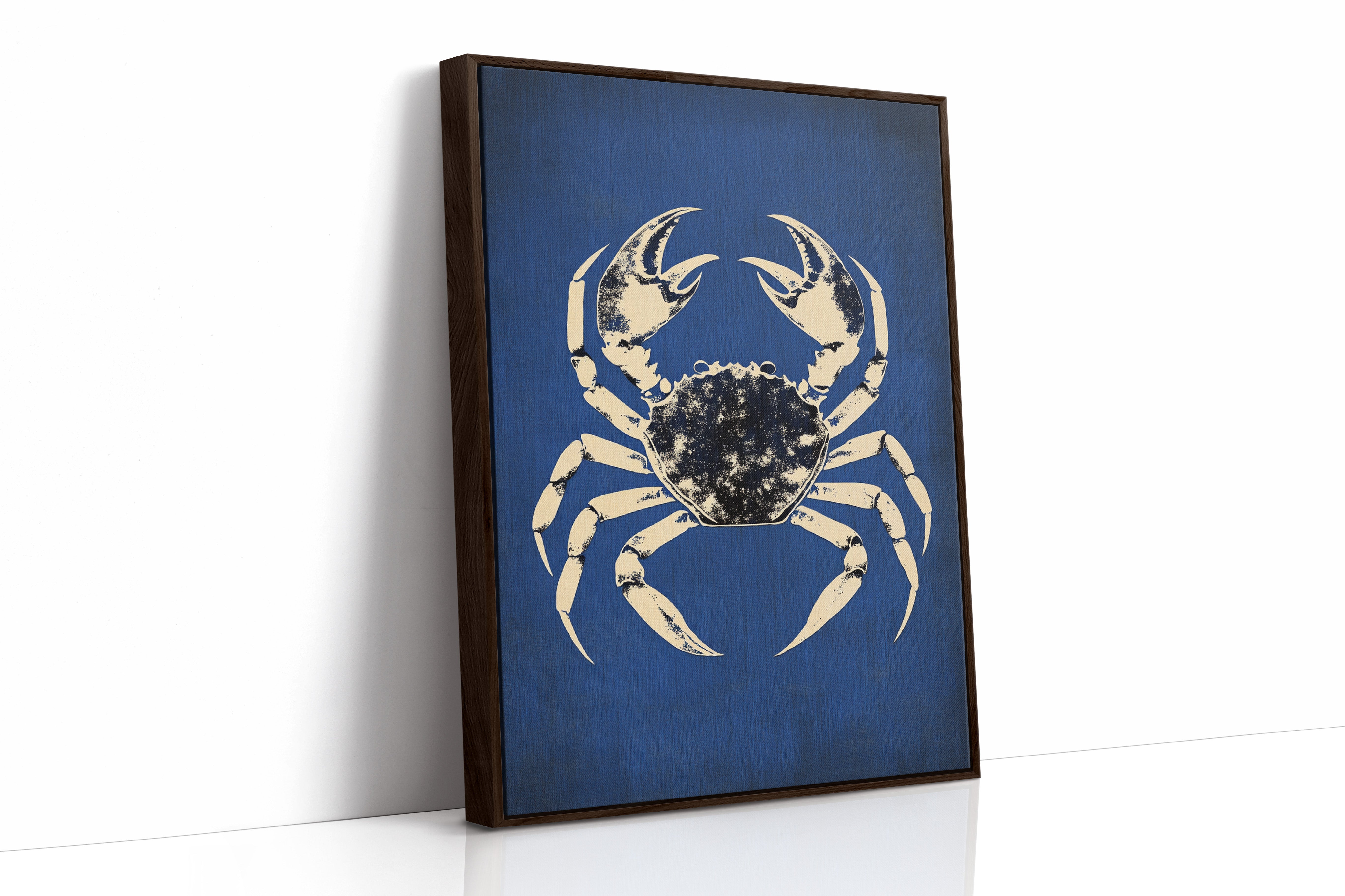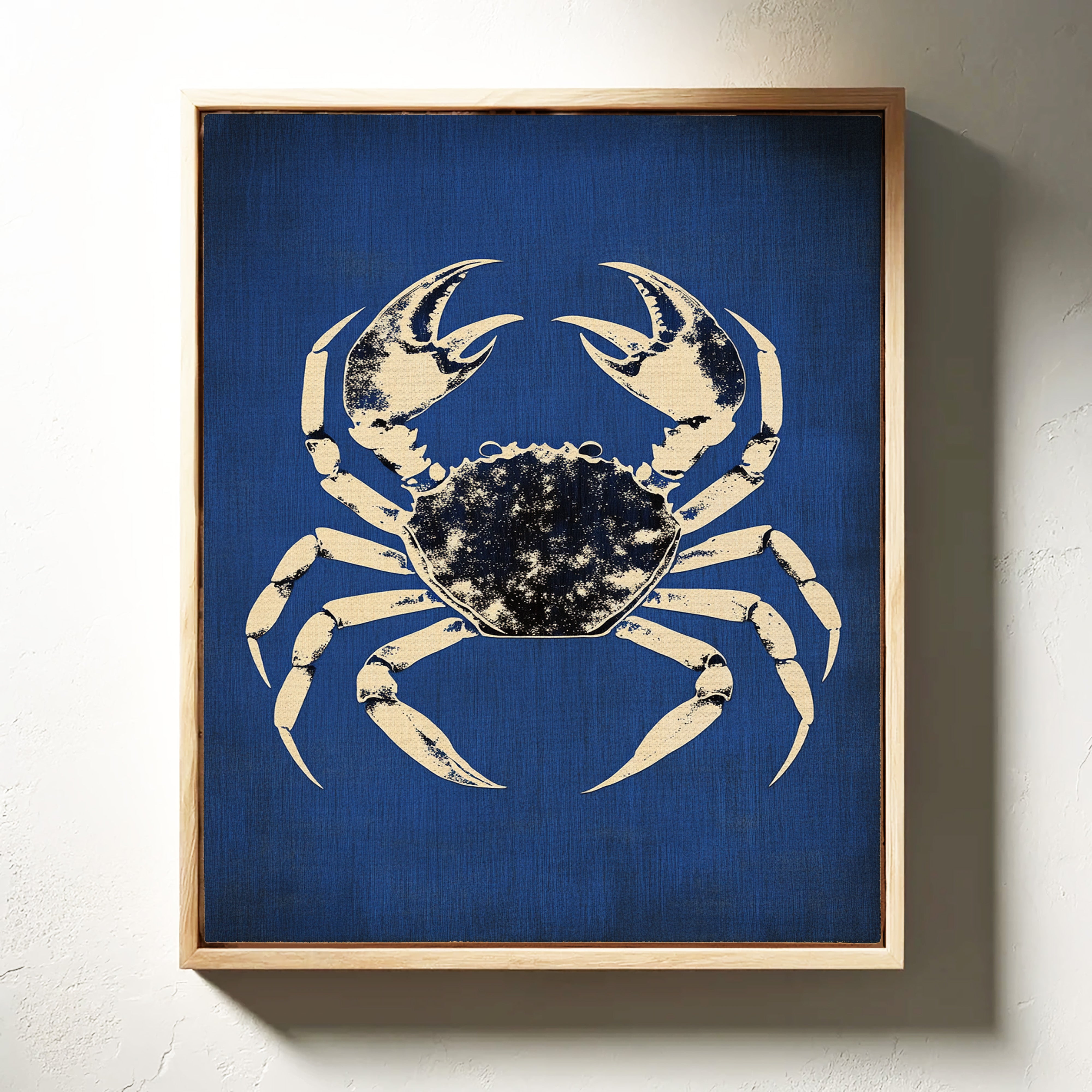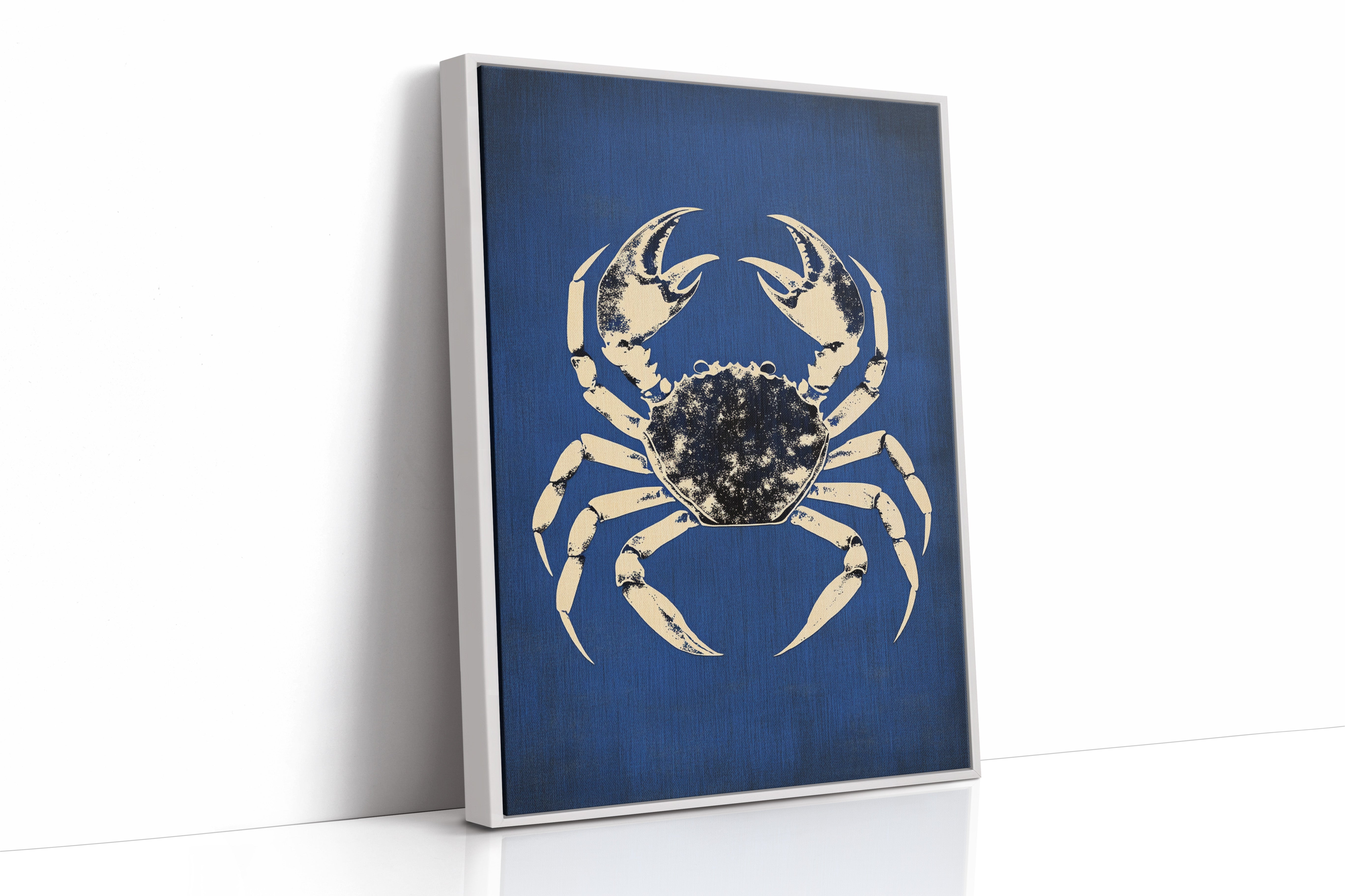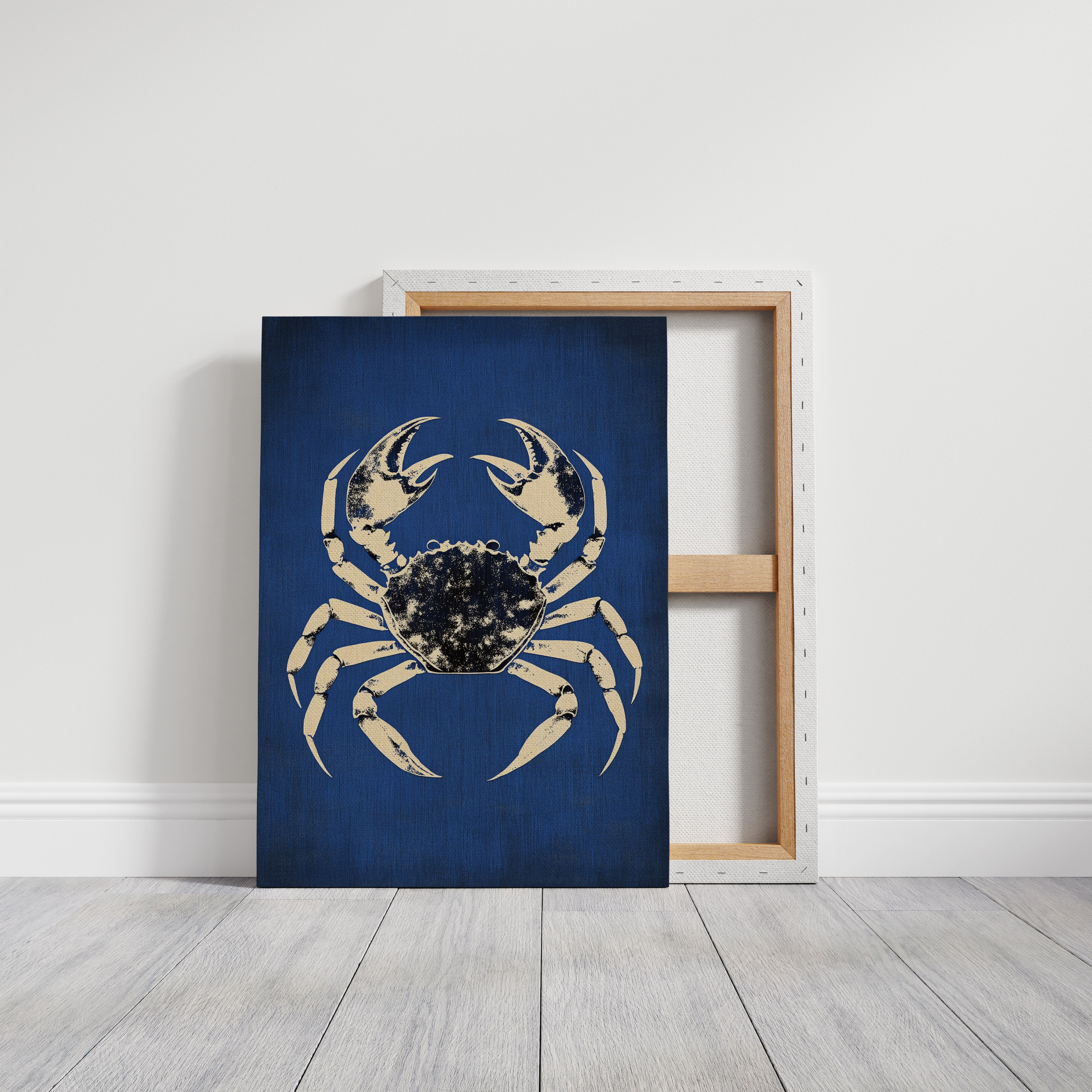 Against a deep navy backdrop, a weathered crab silhouette emerges in creamy white, telling tales of salty waters and moonlit shores. The textured illustration captures the creature's commanding presence with bold, geometric claws and a speckled shell that speaks of time spent beneath the waves. This contemporary interpretation balances precise linework with organic textures, creating a striking study in contrast and maritime symbolism. Perfect for coastal homes or modern spaces seeking a sophisticated nautical accent, this piece brings the refined essence of oceanside living indoors.