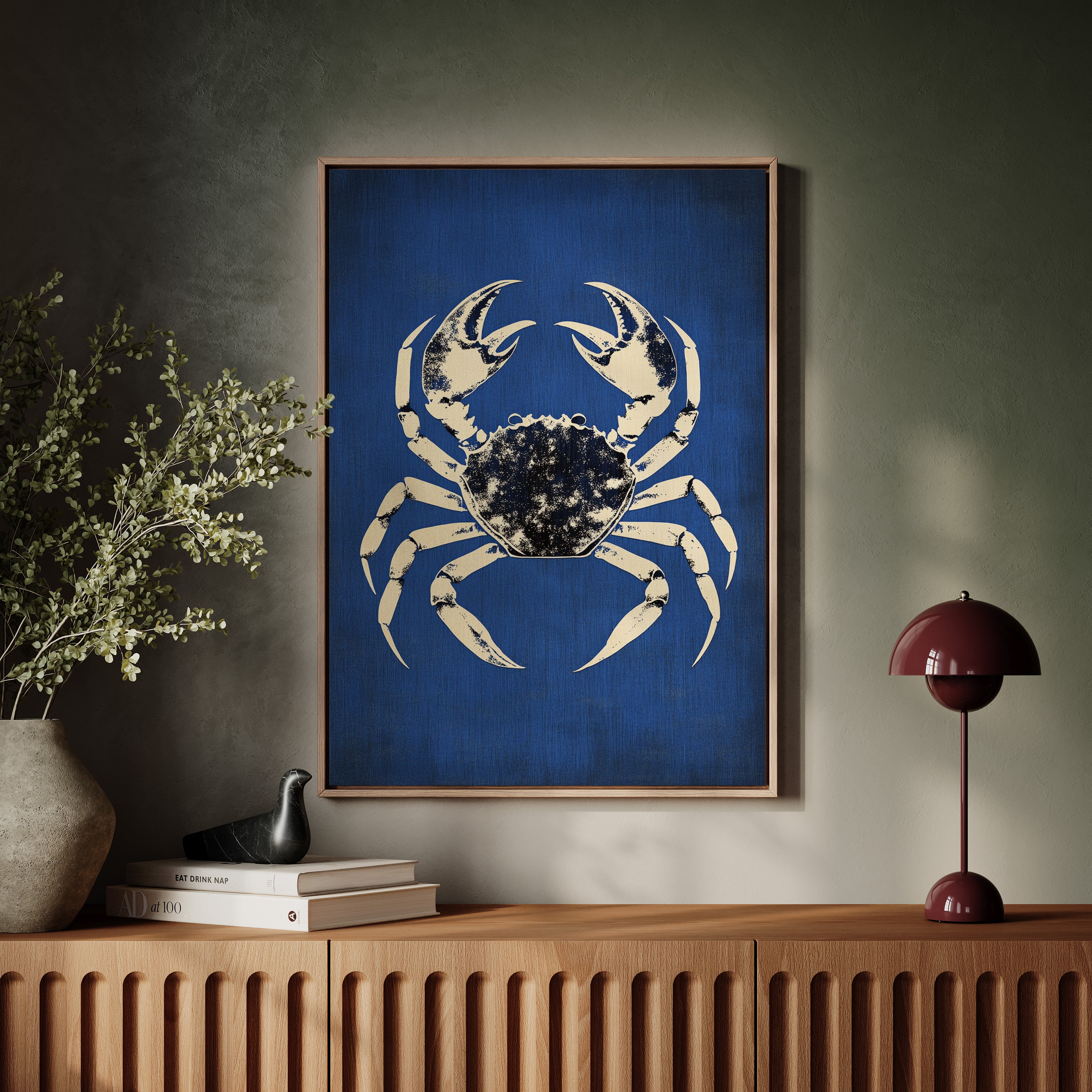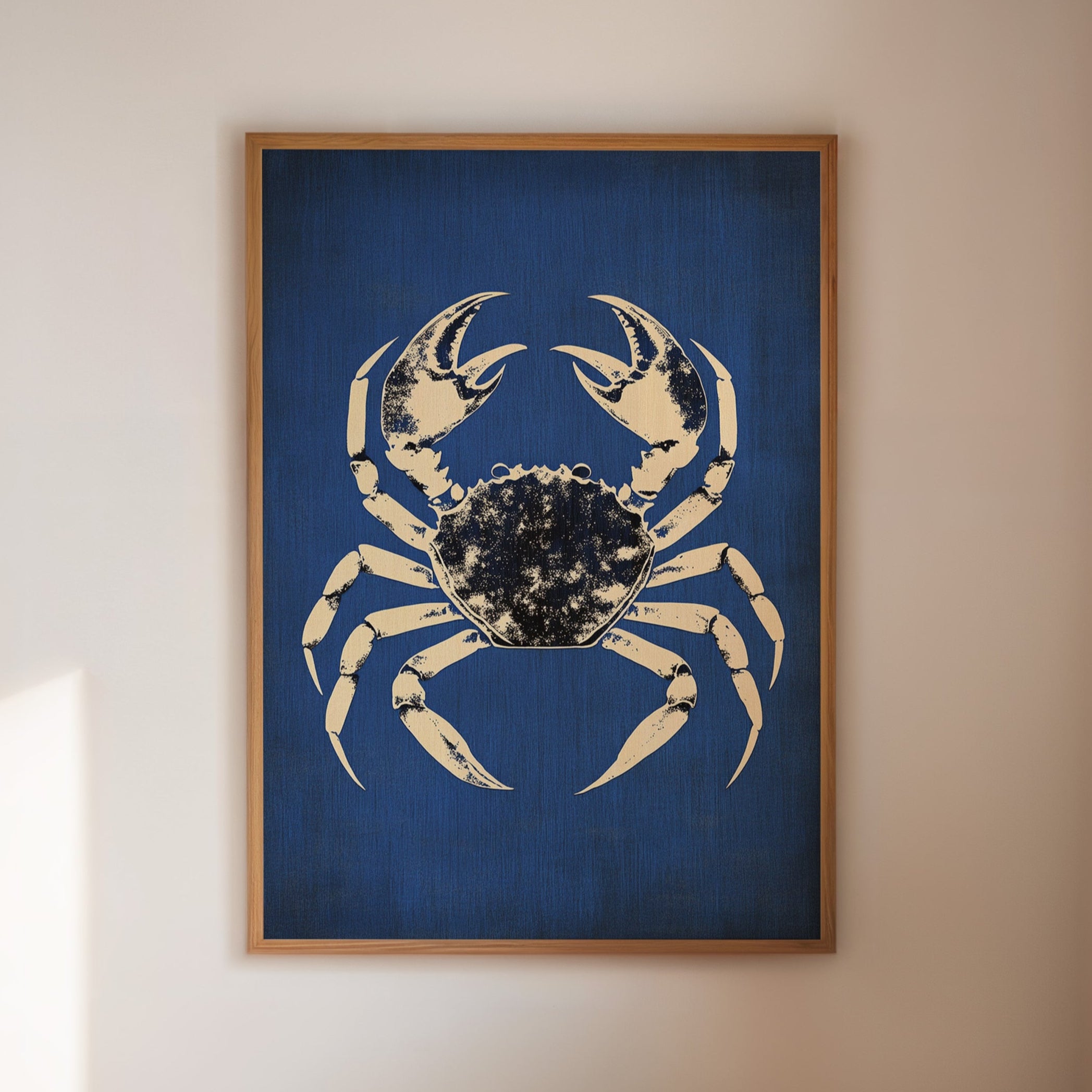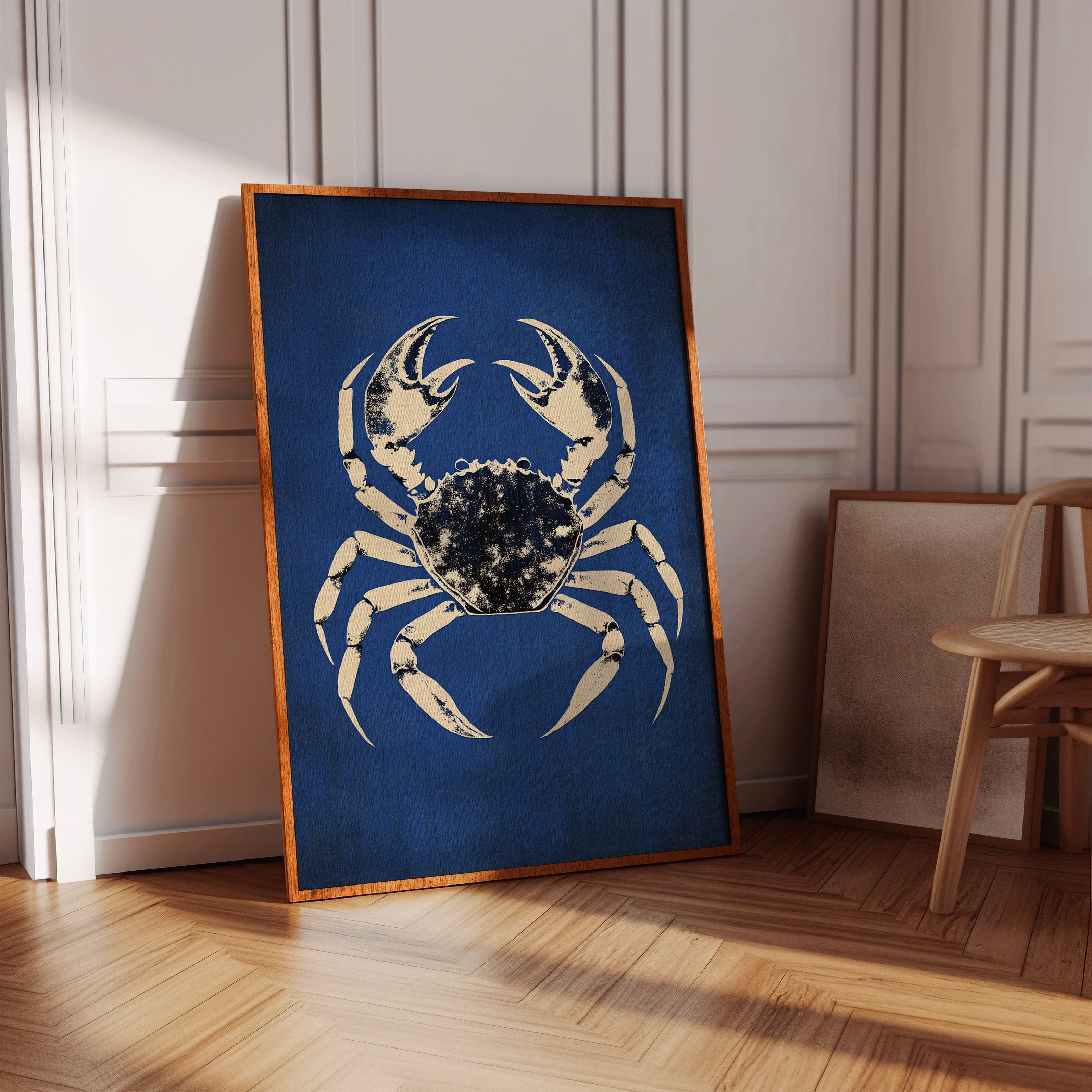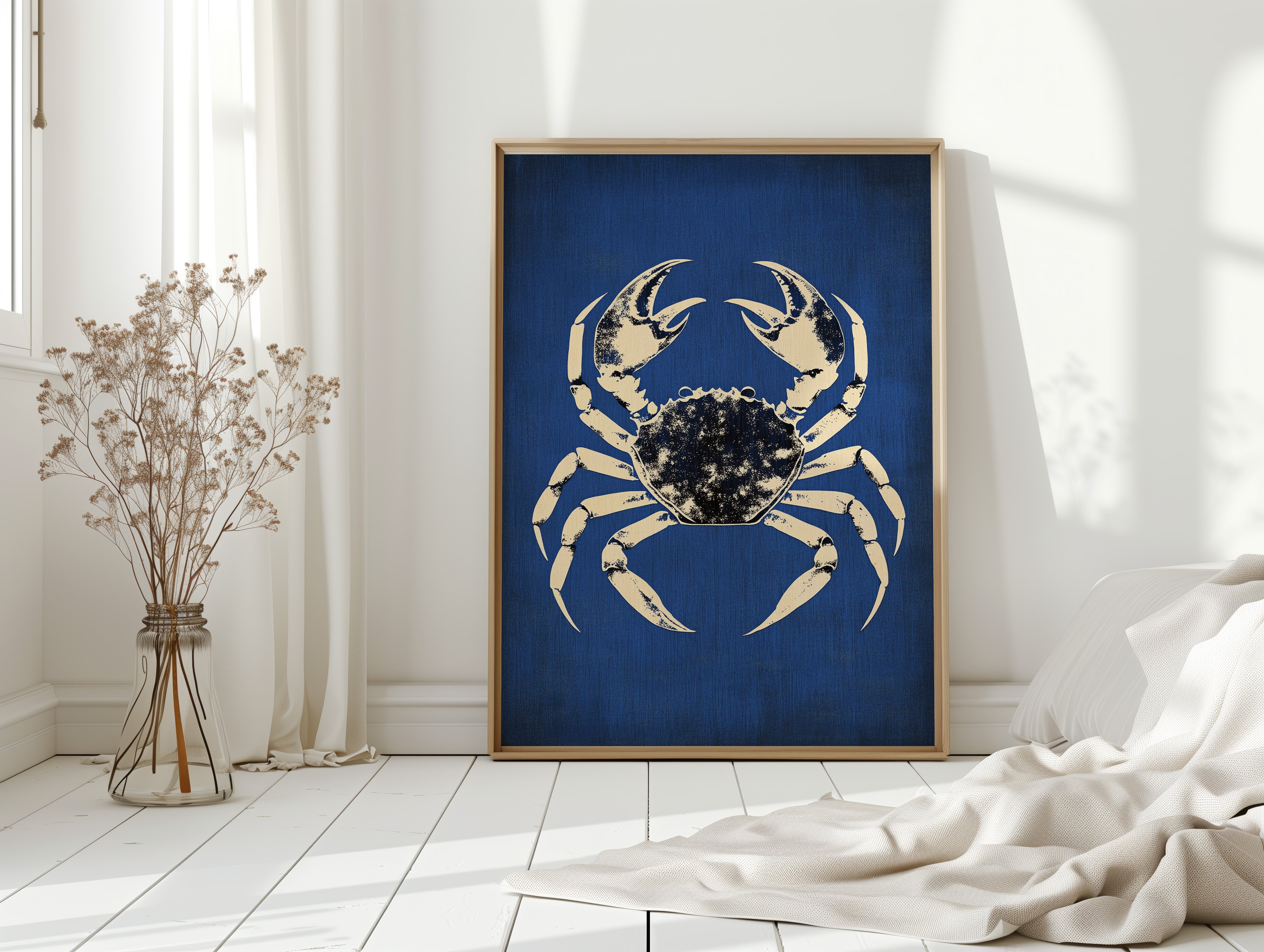 Against a deep navy backdrop, a weathered crab silhouette emerges in creamy white, telling tales of salty waters and moonlit shores. The textured illustration captures the creature's commanding presence with bold, geometric claws and a speckled shell that speaks of time spent beneath the waves. This contemporary interpretation balances precise linework with organic textures, creating a striking study in contrast and maritime symbolism. Perfect for coastal homes or modern spaces seeking a sophisticated nautical accent, this piece brings the refined essence of oceanside living indoors.