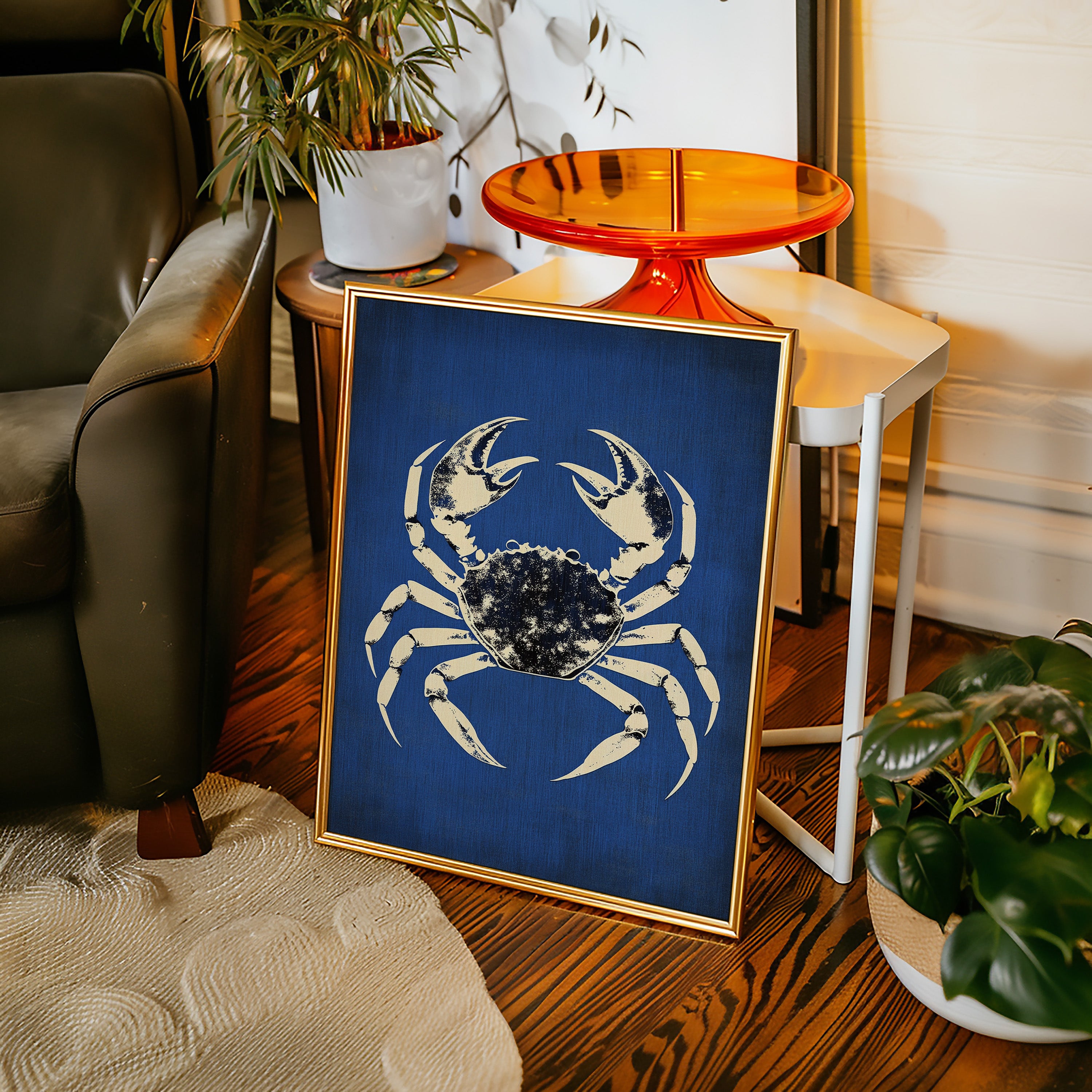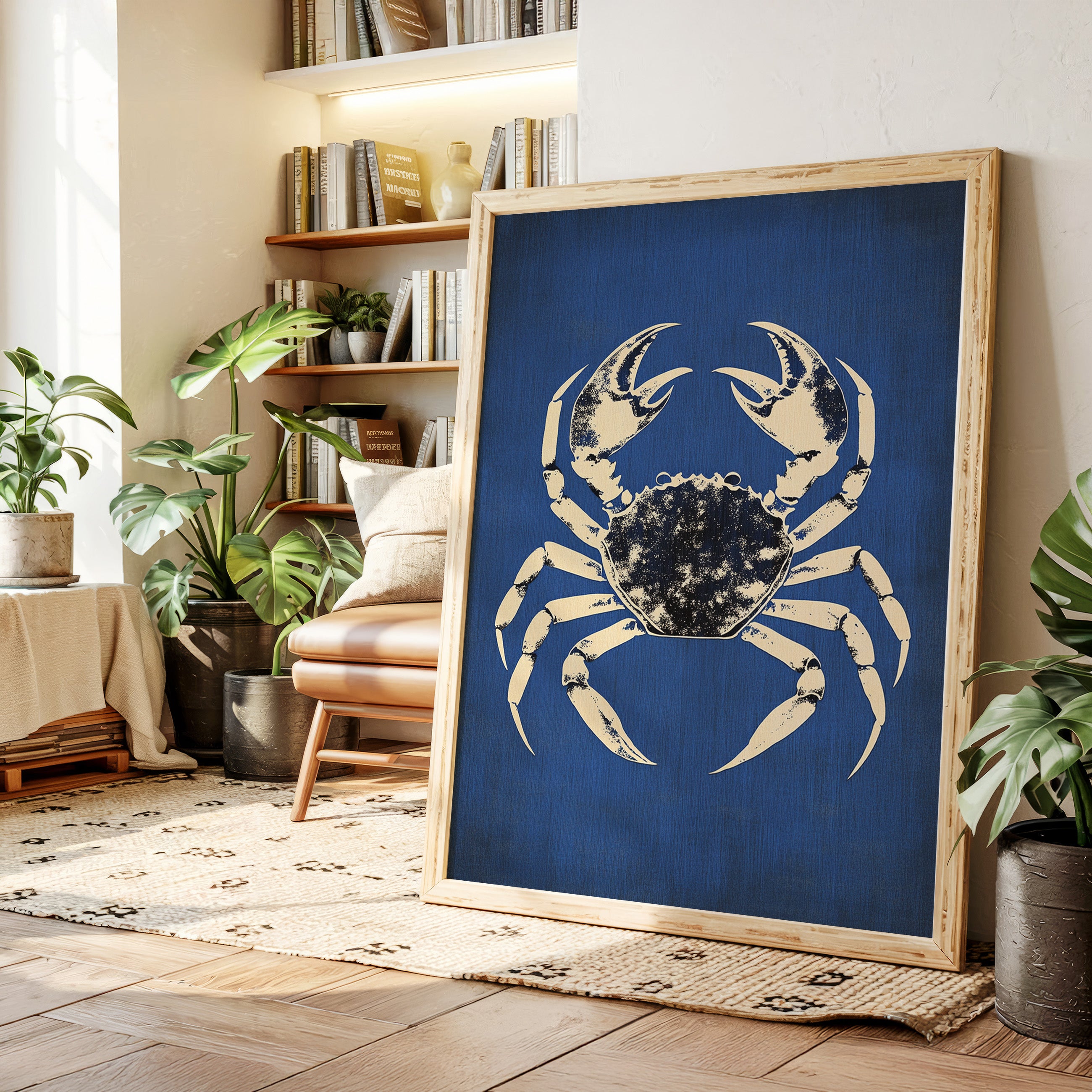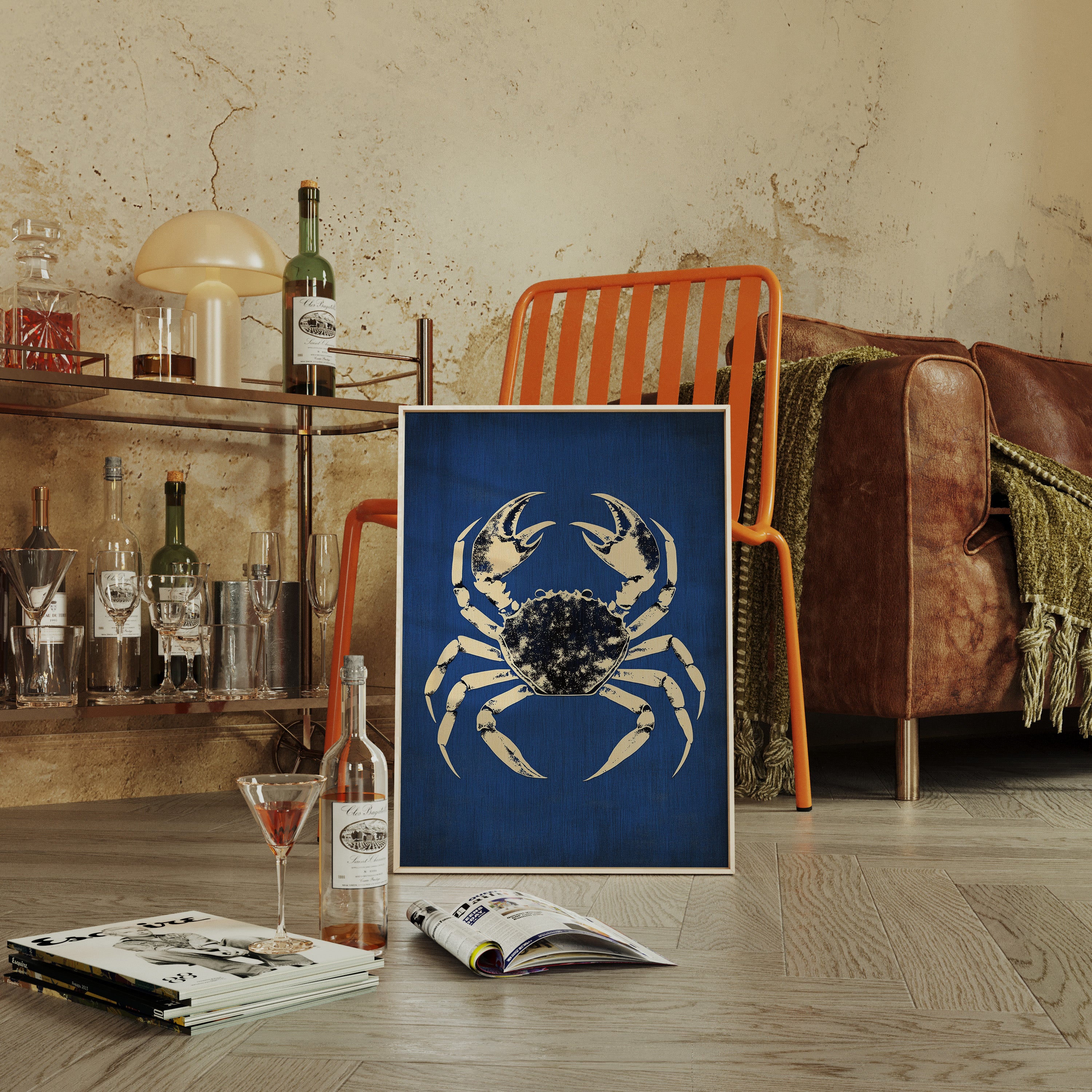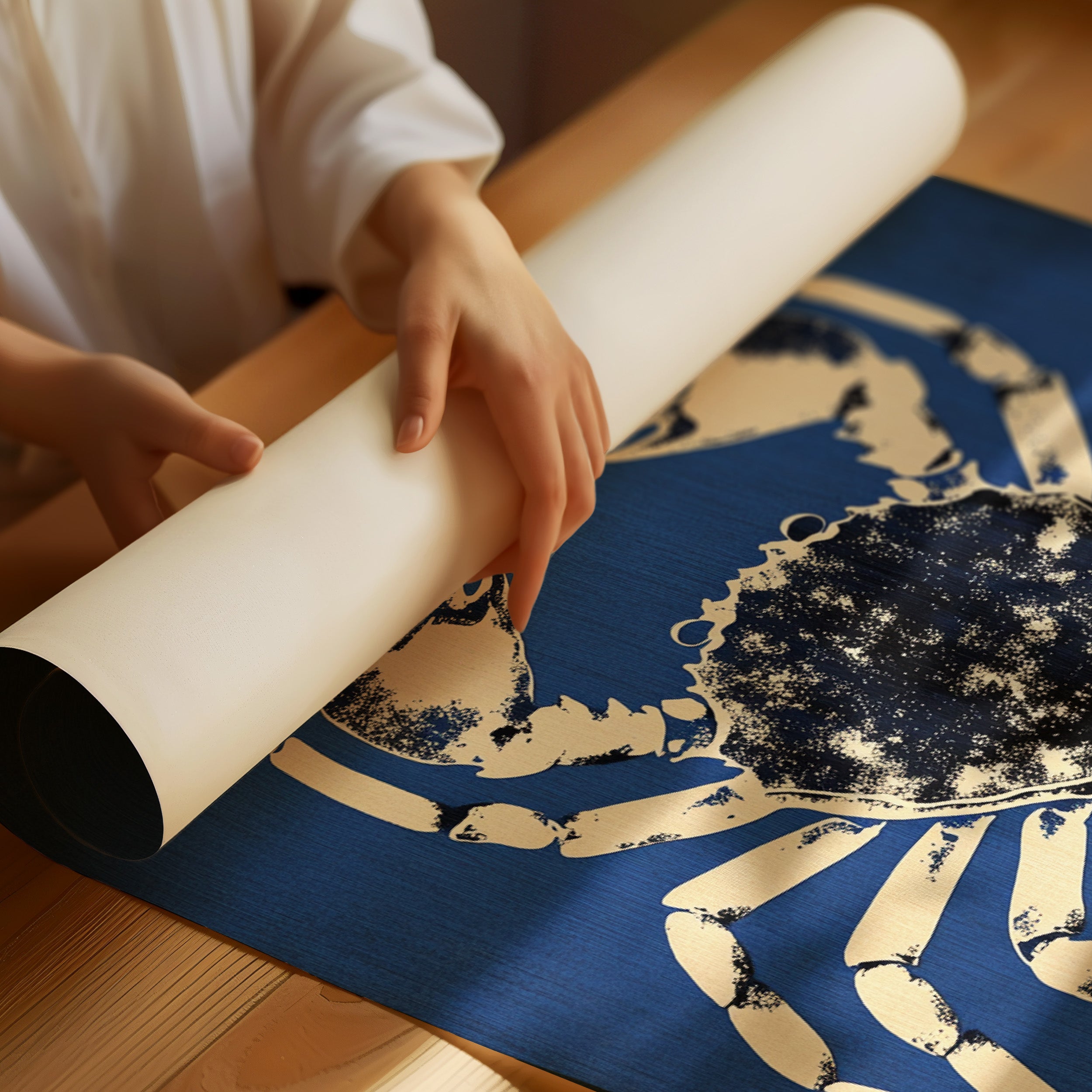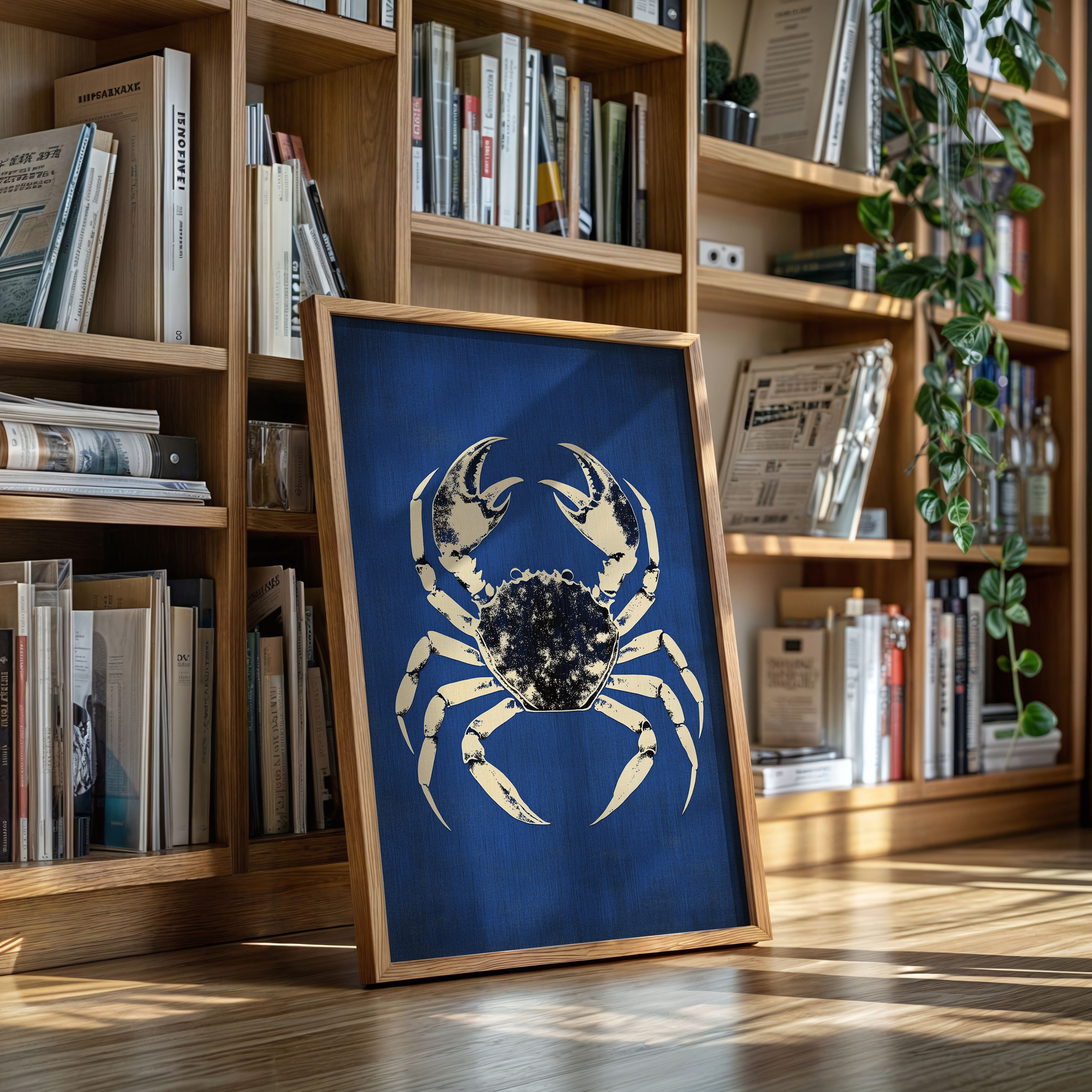 Against a deep navy backdrop, a weathered crab silhouette emerges in creamy white, telling tales of salty waters and moonlit shores. The textured illustration captures the creature's commanding presence with bold, geometric claws and a speckled shell that speaks of time spent beneath the waves. This contemporary interpretation balances precise linework with organic textures, creating a striking study in contrast and maritime symbolism. Perfect for coastal homes or modern spaces seeking a sophisticated nautical accent, this piece brings the refined essence of oceanside living indoors.