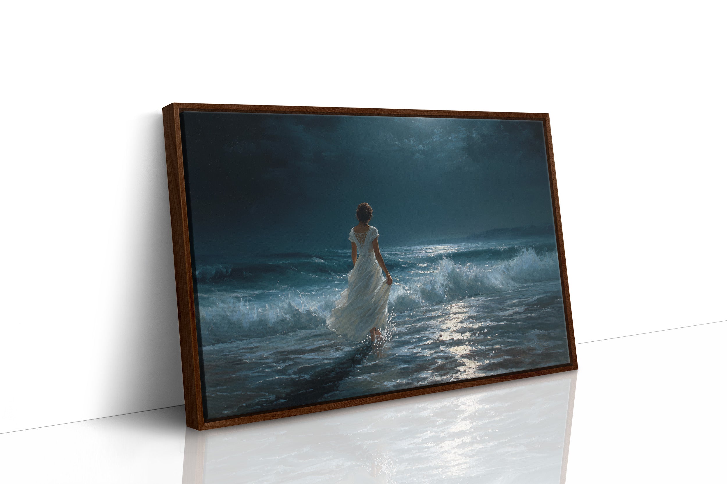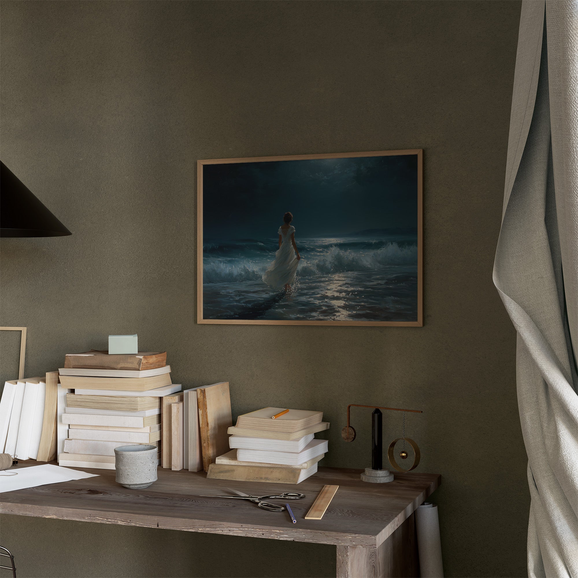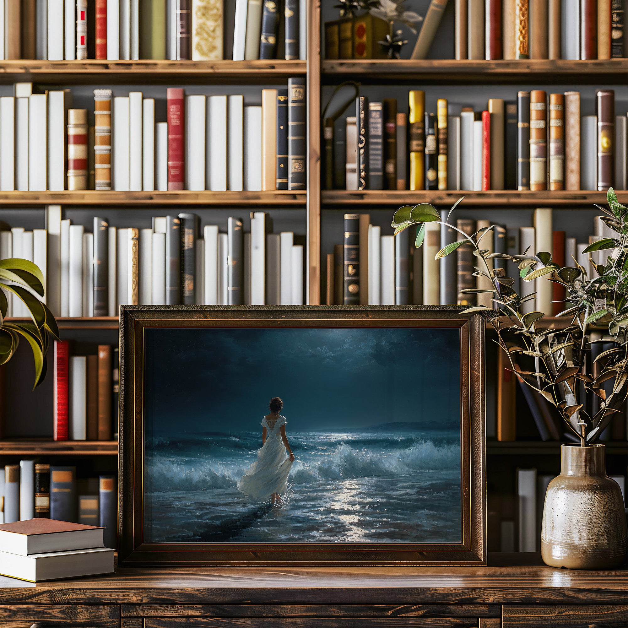 Moonlight carves a silver path across turbulent waters as a solitary figure stands at the threshold between land and sea. The flowing white dress catches the ocean breeze, becoming one with the foaming waves that reach hungrily toward shore. Deep blues and teals create a dreamlike atmosphere where reality blurs with the mysterious depths beyond. This evocative piece brings literary depth to any study, reading nook, or contemplative space where stories and imagination flourish.