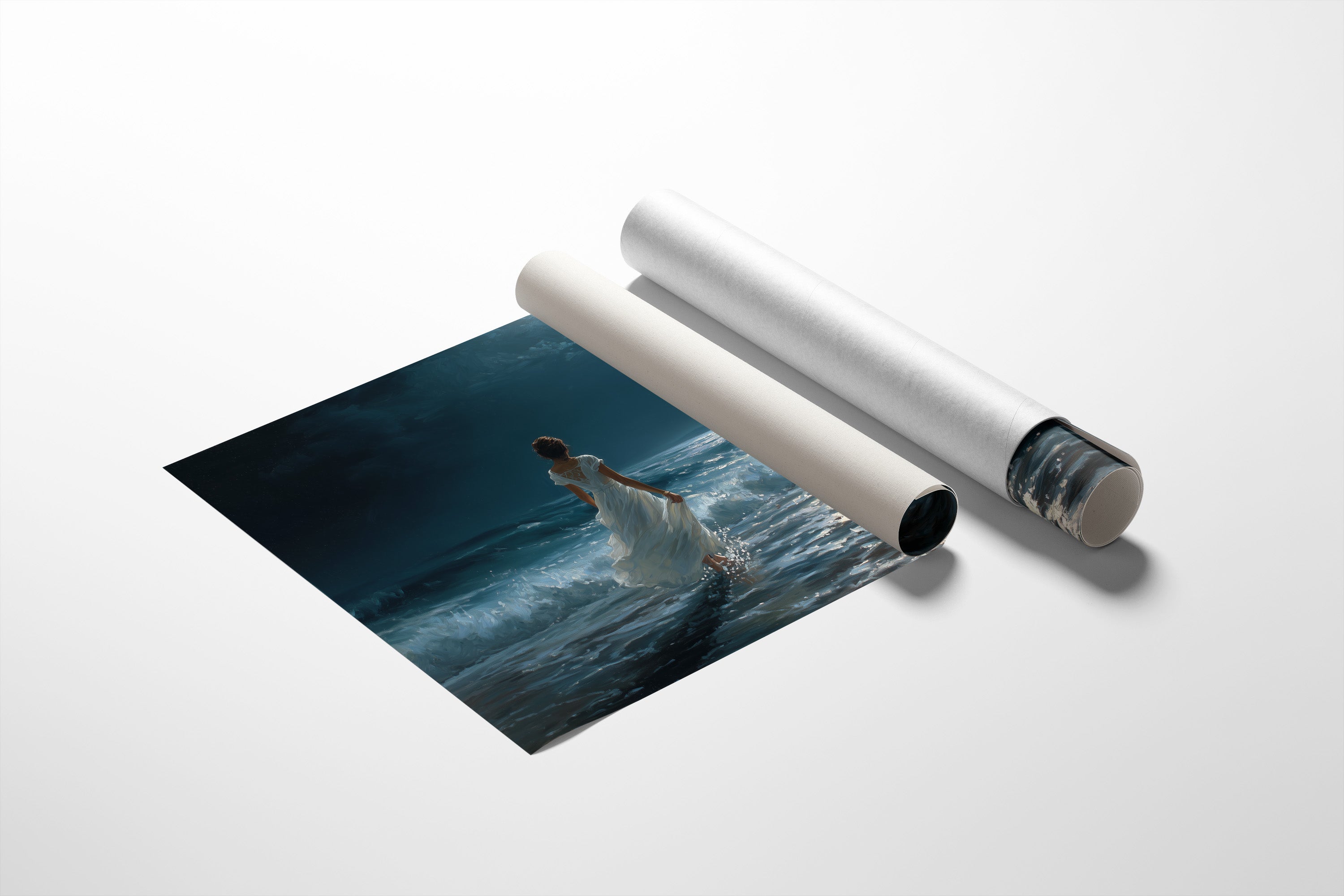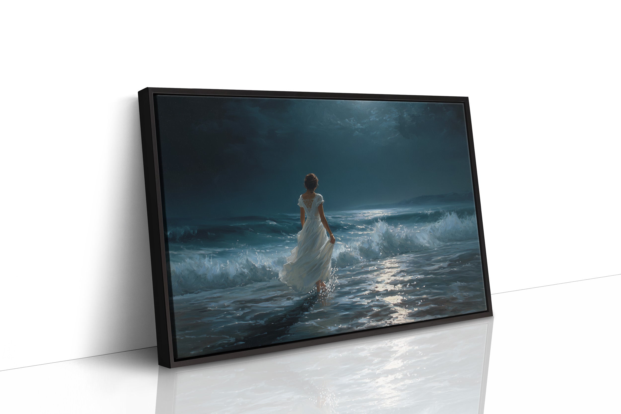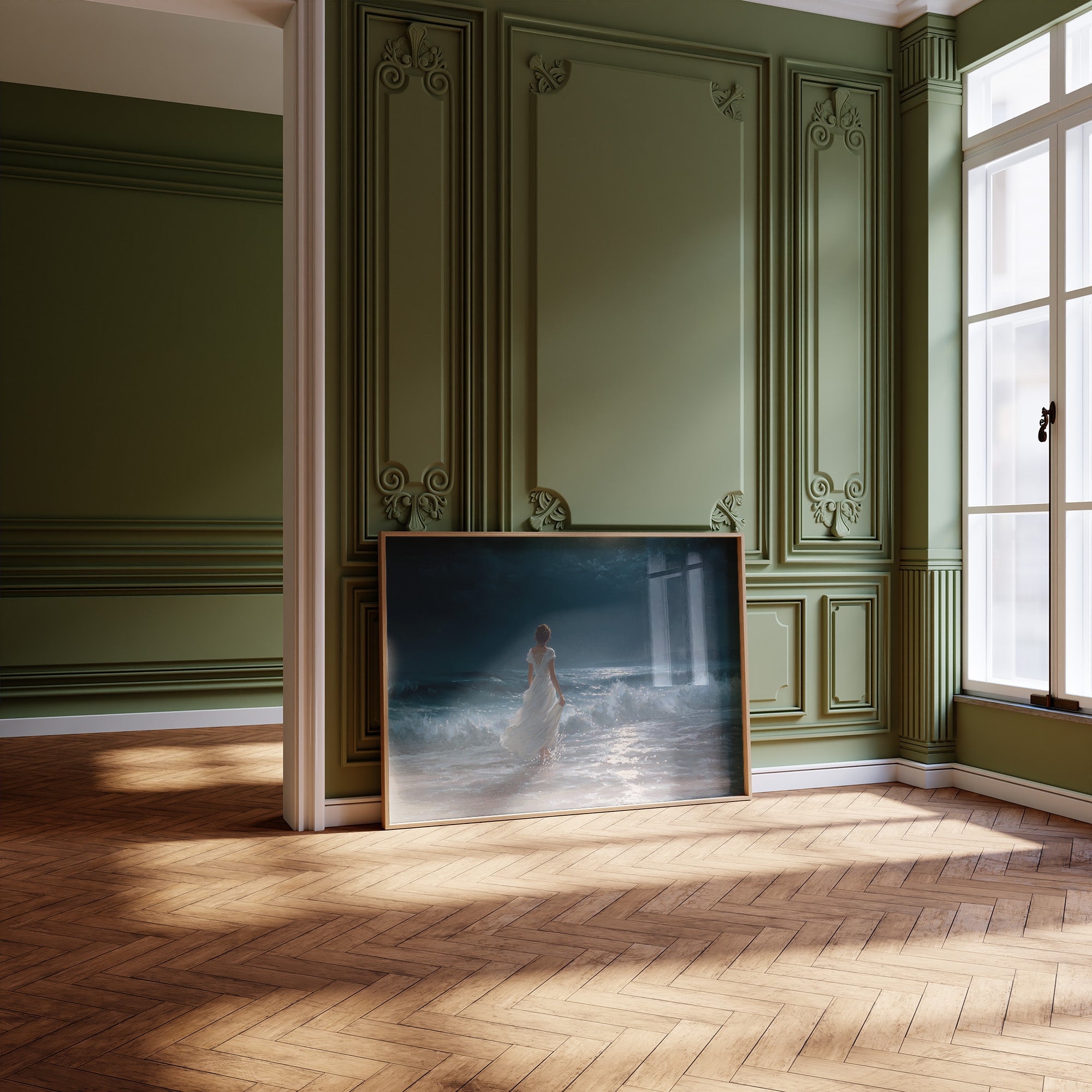 Moonlight carves a silver path across turbulent waters as a solitary figure stands at the threshold between land and sea. The flowing white dress catches the ocean breeze, becoming one with the foaming waves that reach hungrily toward shore. Deep blues and teals create a dreamlike atmosphere where reality blurs with the mysterious depths beyond. This evocative piece brings literary depth to any study, reading nook, or contemplative space where stories and imagination flourish.