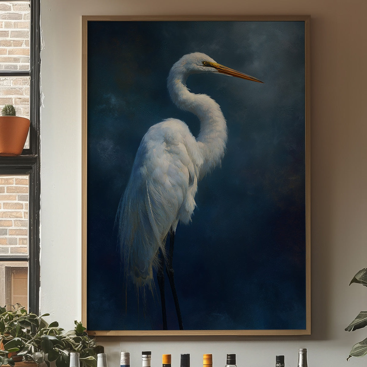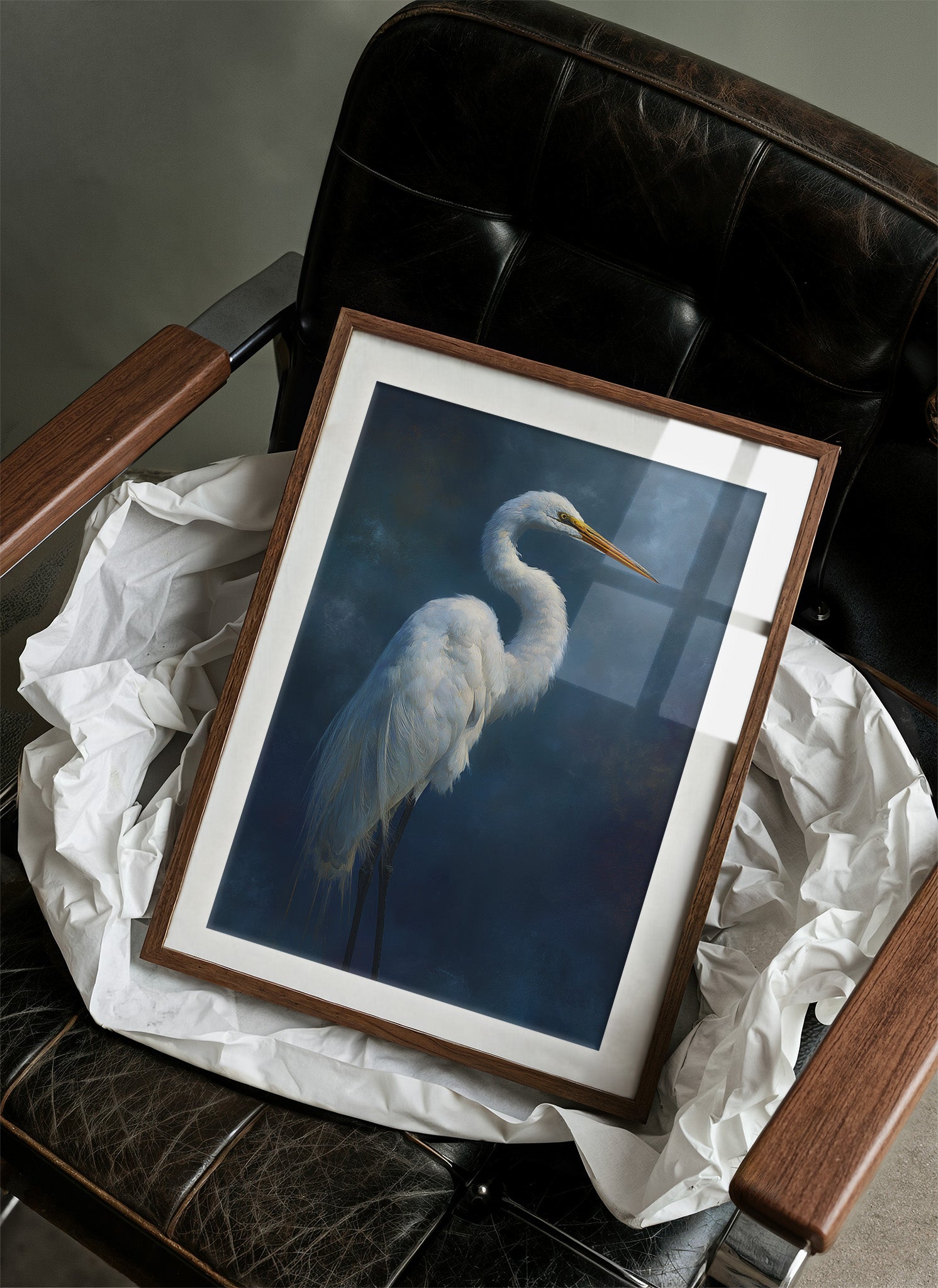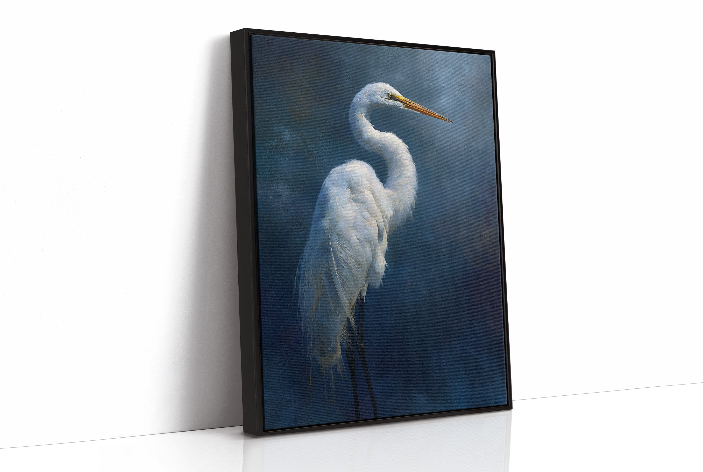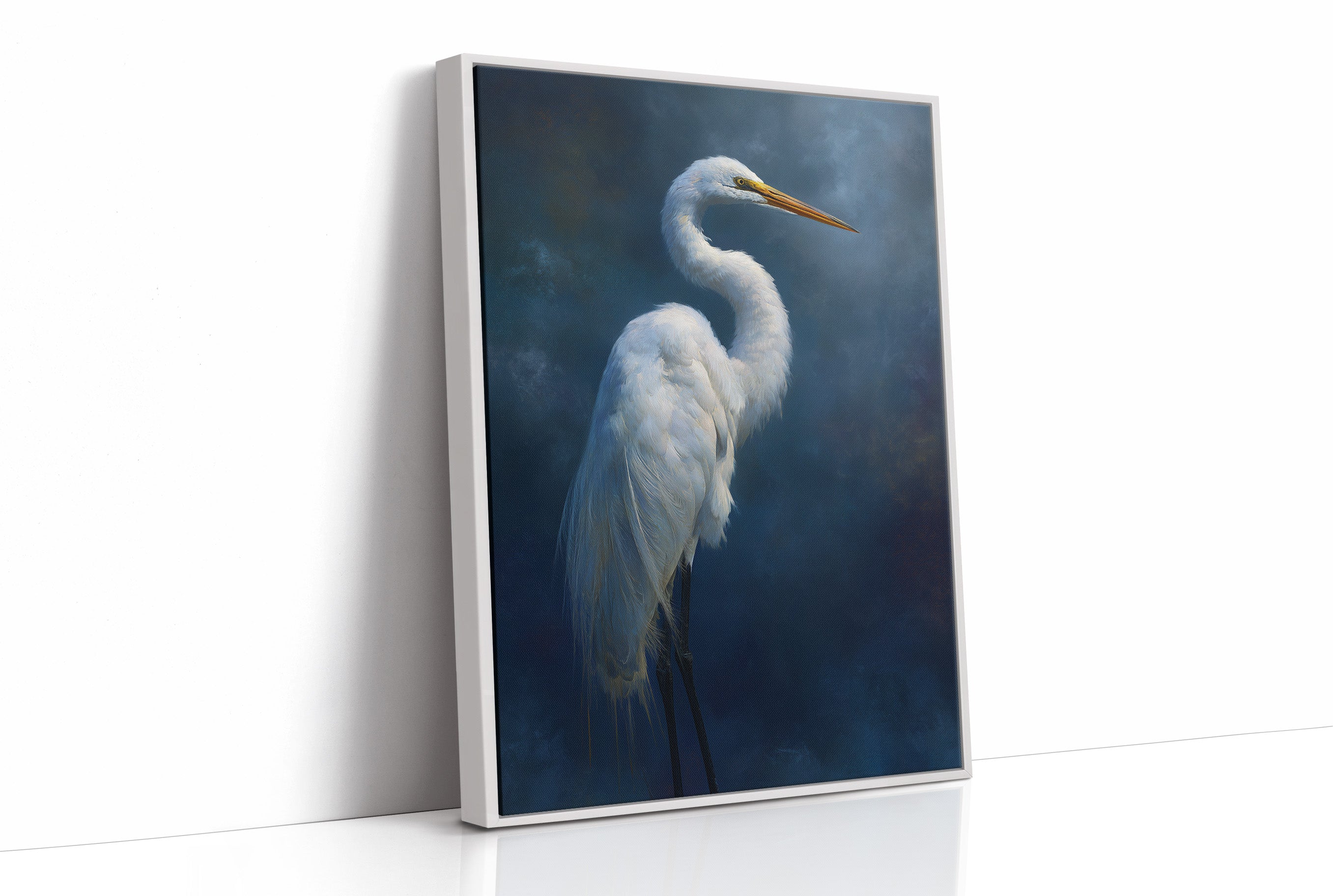 A striking portrait of an elegant egret set against a deep indigo background, creating a dramatic contrast between the bird's pristine white plumage and the mysterious dark atmosphere surrounding it. The artwork demonstrates masterful technique in rendering the delicate feather details while maintaining an atmospheric, almost ethereal quality.