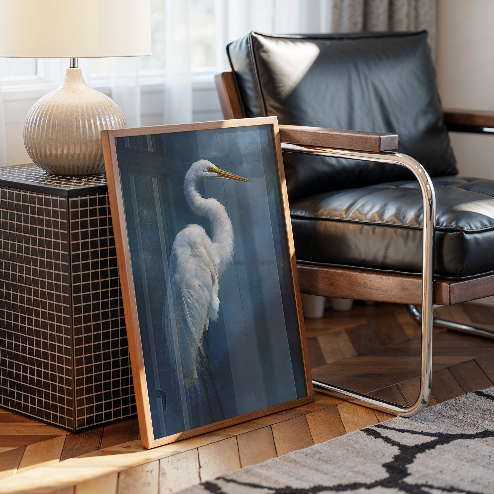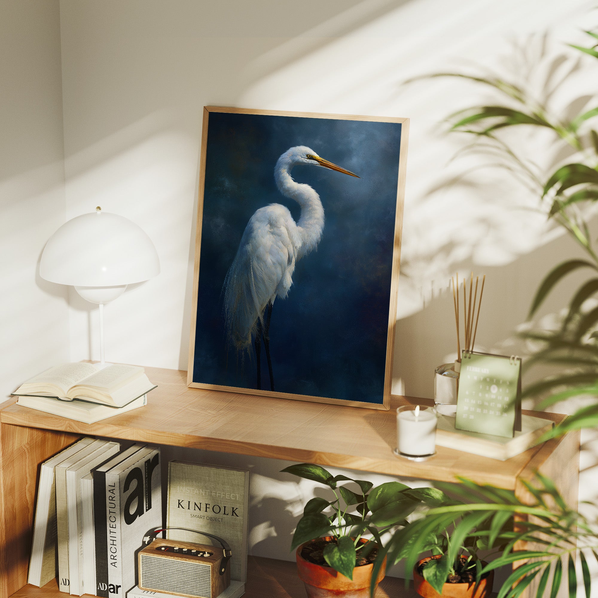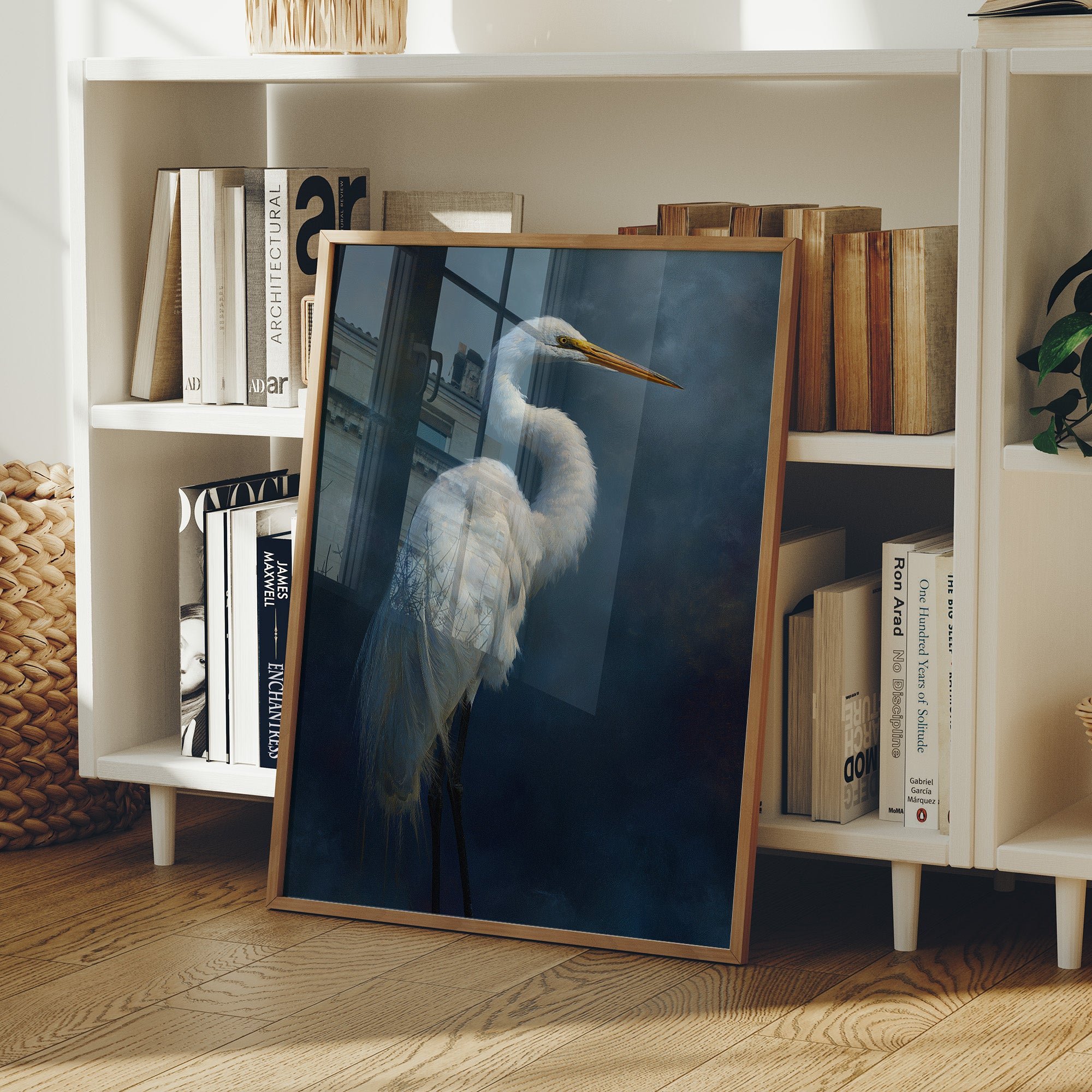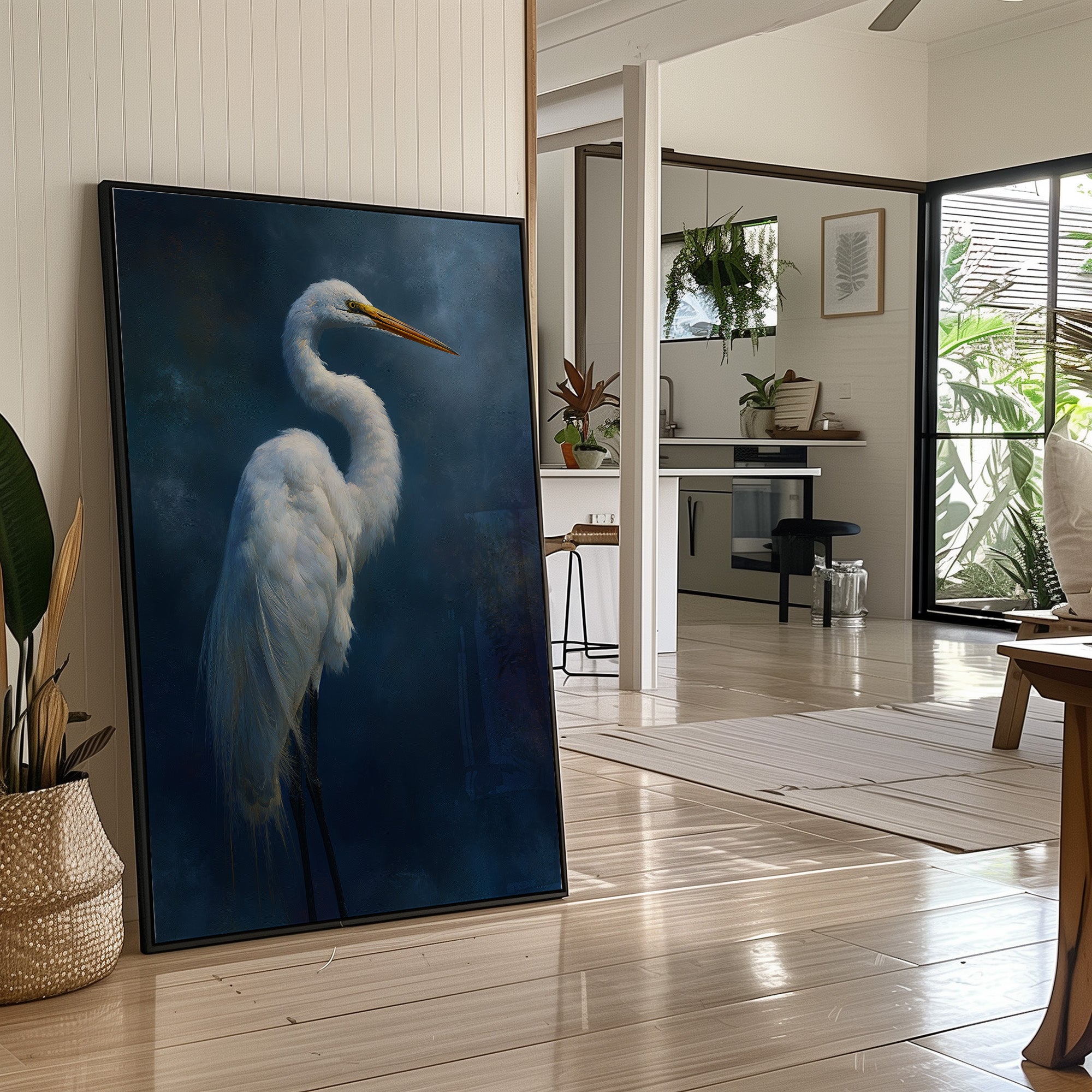 A striking portrait of an elegant egret set against a deep indigo background, creating a dramatic contrast between the bird's pristine white plumage and the mysterious dark atmosphere surrounding it. The artwork demonstrates masterful technique in rendering the delicate feather details while maintaining an atmospheric, almost ethereal quality.