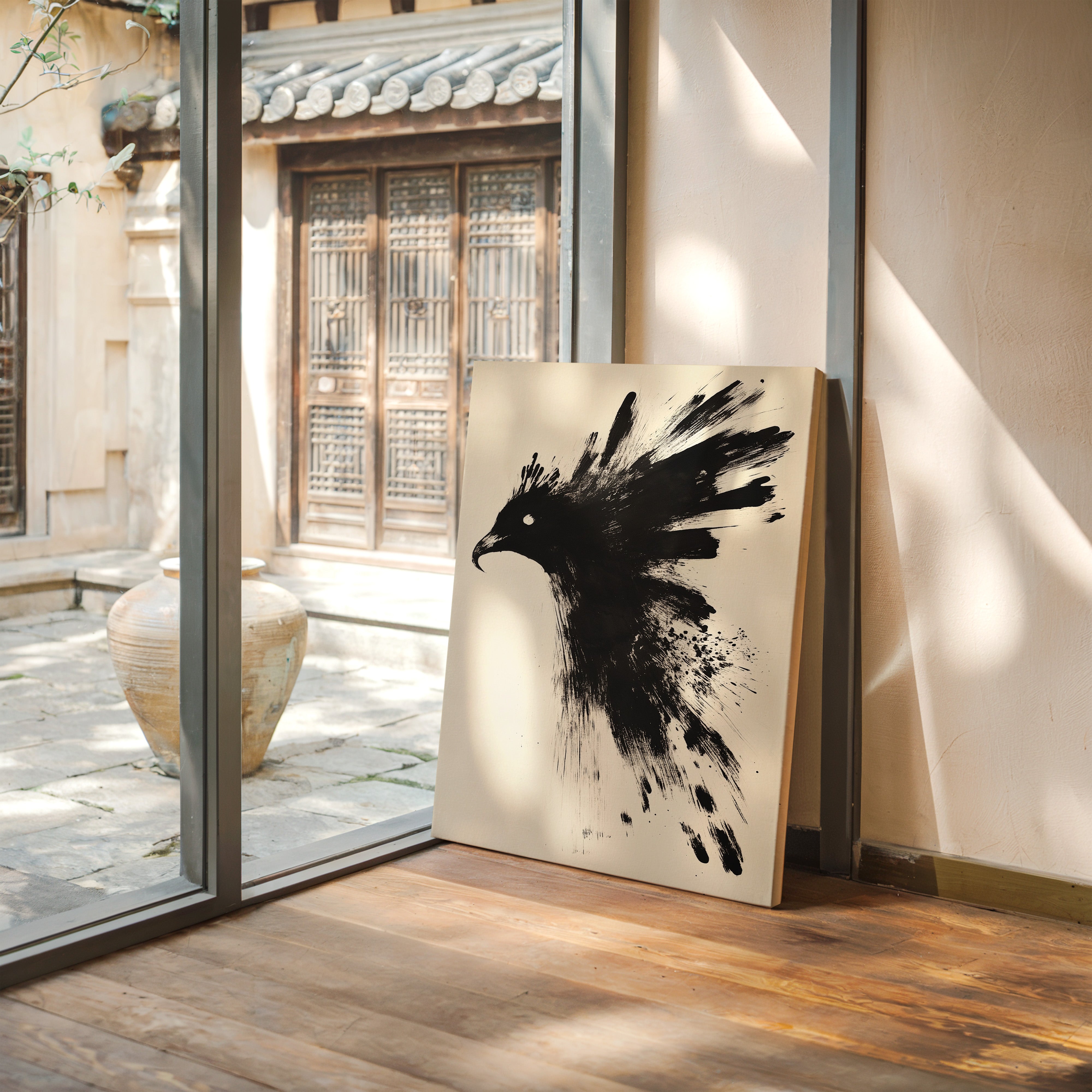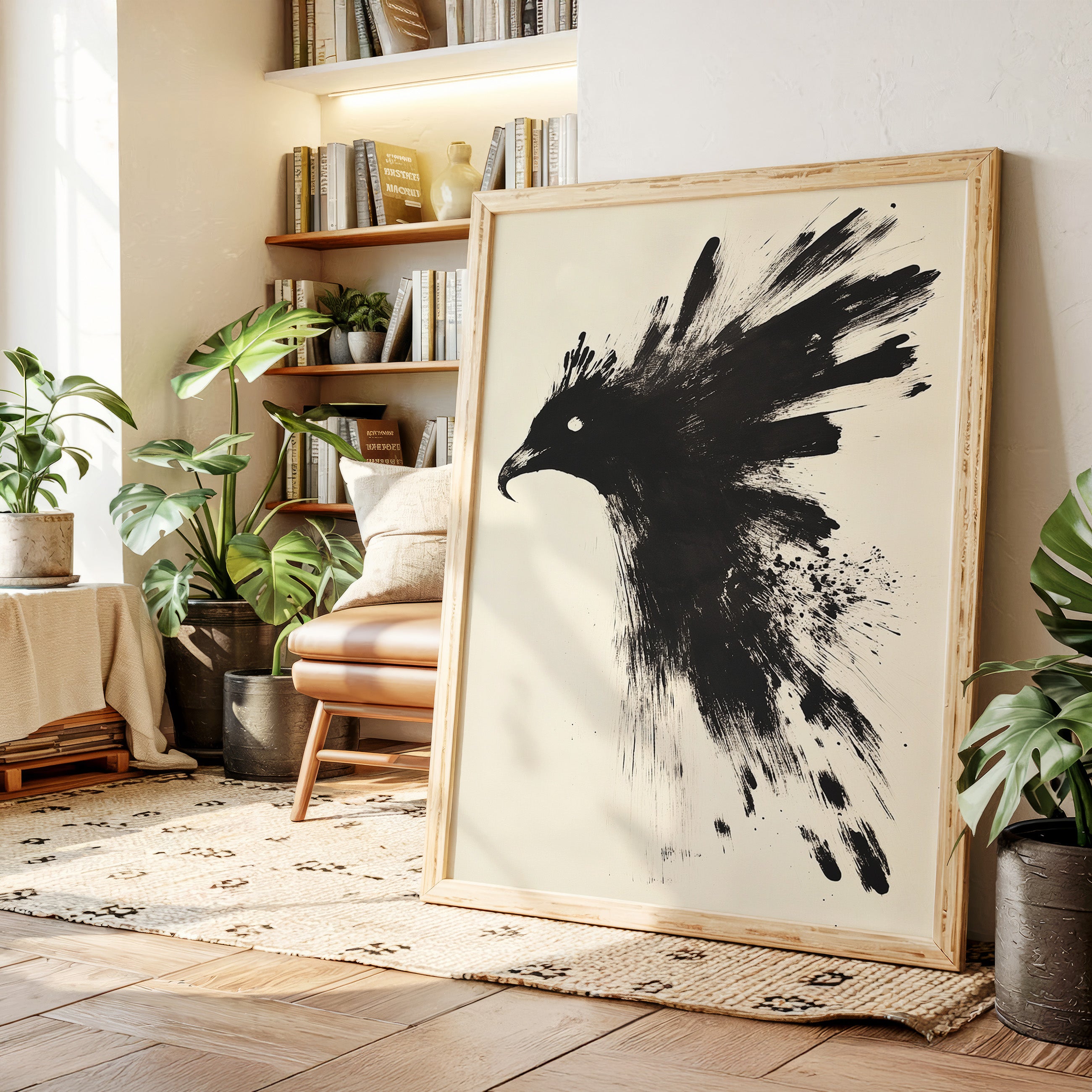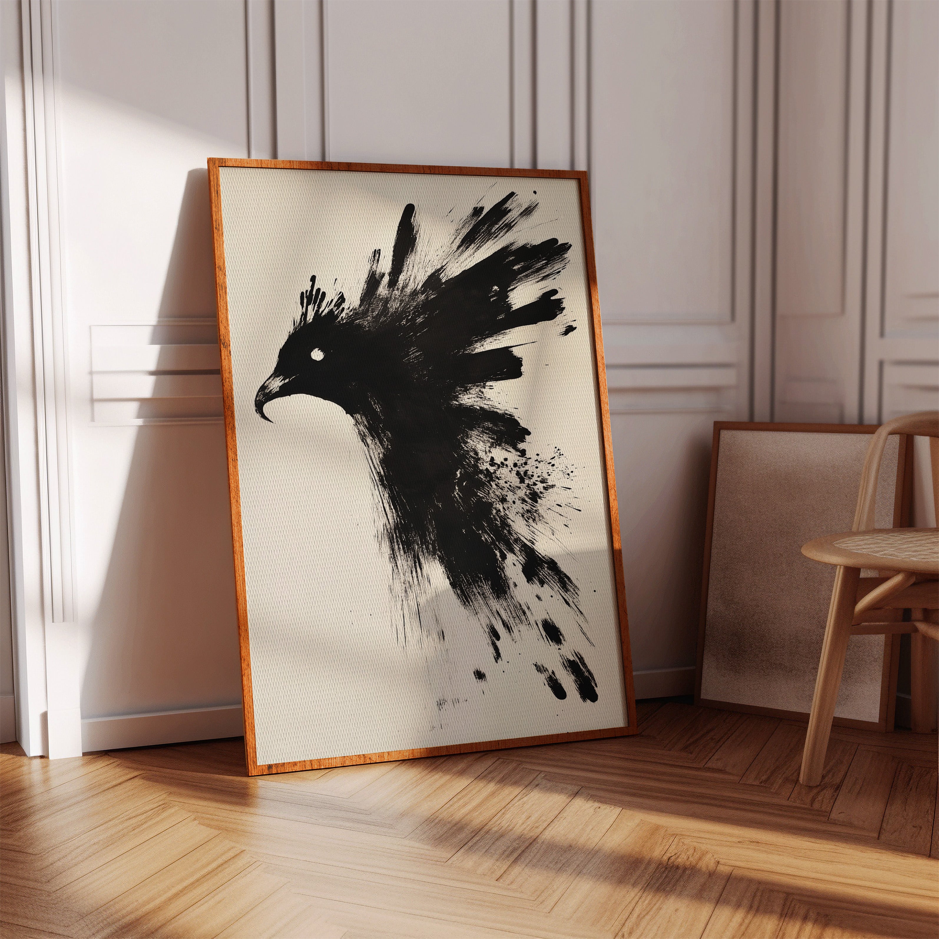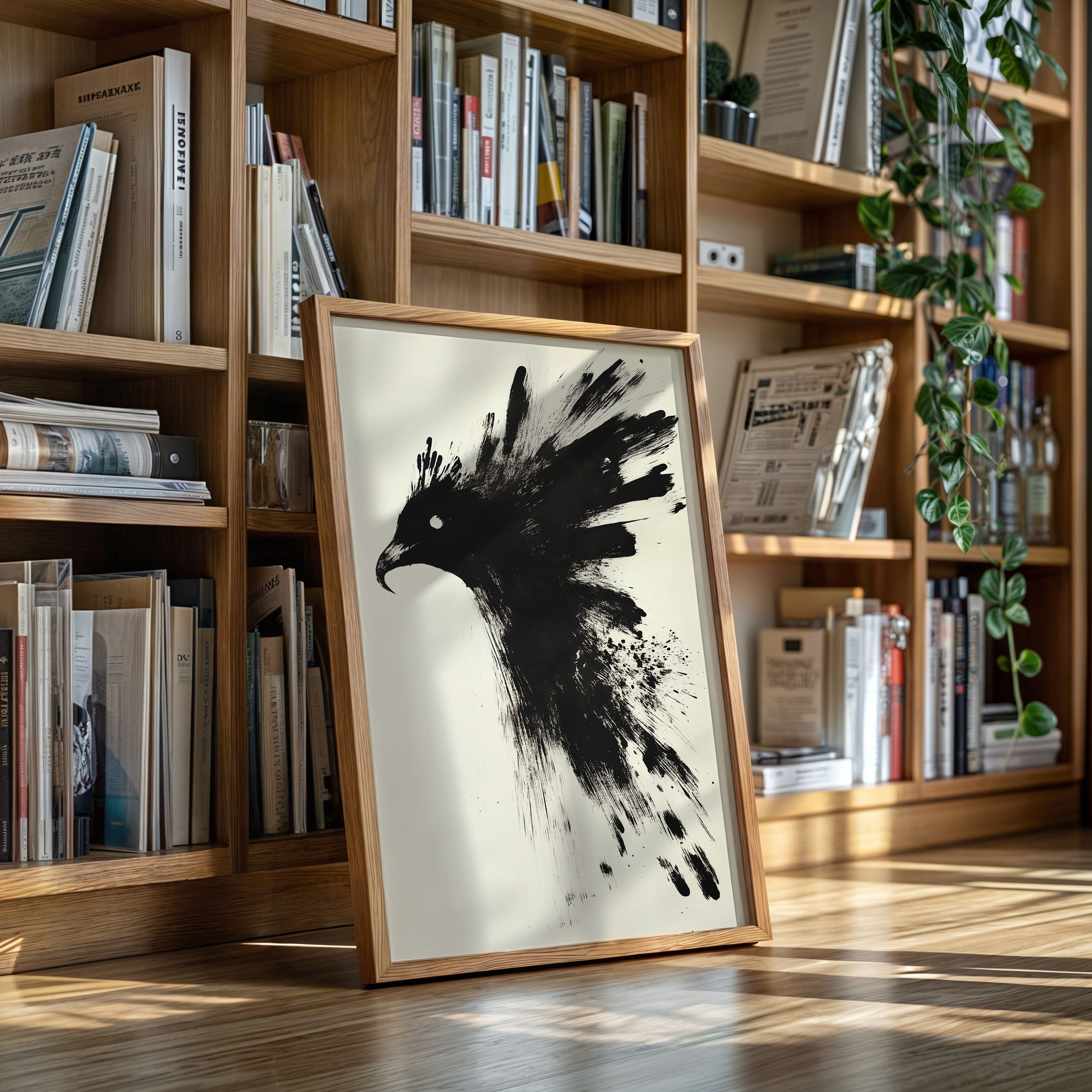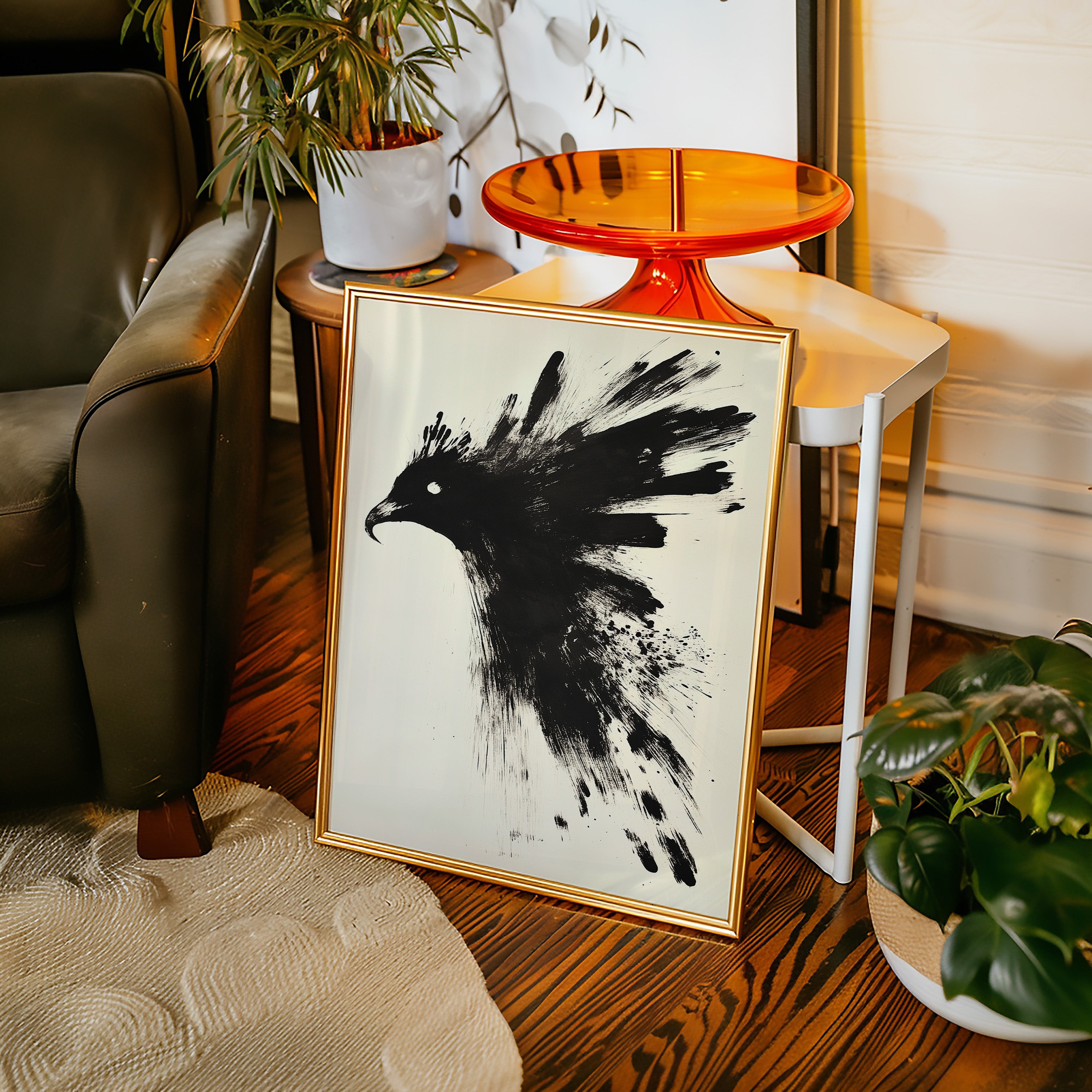 A dramatic splash of black ink captures the fierce spirit of a bird in motion, its form both powerful and ethereal. Bold brushstrokes create an explosive energy, with feathers dissolving into abstract spatters that suggest both movement and mystery. The stark contrast between the deep black silhouette and cream background emphasizes the raw, primal nature of this avian portrait. This striking piece speaks to freedom, strength, and the untamed wilderness that lives within all natural beings. Perfect for modern spaces seeking a bold statement piece, this work commands attention while maintaining sophisticated minimalist appeal.