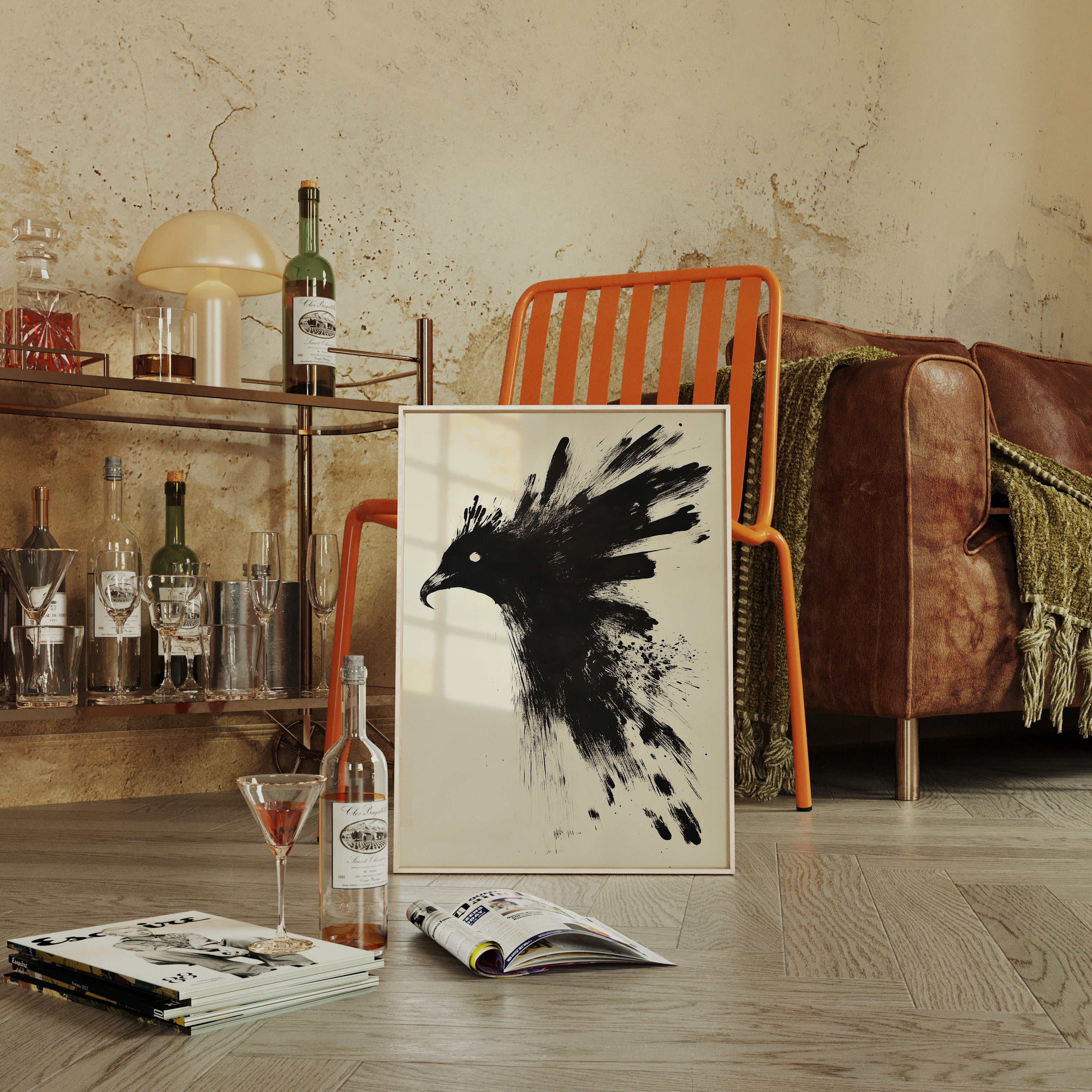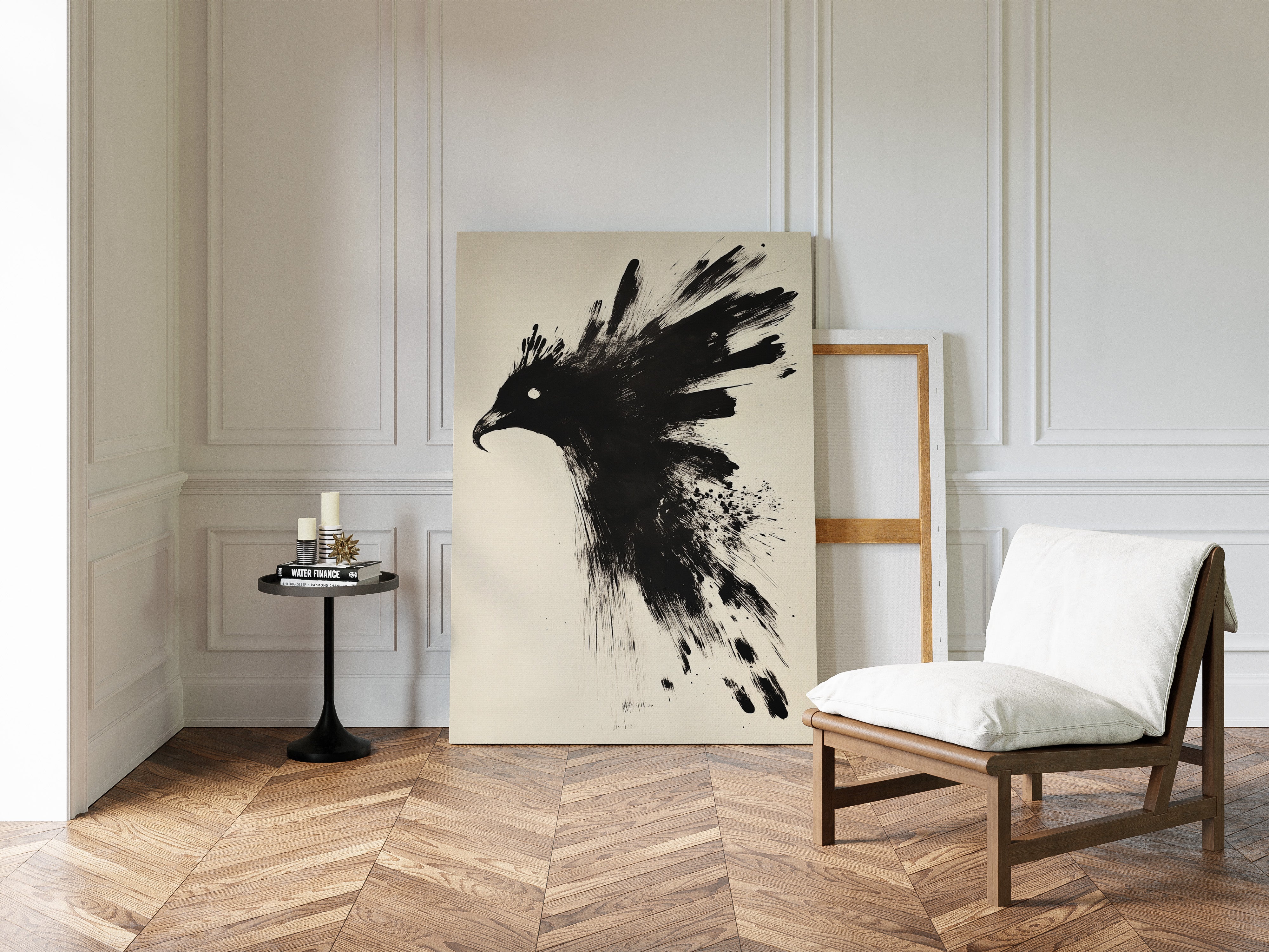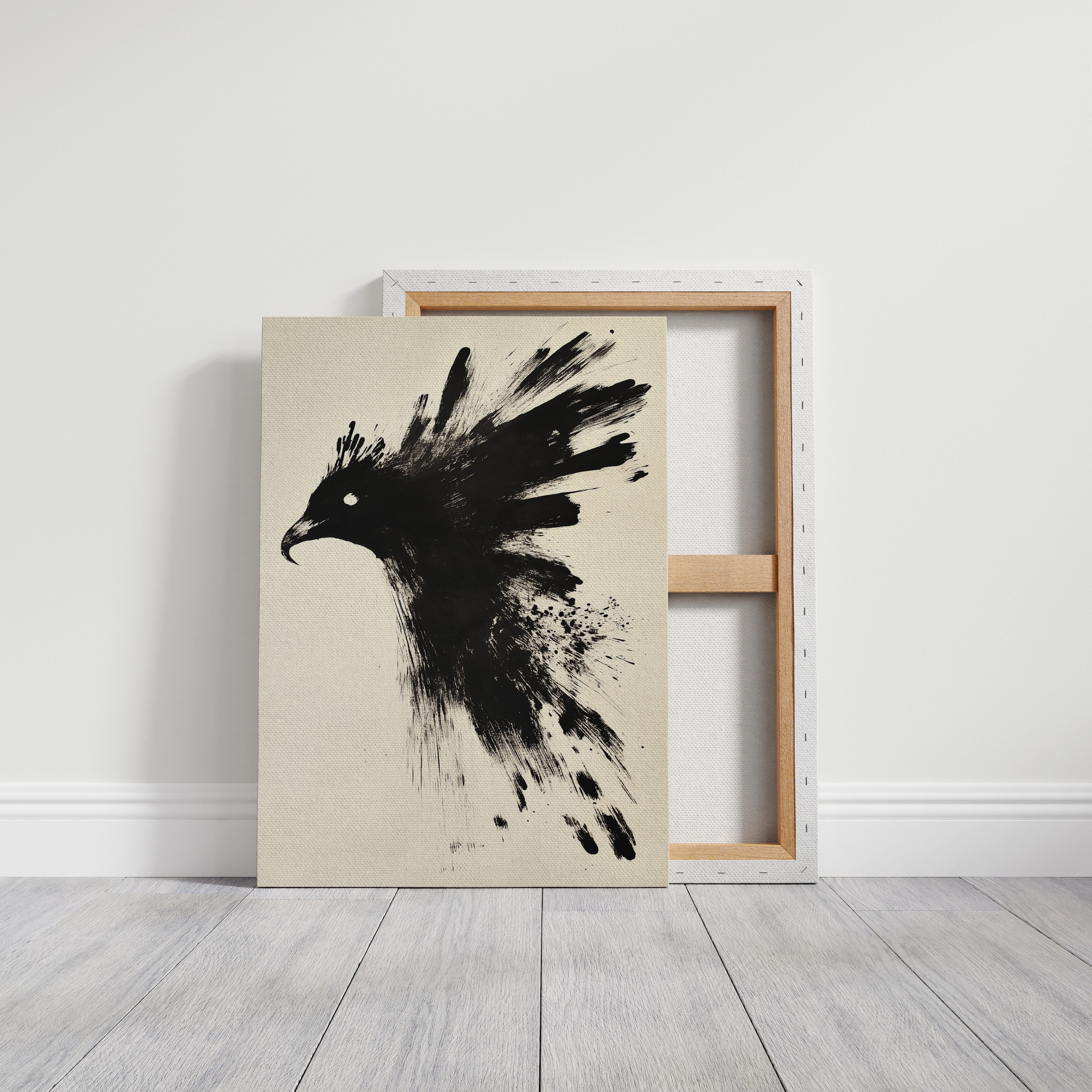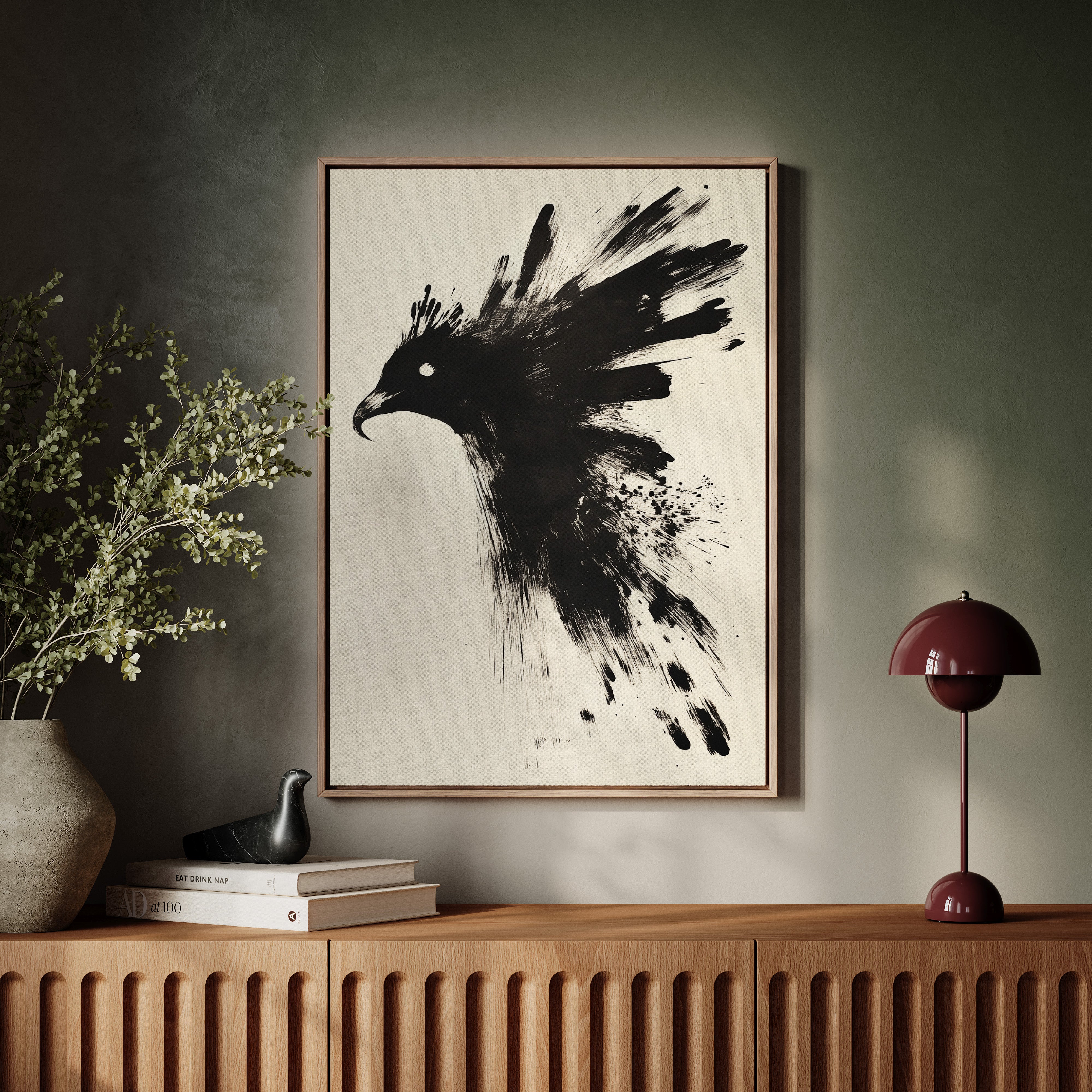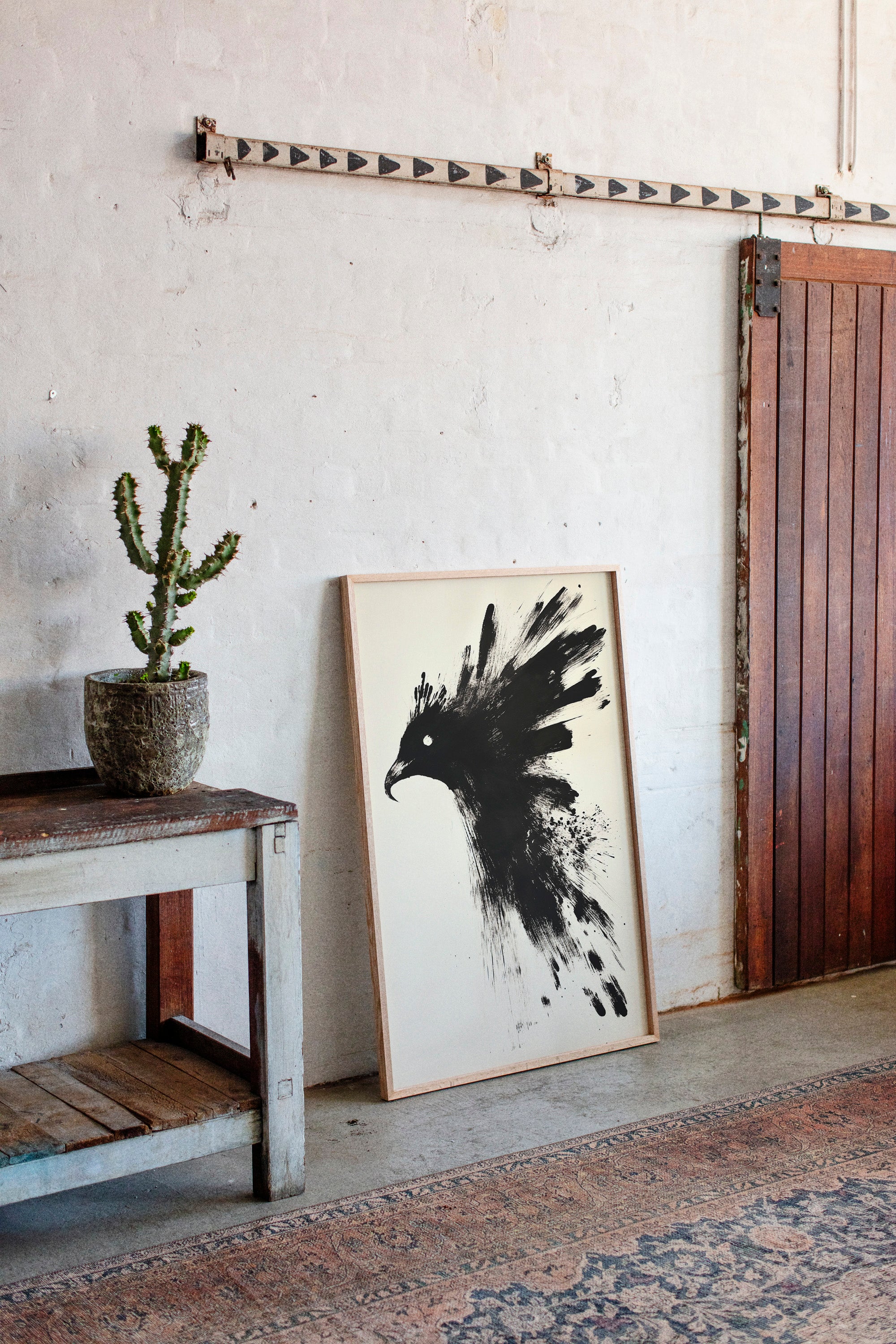 A dramatic splash of black ink captures the fierce spirit of a bird in motion, its form both powerful and ethereal. Bold brushstrokes create an explosive energy, with feathers dissolving into abstract spatters that suggest both movement and mystery. The stark contrast between the deep black silhouette and cream background emphasizes the raw, primal nature of this avian portrait. This striking piece speaks to freedom, strength, and the untamed wilderness that lives within all natural beings. Perfect for modern spaces seeking a bold statement piece, this work commands attention while maintaining sophisticated minimalist appeal.