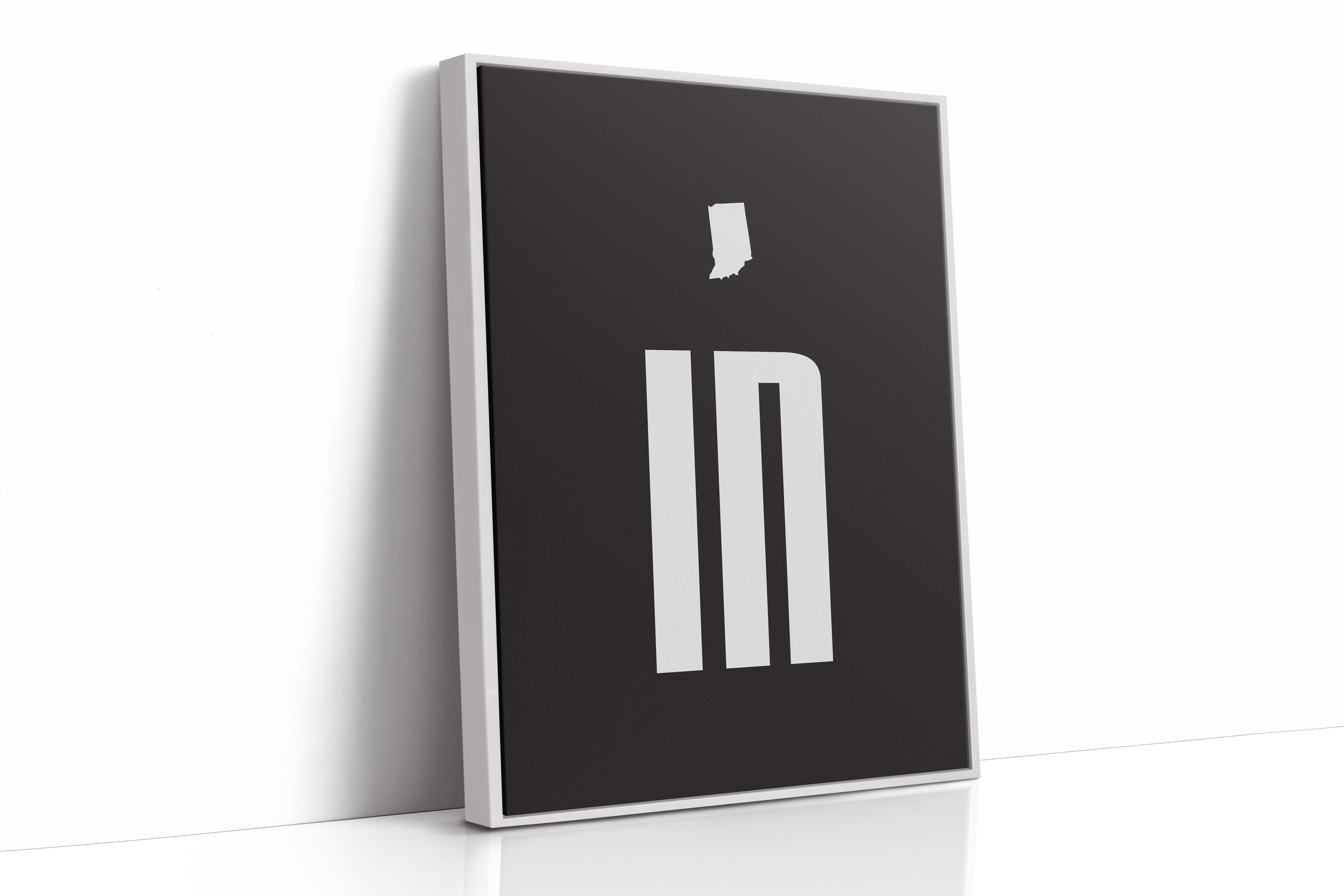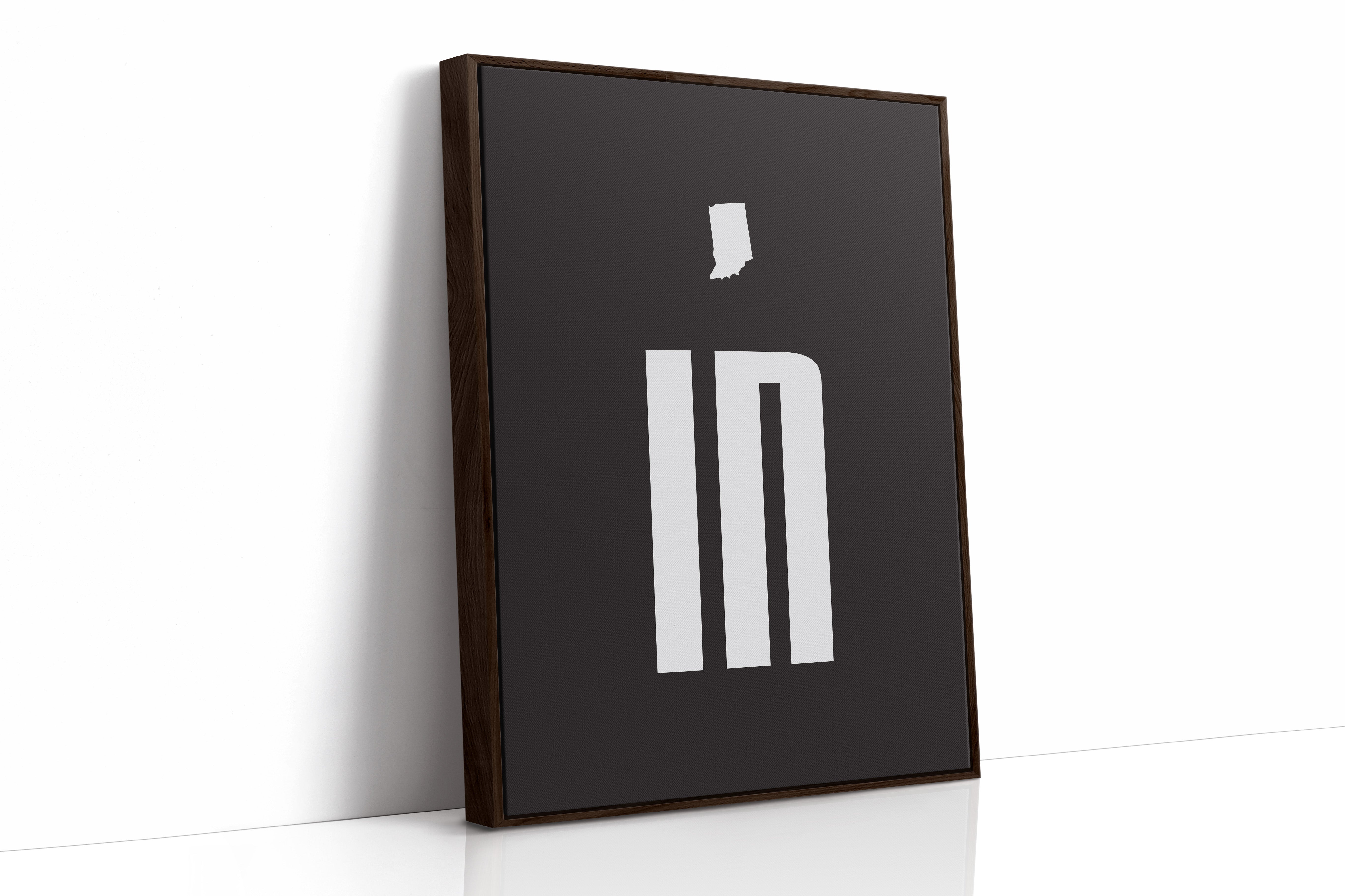 A stark silhouette emerges against the darkness, where Indiana's familiar shape hovers above bold typography. The minimalist design speaks in clean lines and decisive geometric forms, creating a powerful visual statement. The contrast between pure white and deep black suggests both separation and connection, while the simplified ""IN"" typography grounds the composition with modern authority. This piece brings sophisticated geographical identity into contemporary spaces, perfect for an office, study, or any room seeking to make a bold architectural statement.