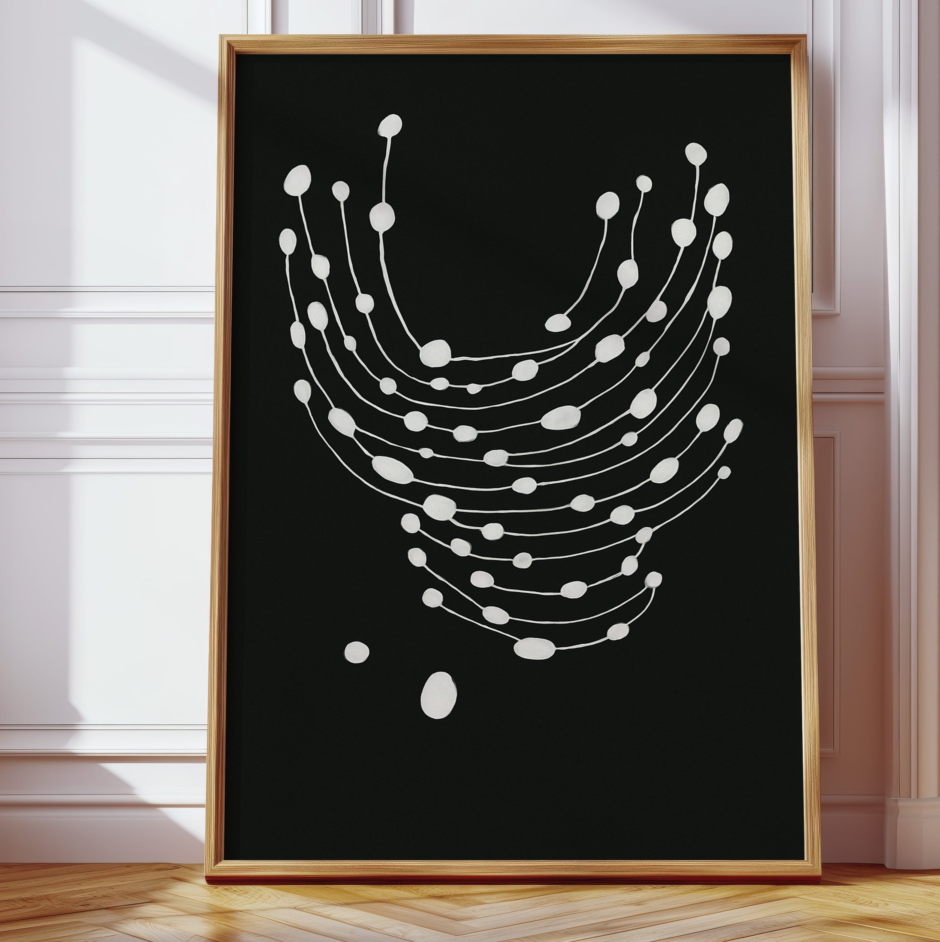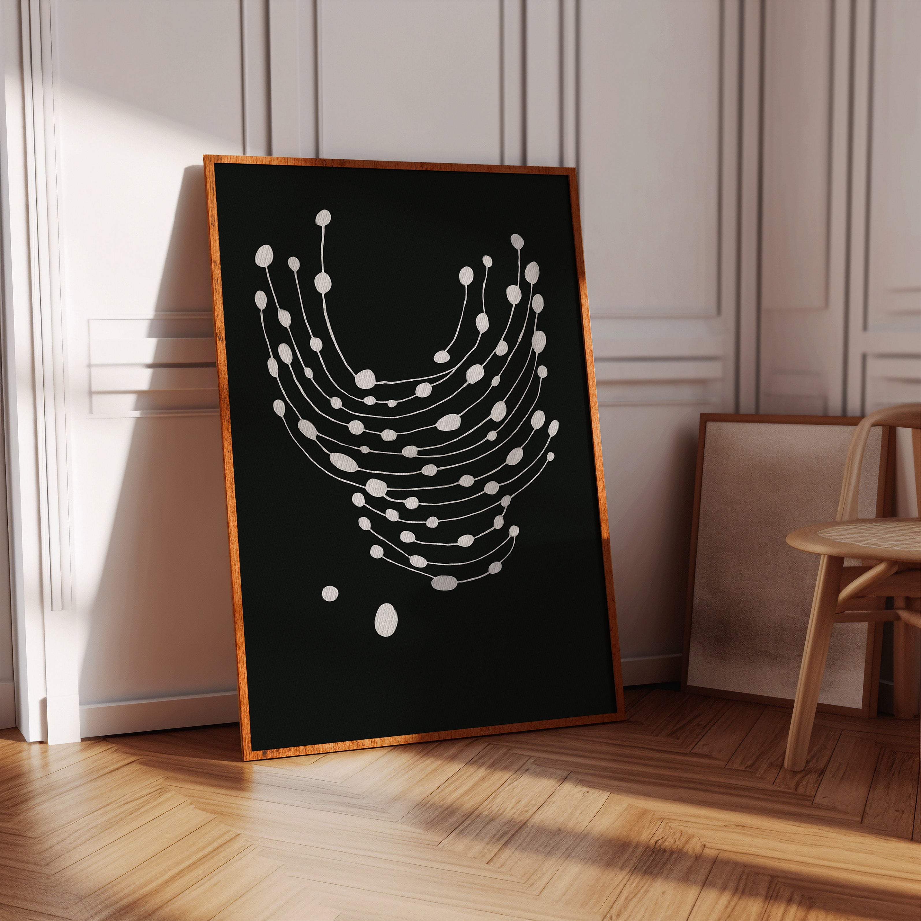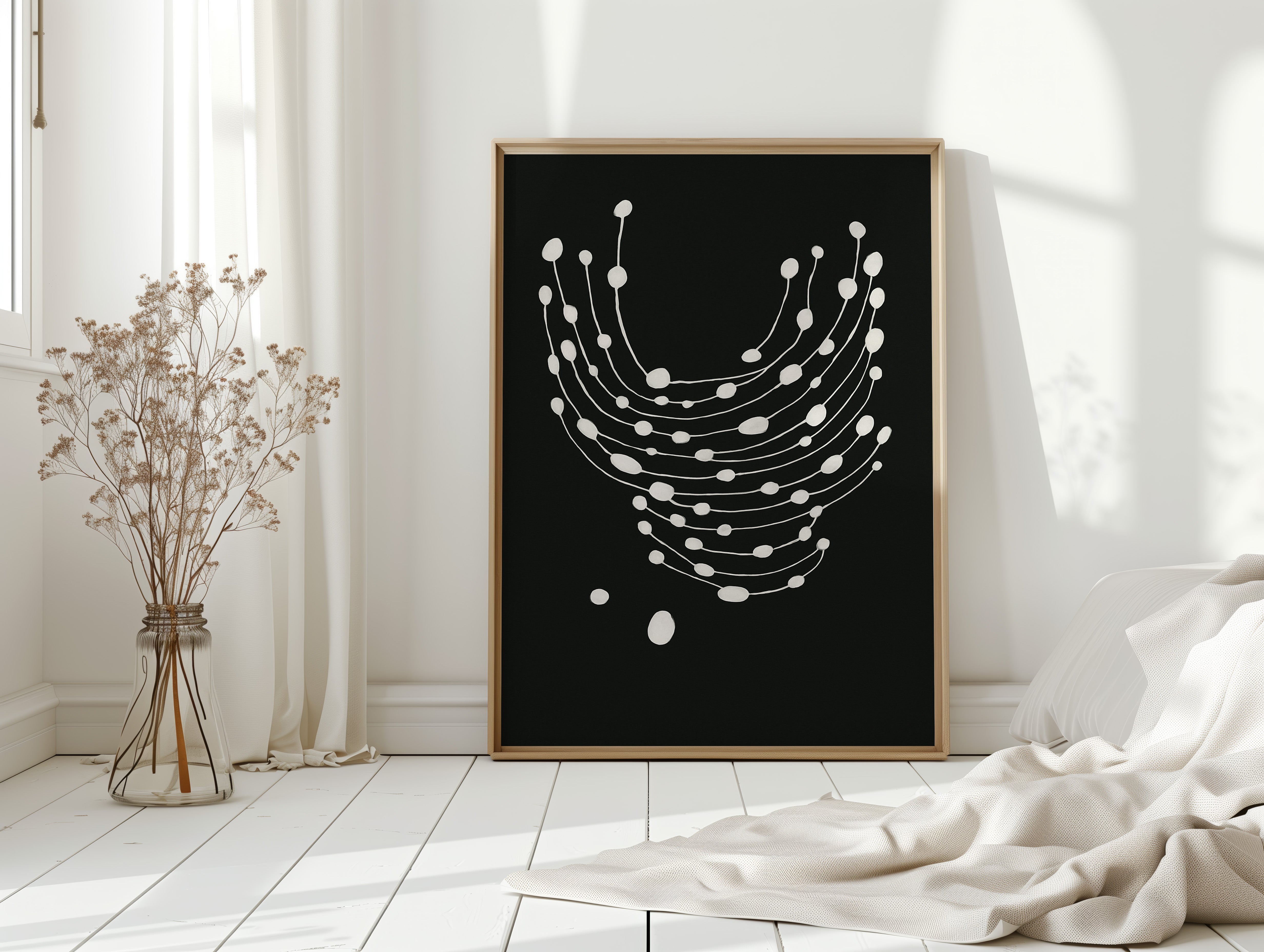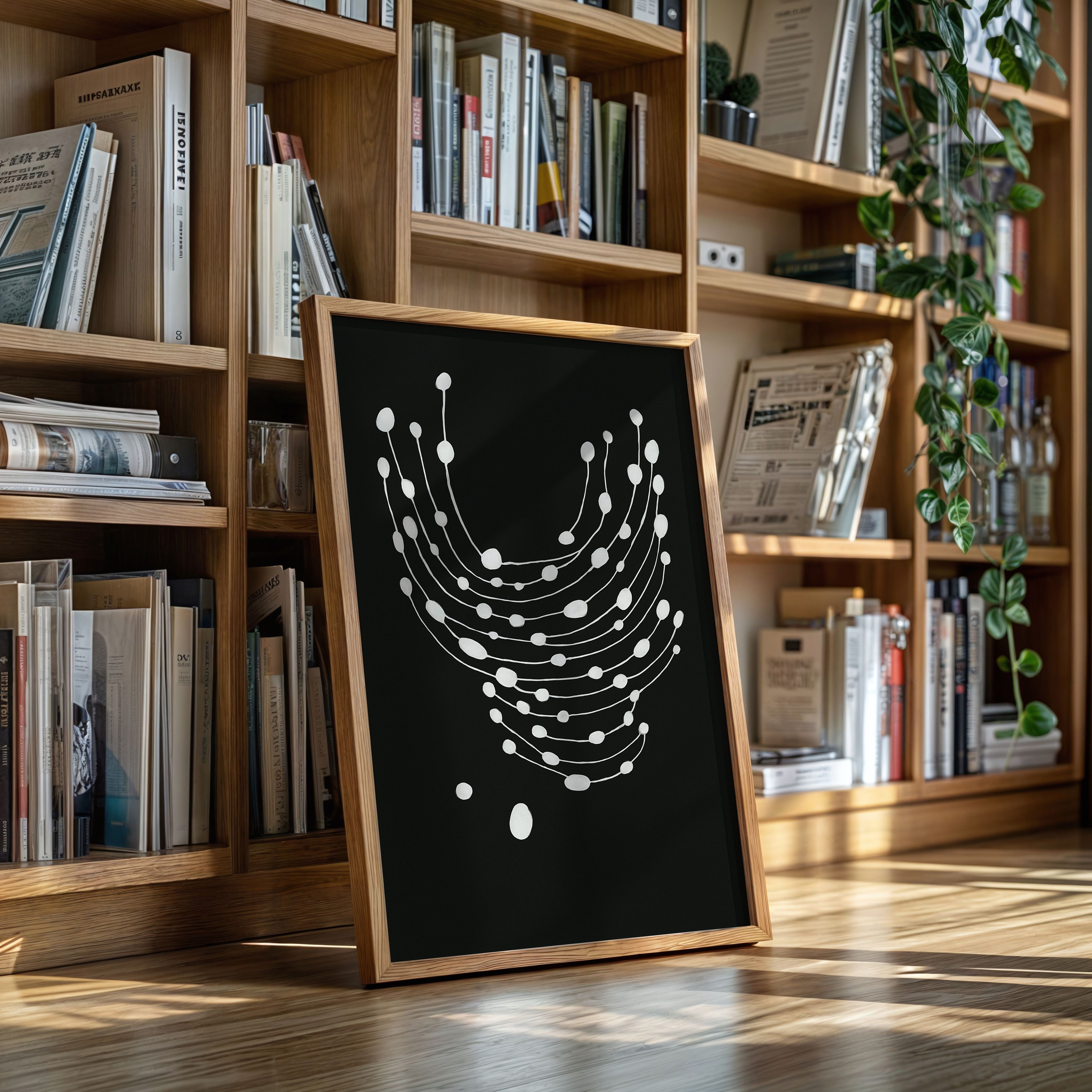 Elevate your space with this striking minimalist abstract art print featuring delicate white dots gracefully cascading across a bold black canvas.