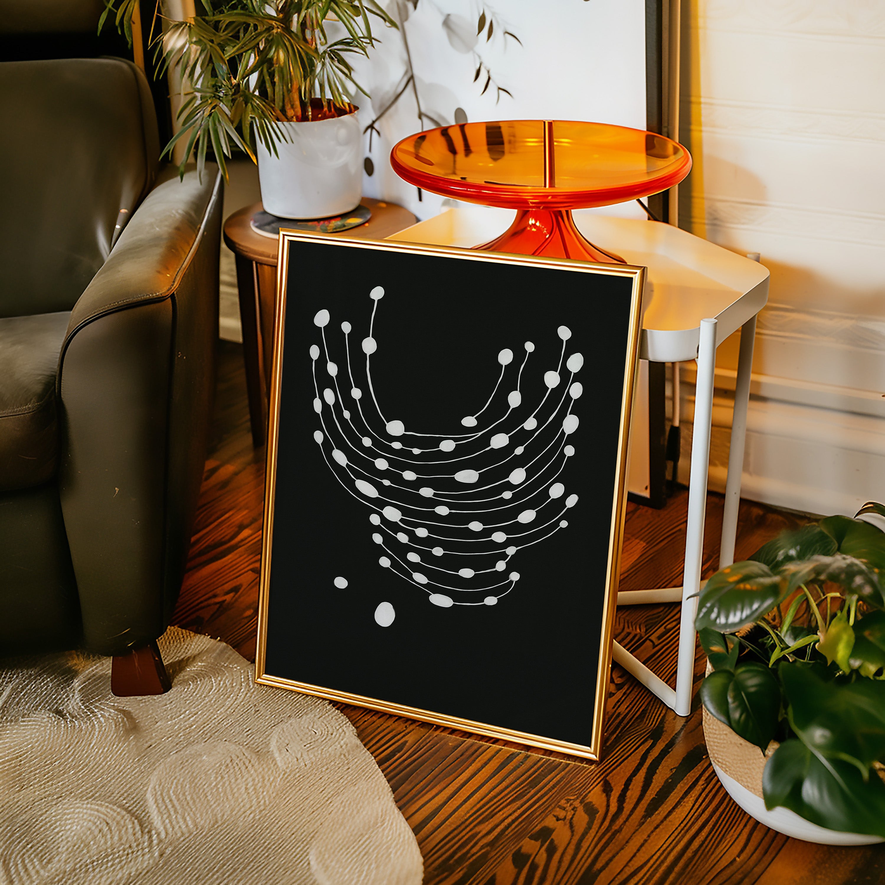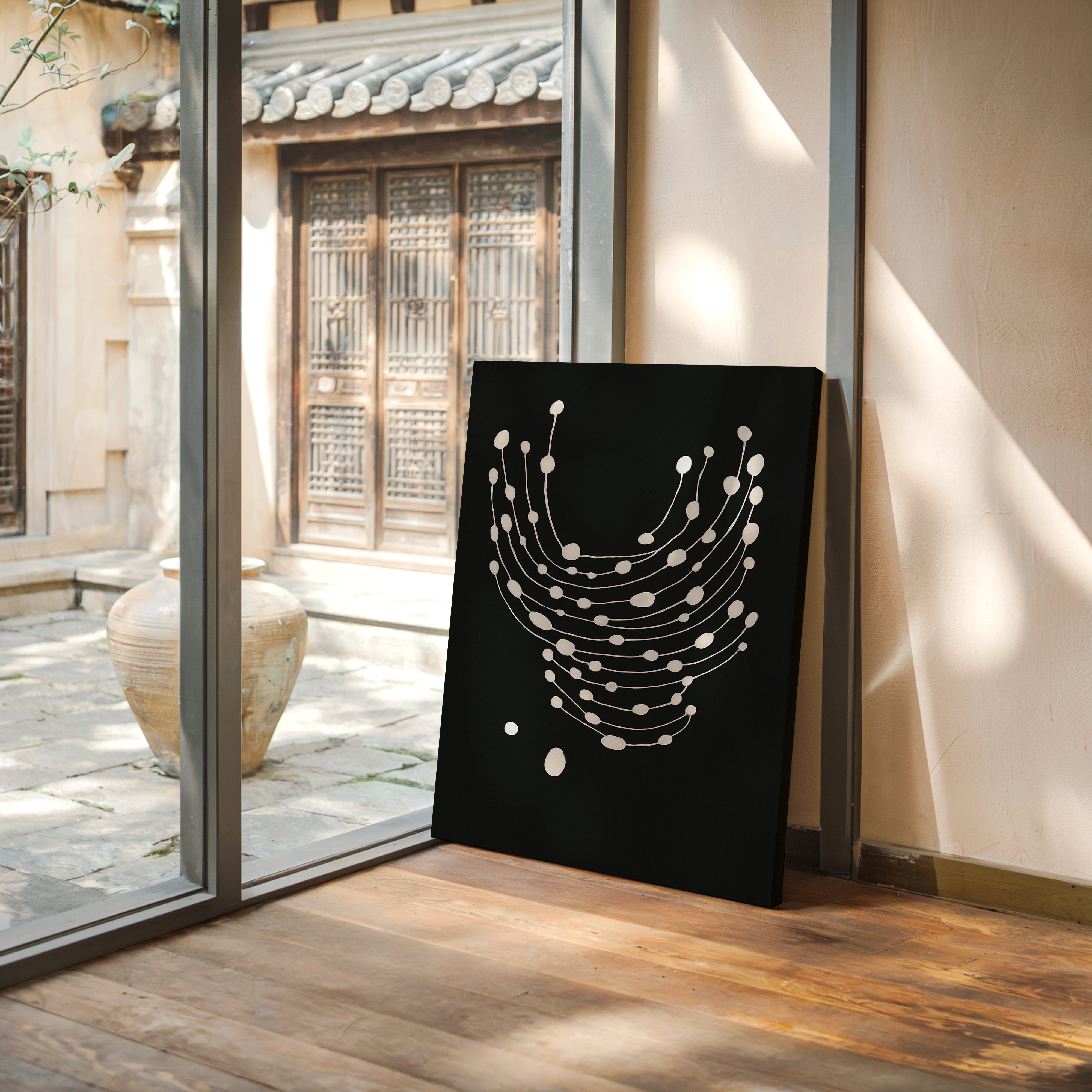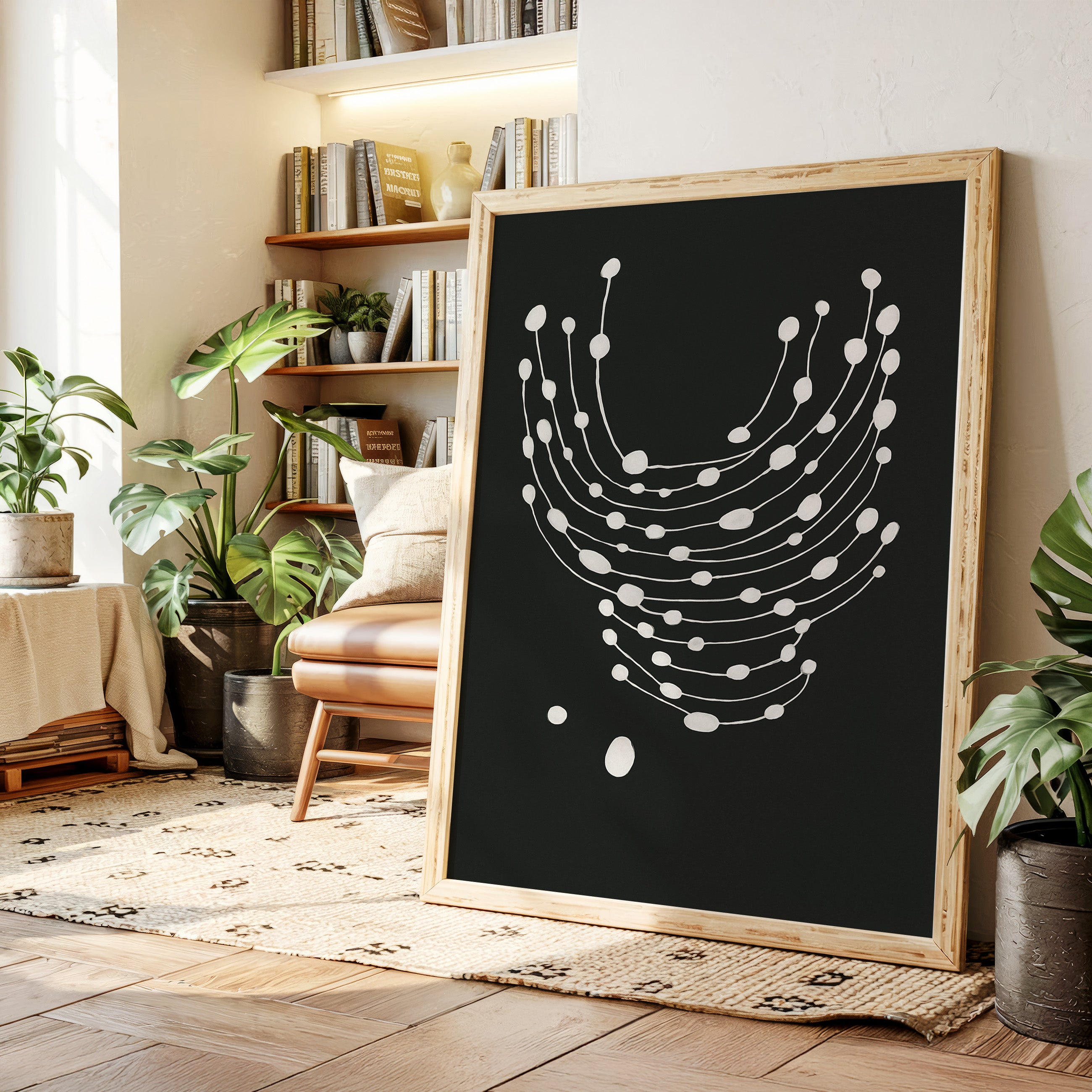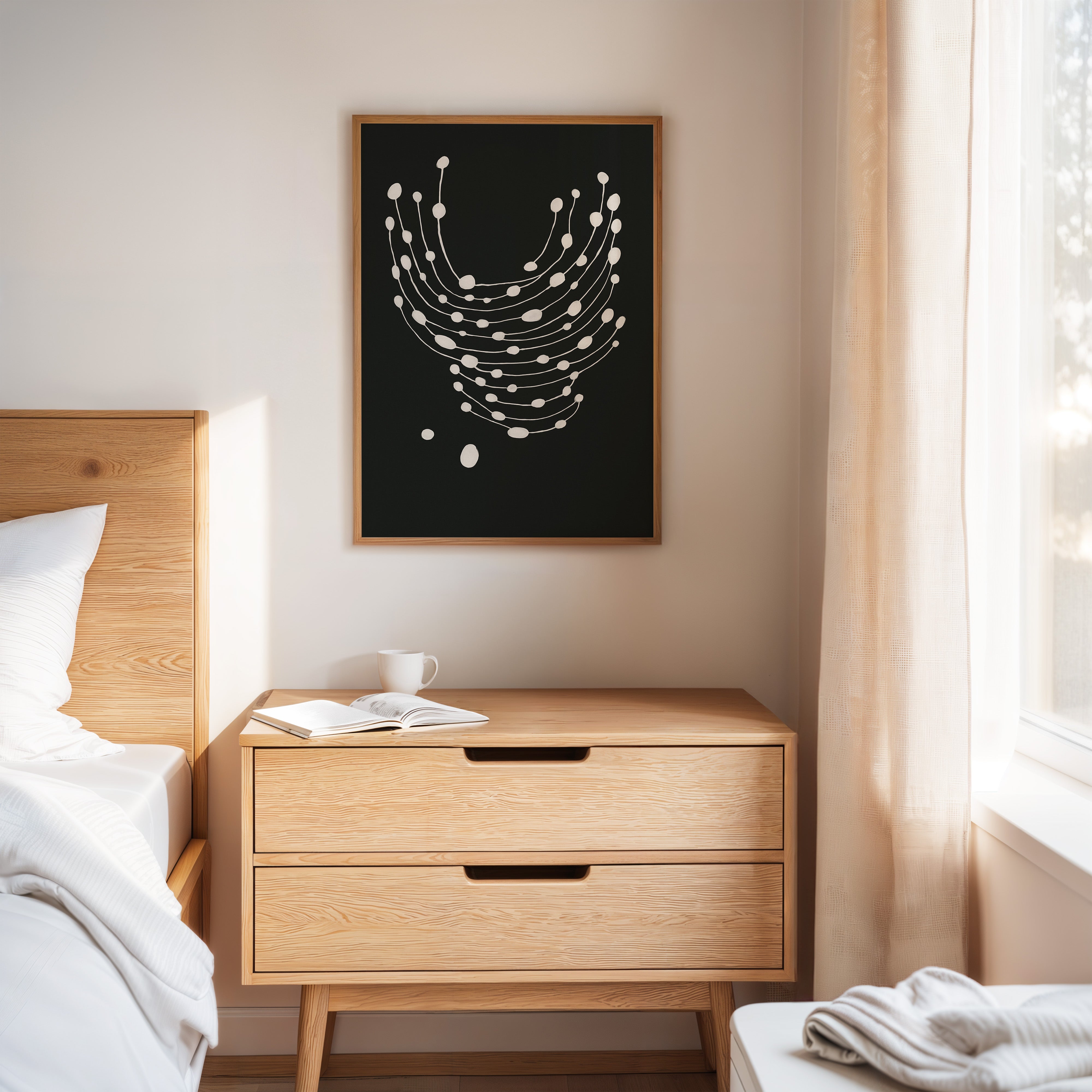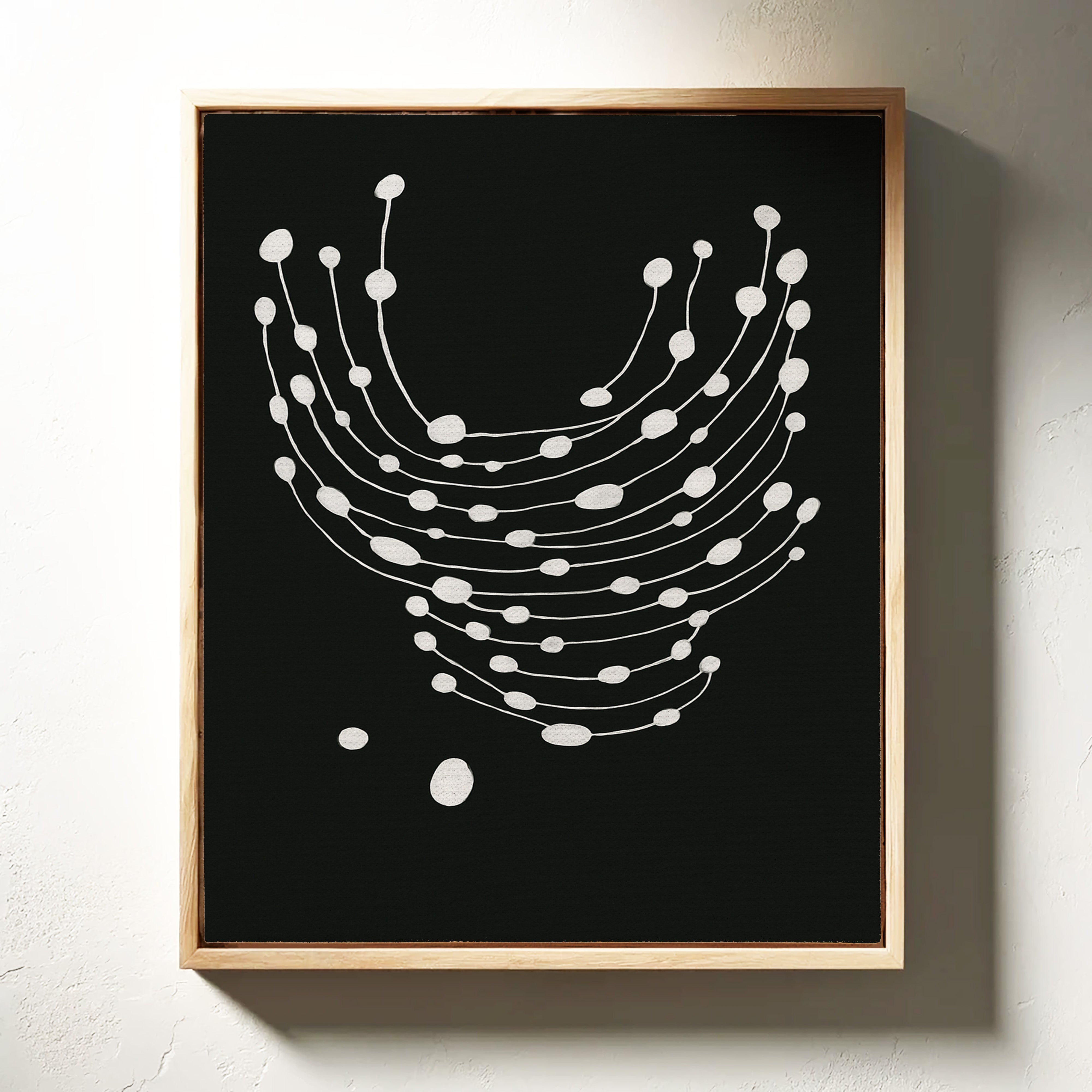 Elevate your space with this striking minimalist abstract art print featuring delicate white dots gracefully cascading across a bold black canvas.