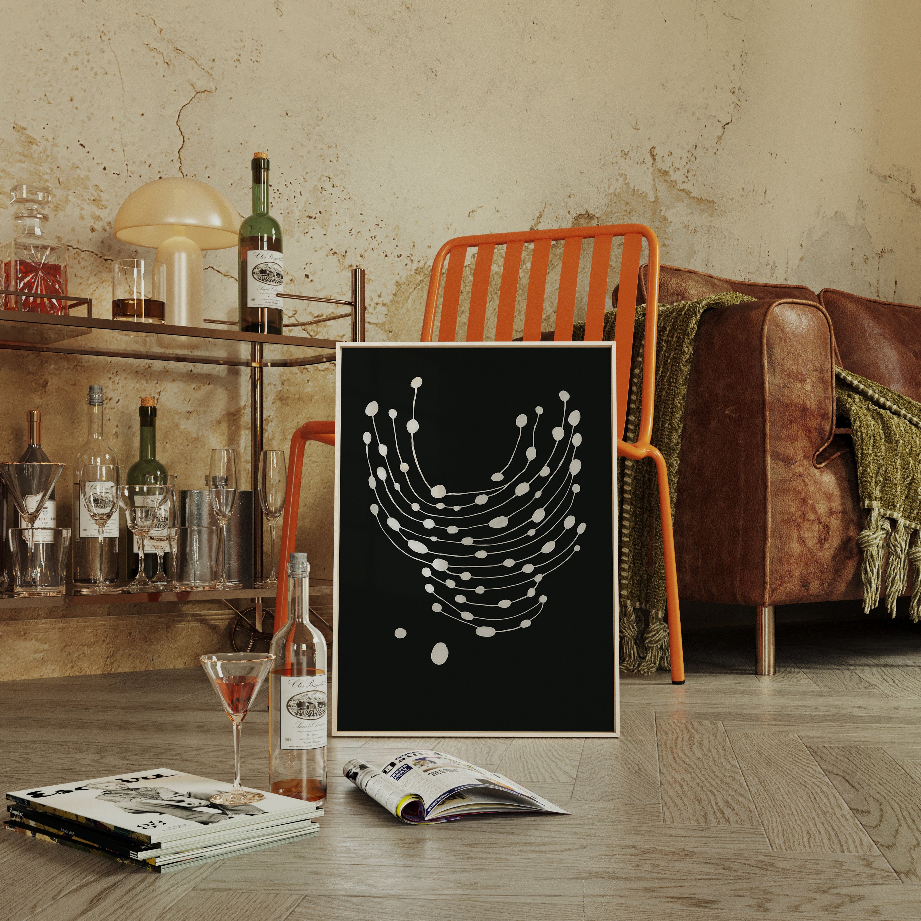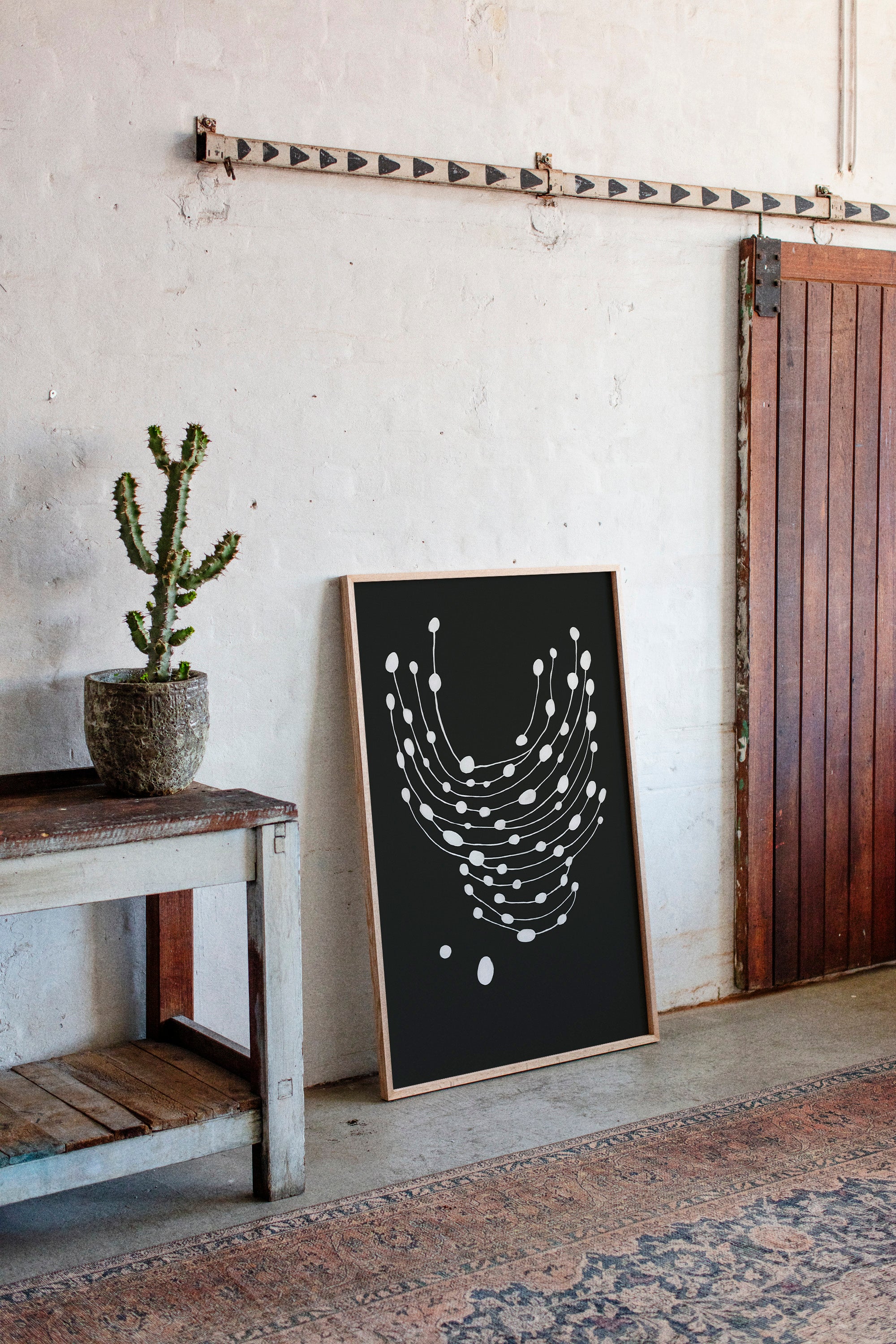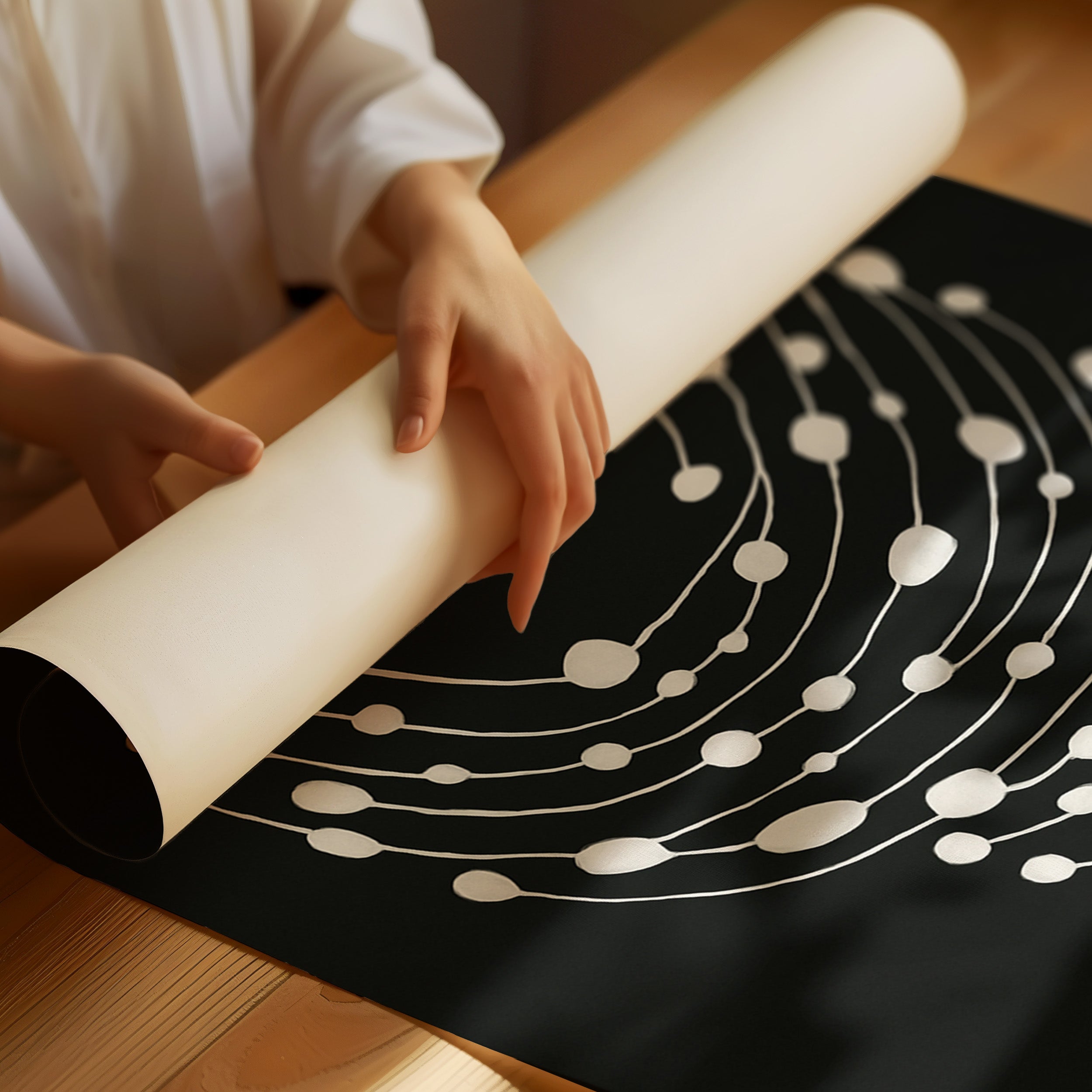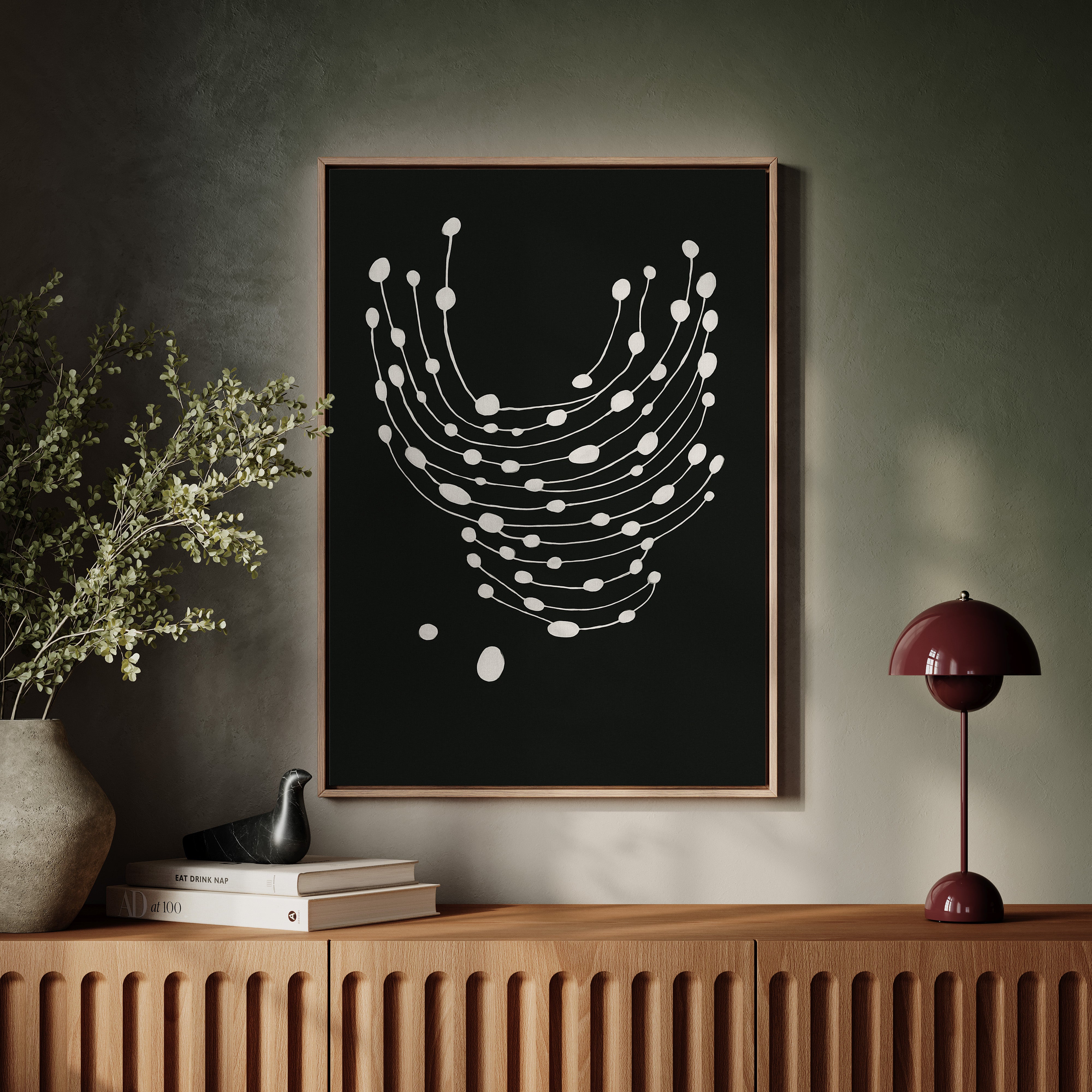 Elevate your space with this striking minimalist abstract art print featuring delicate white dots gracefully cascading across a bold black canvas.