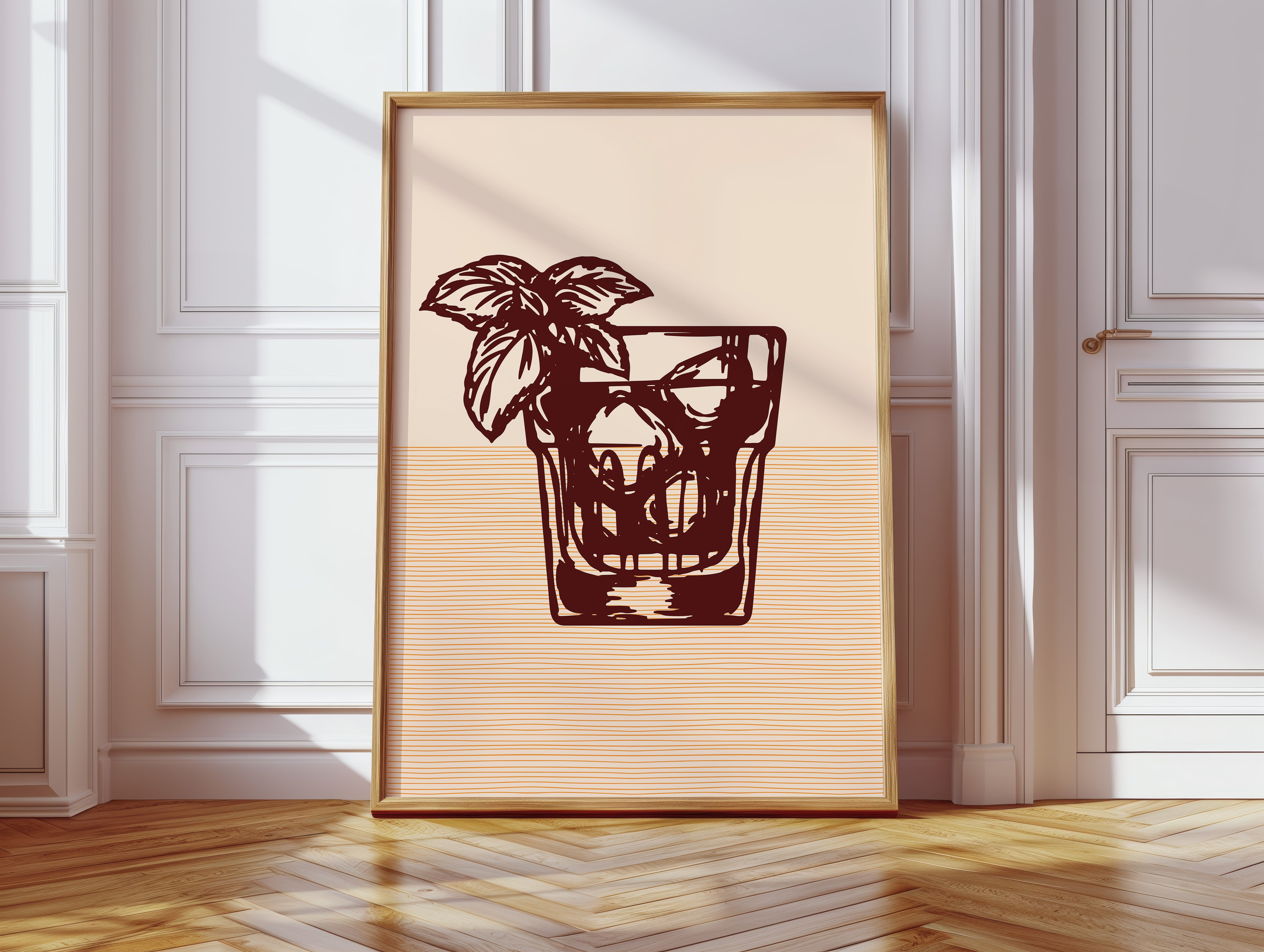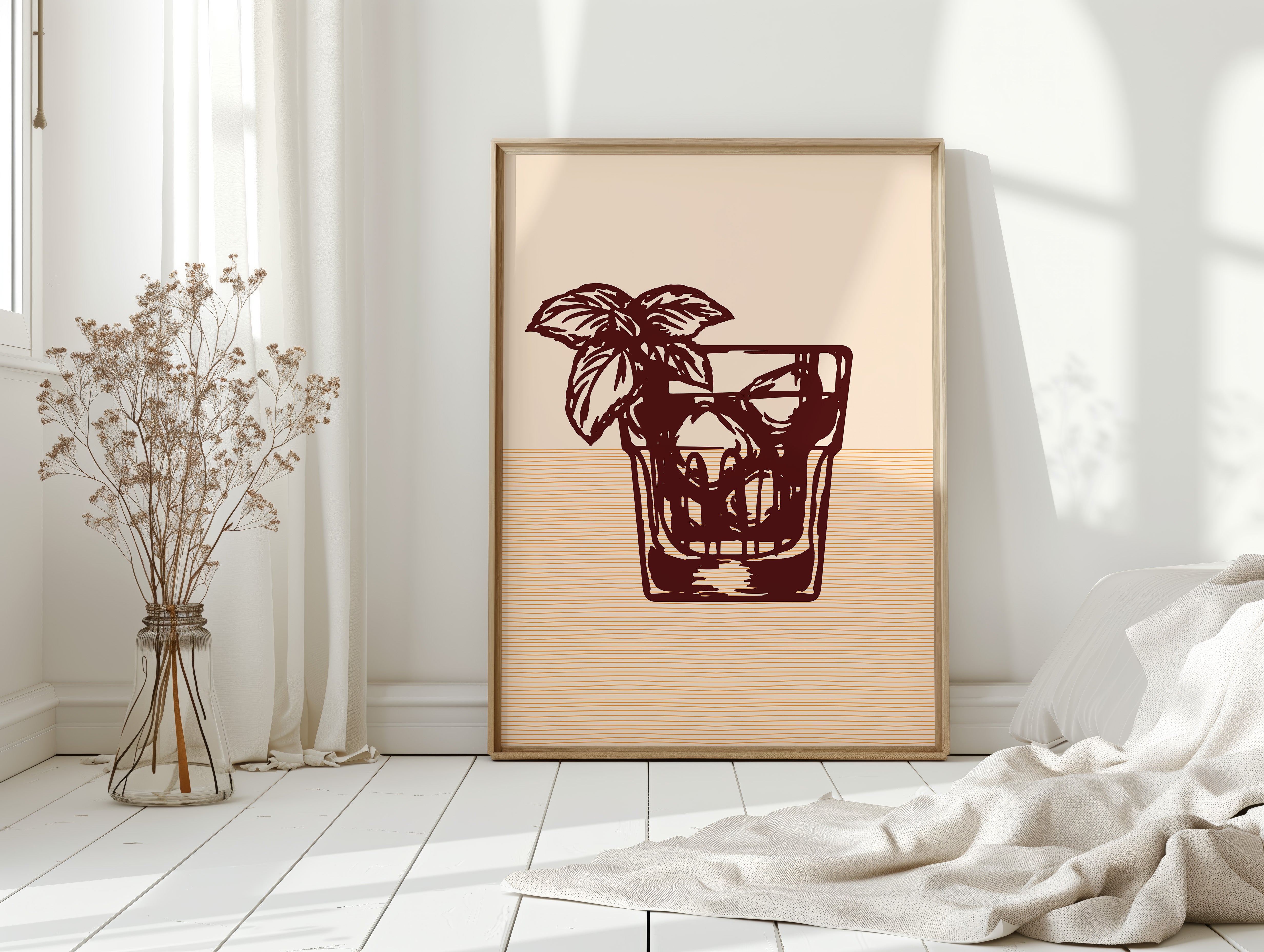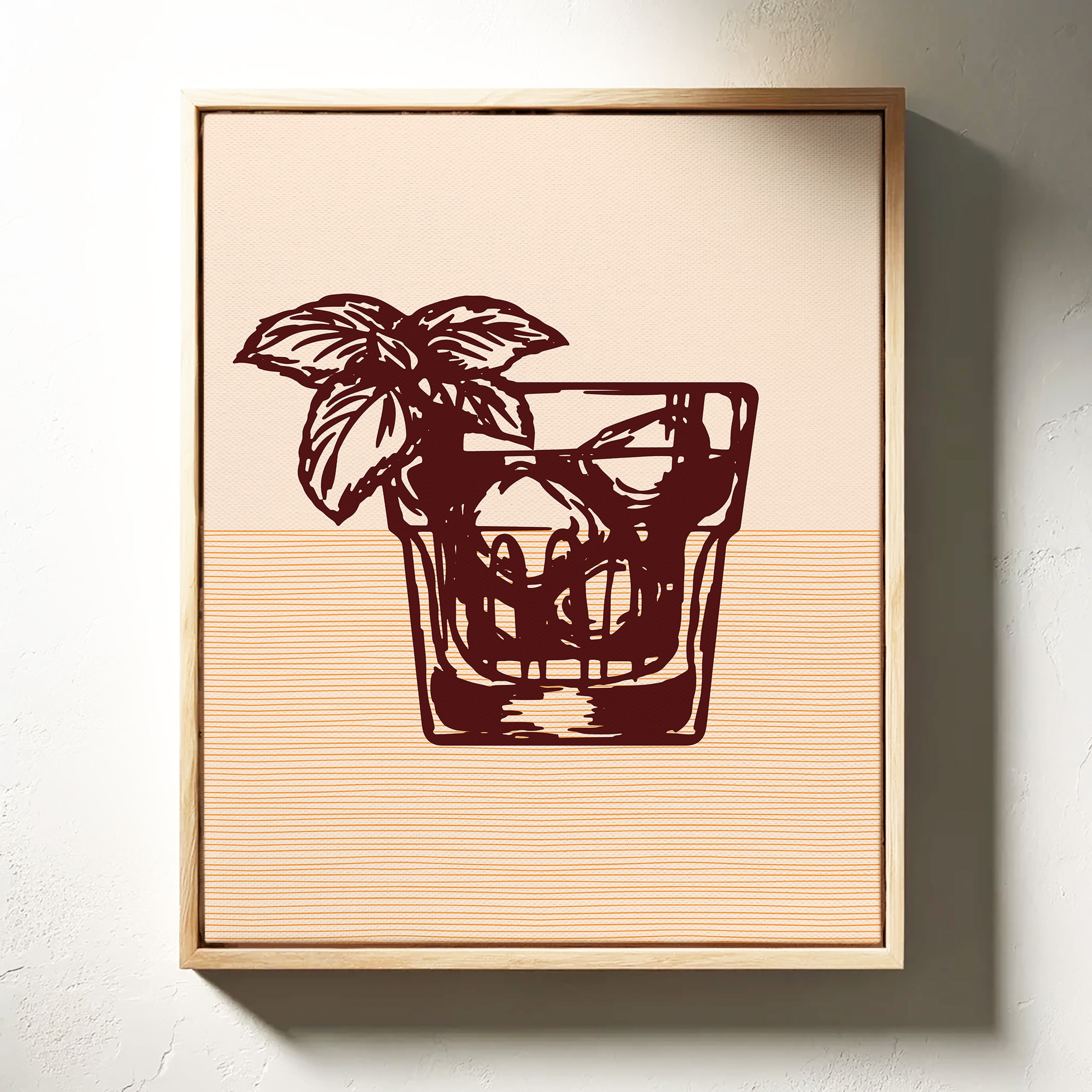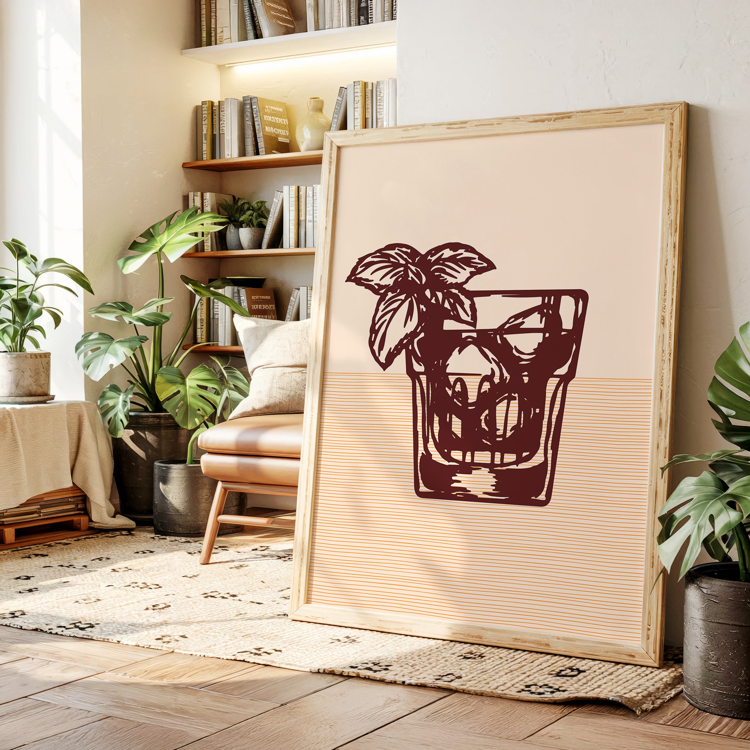A single glass holds stories of summer evenings, garnished with fresh possibility and warmth. This contemporary line illustration captures the essence of modern cocktail culture with minimalist charm. Deep burgundy silhouettes play against peachy sunset stripes, while delicate leaf details add organic movement to the geometric composition. The simplicity of the design speaks to moments of relaxation and sophistication, making it perfect for elevating the ambiance of a home bar, kitchen, or dining space. Each viewing invites a new appreciation for life's simple pleasures.