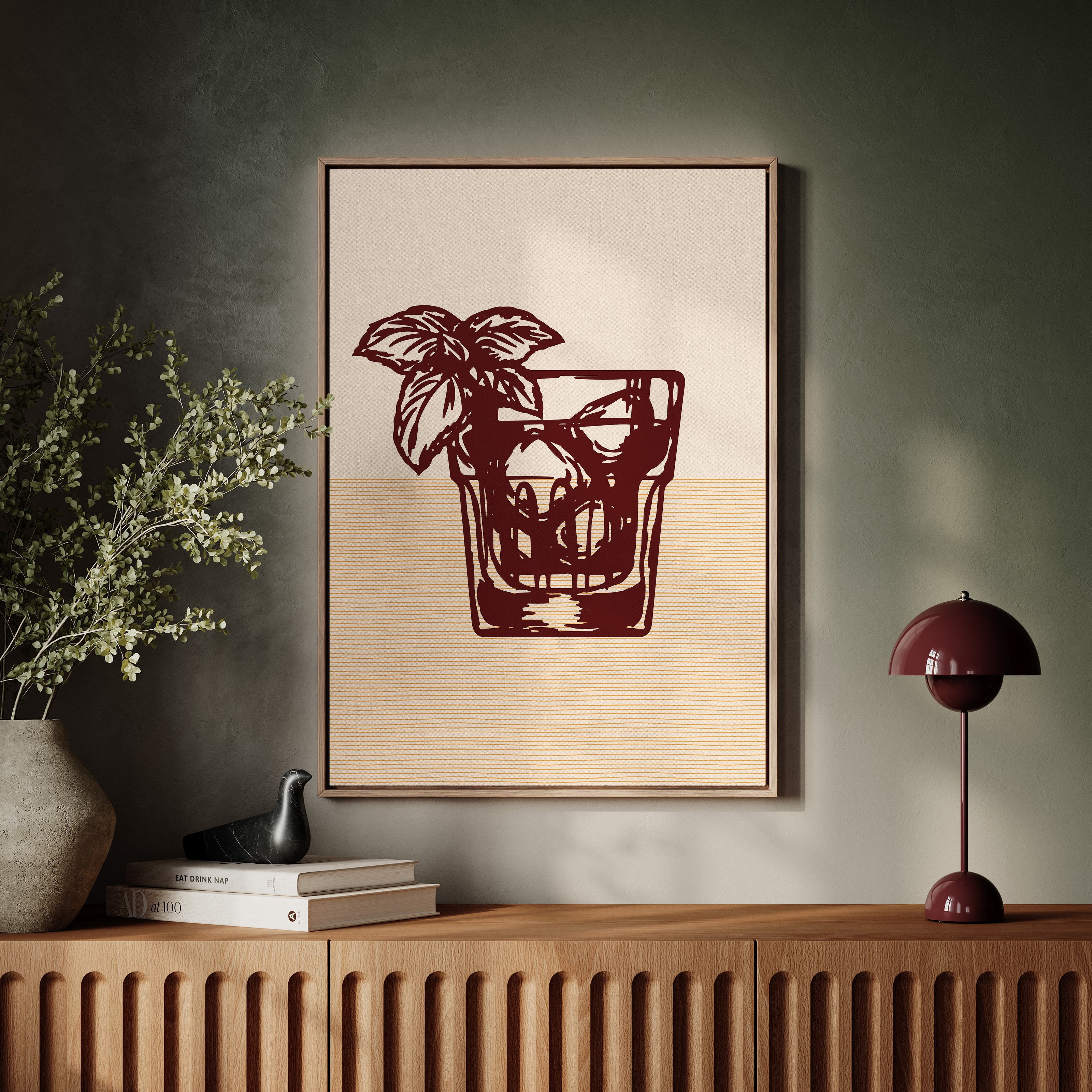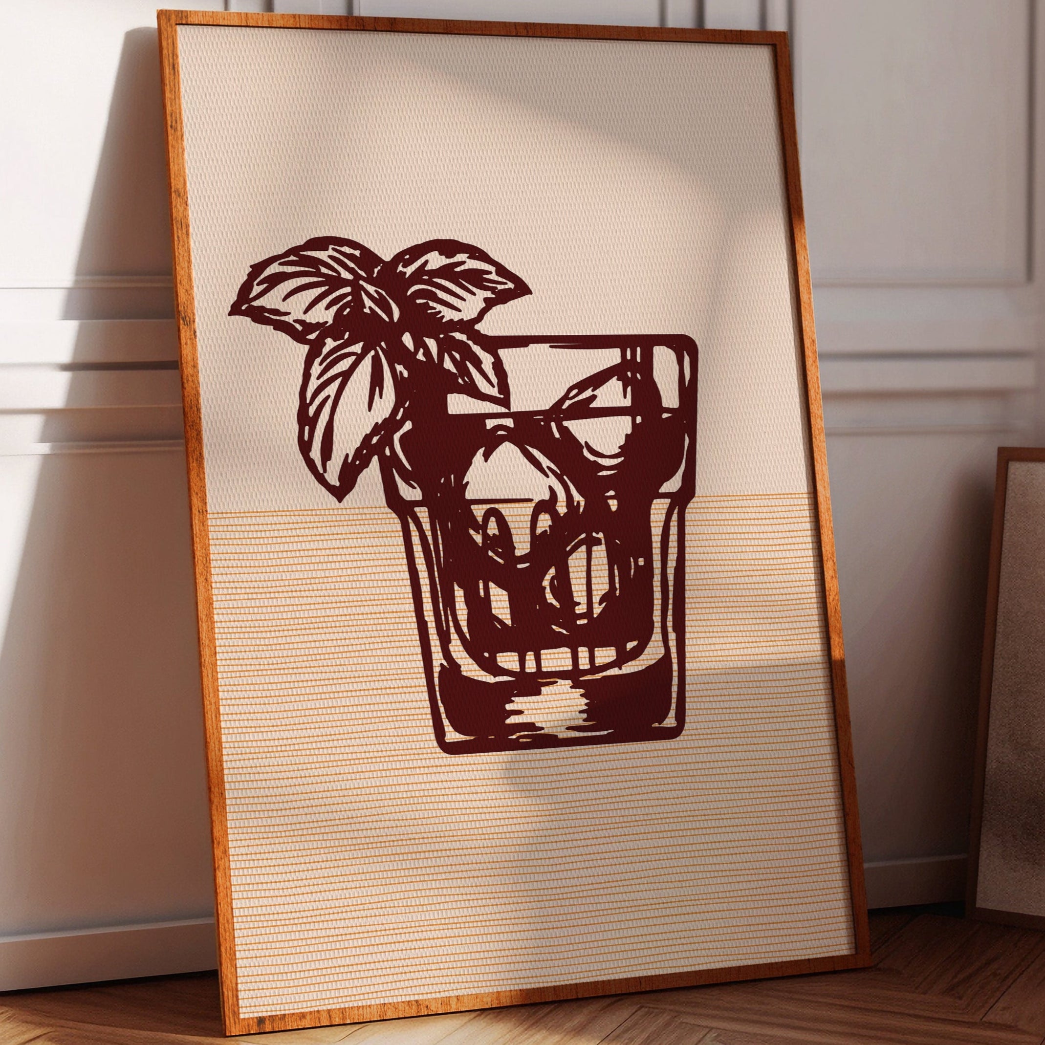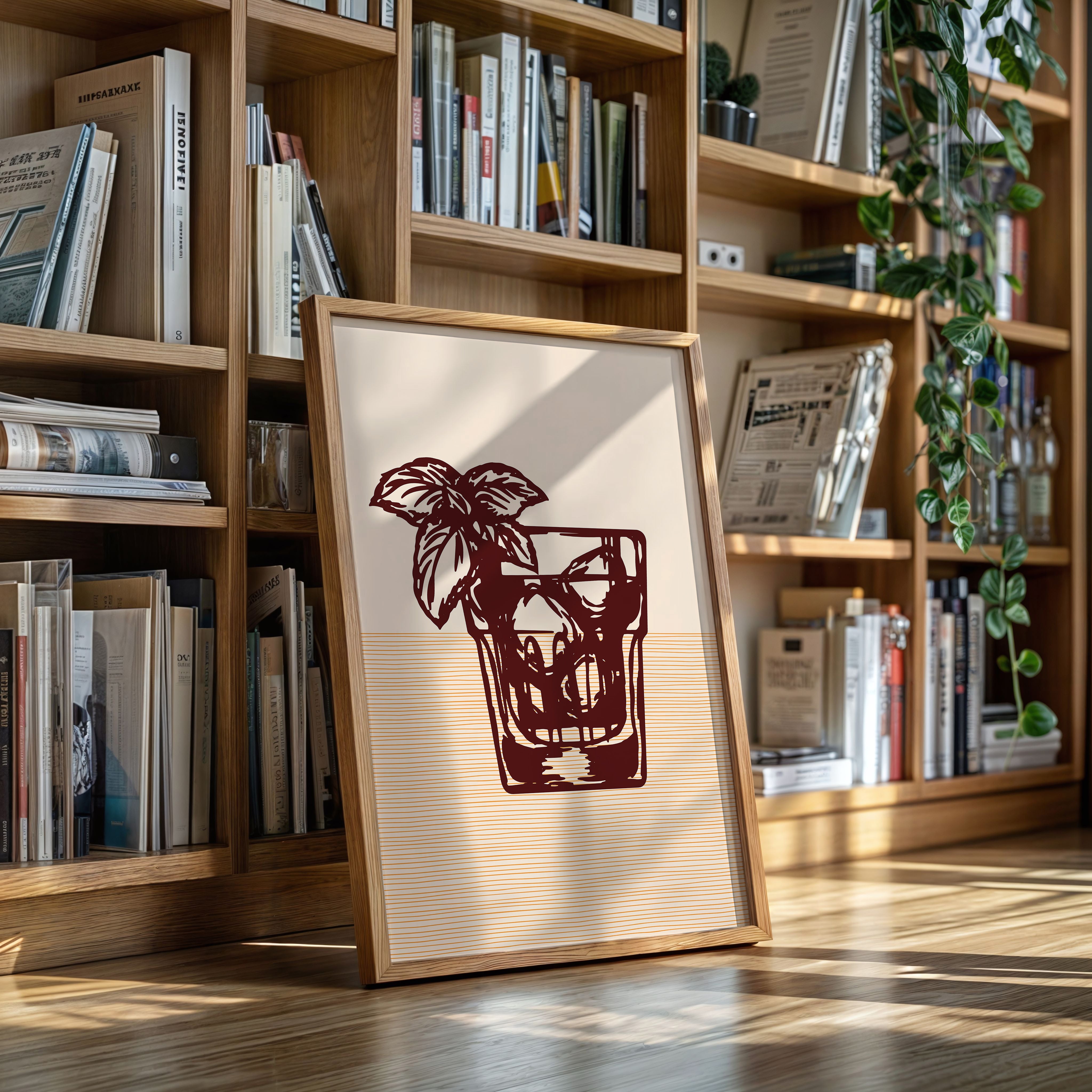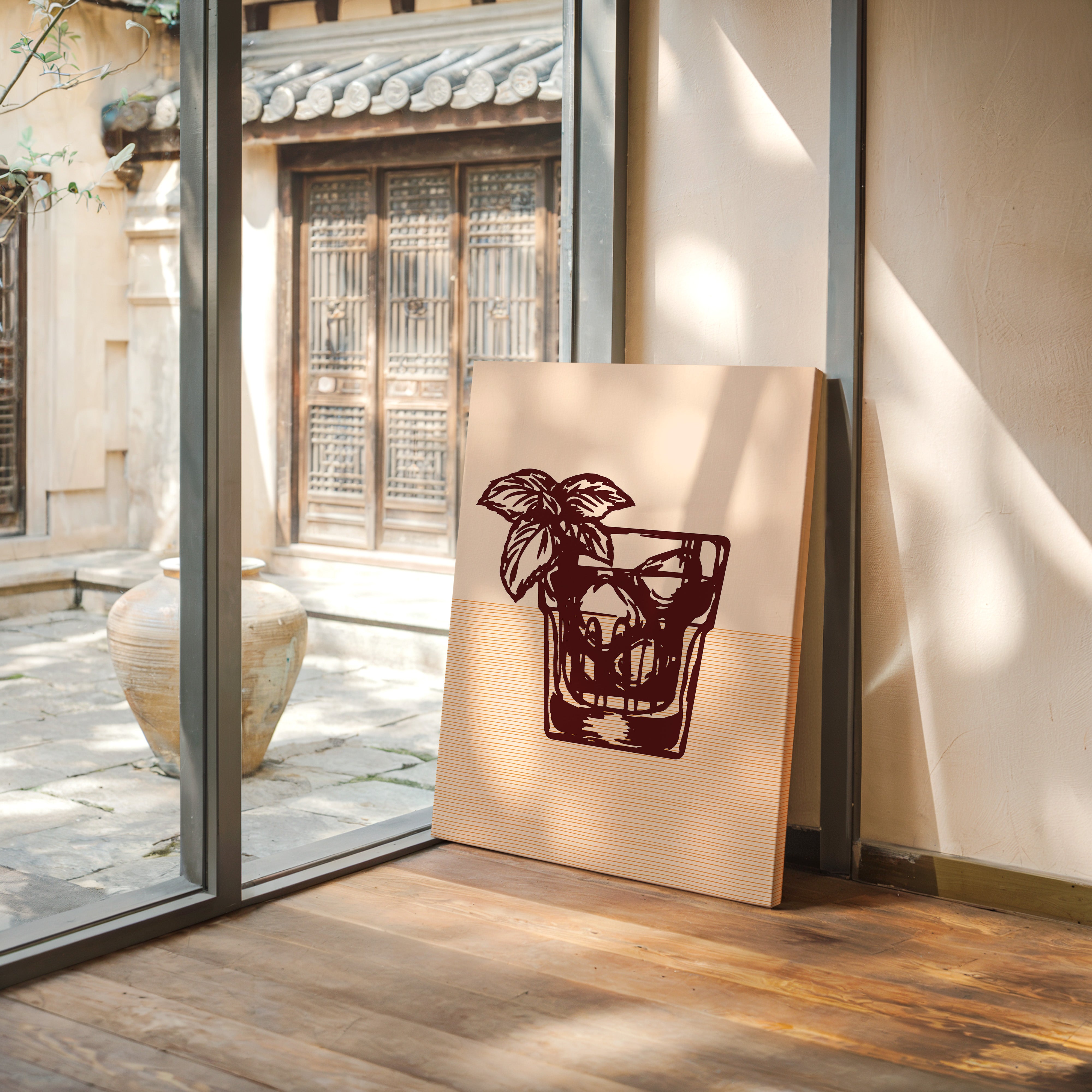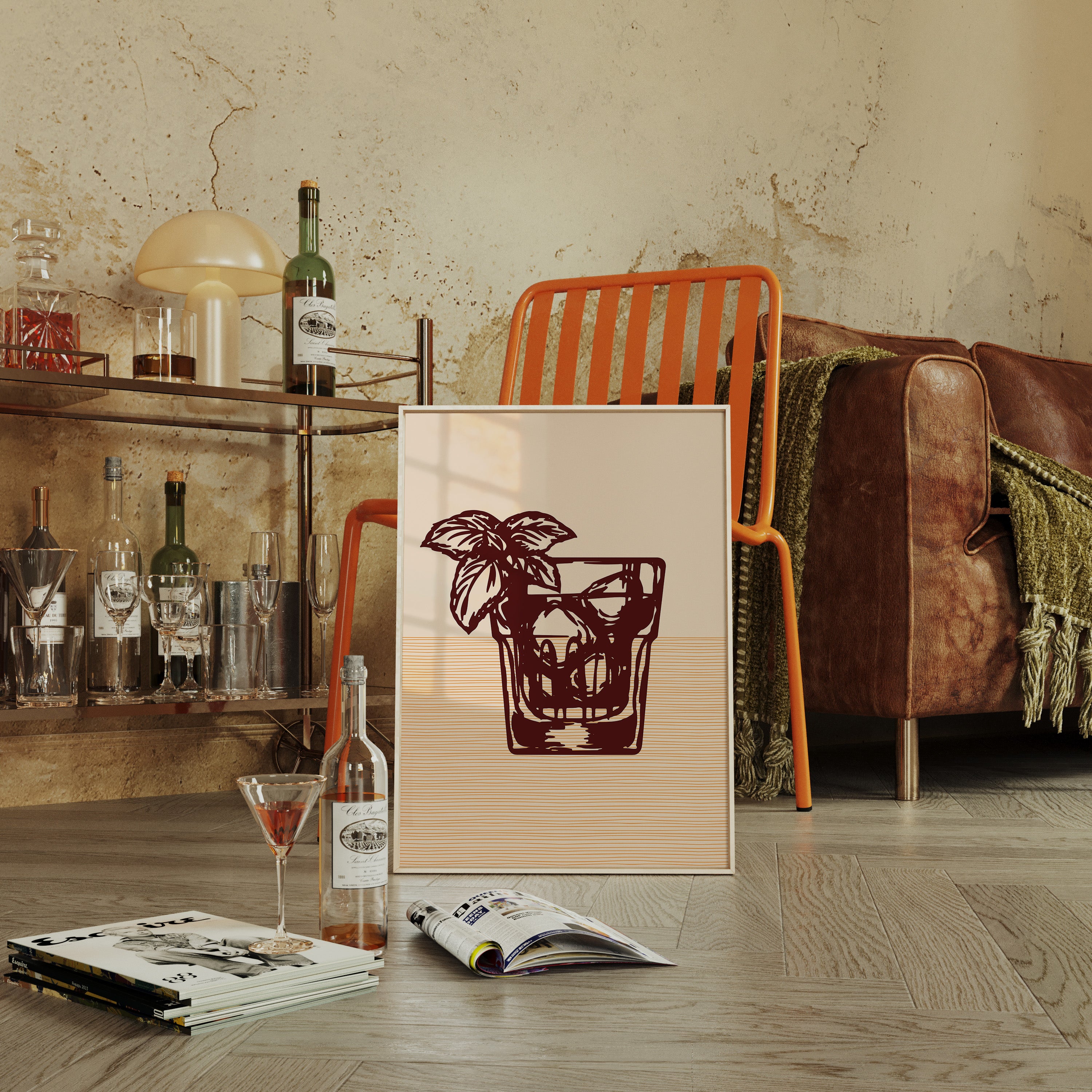 A single glass holds stories of summer evenings, garnished with fresh possibility and warmth. This contemporary line illustration captures the essence of modern cocktail culture with minimalist charm. Deep burgundy silhouettes play against peachy sunset stripes, while delicate leaf details add organic movement to the geometric composition. The simplicity of the design speaks to moments of relaxation and sophistication, making it perfect for elevating the ambiance of a home bar, kitchen, or dining space. Each viewing invites a new appreciation for life's simple pleasures.