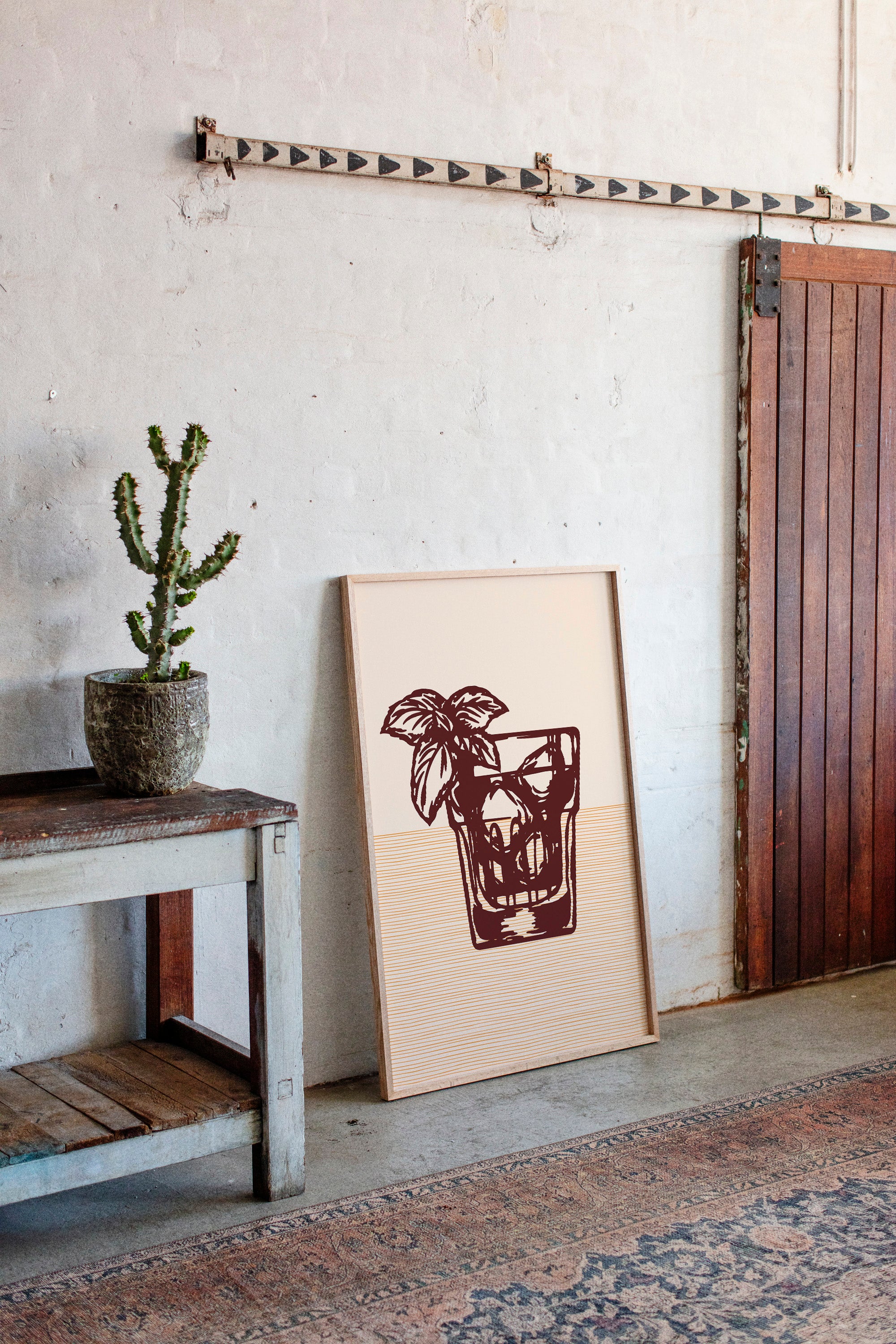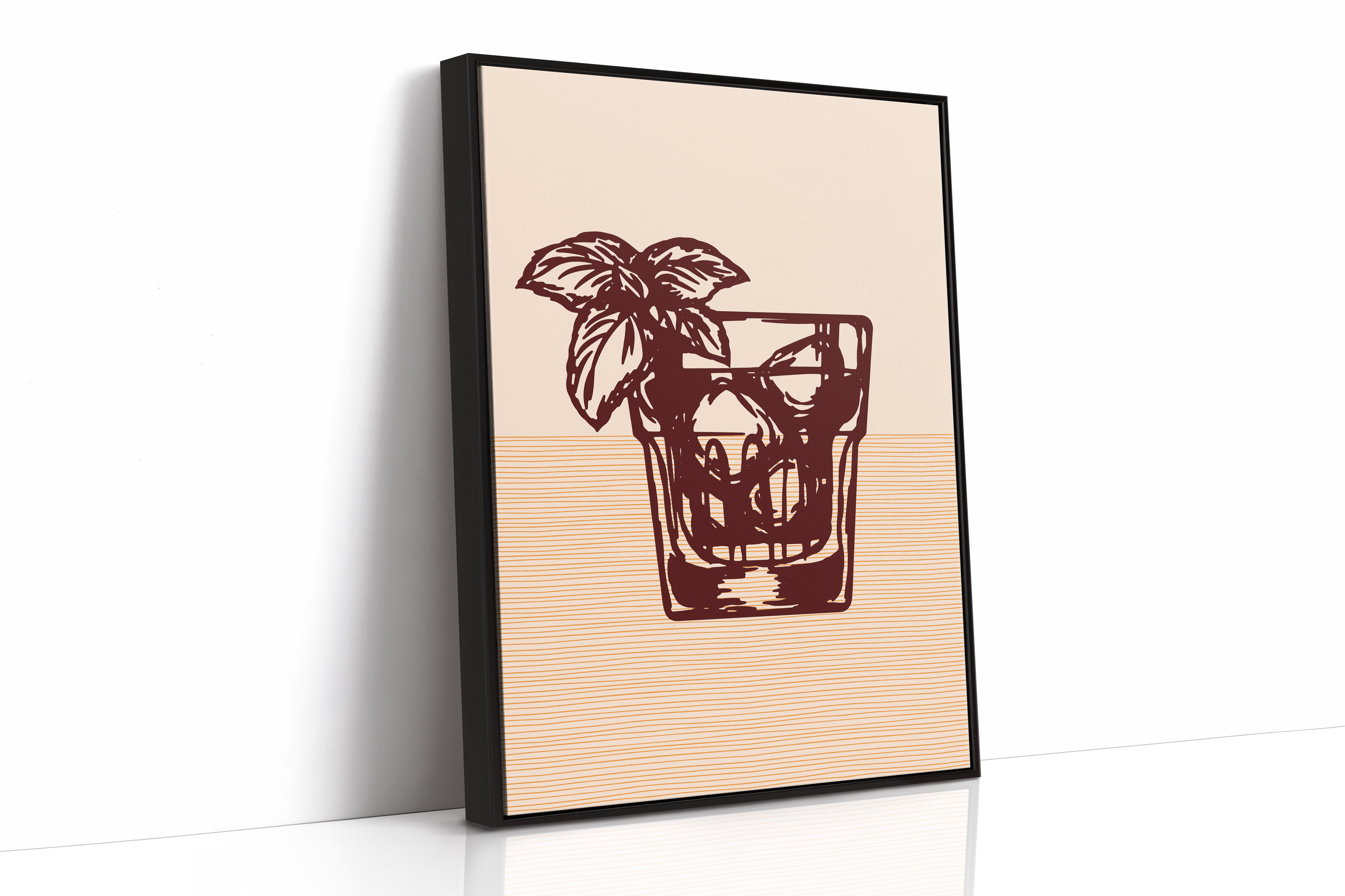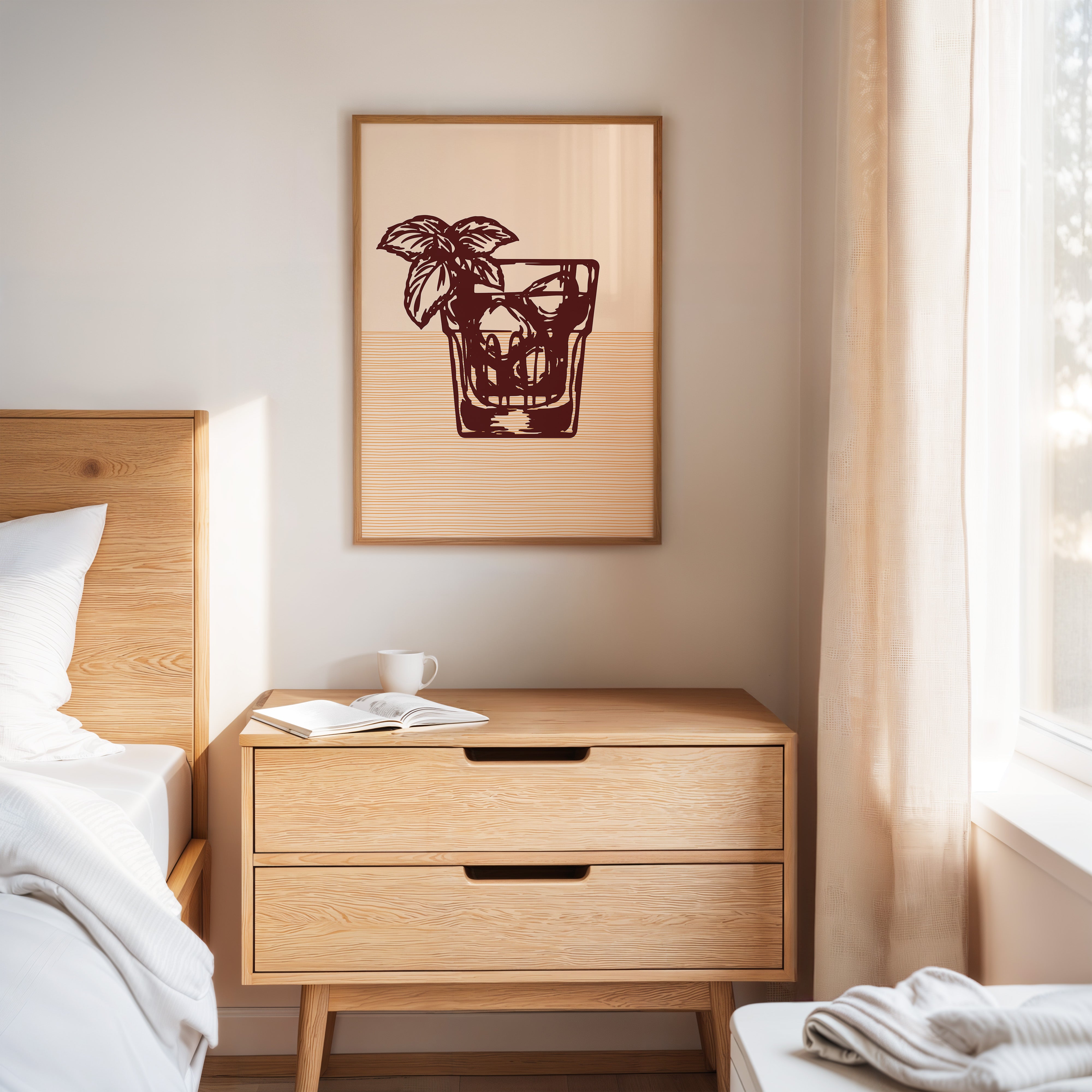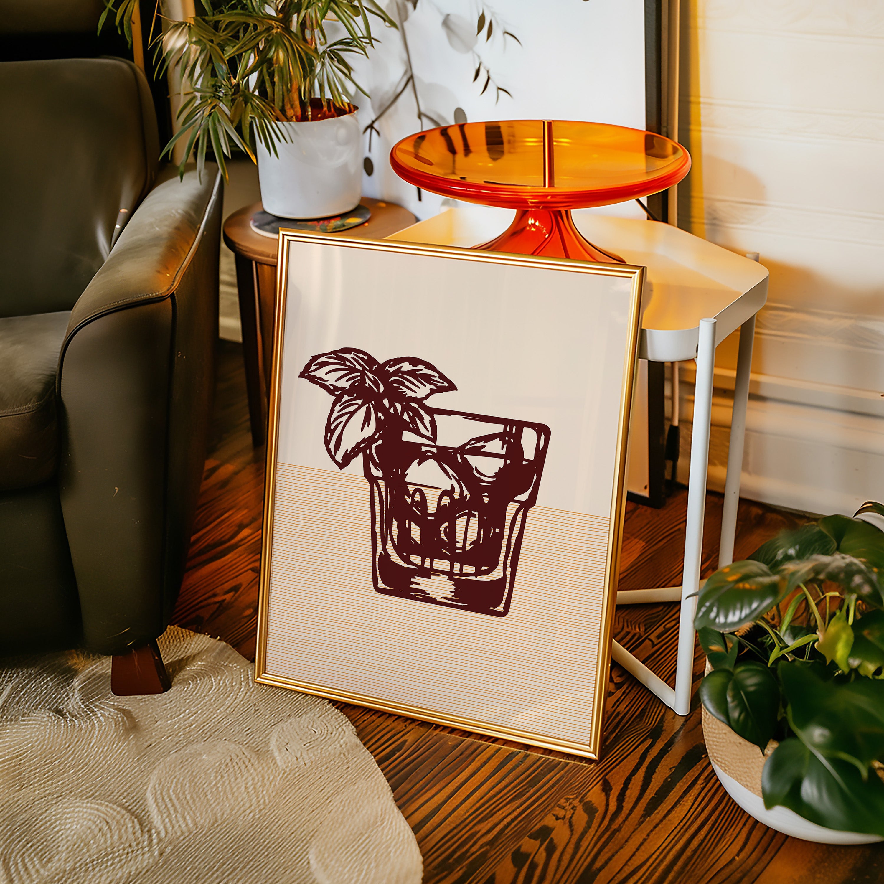 A single glass holds stories of summer evenings, garnished with fresh possibility and warmth. This contemporary line illustration captures the essence of modern cocktail culture with minimalist charm. Deep burgundy silhouettes play against peachy sunset stripes, while delicate leaf details add organic movement to the geometric composition. The simplicity of the design speaks to moments of relaxation and sophistication, making it perfect for elevating the ambiance of a home bar, kitchen, or dining space. Each viewing invites a new appreciation for life's simple pleasures.