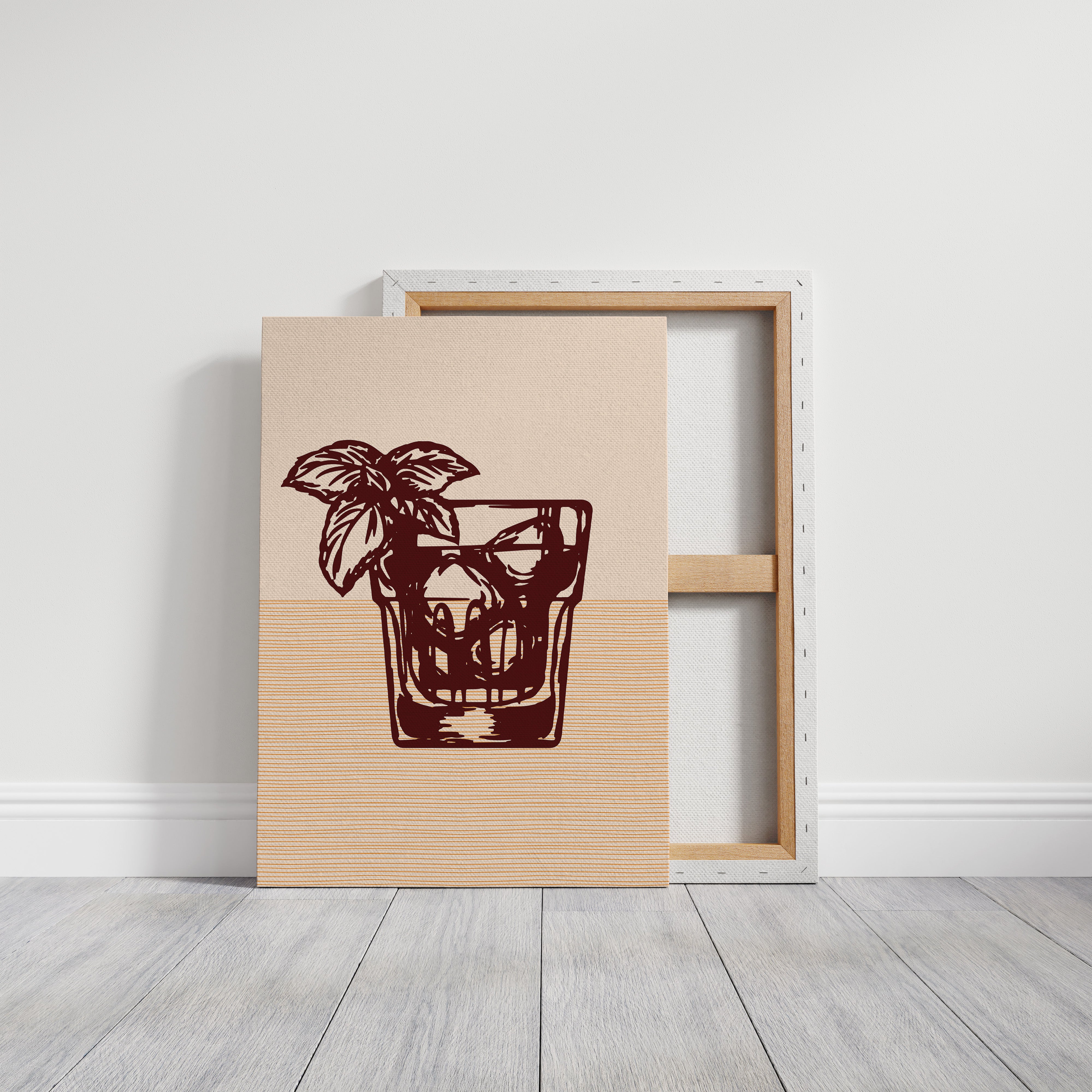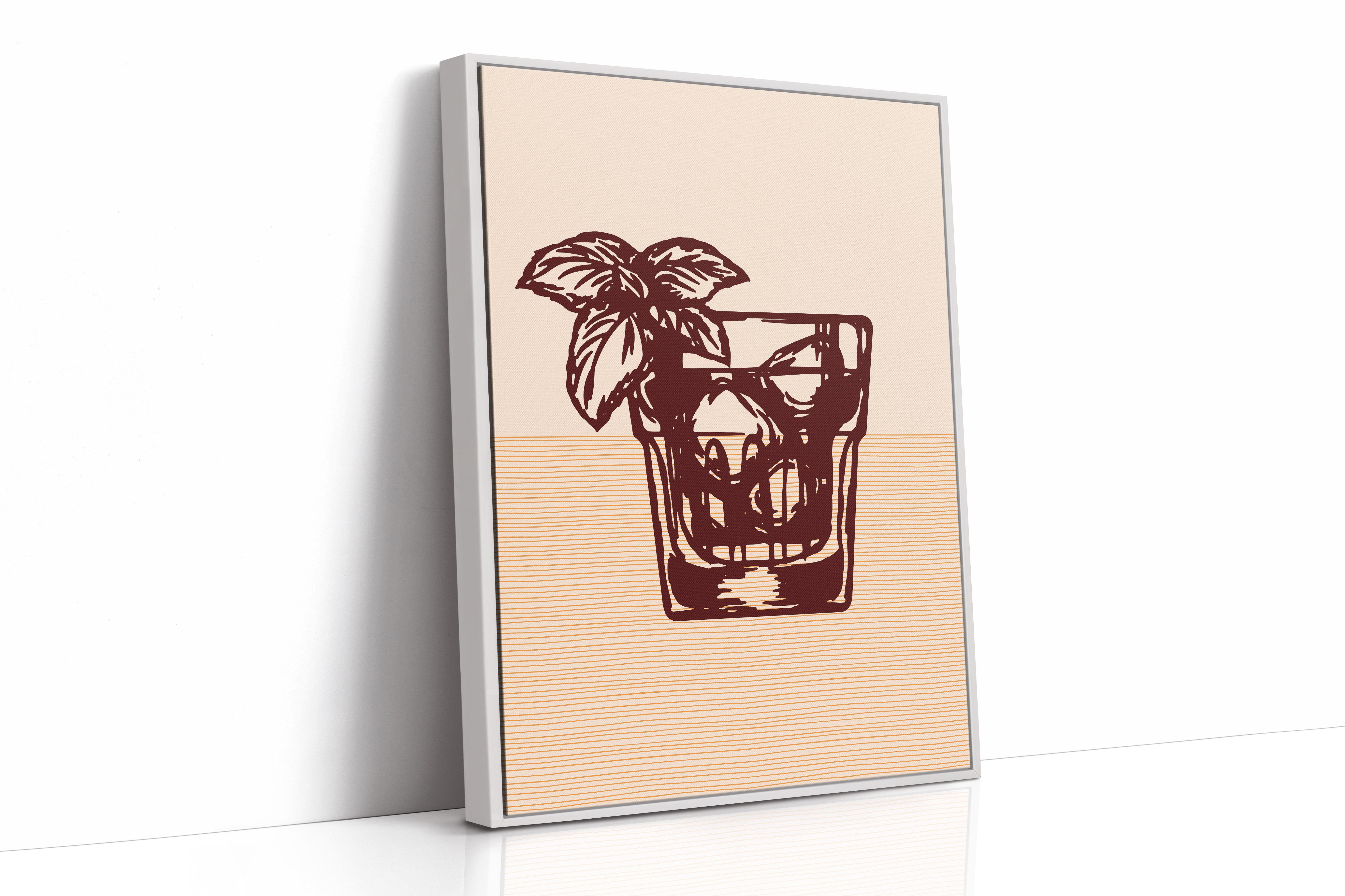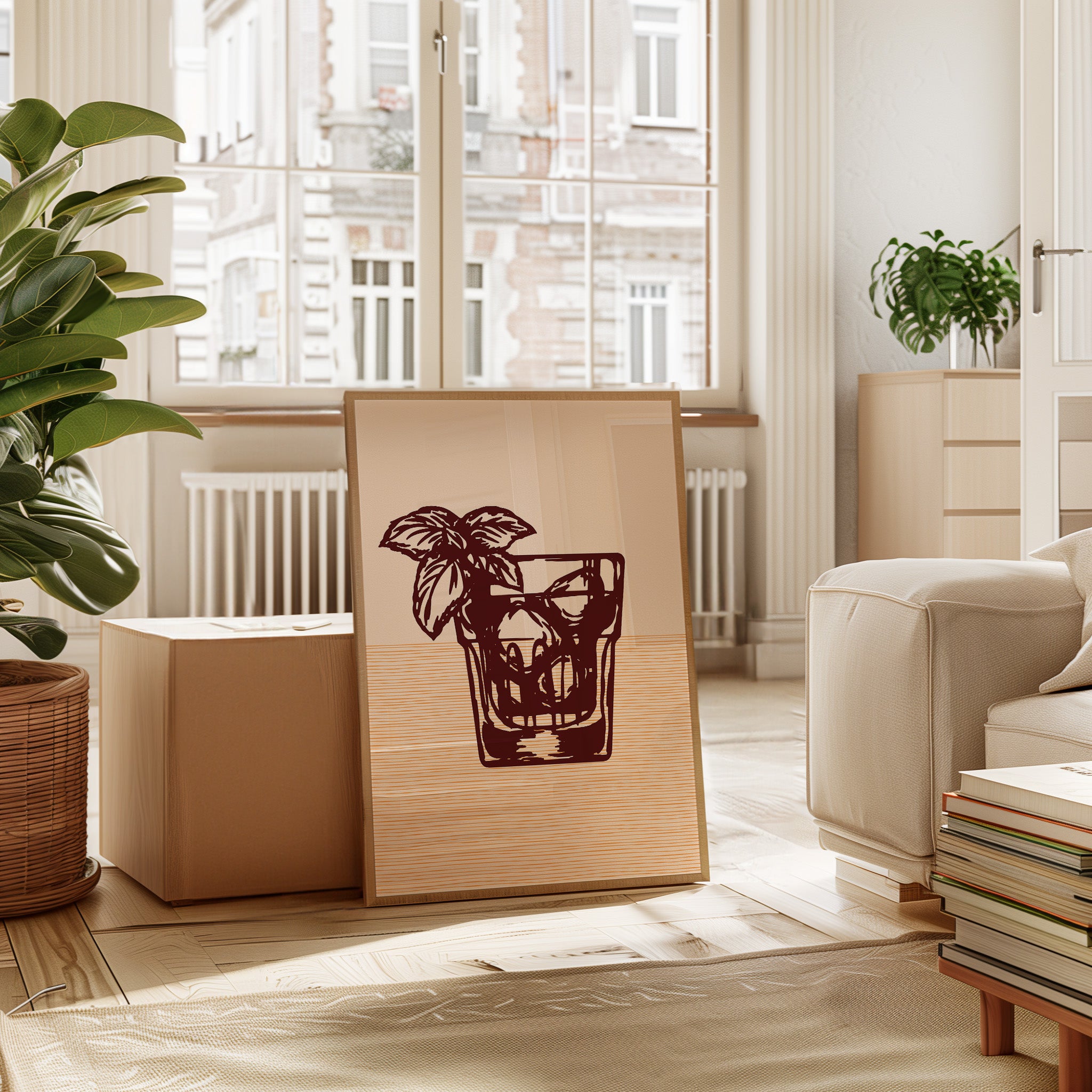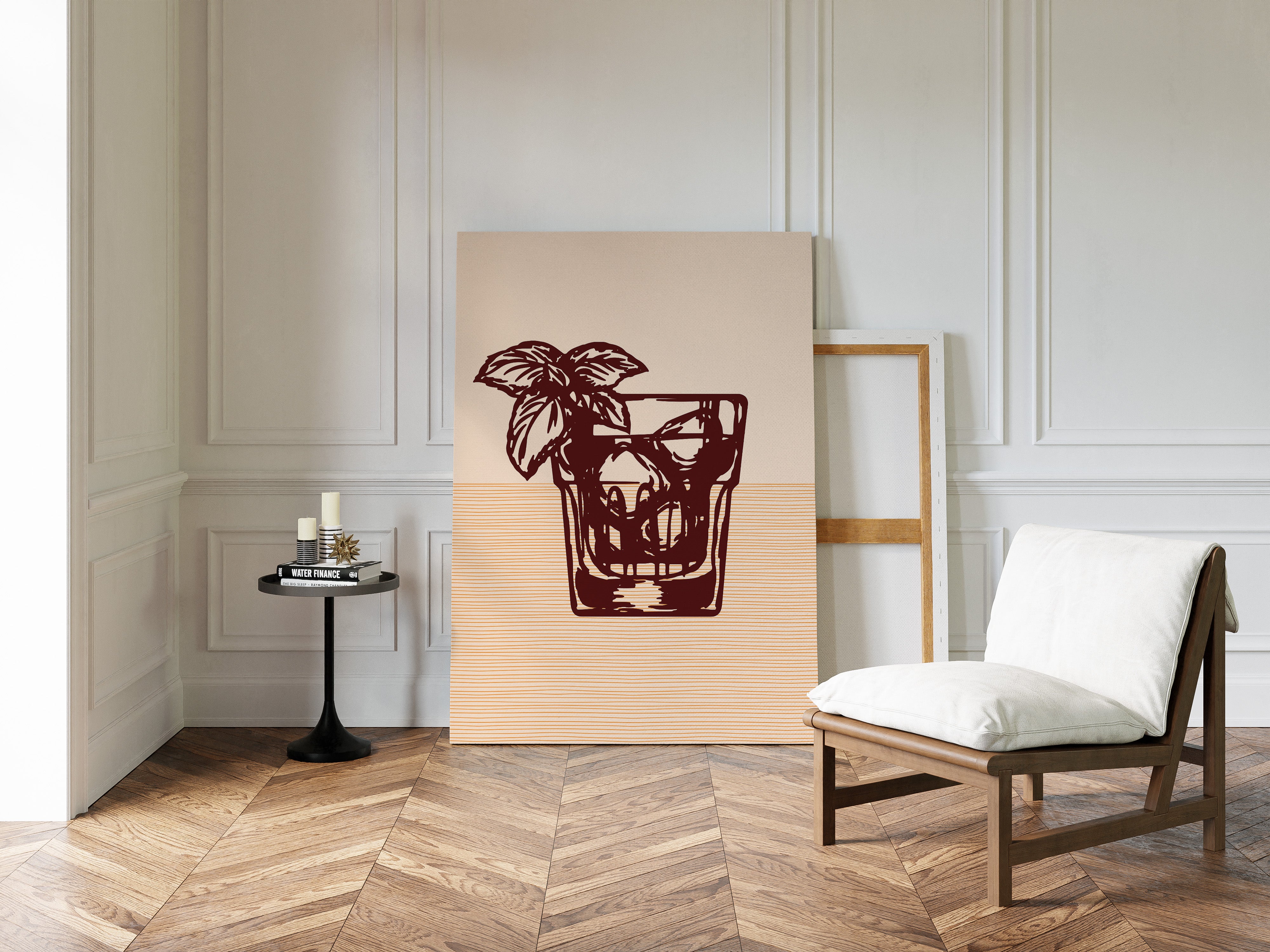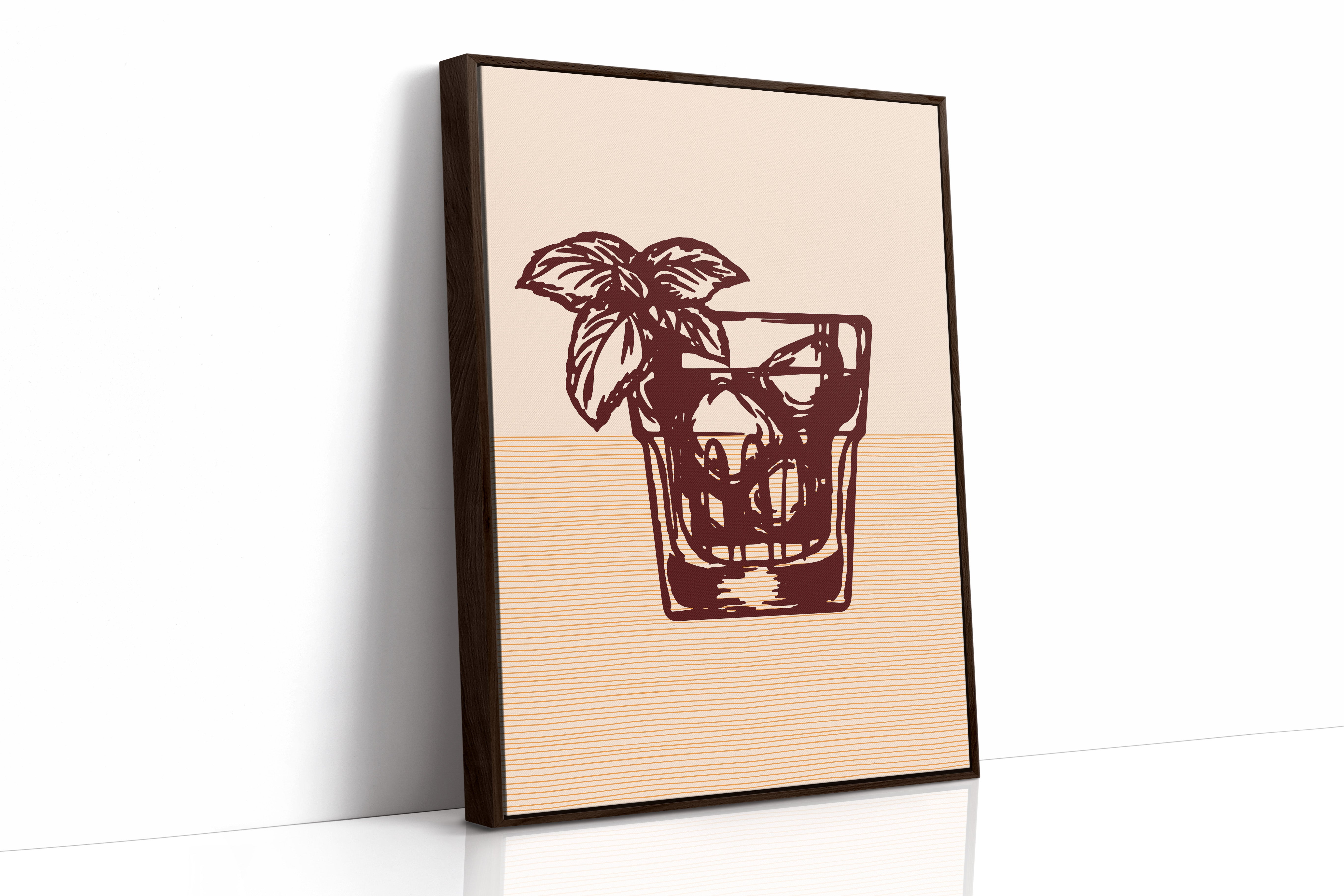 A single glass holds stories of summer evenings, garnished with fresh possibility and warmth. This contemporary line illustration captures the essence of modern cocktail culture with minimalist charm. Deep burgundy silhouettes play against peachy sunset stripes, while delicate leaf details add organic movement to the geometric composition. The simplicity of the design speaks to moments of relaxation and sophistication, making it perfect for elevating the ambiance of a home bar, kitchen, or dining space. Each viewing invites a new appreciation for life's simple pleasures.