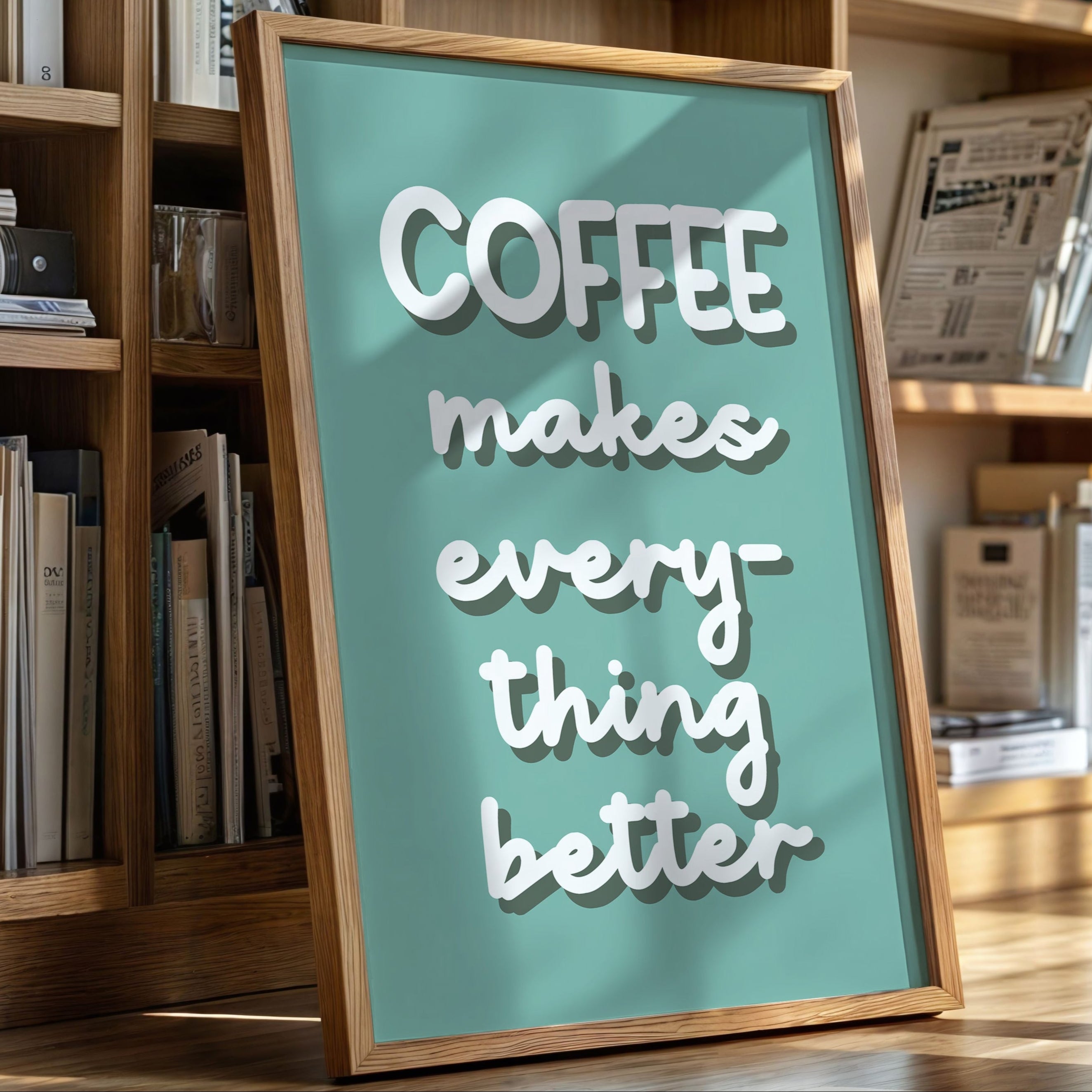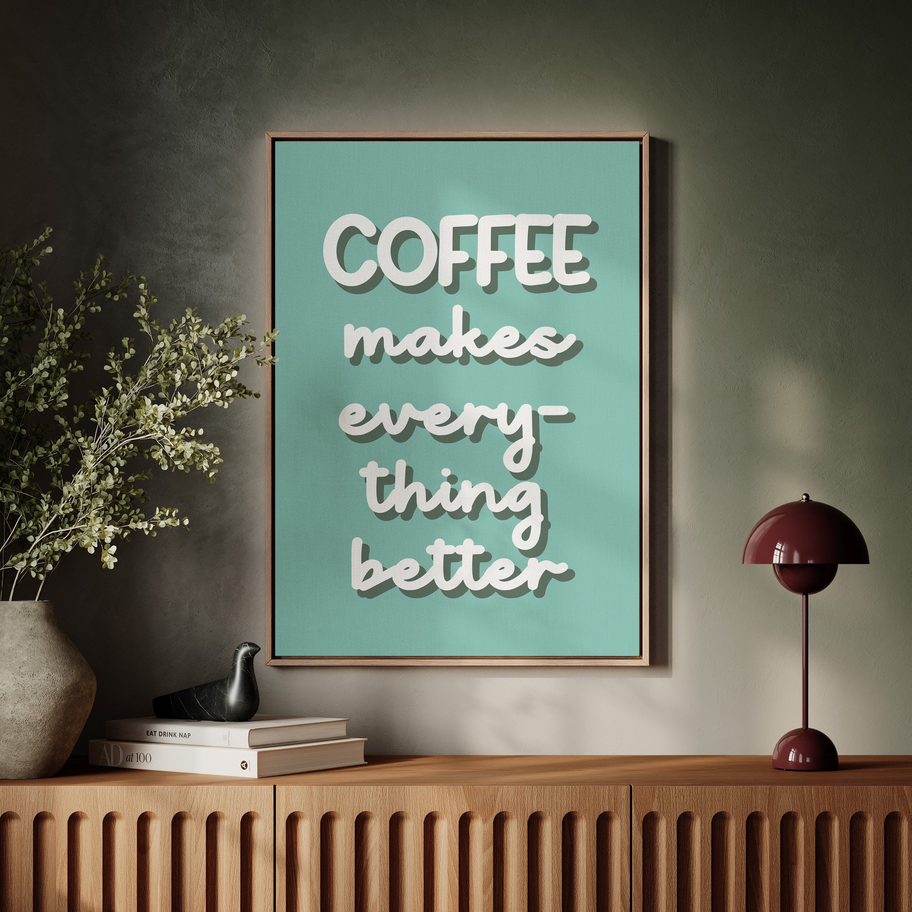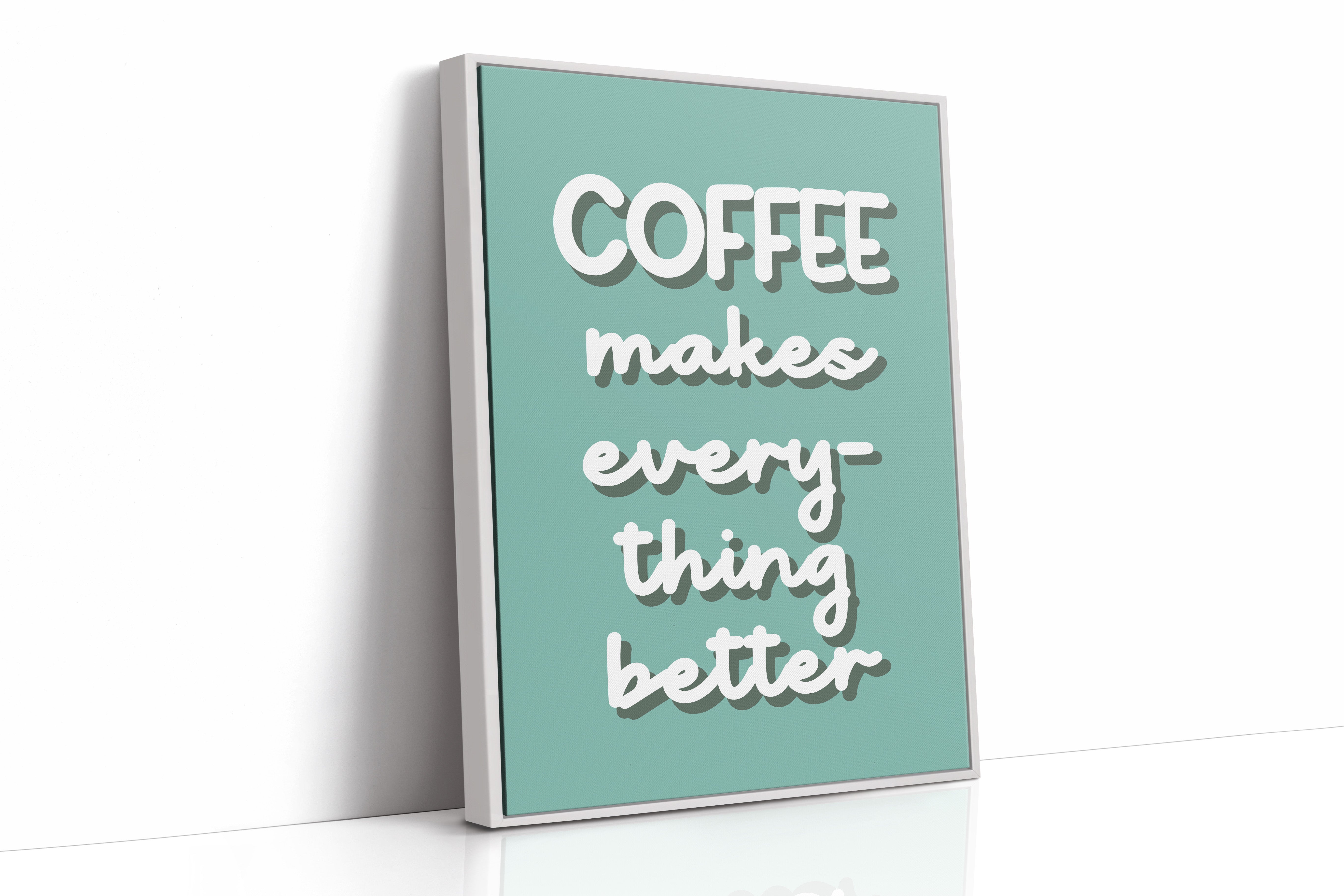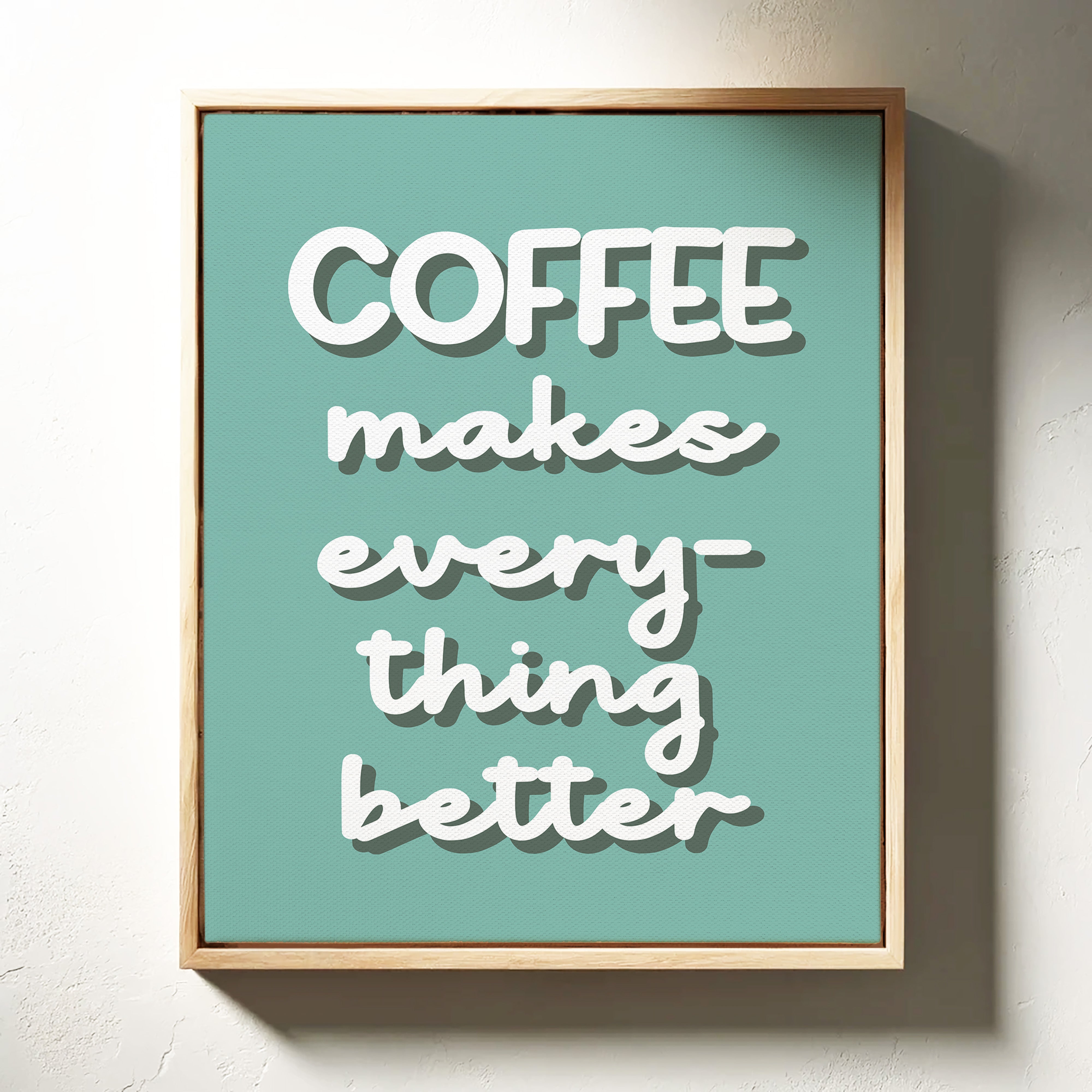 A gentle revelation unfolds in soothing seafoam green, where bold typography casts playful shadows against tranquility. This piece from our Contemporary collection marries modern simplicity with a dash of caffeinated wisdom. White letters dance across the calm backdrop, each character carefully crafted to balance whimsy and clarity, while the message itself becomes a morning meditation. The understated color palette and clean design speak to those quiet moments when possibility feels infinite. Perfect for kitchen spaces, coffee nooks, or any area where morning rituals begin to unfold. Let this piece be your daily reminder that sometimes the simplest pleasures hold the most profound magic.