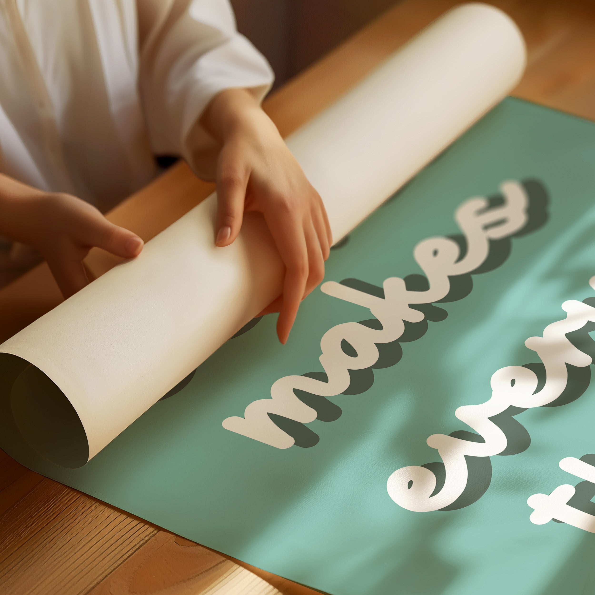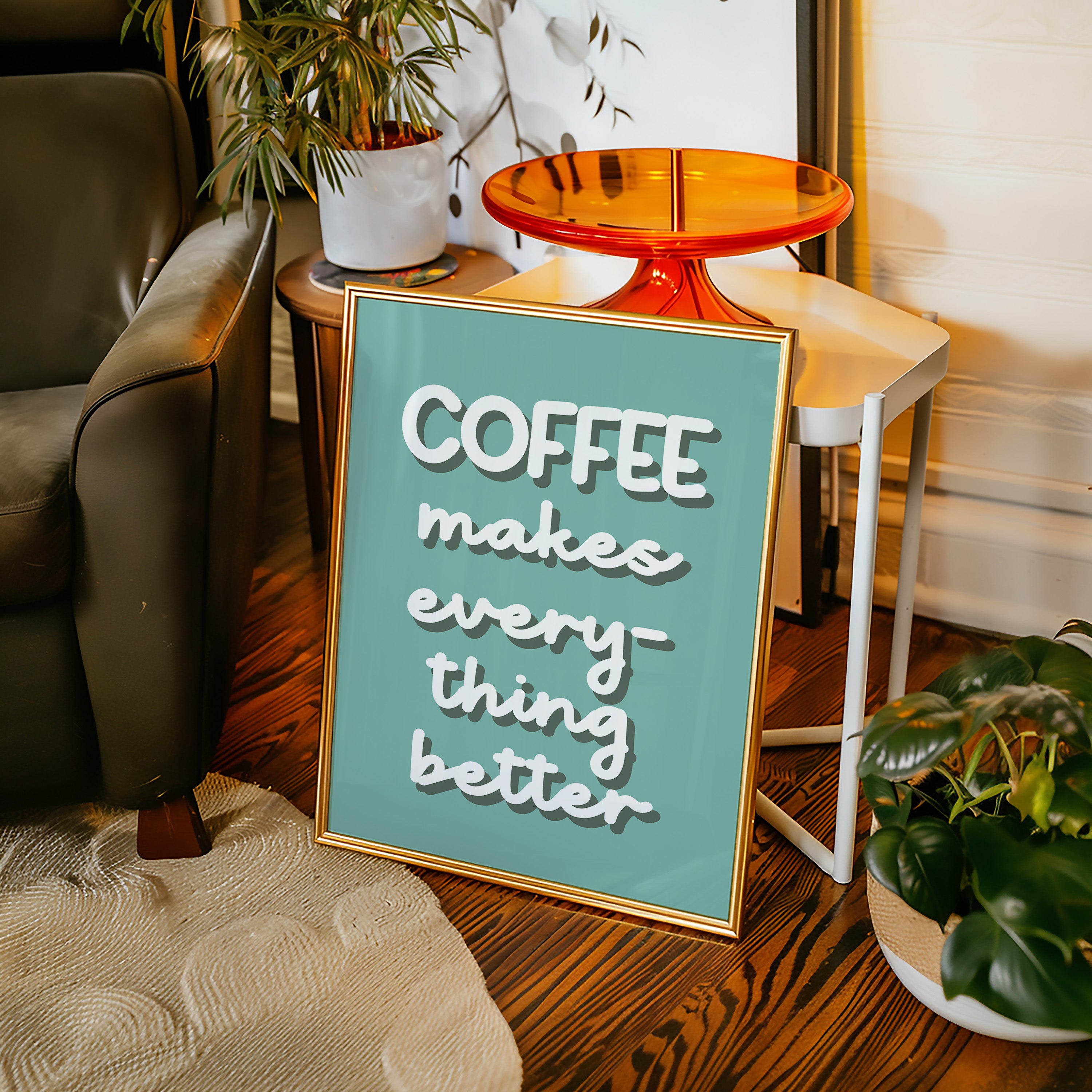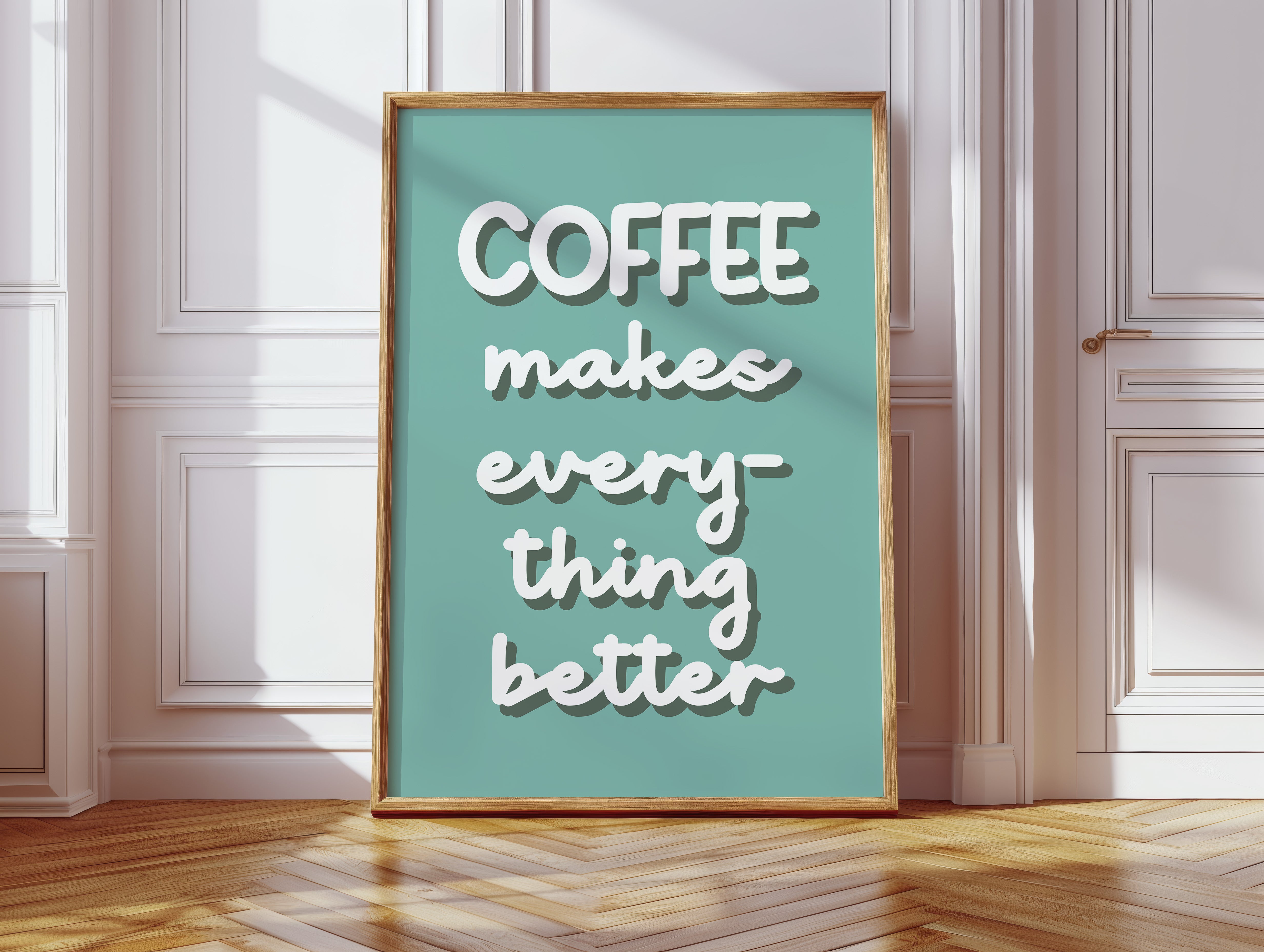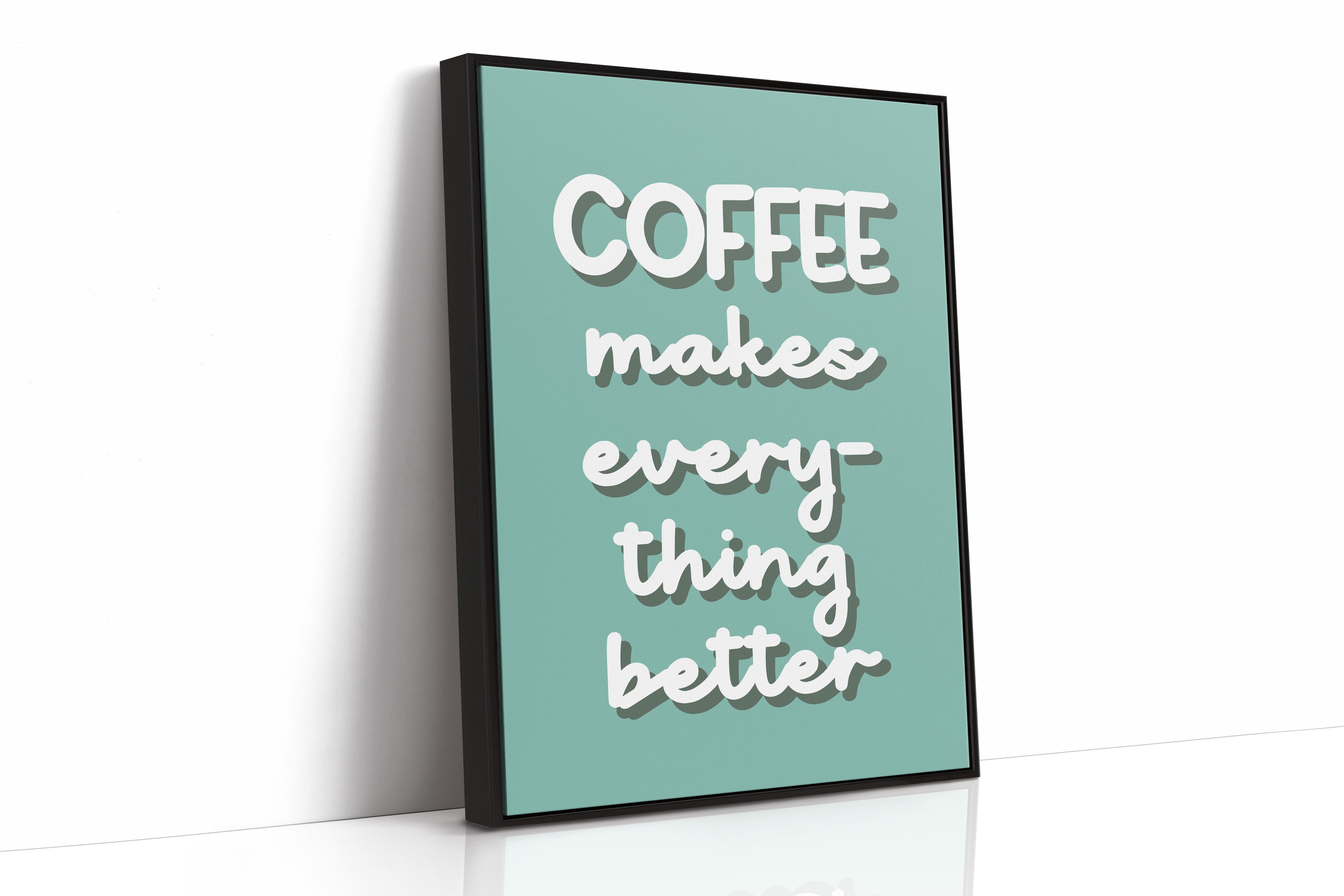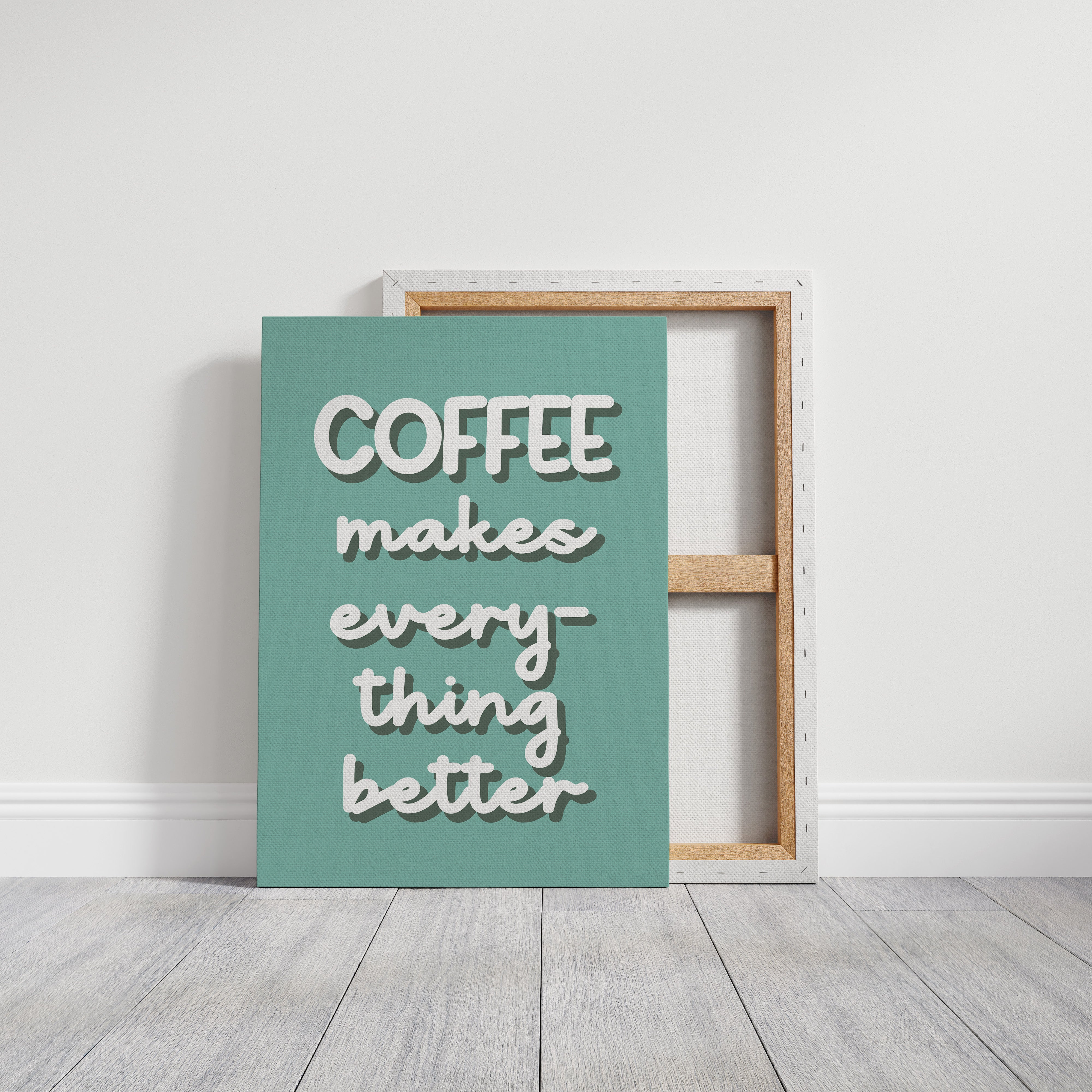 A gentle revelation unfolds in soothing seafoam green, where bold typography casts playful shadows against tranquility. This piece from our Contemporary collection marries modern simplicity with a dash of caffeinated wisdom. White letters dance across the calm backdrop, each character carefully crafted to balance whimsy and clarity, while the message itself becomes a morning meditation. The understated color palette and clean design speak to those quiet moments when possibility feels infinite. Perfect for kitchen spaces, coffee nooks, or any area where morning rituals begin to unfold. Let this piece be your daily reminder that sometimes the simplest pleasures hold the most profound magic.