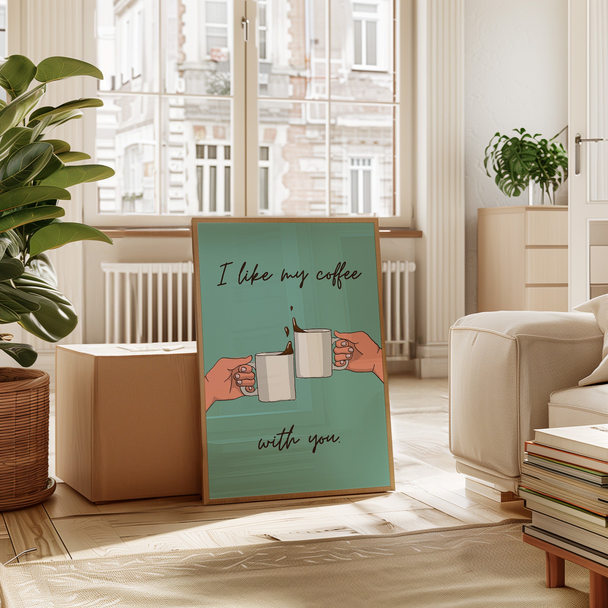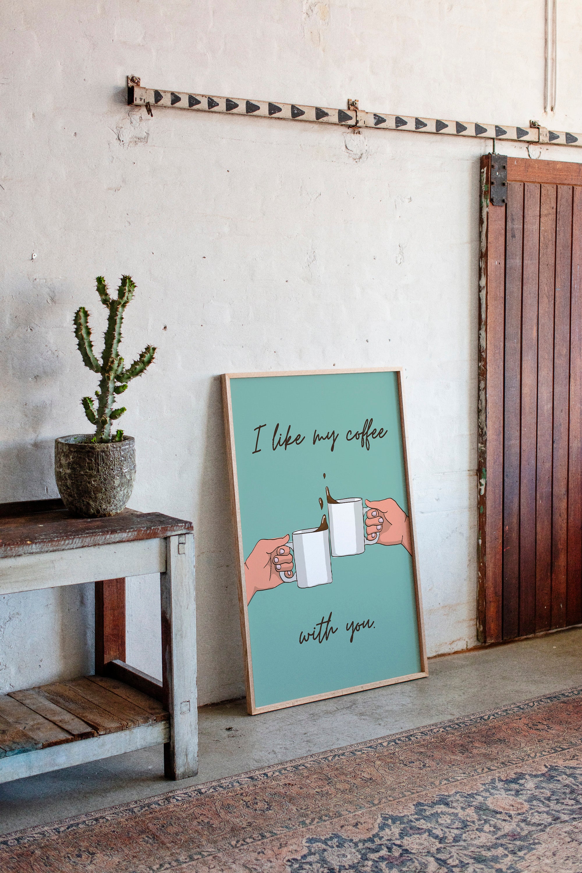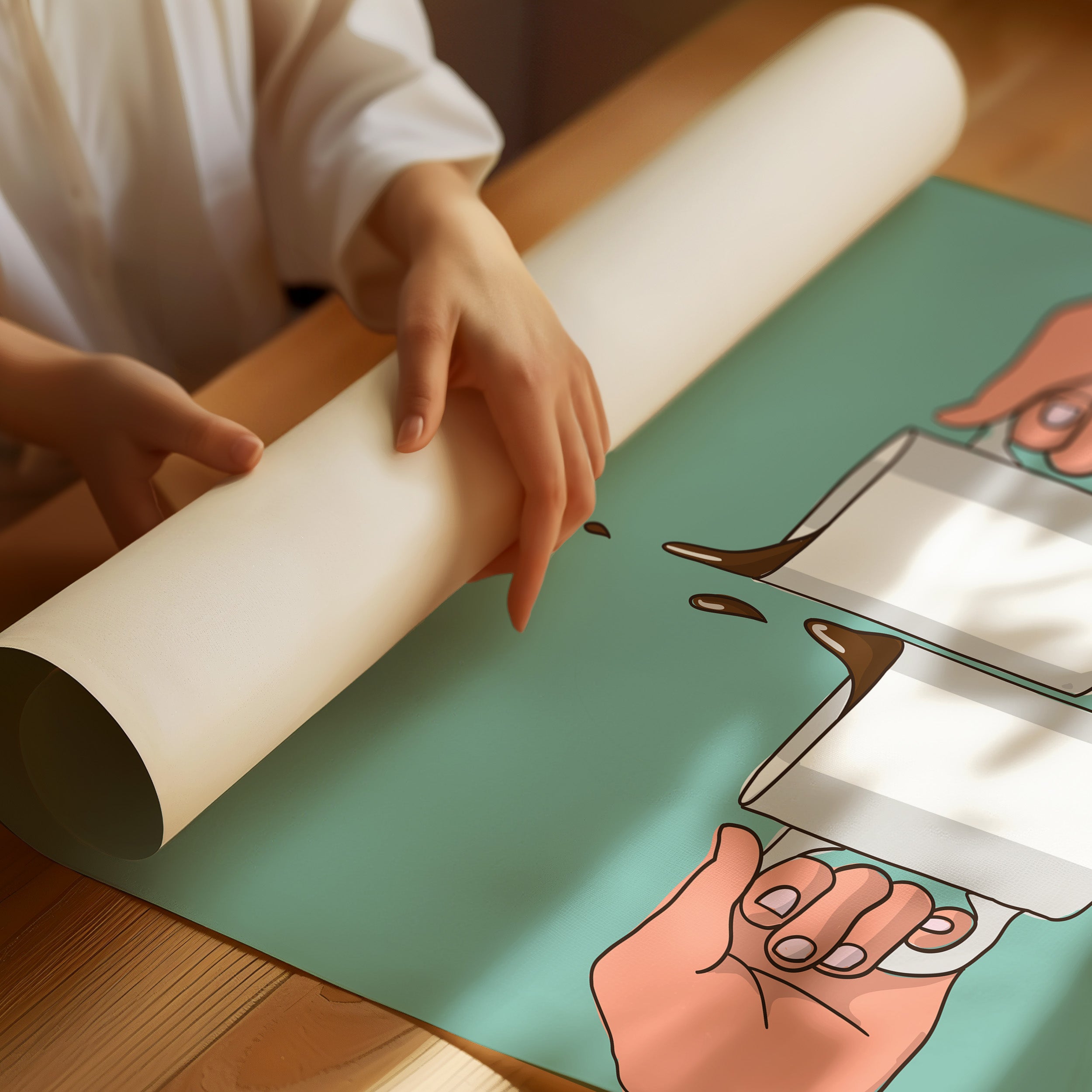 Steam rises between two mugs held in anticipation, a quiet celebration of togetherness against a serene mint backdrop. This piece from our Contemporary collection captures the intimate poetry of shared morning rituals. The minimalist illustration style pairs soft coral hands with crisp white ceramic, while playful coffee drops dance upward suggesting movement and life. The composition speaks to connection, friendship, and those precious moments when time seems to slow down over a warm drink. Perfect for kitchen spaces, breakfast nooks, or any area where good conversation flows freely. Each glance serves as a reminder to pause and savor life's simple pleasures.