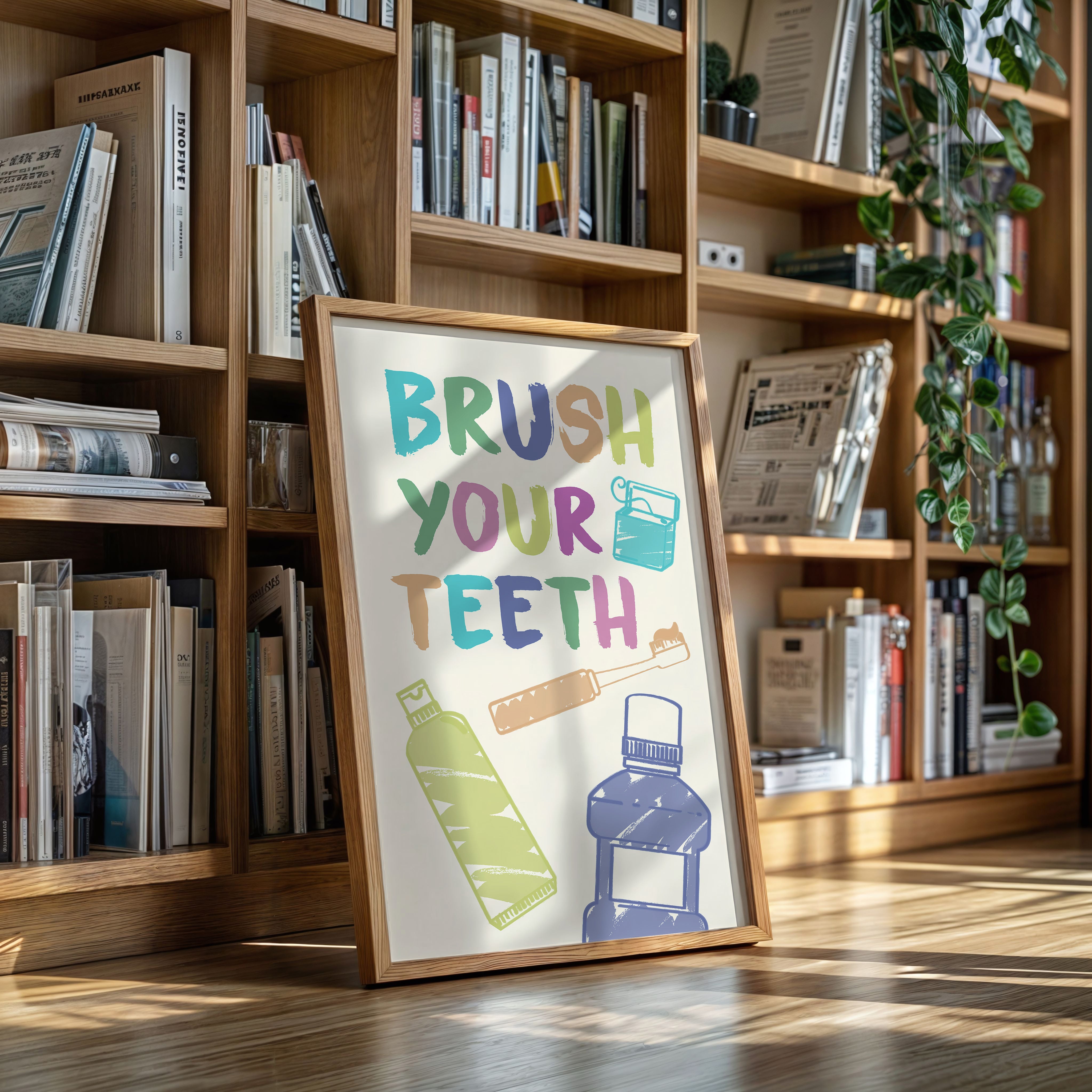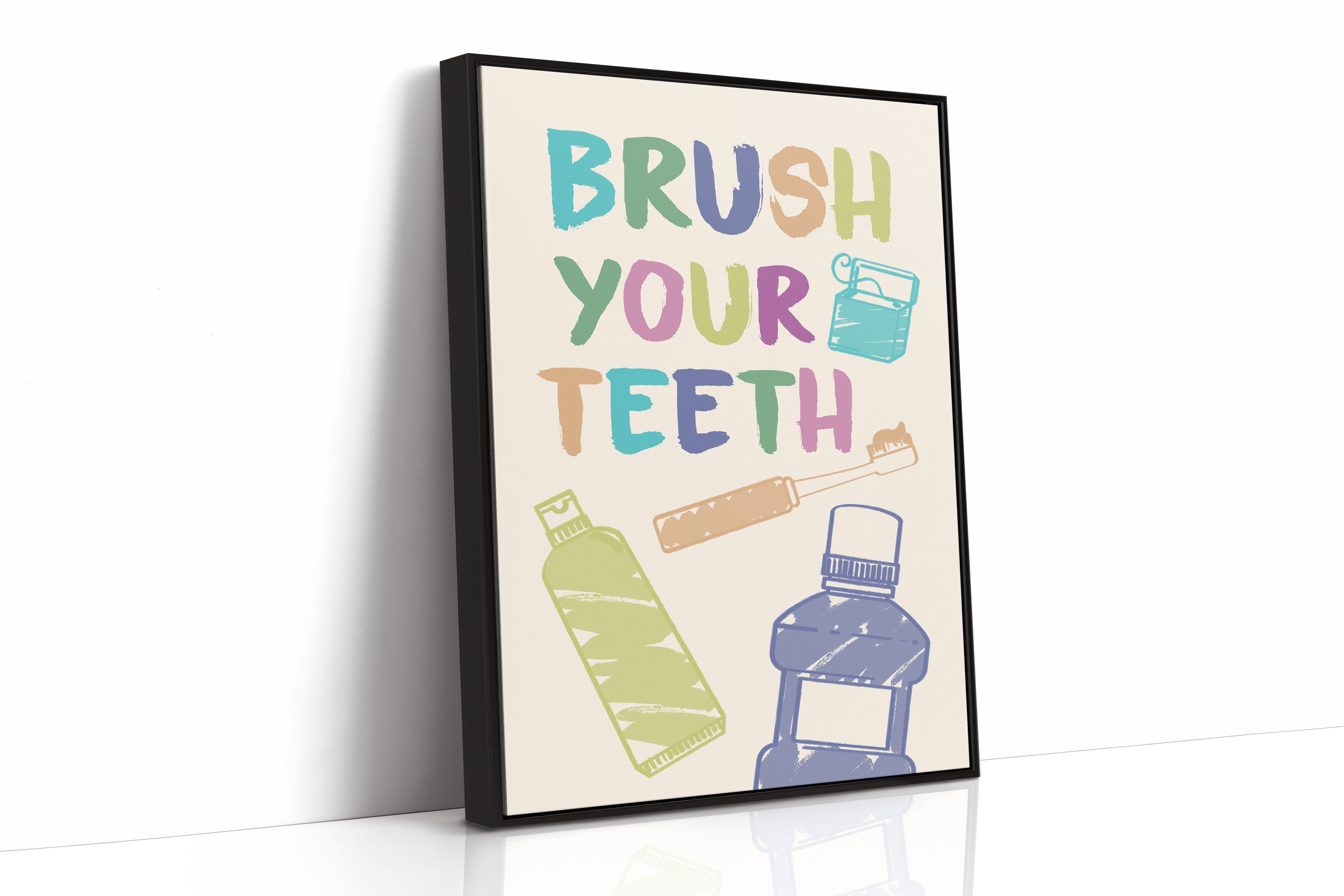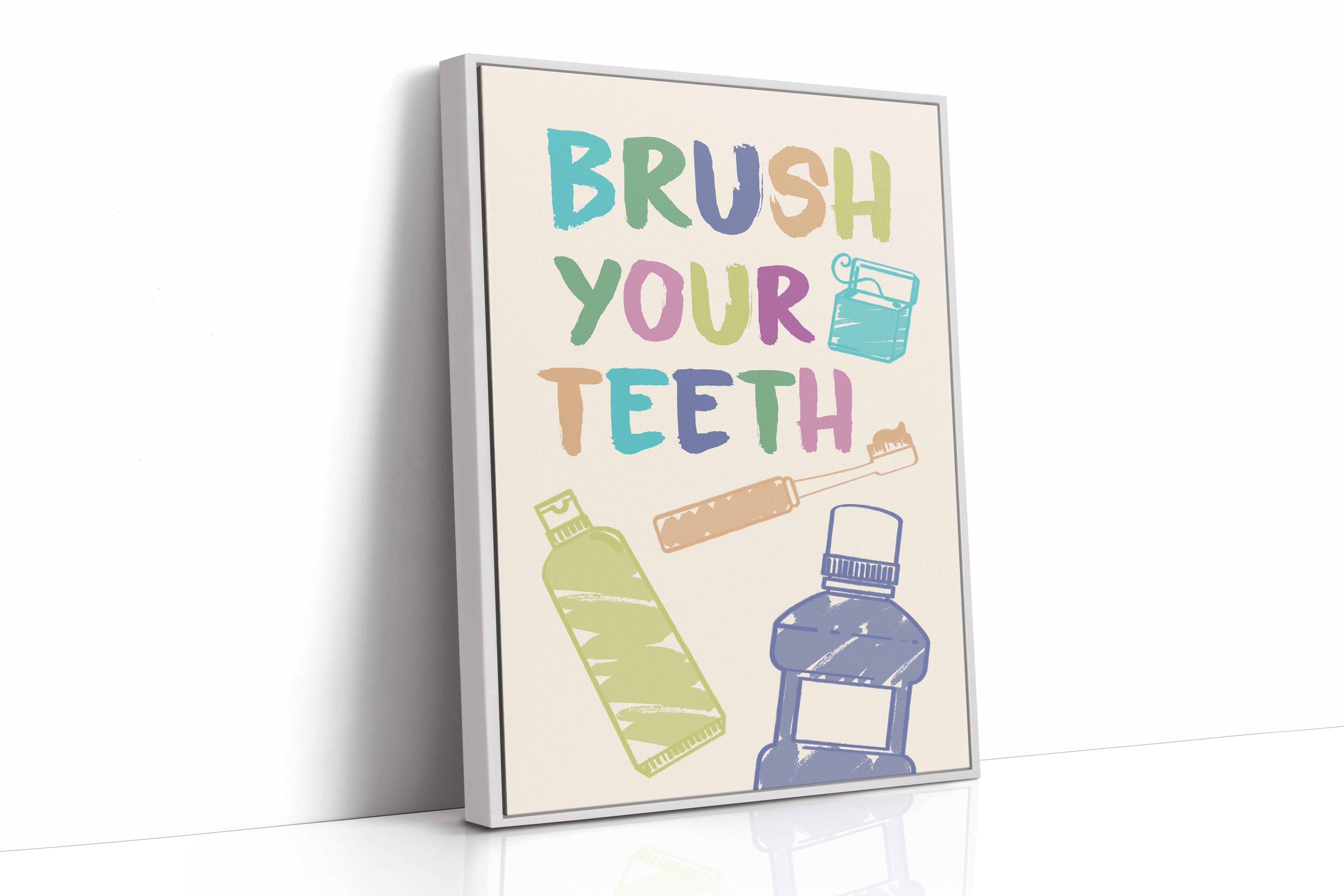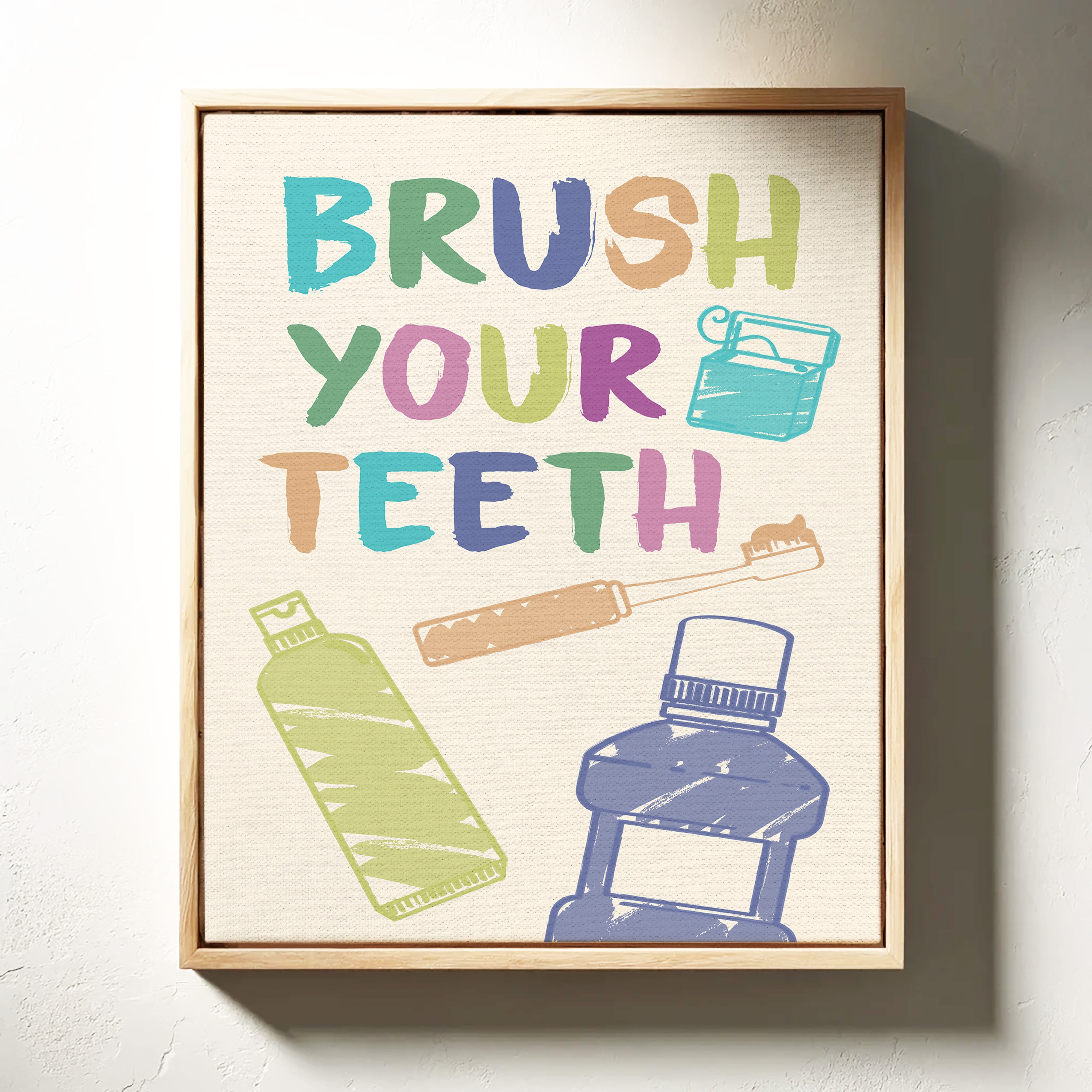 Playful pastels dance across the canvas, bringing a lighthearted reminder of daily wellness rituals. This contemporary piece from our Modern Lifestyle Collection captures the essence of fresh starts and clean beginnings. Brushstroke letters in soothing aqua, sage, and lavender create a gentle yet impactful message, while simple illustrations of dental care essentials add a touch of whimsy and practical charm. The composition transforms an everyday reminder into an artful statement that brightens any space. Perfect for adding a splash of color and positive energy to a bathroom, powder room, or children's space, this piece turns a simple message into a daily dose of inspiration.