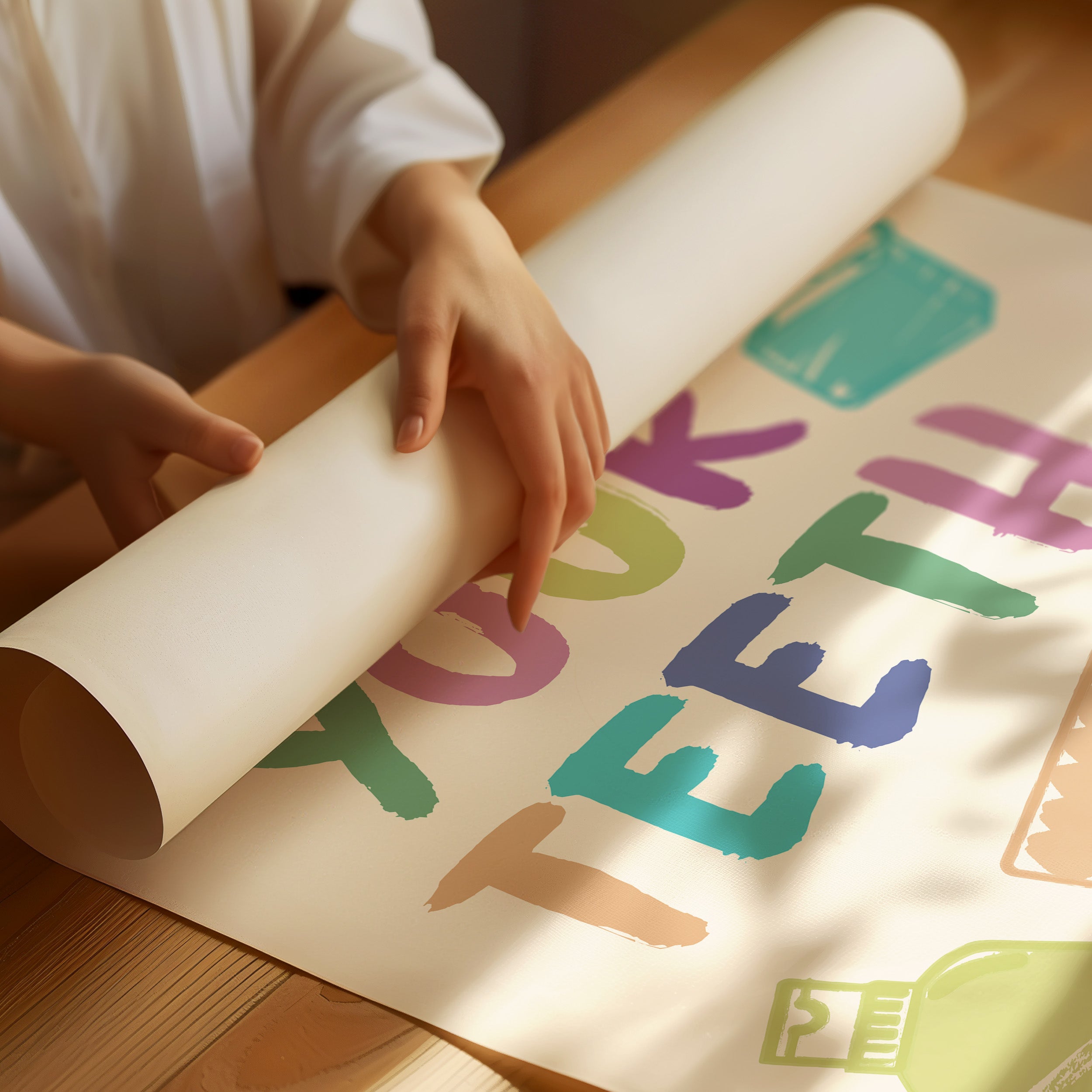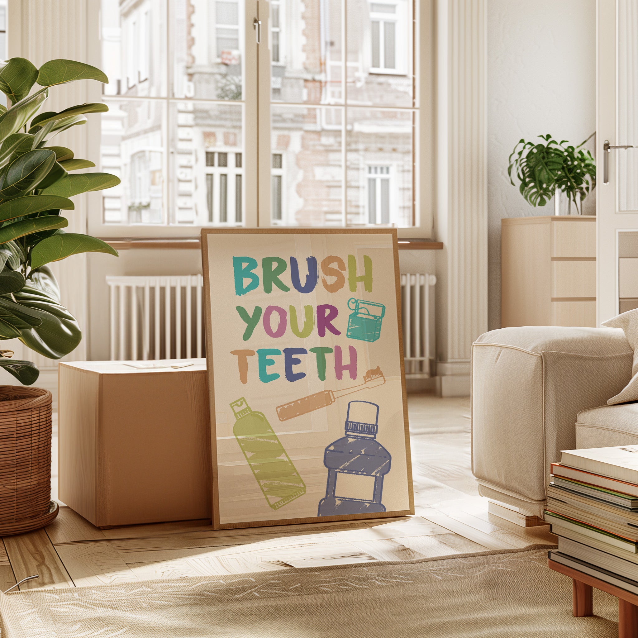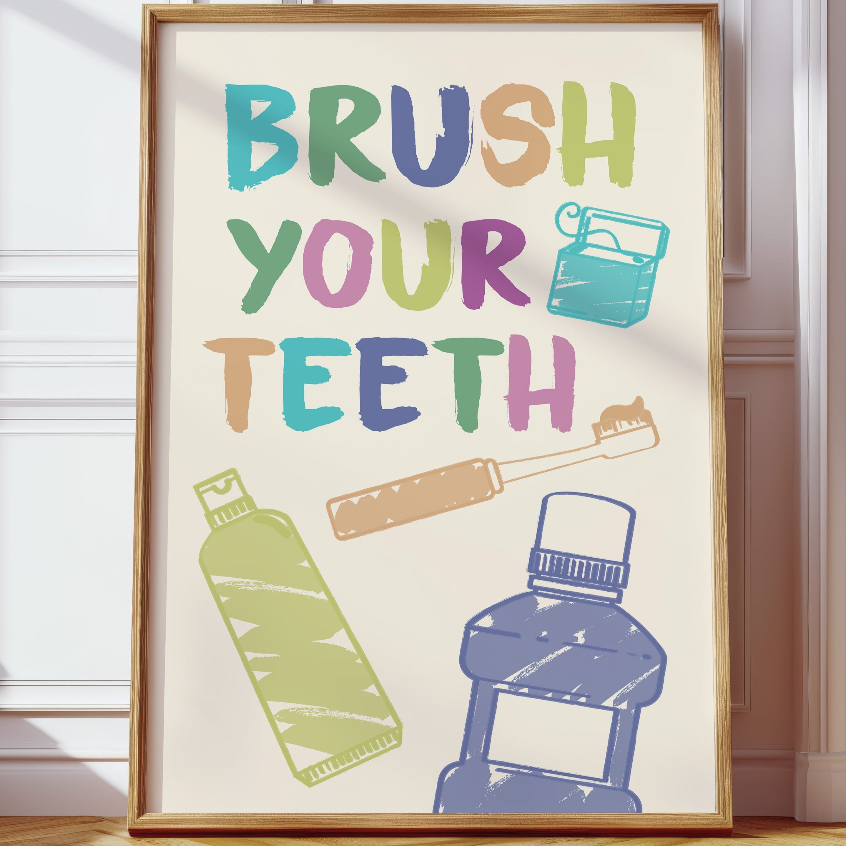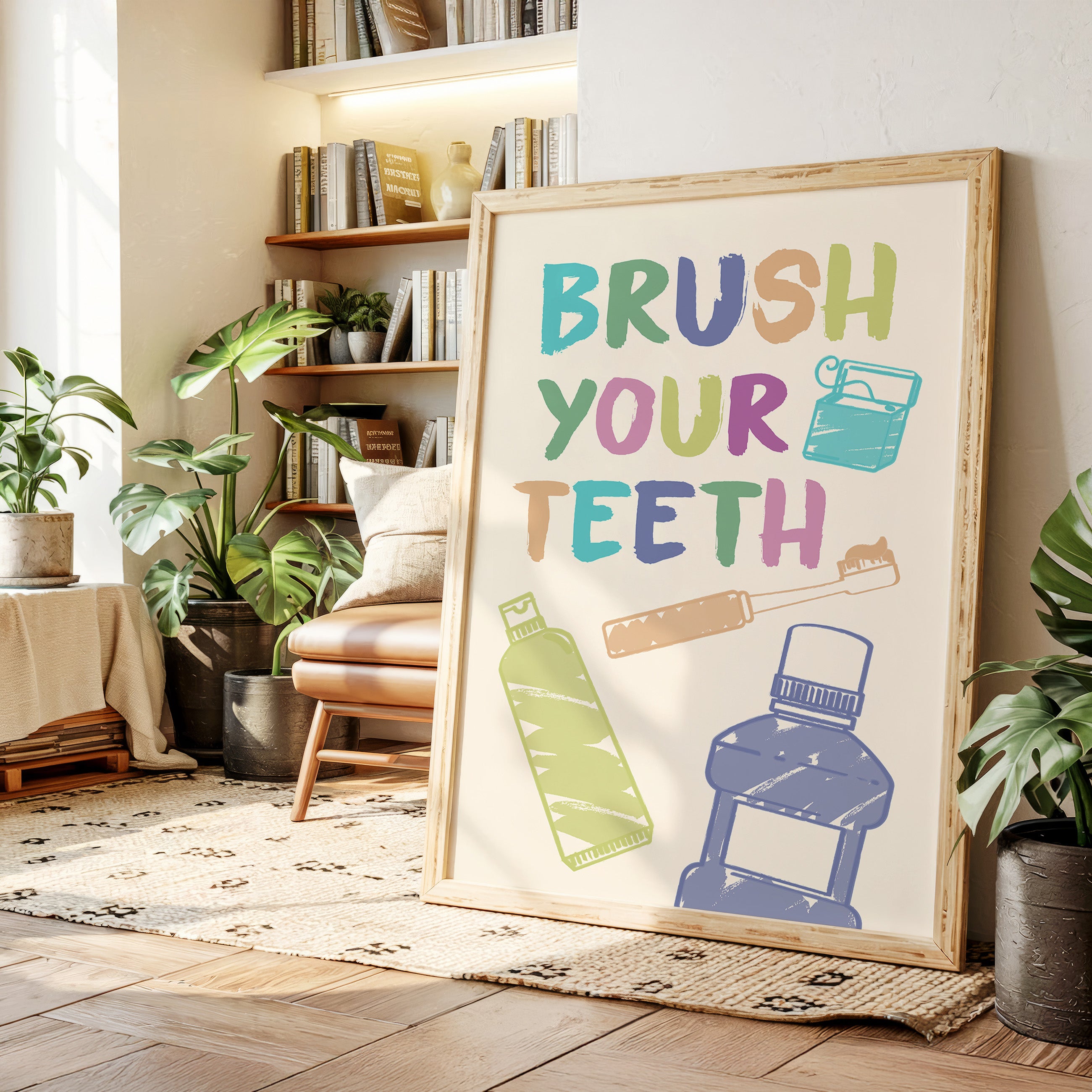Playful pastels dance across the canvas, bringing a lighthearted reminder of daily wellness rituals. This contemporary piece from our Modern Lifestyle Collection captures the essence of fresh starts and clean beginnings. Brushstroke letters in soothing aqua, sage, and lavender create a gentle yet impactful message, while simple illustrations of dental care essentials add a touch of whimsy and practical charm. The composition transforms an everyday reminder into an artful statement that brightens any space. Perfect for adding a splash of color and positive energy to a bathroom, powder room, or children's space, this piece turns a simple message into a daily dose of inspiration.