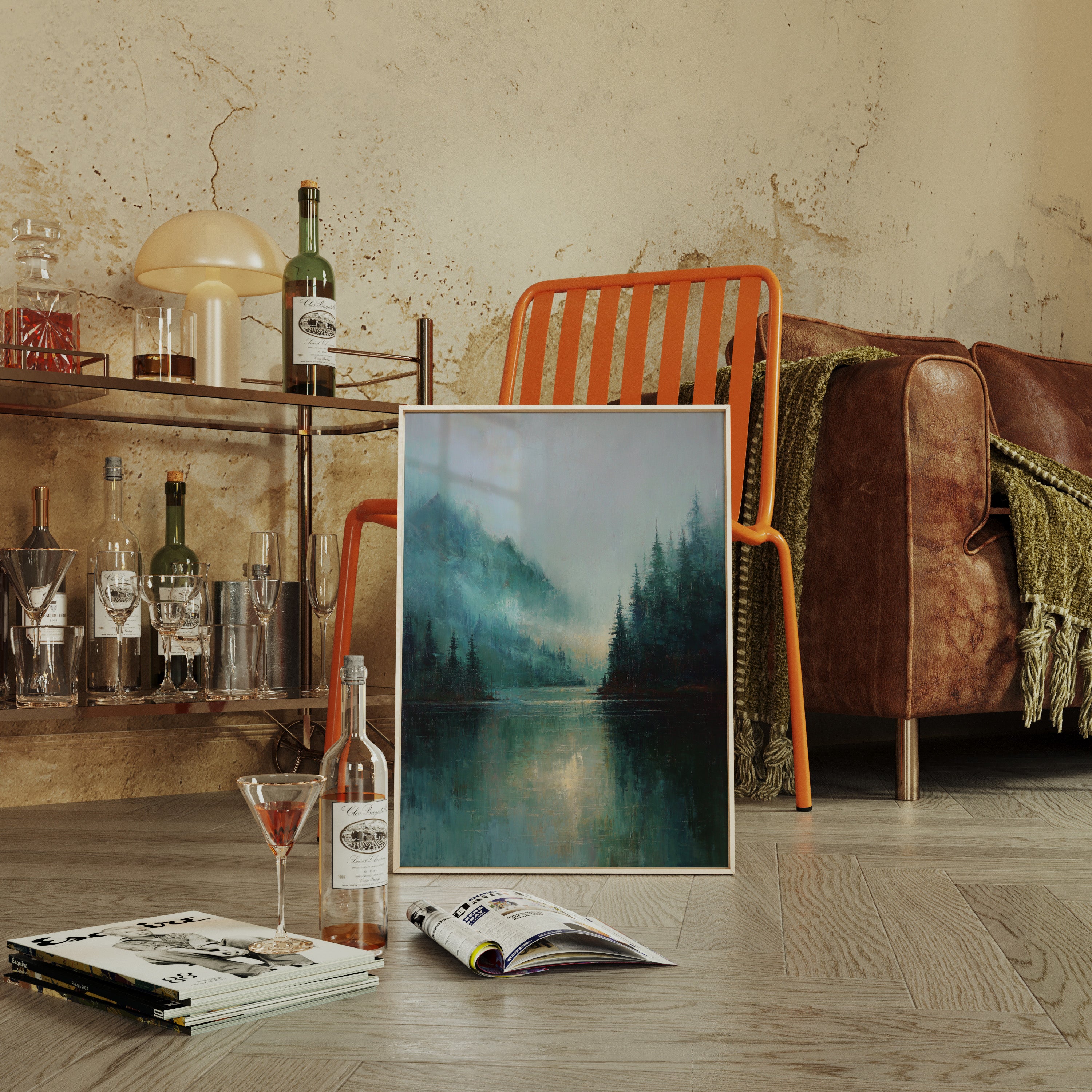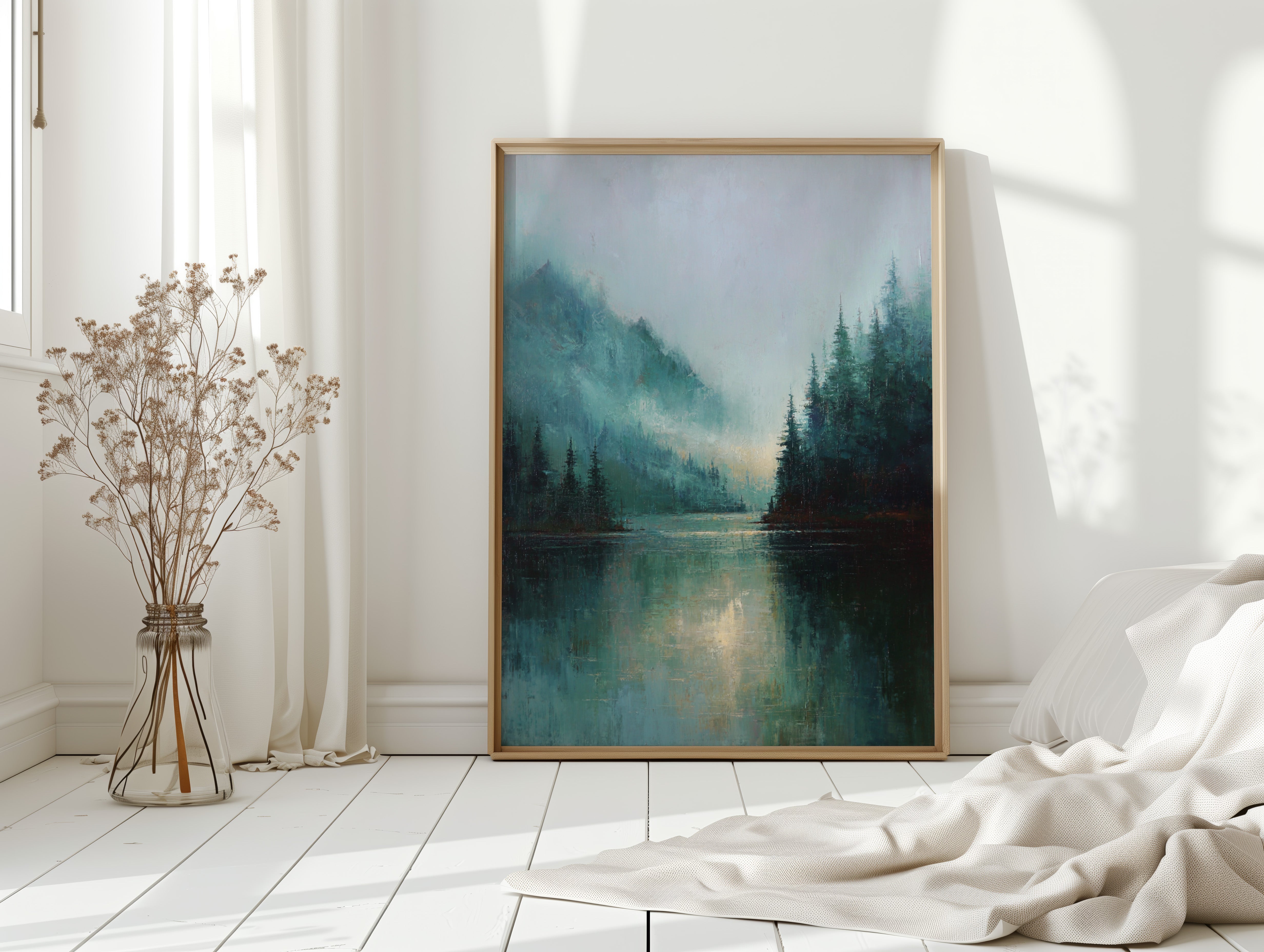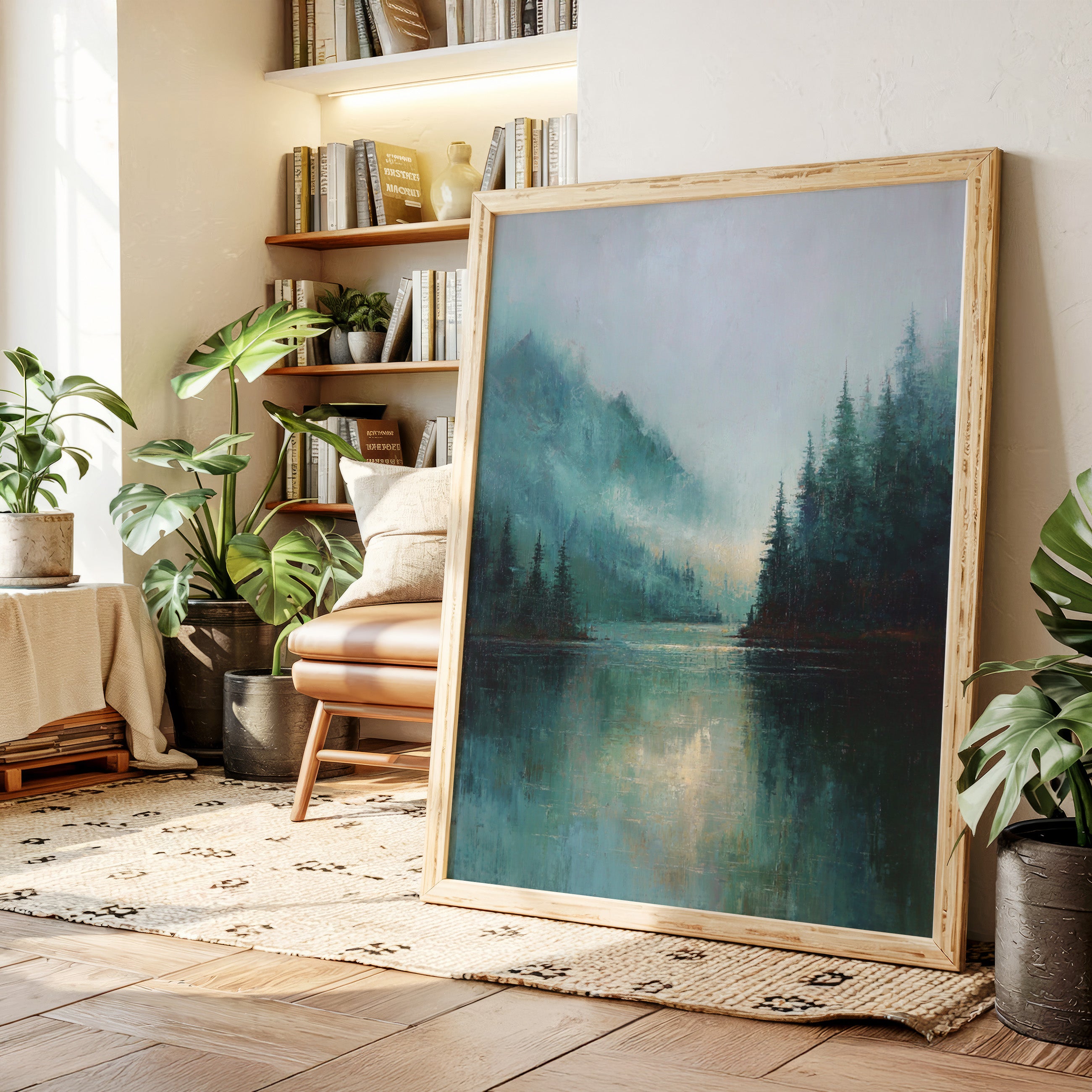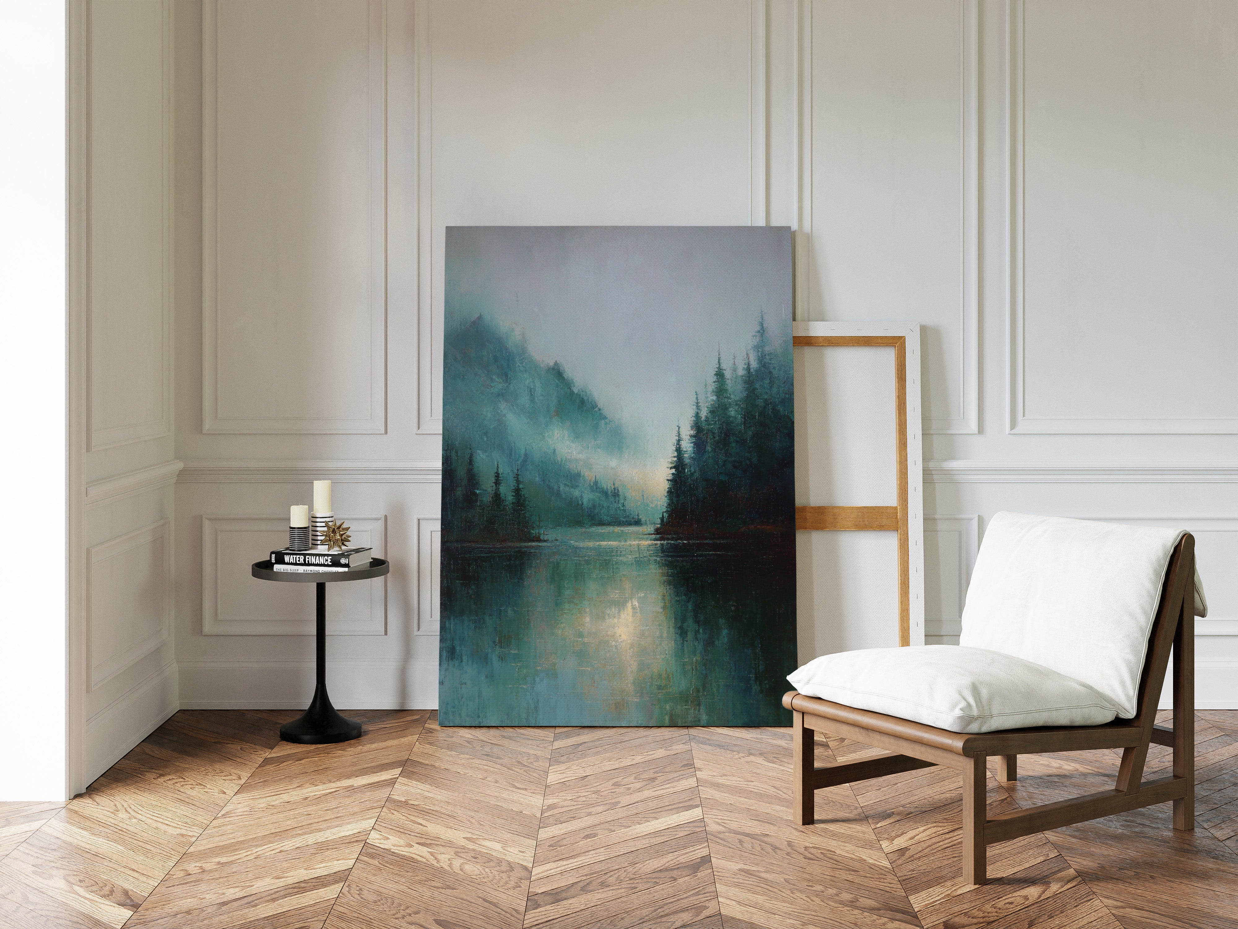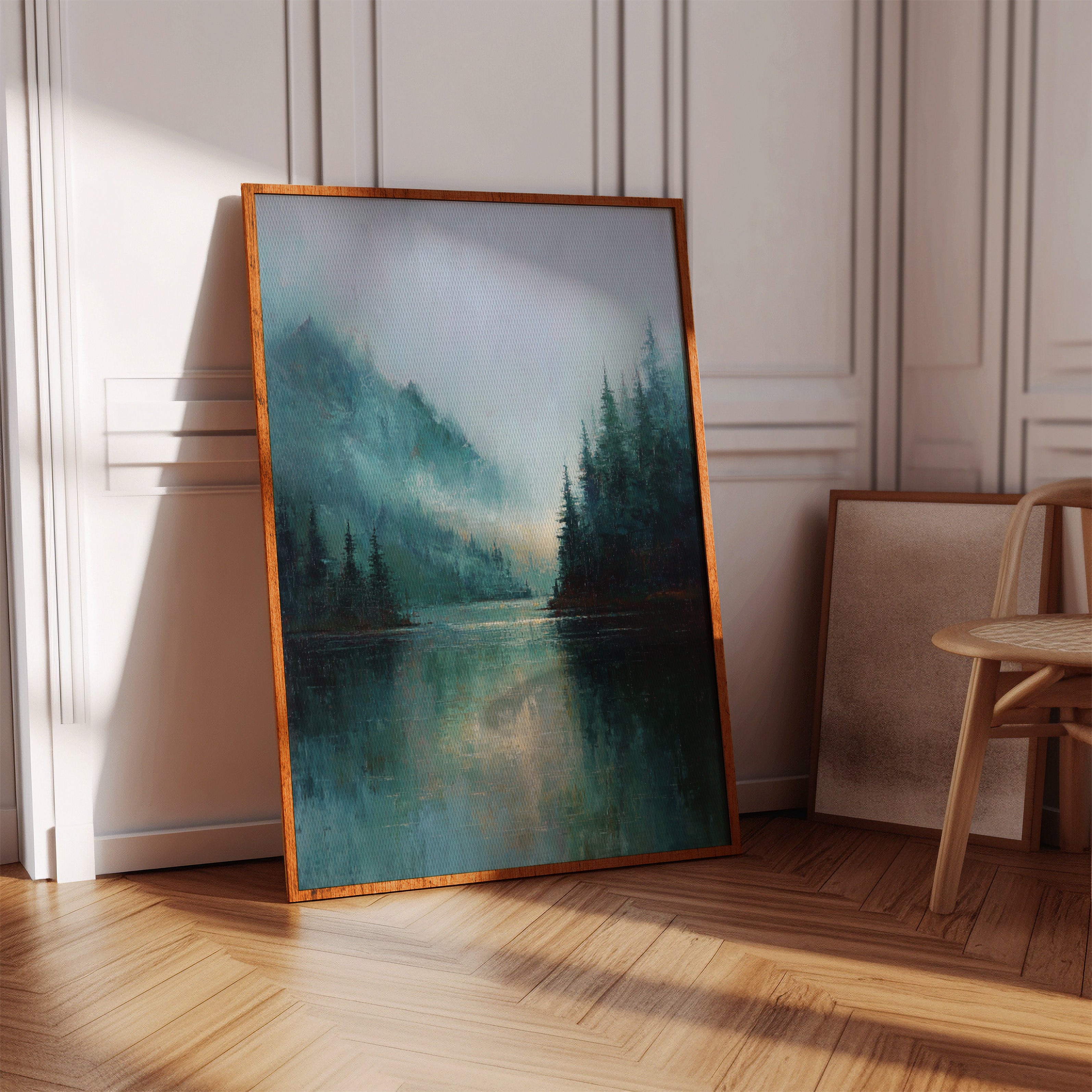 In the hushed embrace of dawn, a tranquil lake reflects the soft caress of mist and the gentle rise of the day. This piece captures the essence of the Artisanal collection, where nature's beauty is rendered with exquisite detail. The interplay of muted greens and blues conveys a sense of serenity, while the textured surfaces invite you to explore the hidden stories within the landscape. Perfect for a calming space, this artwork transforms any room into a sanctuary of peace and reflection.