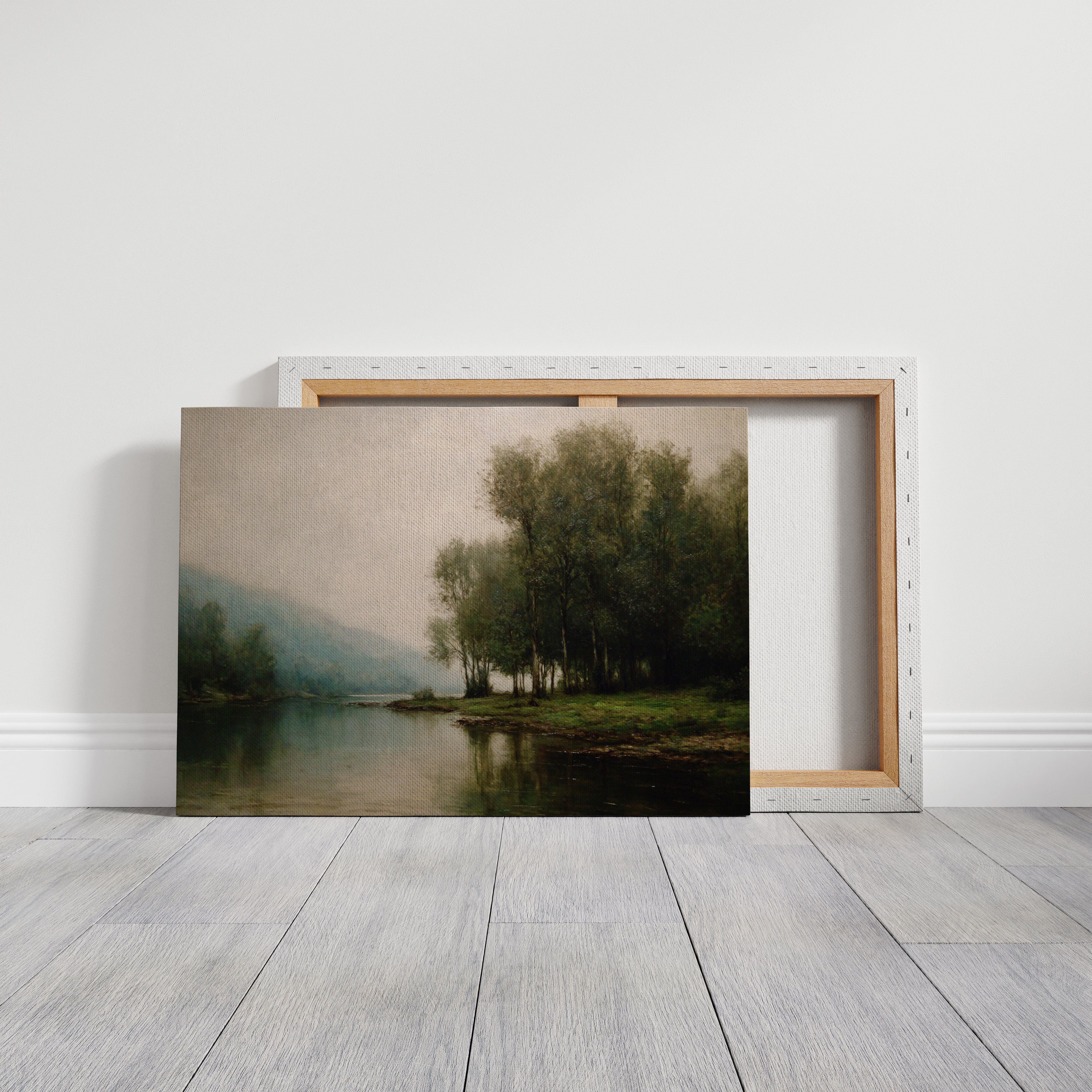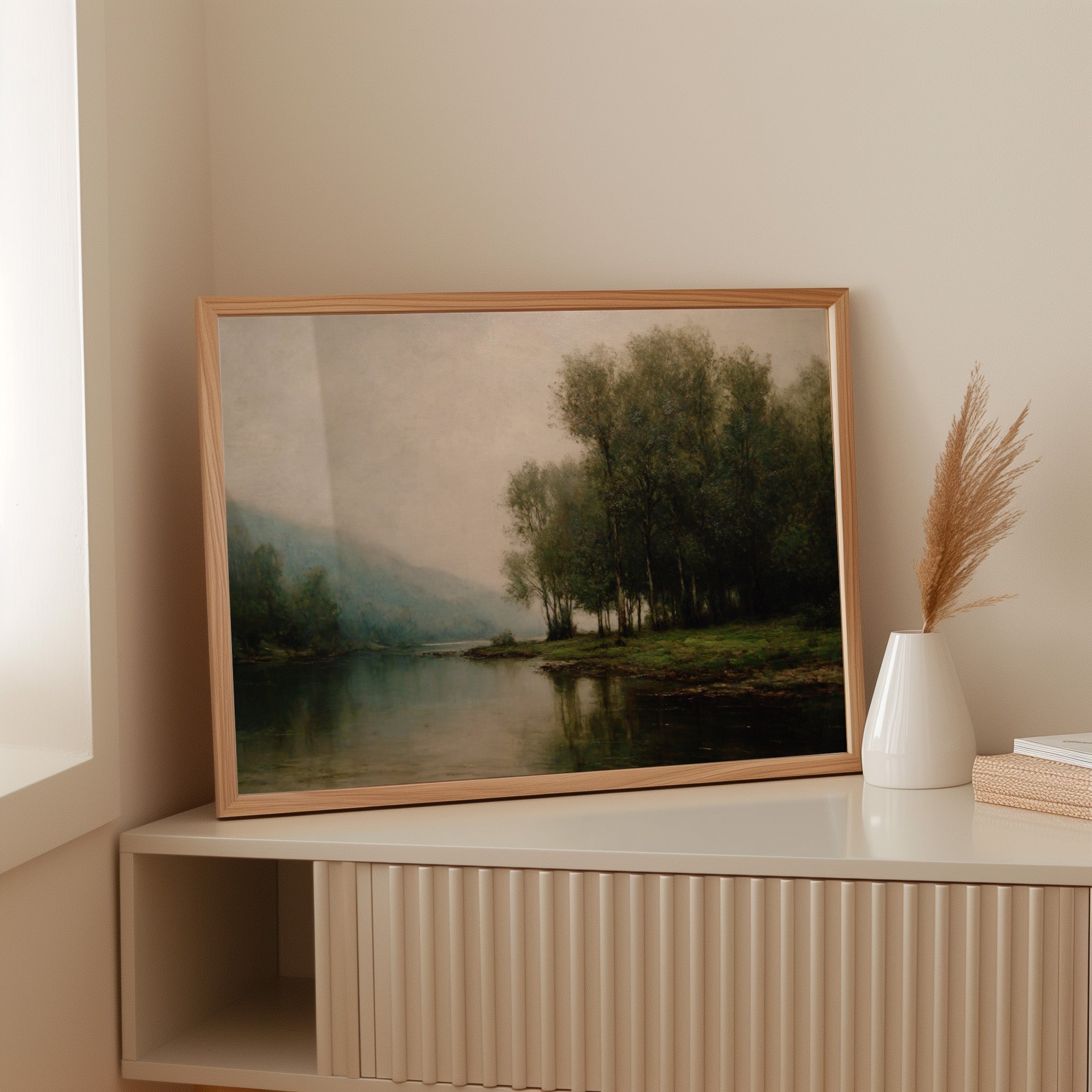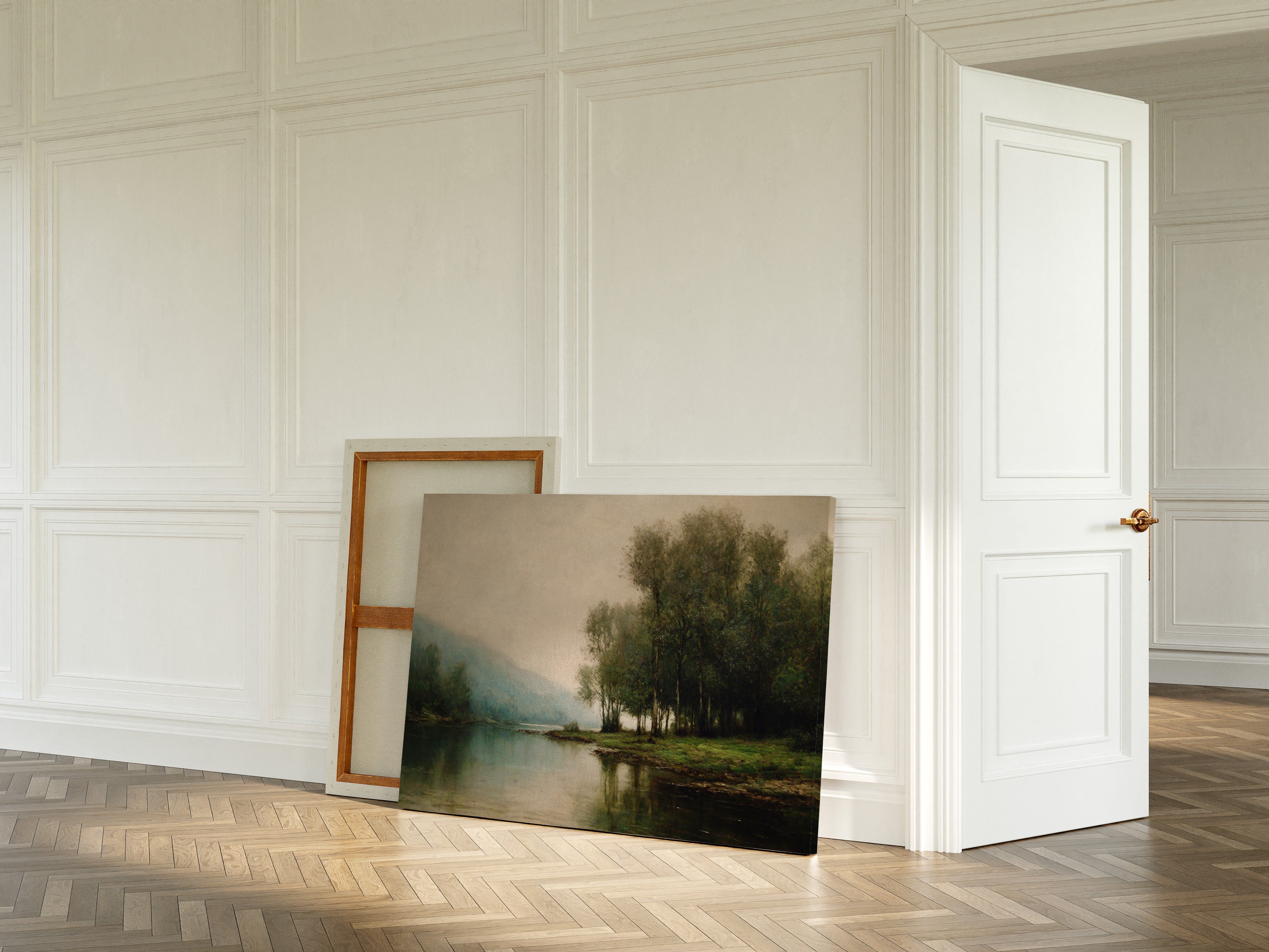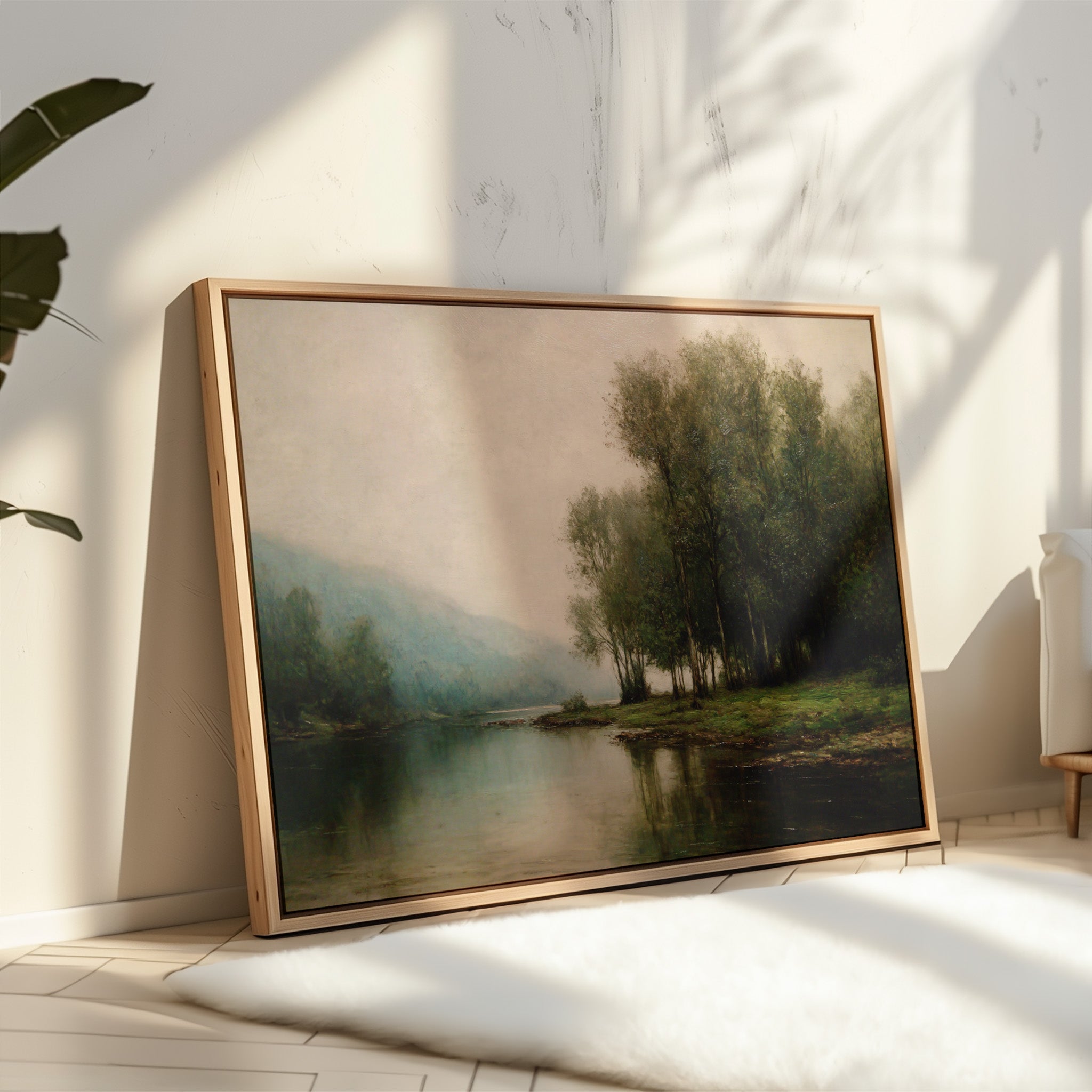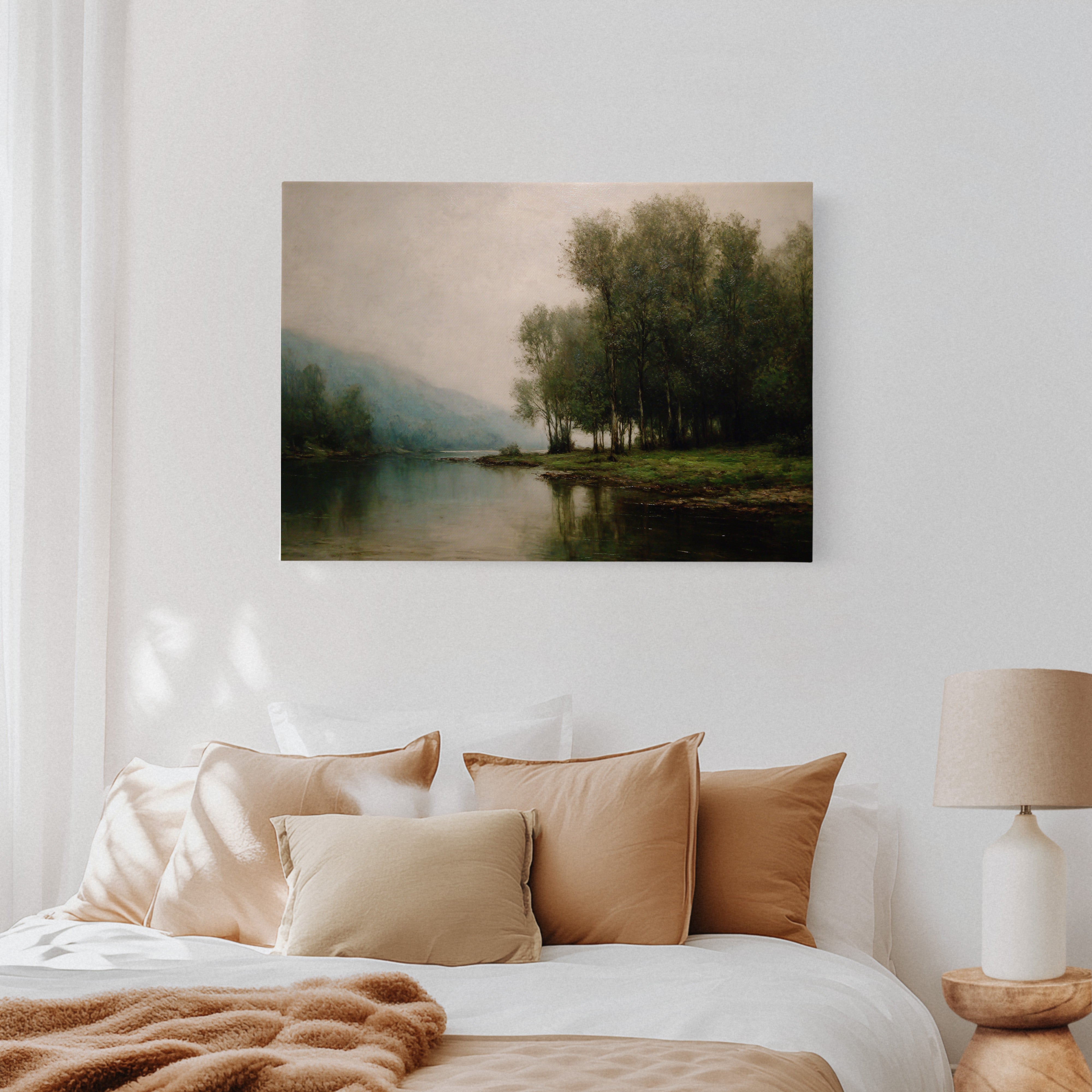 Dawn breaks quietly over still waters, where morning fog clings to the riverbank like a gentle memory. Tall trees stand sentinel along the shore, their delicate reflections creating perfect mirrors in the glassy surface below. The scene captures that liminal moment between night and day, when the world holds its breath in peaceful anticipation. Muted greens and blues blend with misty grays, while subtle touches of morning light illuminate the distant hills. This tranquil landscape brings a sense of serenity and contemplation to any space, perfect for creating a peaceful sanctuary in a master bedroom or meditation room.