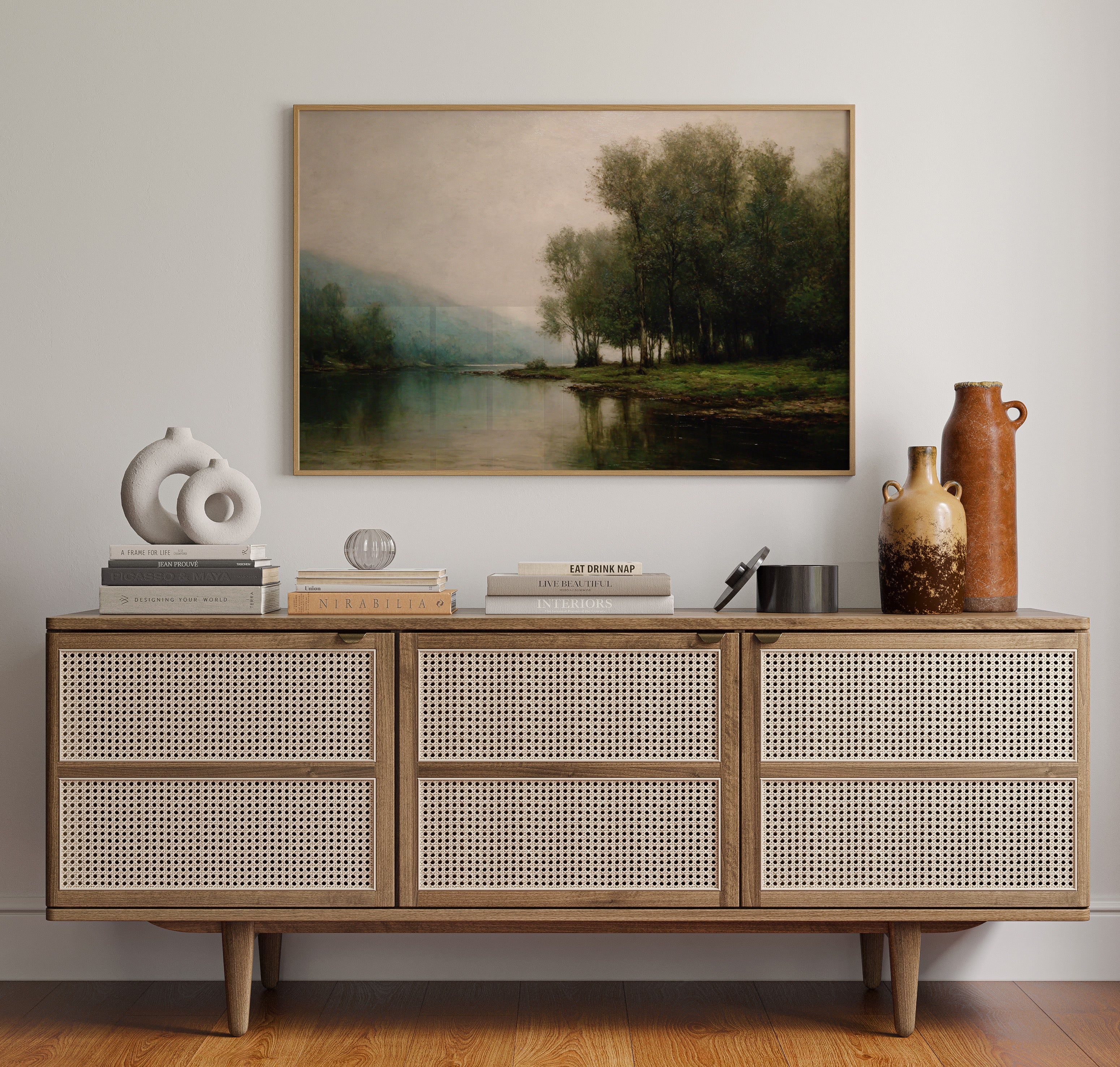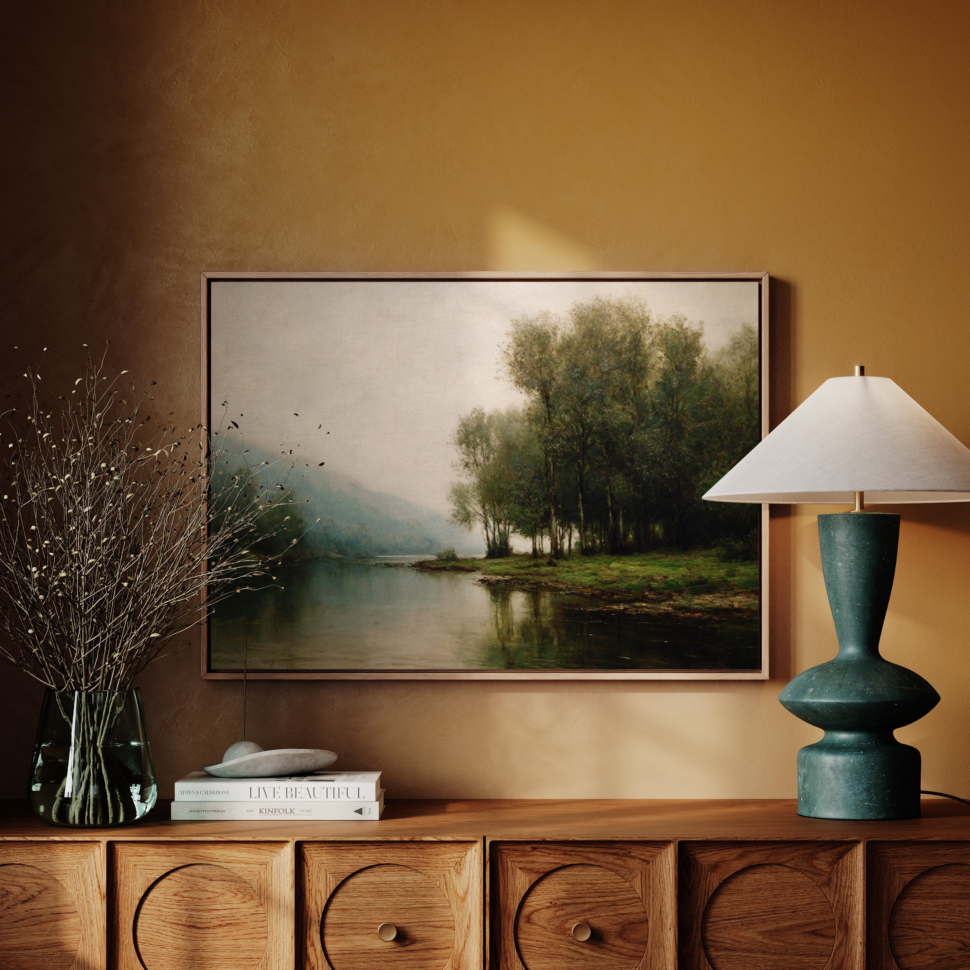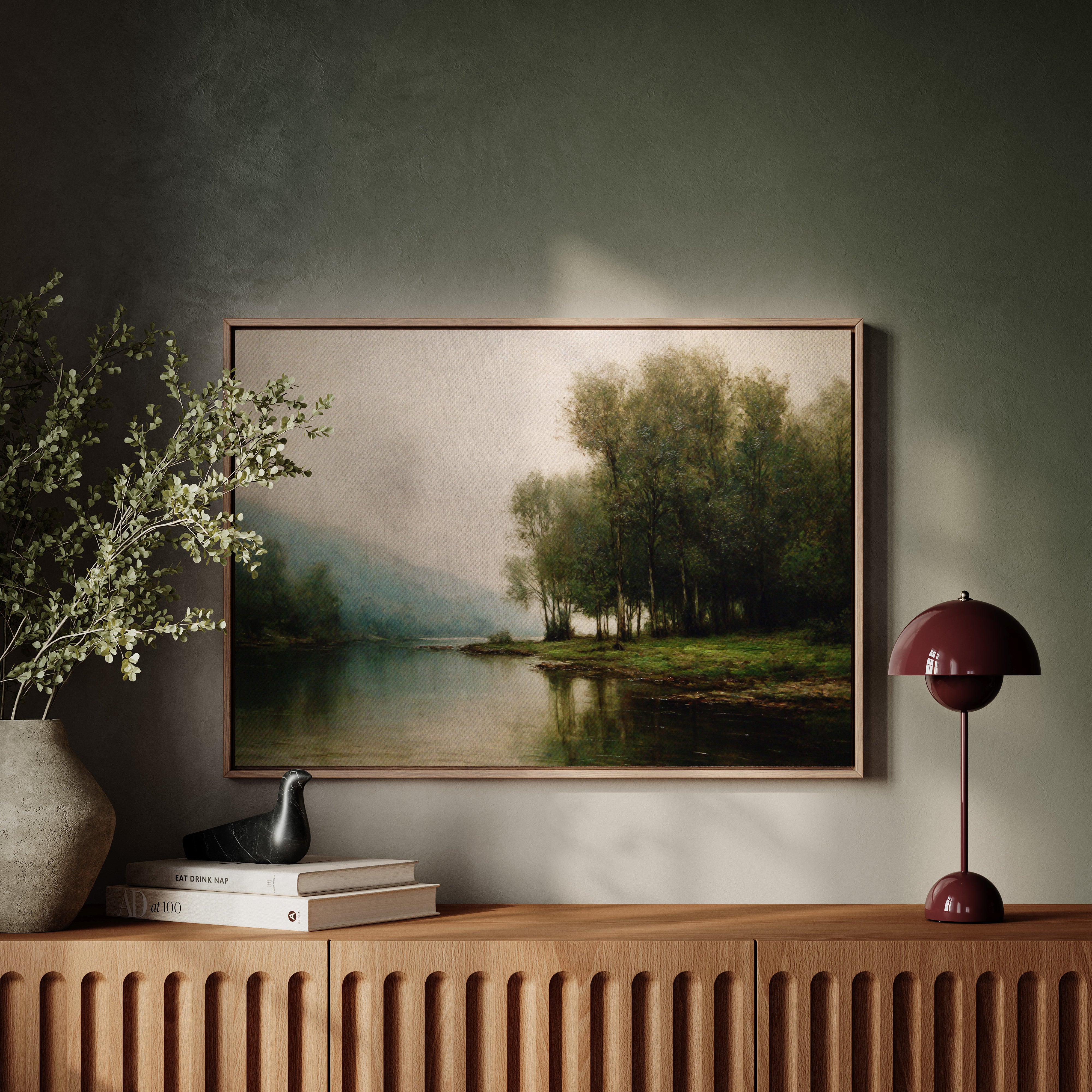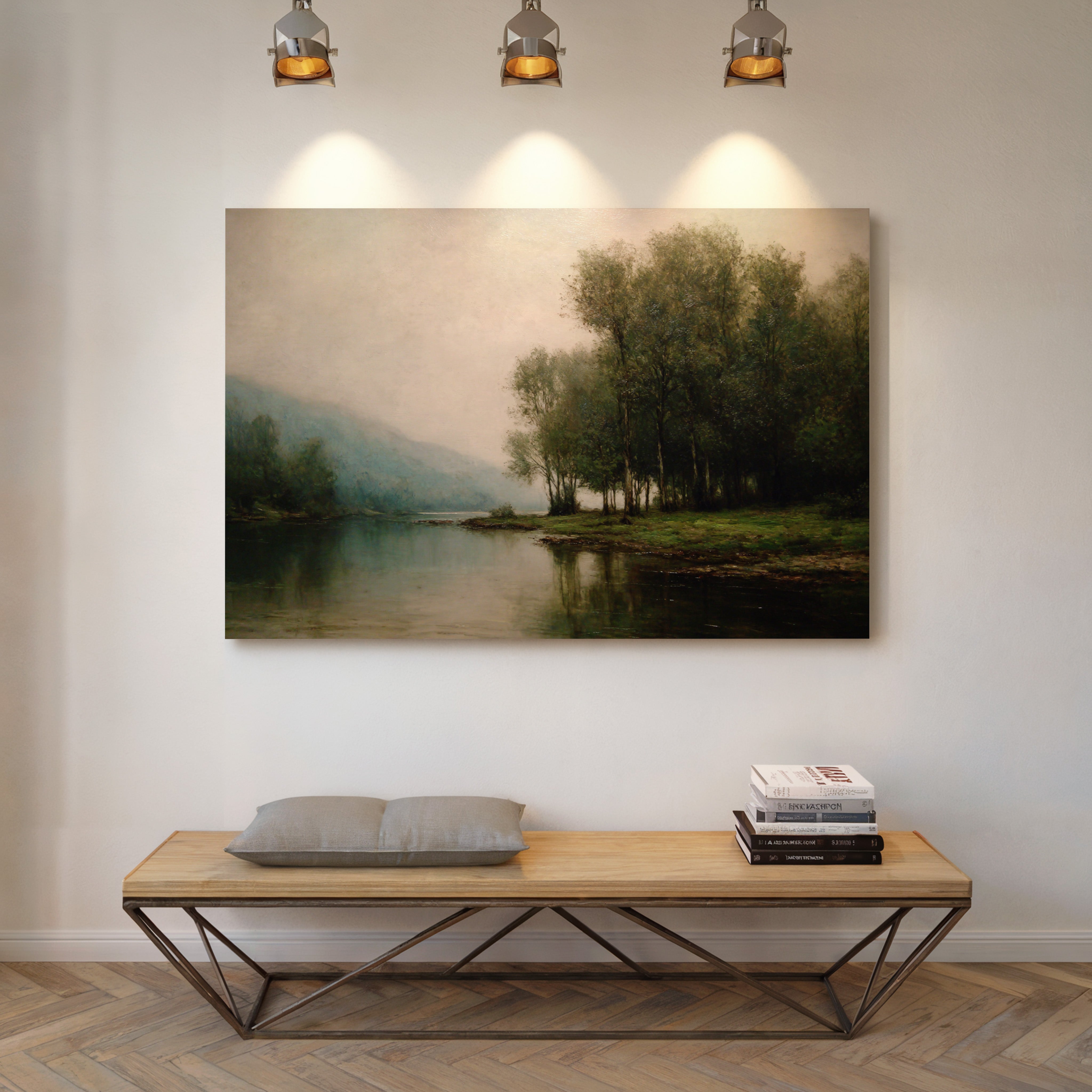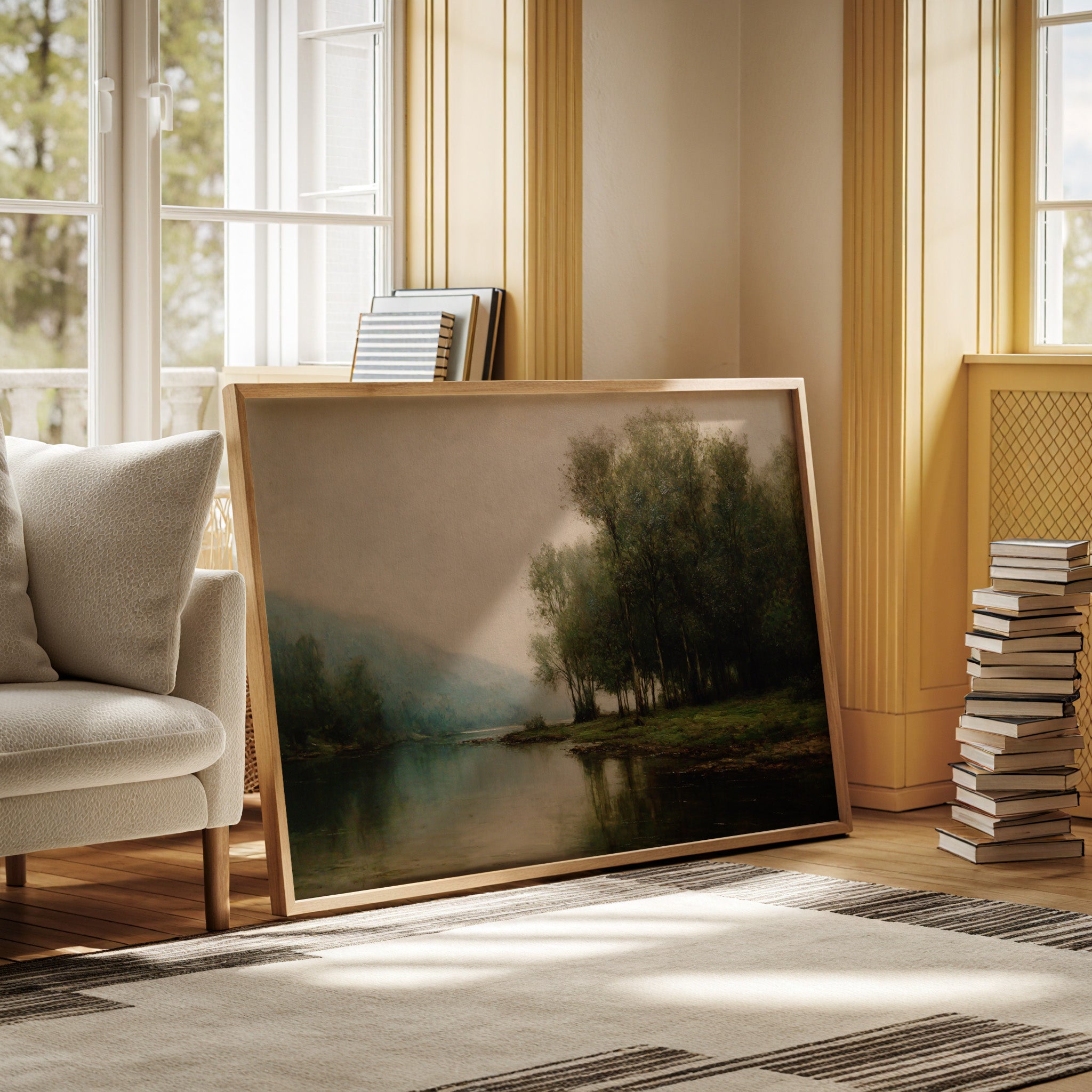 Dawn breaks quietly over still waters, where morning fog clings to the riverbank like a gentle memory. Tall trees stand sentinel along the shore, their delicate reflections creating perfect mirrors in the glassy surface below. The scene captures that liminal moment between night and day, when the world holds its breath in peaceful anticipation. Muted greens and blues blend with misty grays, while subtle touches of morning light illuminate the distant hills. This tranquil landscape brings a sense of serenity and contemplation to any space, perfect for creating a peaceful sanctuary in a master bedroom or meditation room.