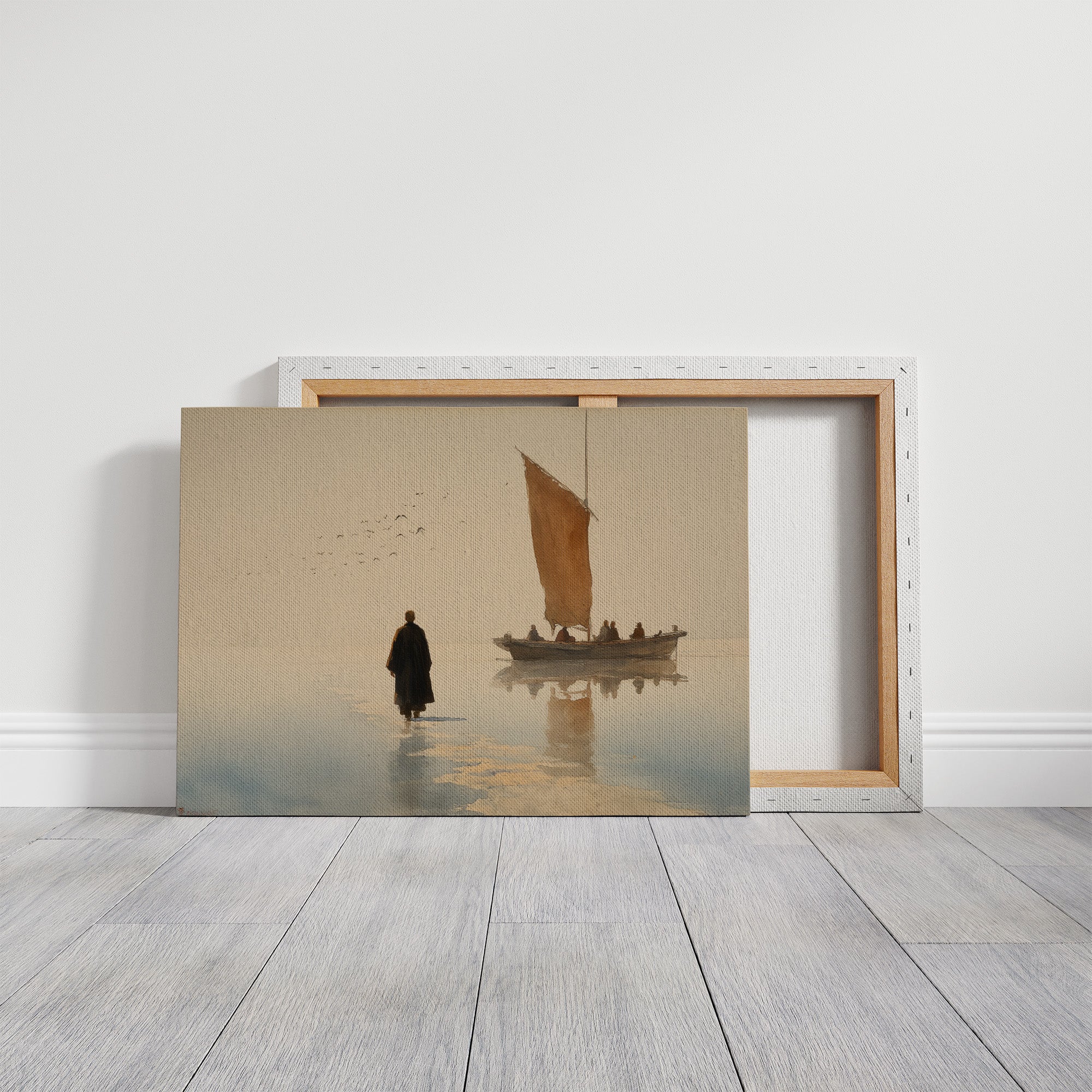 A contemplative watercolor painting capturing a solitary figure standing in shallow waters, watching a sailboat with an amber sail glide away. The scene is bathed in a hazy, ethereal light, creating a dreamlike quality. Soft mist envelops the horizon where birds fly in formation across the pale sky. The still water reflects golden light, creating a path between the shore-bound observer and the departing vessel. The minimalist composition and muted palette evoke feelings of longing, separation, and the quiet beauty of dawn or dusk at sea.