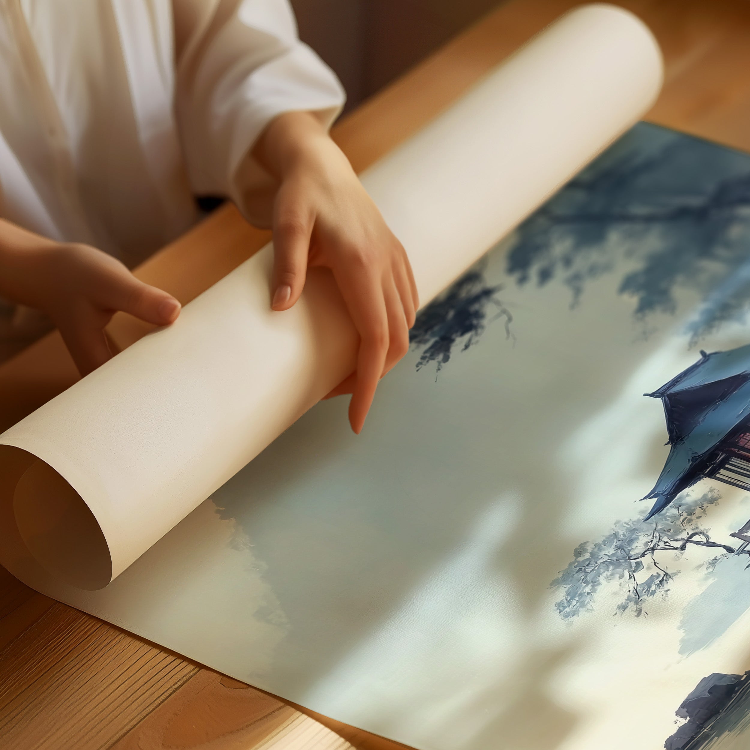 A solitary teahouse emerges from the morning mist, its wooden frame delicately balanced above tranquil waters. The scene captures the essence of traditional Asian architecture, where curved rooflines mirror the graceful boughs of surrounding trees against towering mountain silhouettes. Cool blues and subtle grays blend seamlessly, creating a meditation on solitude and stillness, while scattered rocks break the lake's glassy surface like ancient stepping stones through time. This contemplative piece brings serenity to any space, ideal for creating a calm focal point in a meditation room or adding zen-like tranquility to a minimalist living area.