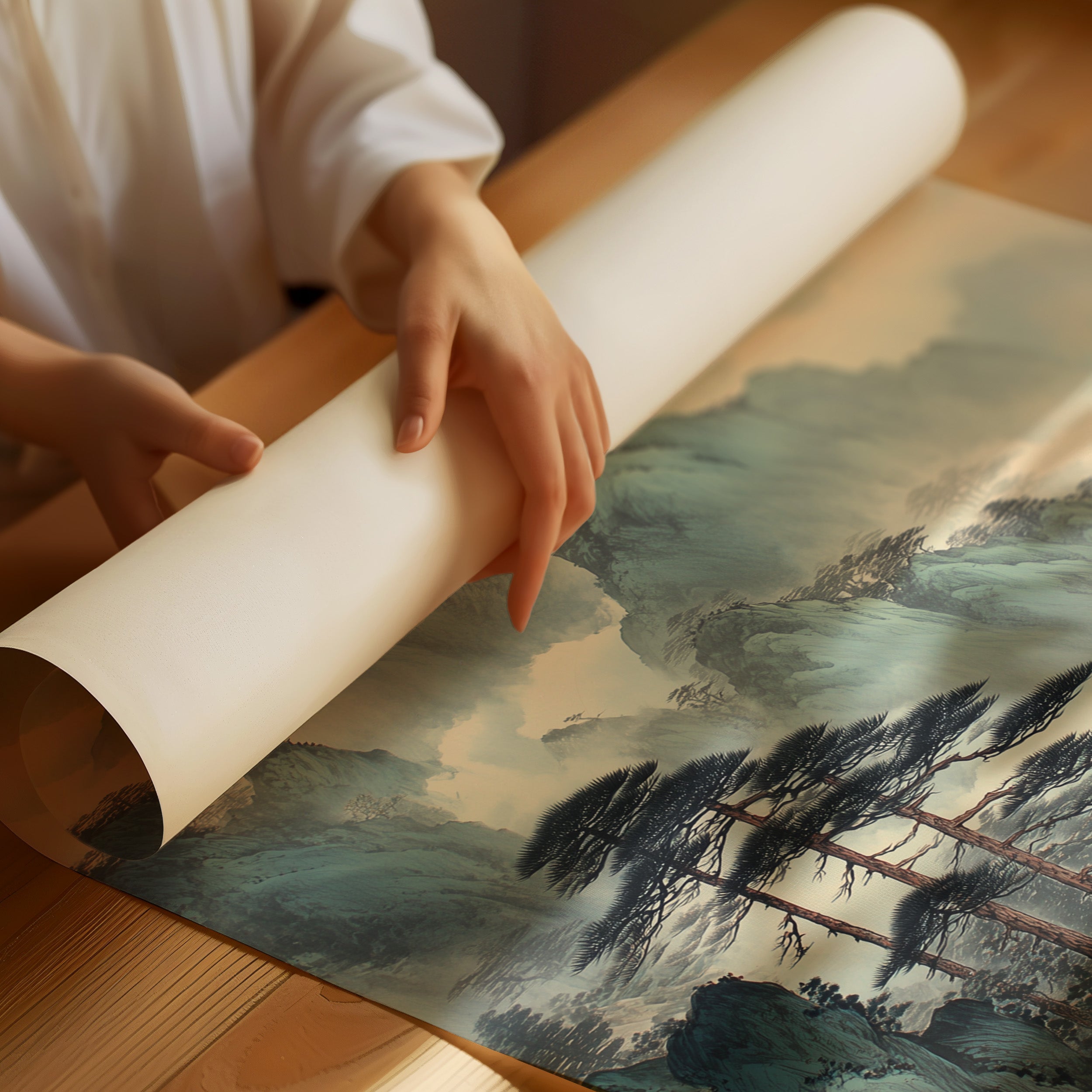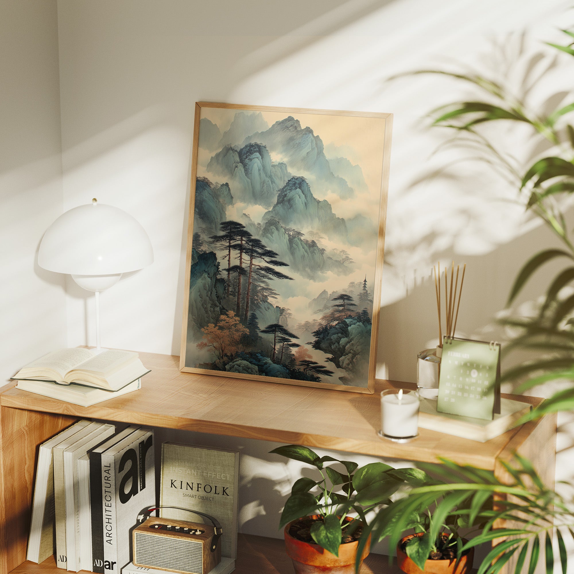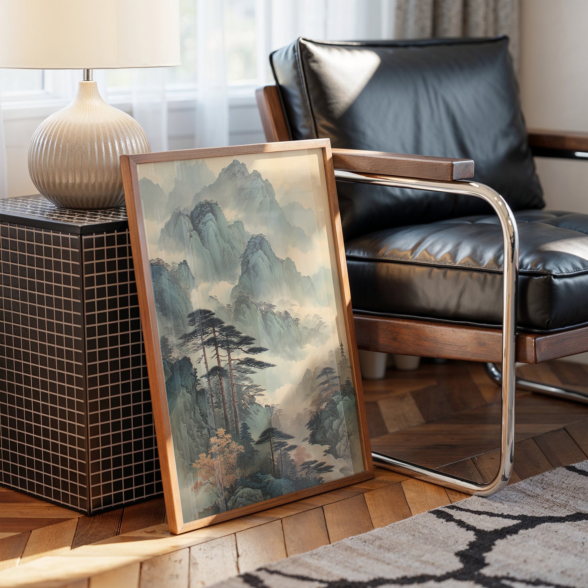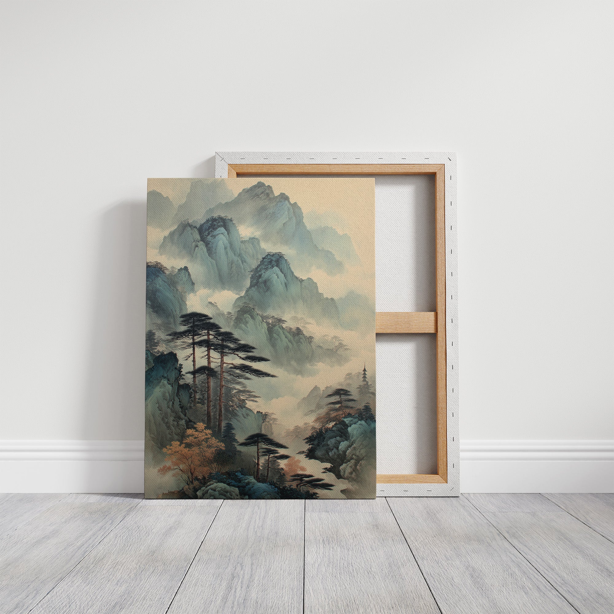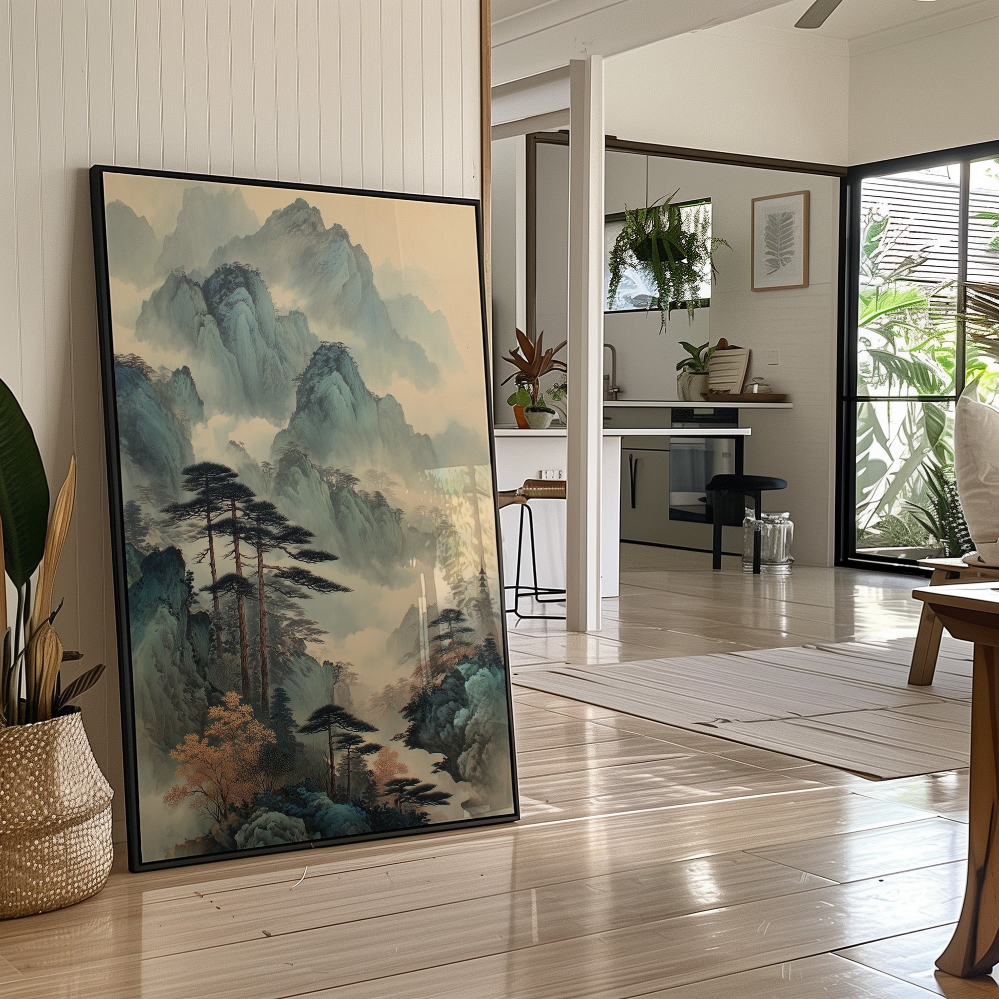 Morning light filters through ethereal mountain mists, where ancient pines stand sentinel against jade peaks. The traditional Asian landscape painting captures the delicate balance between strength and serenity, with teal mountains rising through golden clouds and dark silhouettes of weathered trees clinging to rocky cliffs. This peaceful scene invites contemplation of nature's timeless grace, rendered in soft watercolors that blend reality with artistic interpretation. This piece would create a serene focal point in a meditation room or bring tranquil energy to a minimalist living space, especially when paired with natural materials and gentle lighting.