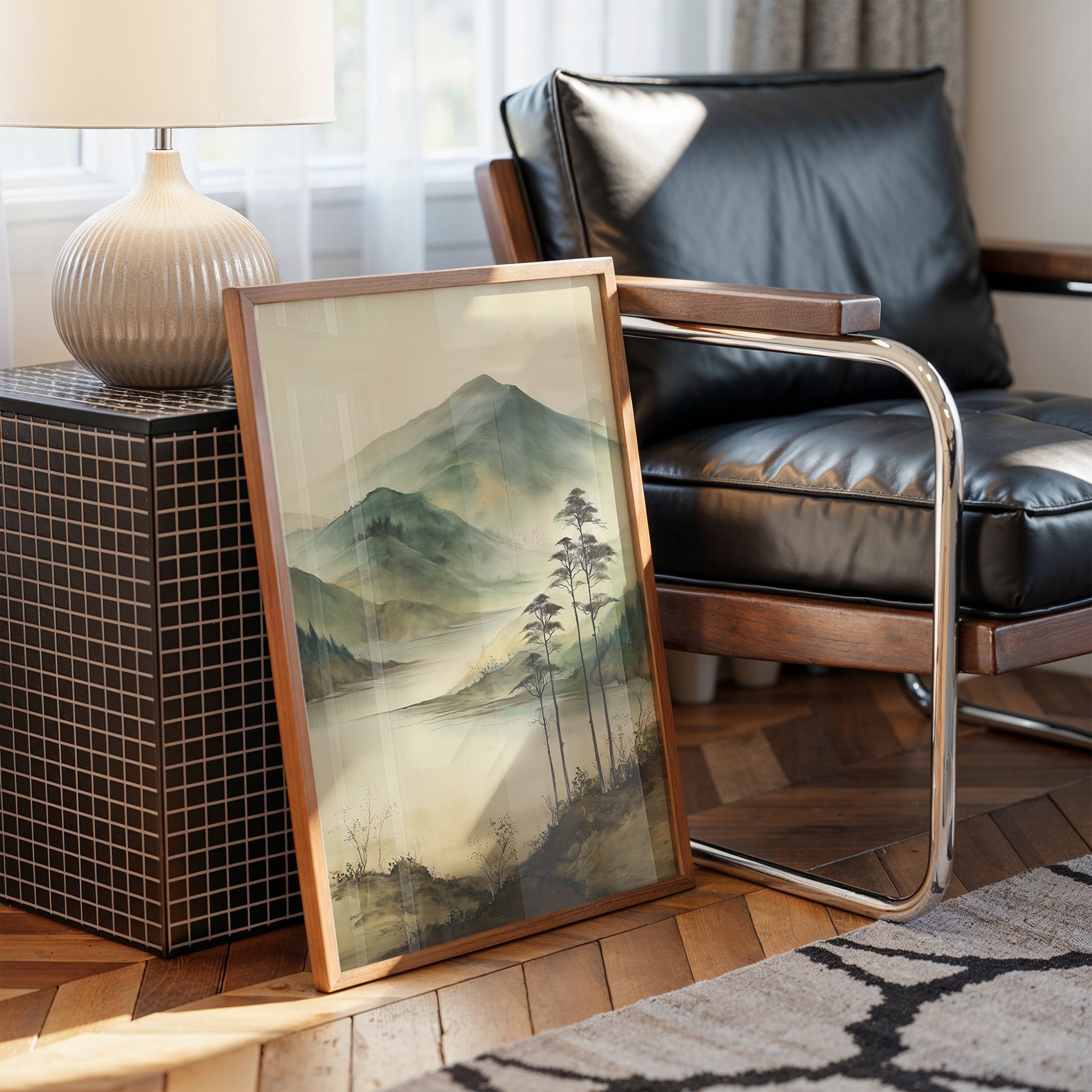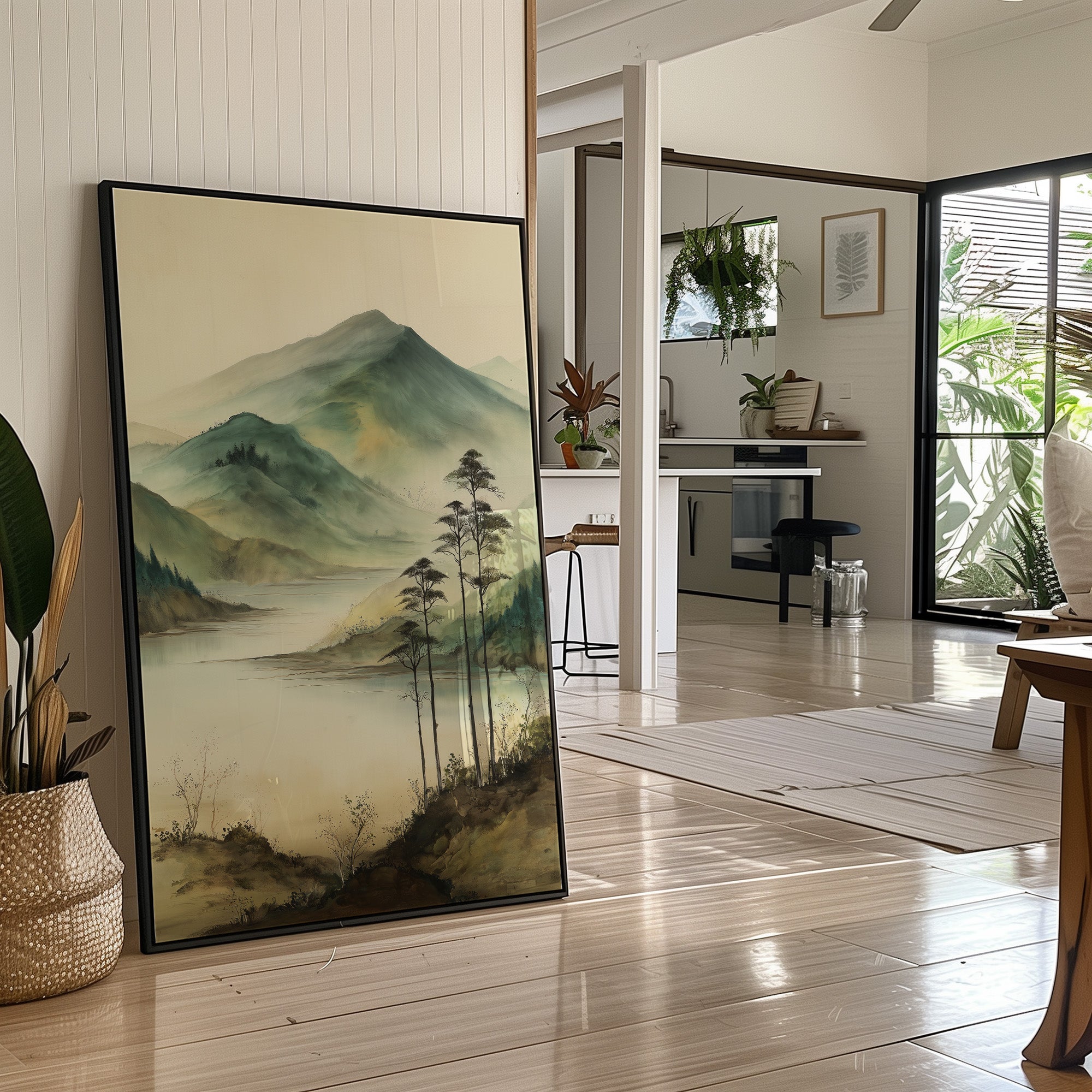 Sunlight streams through industrial windows, casting warm rays across a thoughtfully curated bar cart and an ethereal Asian-inspired landscape painting. The serene mountain scene creates a captivating contrast against the exposed brick and modern spirits collection below. Rich wooden floors, lush houseplants, and the sophisticated array of glassware blend urban sophistication with natural elements, offering a perfect balance of style and function. This space would elevate any modern apartment, loft, or home bar area, creating an inviting conversation corner that pairs metropolitan charm with tranquil artistry.