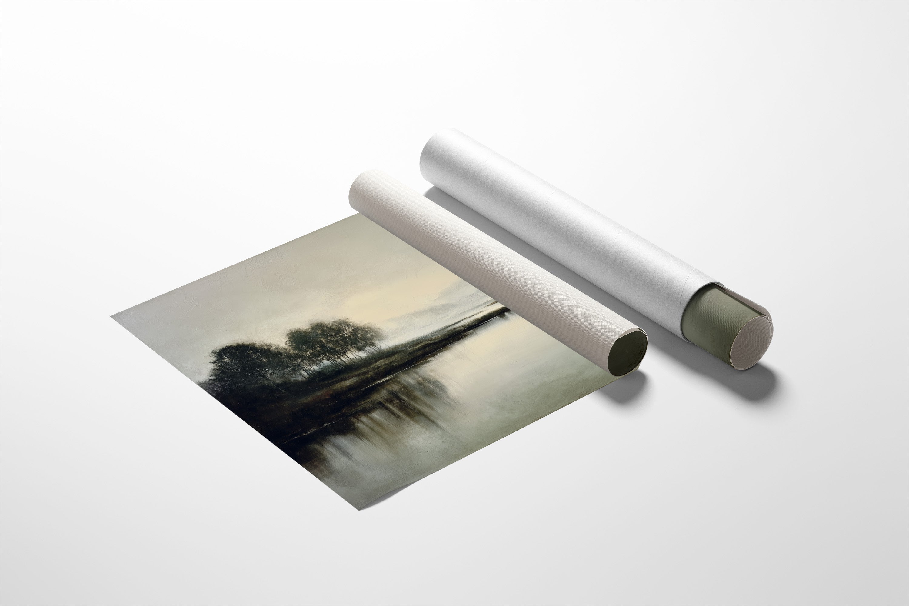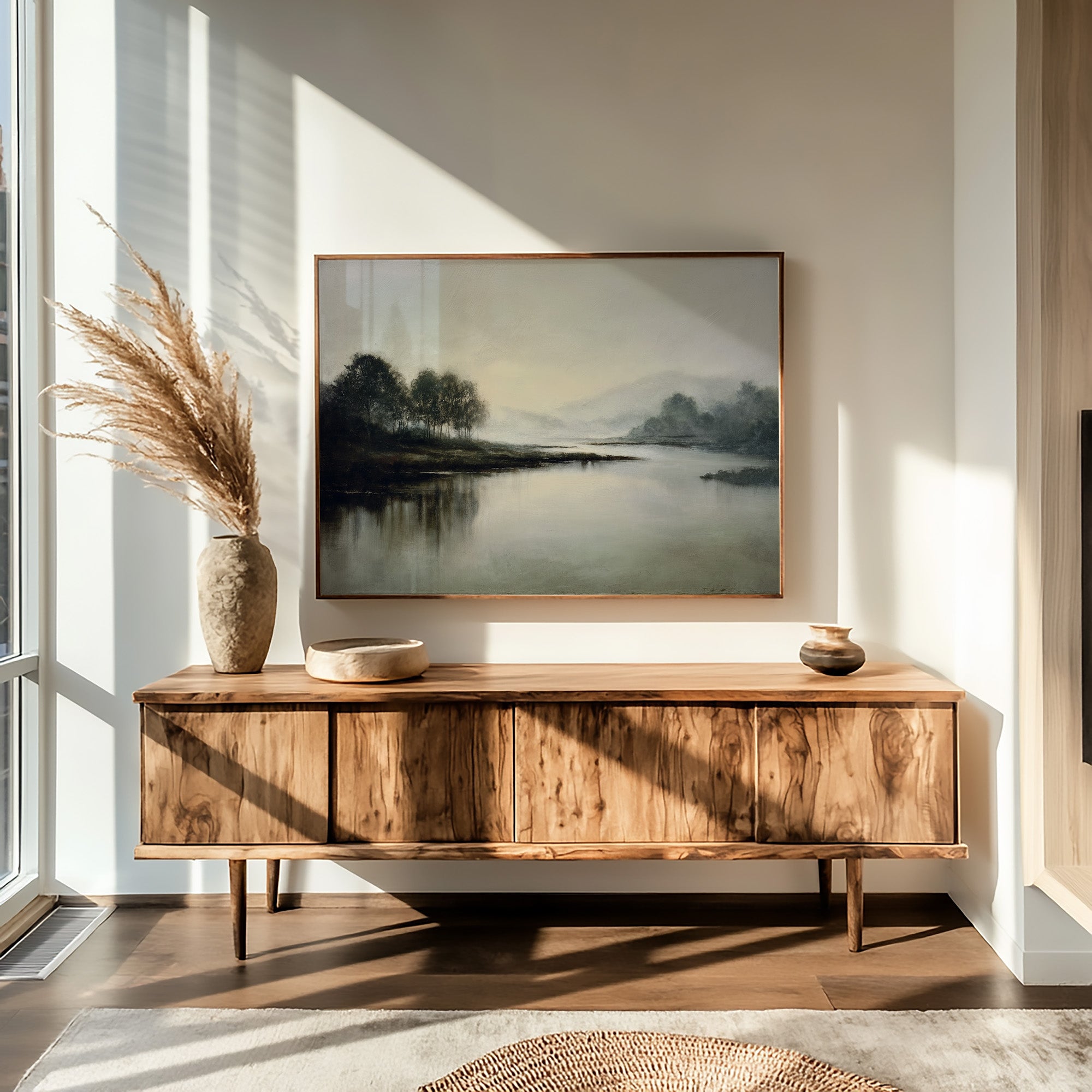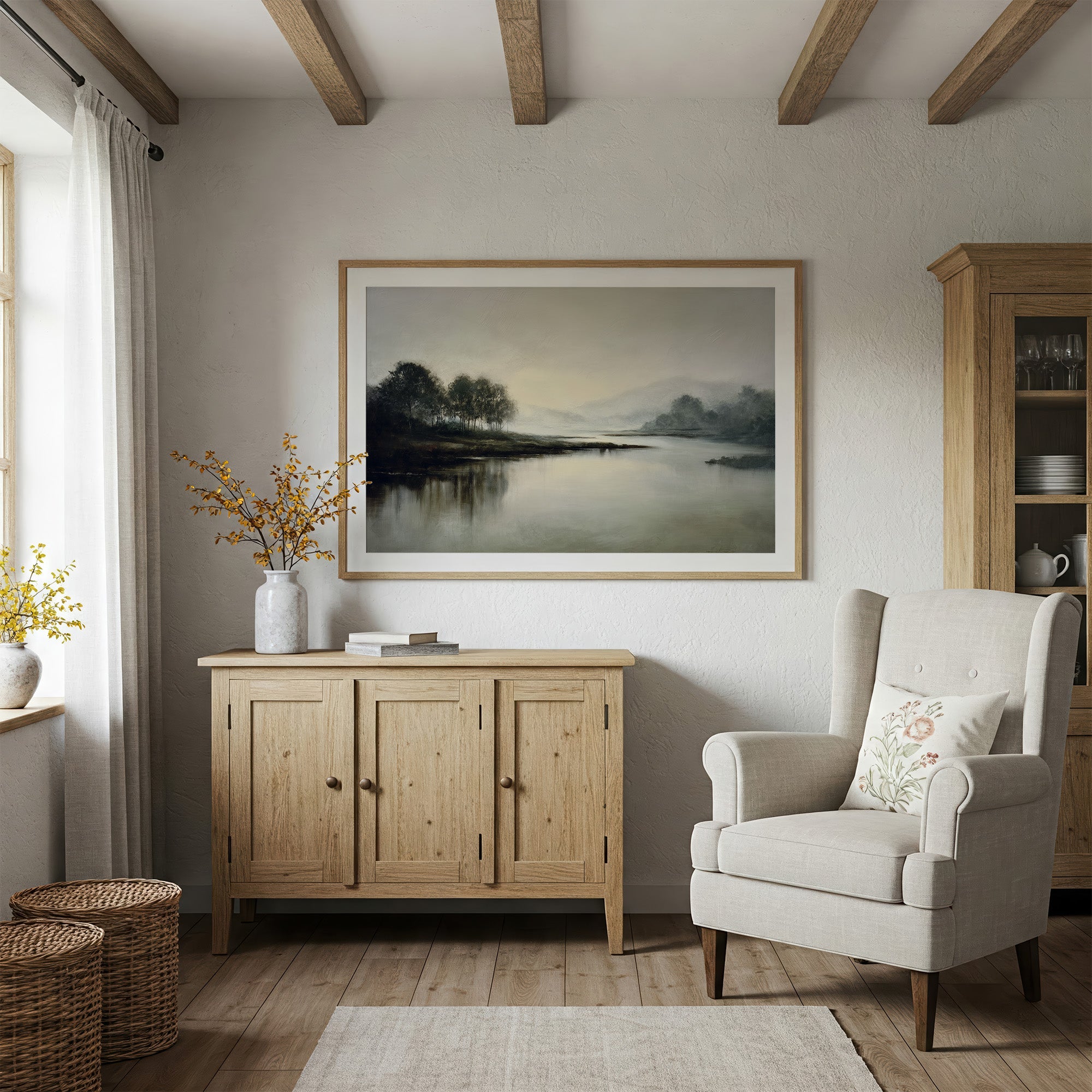 Morning fog hovers over still waters, creating a serene dialogue between reflection and reality. The monochromatic landscape painting captures the quiet dignity of nature with its soft gradients of gray and blue, trees standing sentinel along the shoreline as distant mountains dissolve into haze. Nestled among cherished books and complemented by dried pampas grass, this tranquil scene transforms a reading nook into a contemplative retreat.