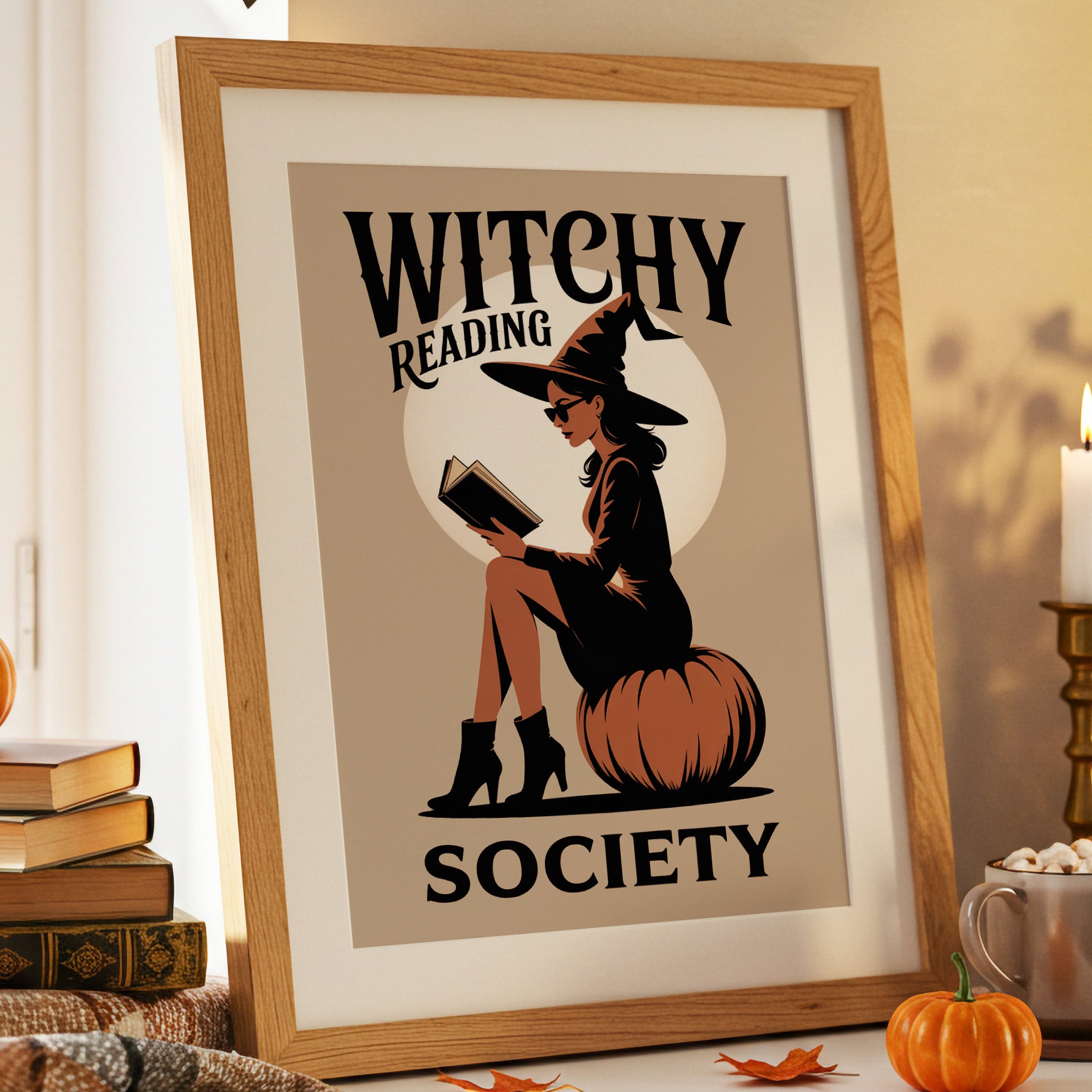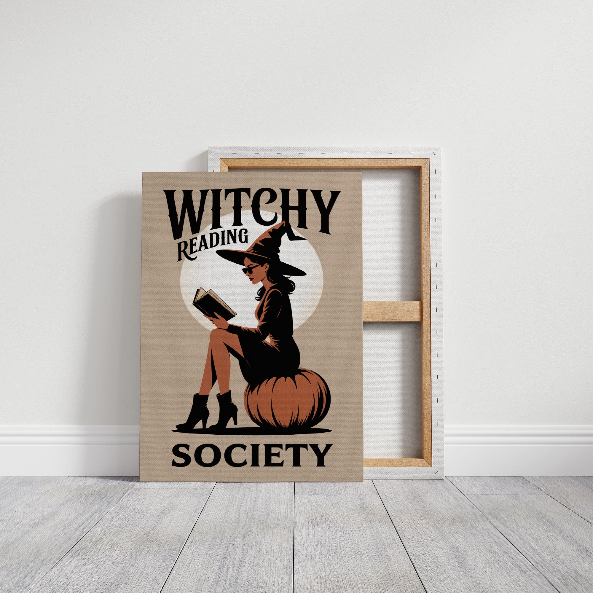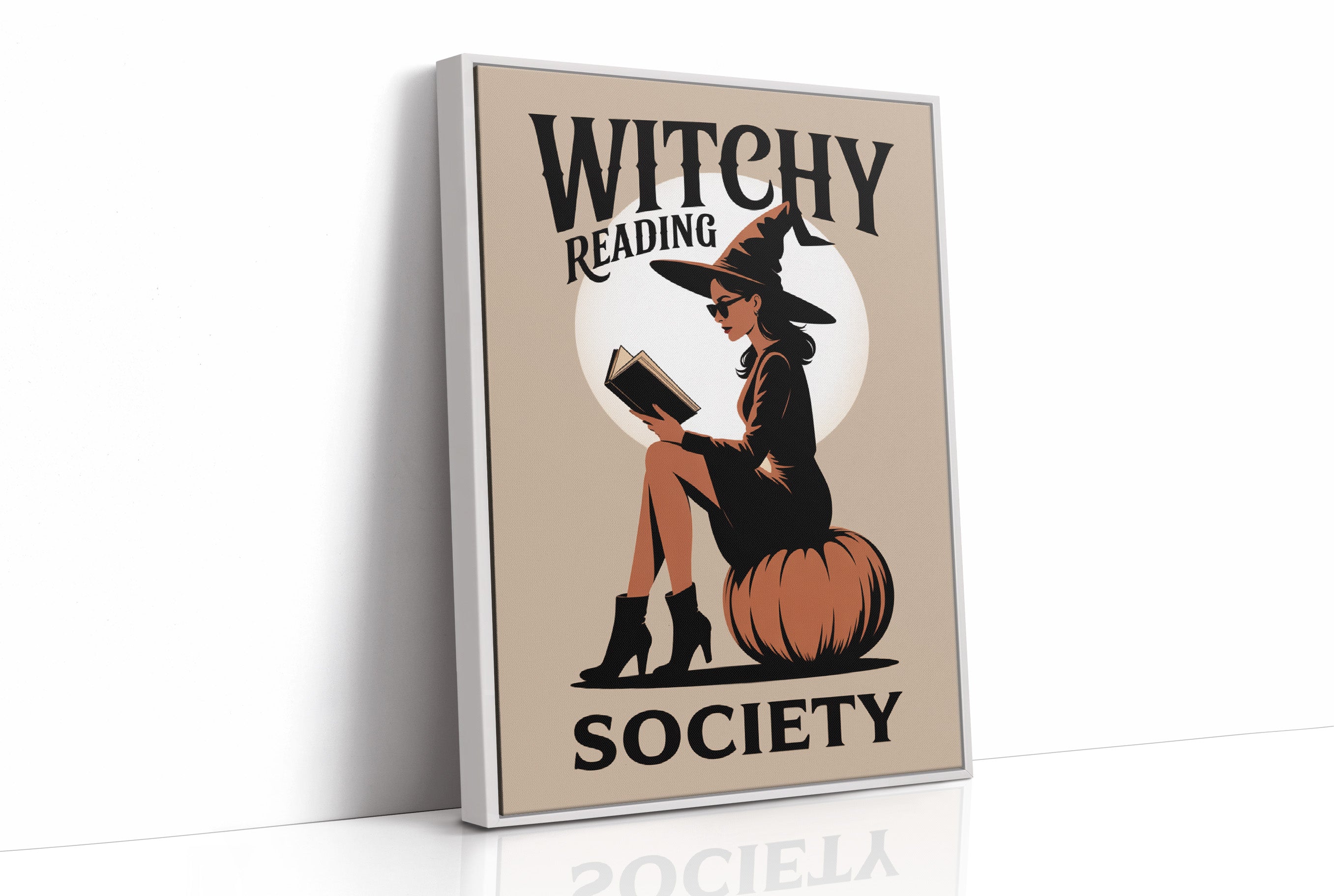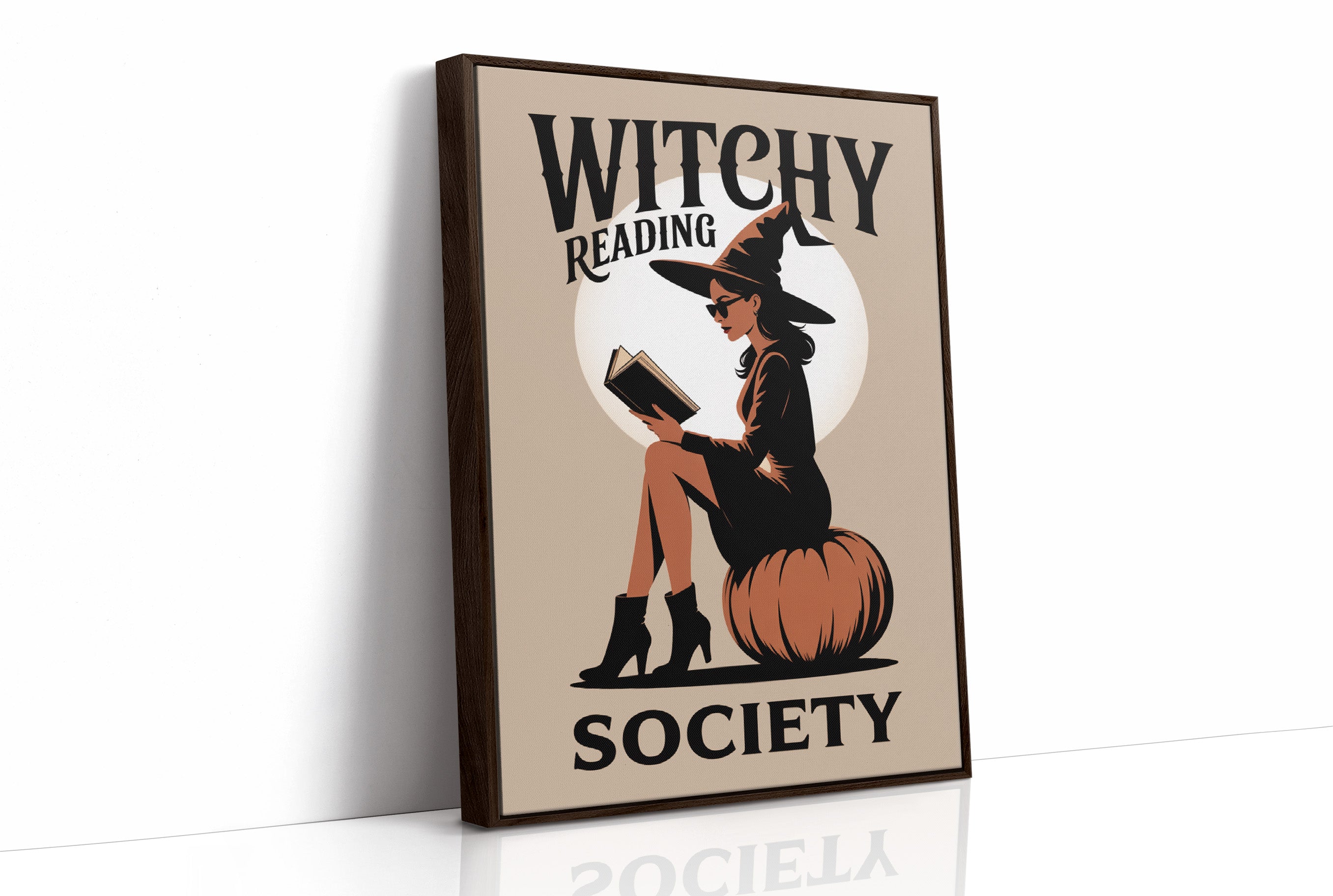 A stylish witch sits perched atop a plump pumpkin, lost in the pages of her book. The warm beige backdrop frames her silhouette against a perfect full moon, creating a contemporary take on classic Halloween imagery. Bold typography and a minimalist color palette of black, orange, and cream give this illustration a chic, retro-modern aesthetic that balances whimsy with sophistication. This piece brings bookish enchantment to any reading nook, home library, or cozy corner where literary magic is celebrated.