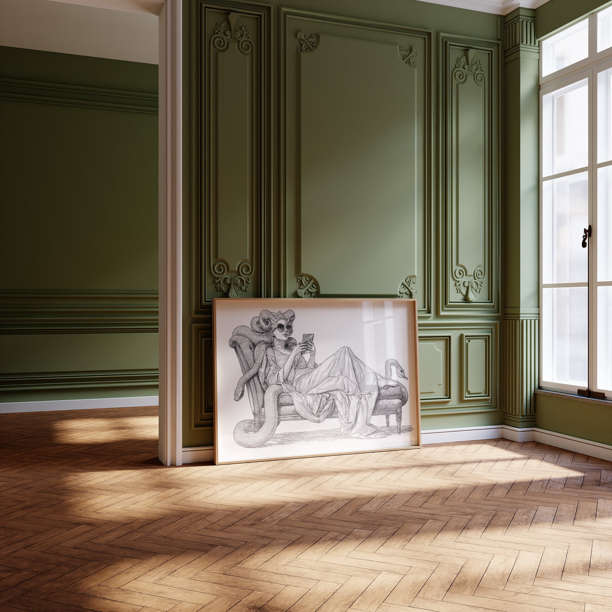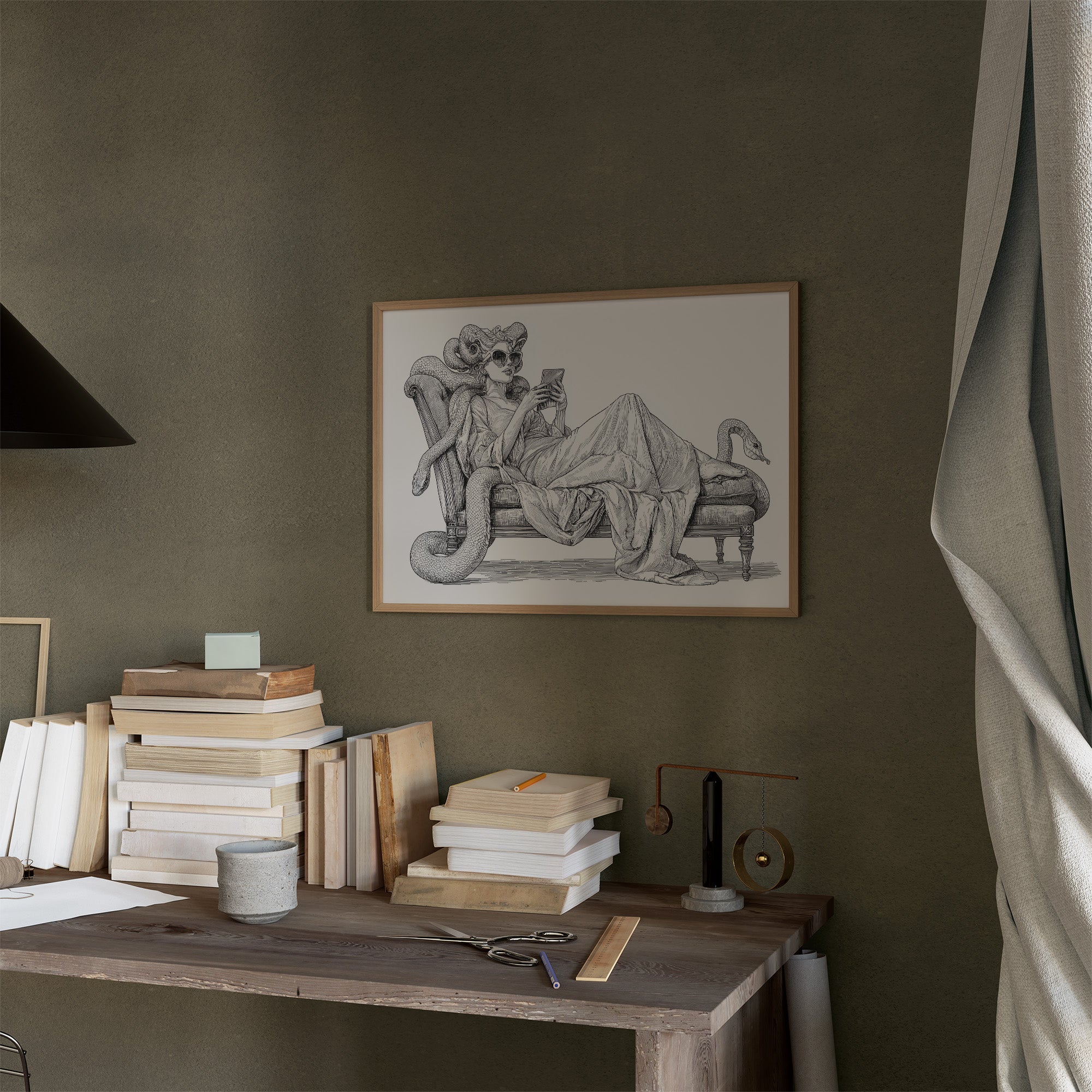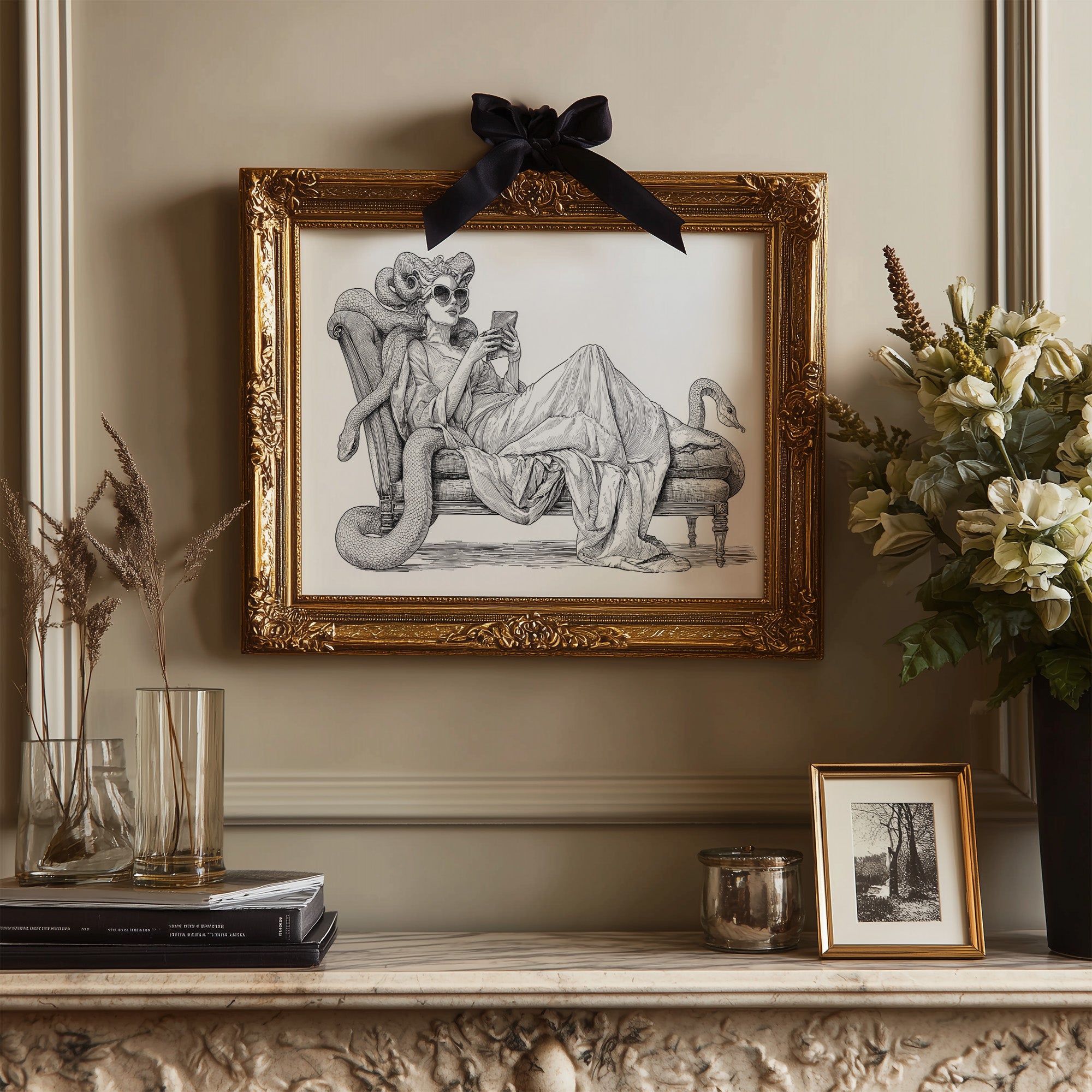 Quiet elegance meets mythological subversion in this striking pencil illustration. A contemporary figure lounges on a chaise, absorbed in a smartphone while serpents coil around her form, creating a captivating tension between ancient symbolism and modern indifference. The detailed linework captures flowing fabric and sinuous snake forms with remarkable precision, all rendered in sophisticated monochrome that emphasizes the drawing's dramatic contrasts and meticulous shading. This piece would make a compelling focal point in a study, reading nook, or any thoughtful space that celebrates literary and classical references with a contemporary twist.