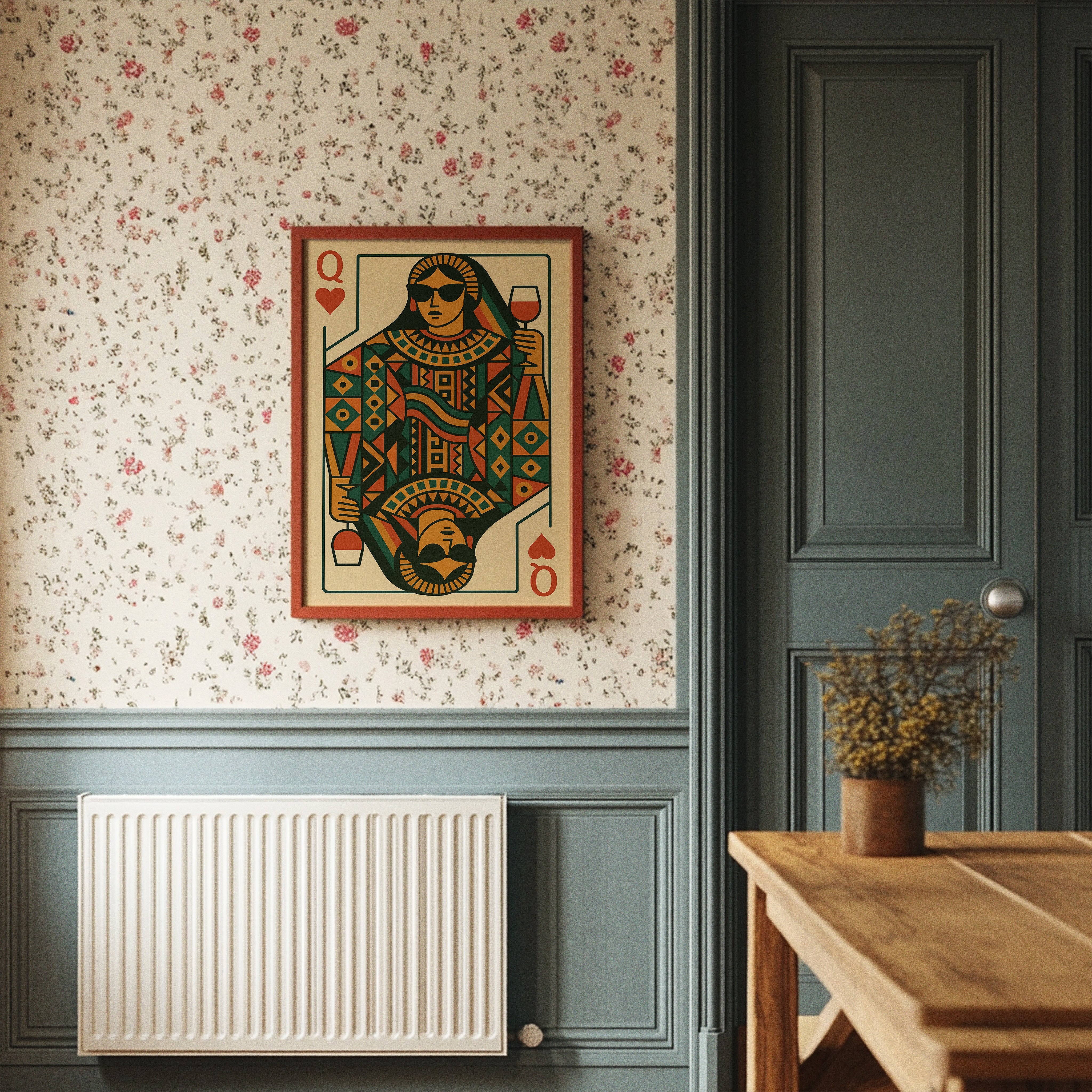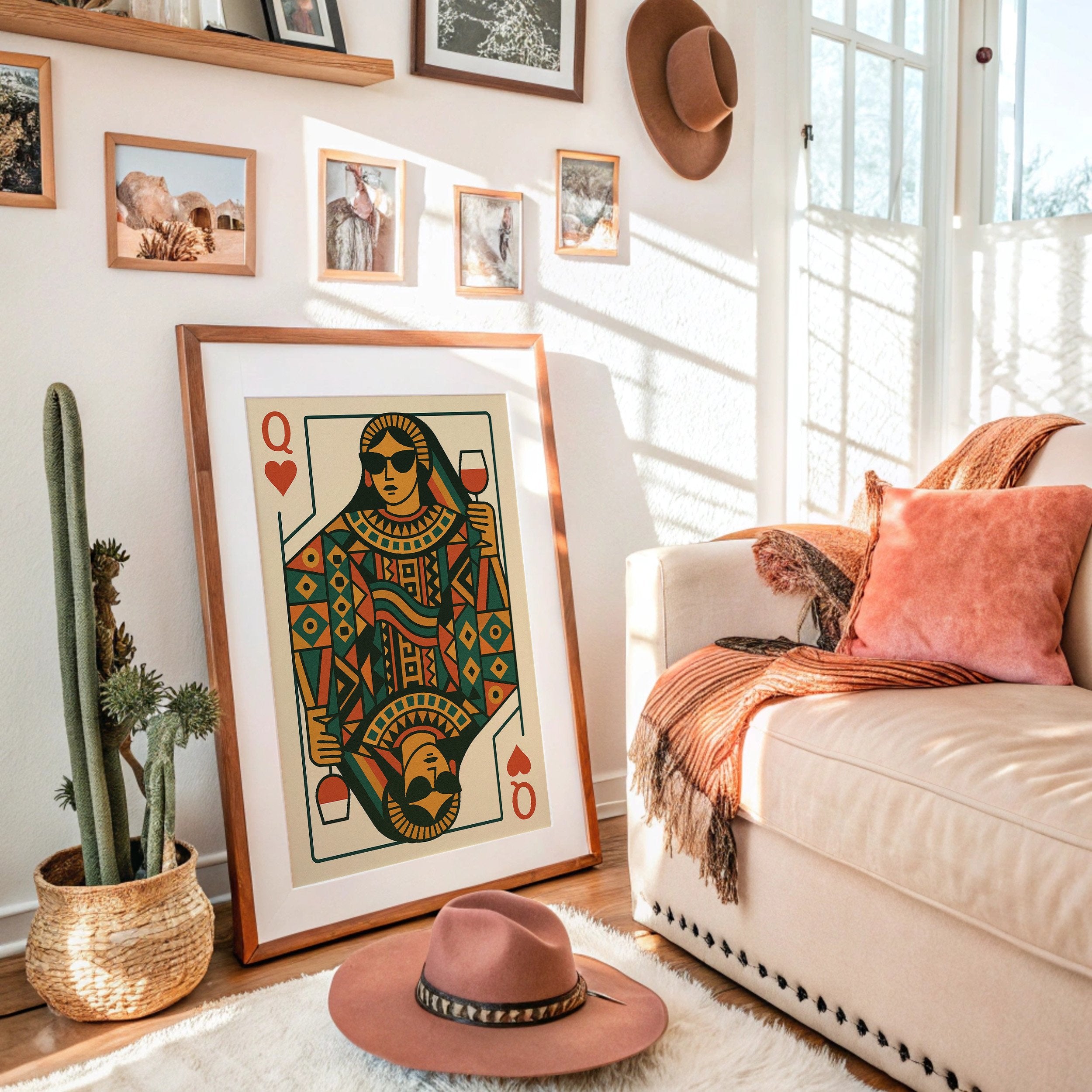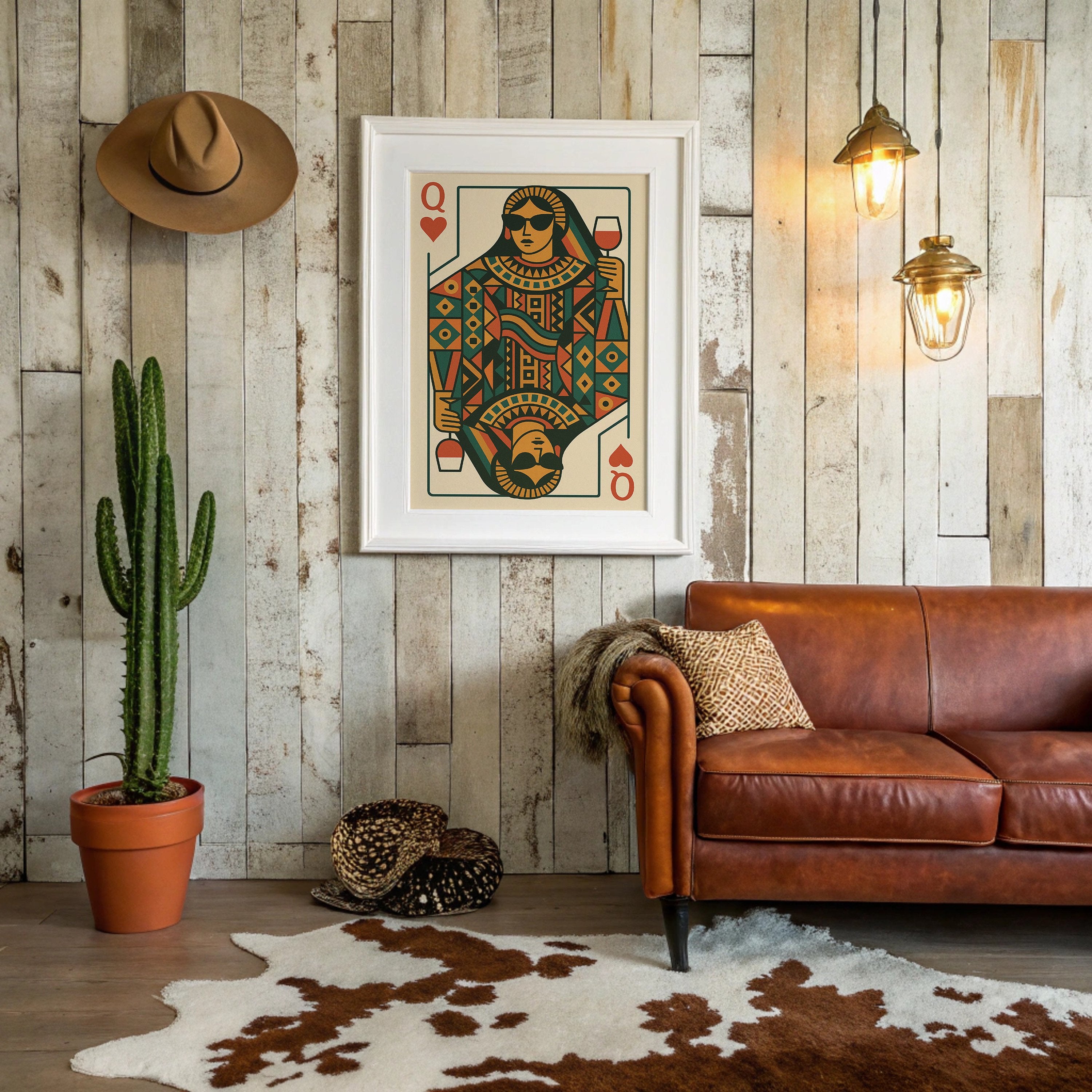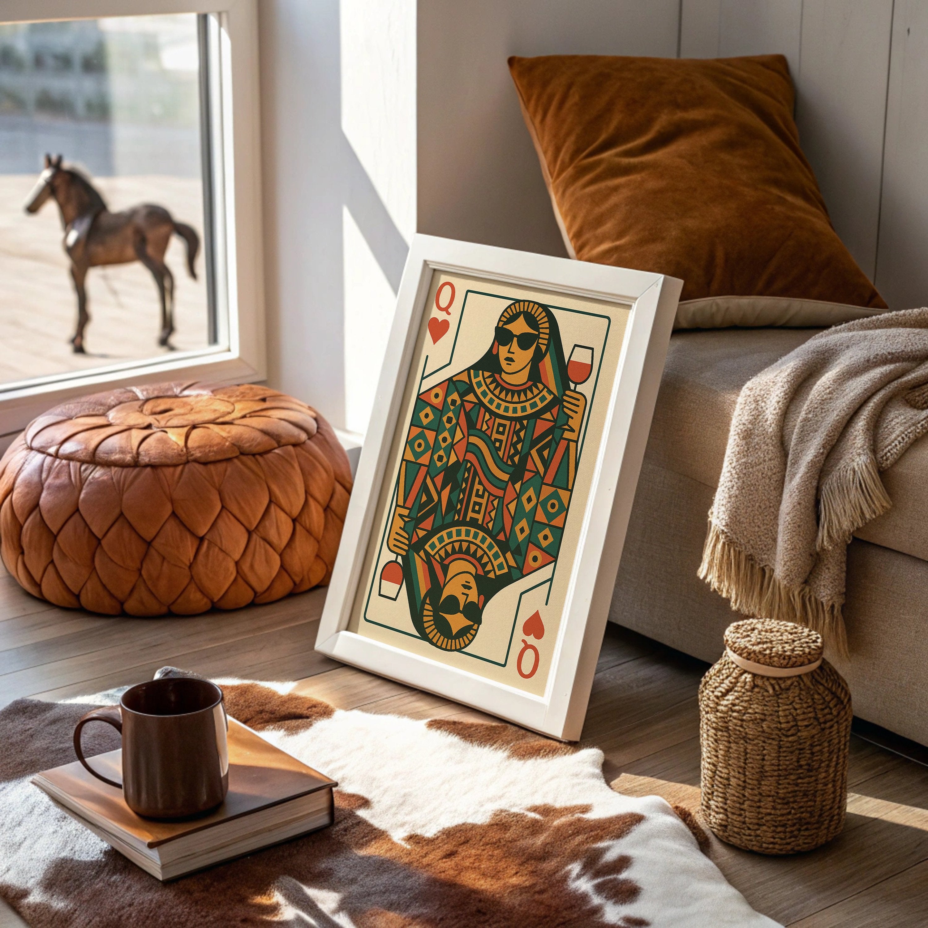 Cool confidence radiates from behind dark sunglasses as this contemporary queen raises her glass in a silent toast. Geometric patterns in rich terracotta, forest green, and golden amber create a mesmerizing tapestry of cultural fusion, where traditional playing card iconography meets bold, modern styling. This reimagined royal brings an air of sophisticated rebellion to the classic court card. This statement piece adds character and intrigue to home bars, game rooms, or creative spaces where conversation starters reign supreme.