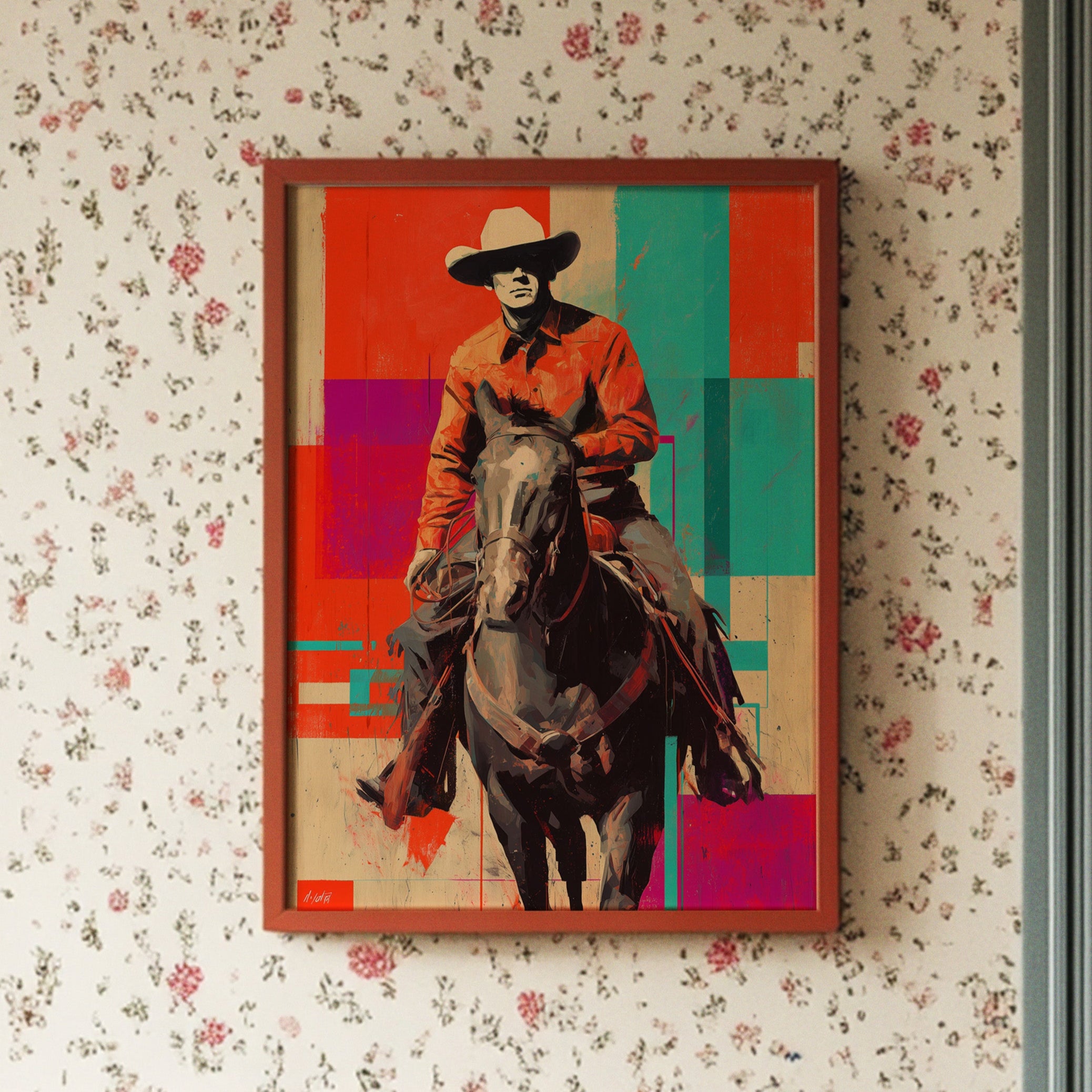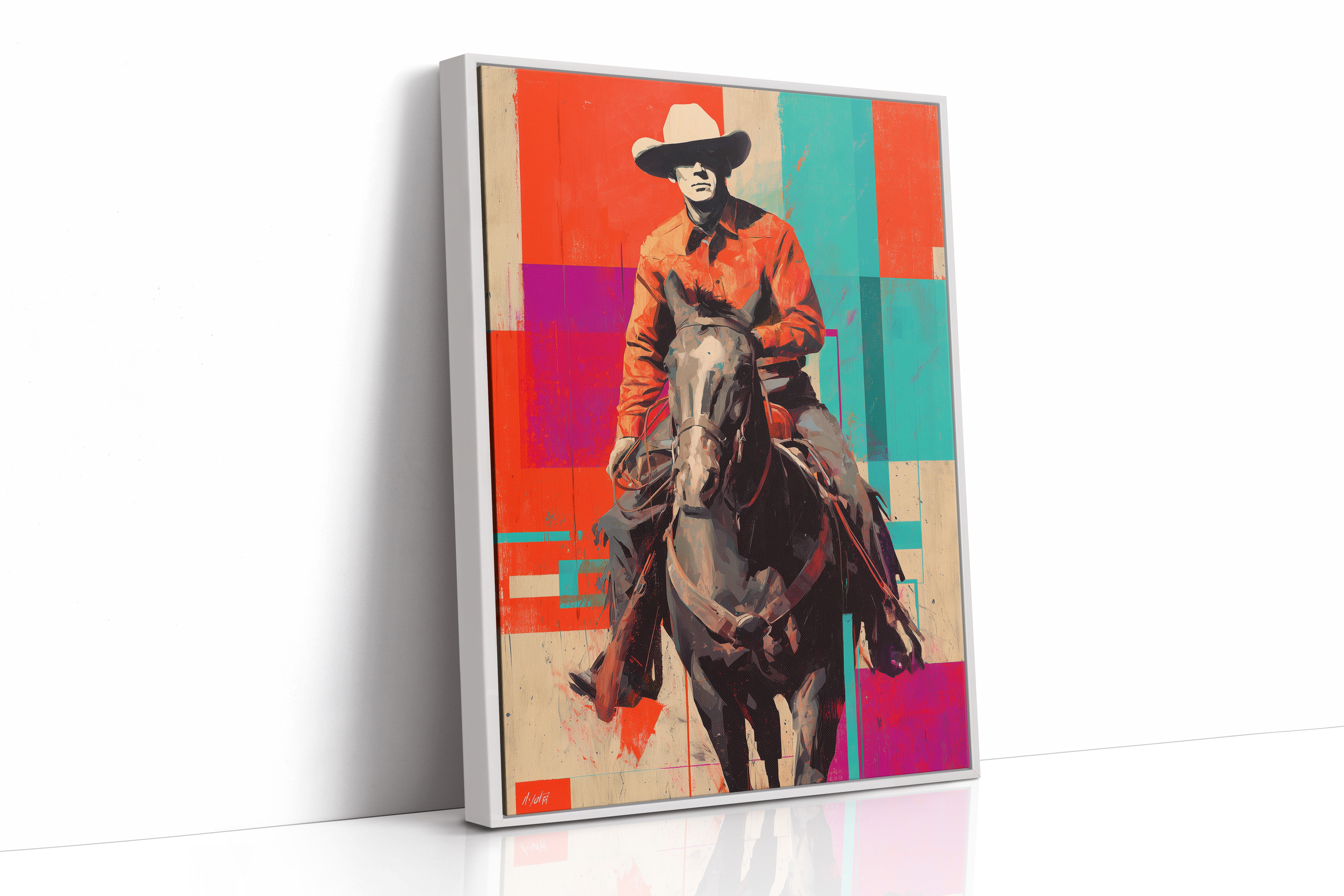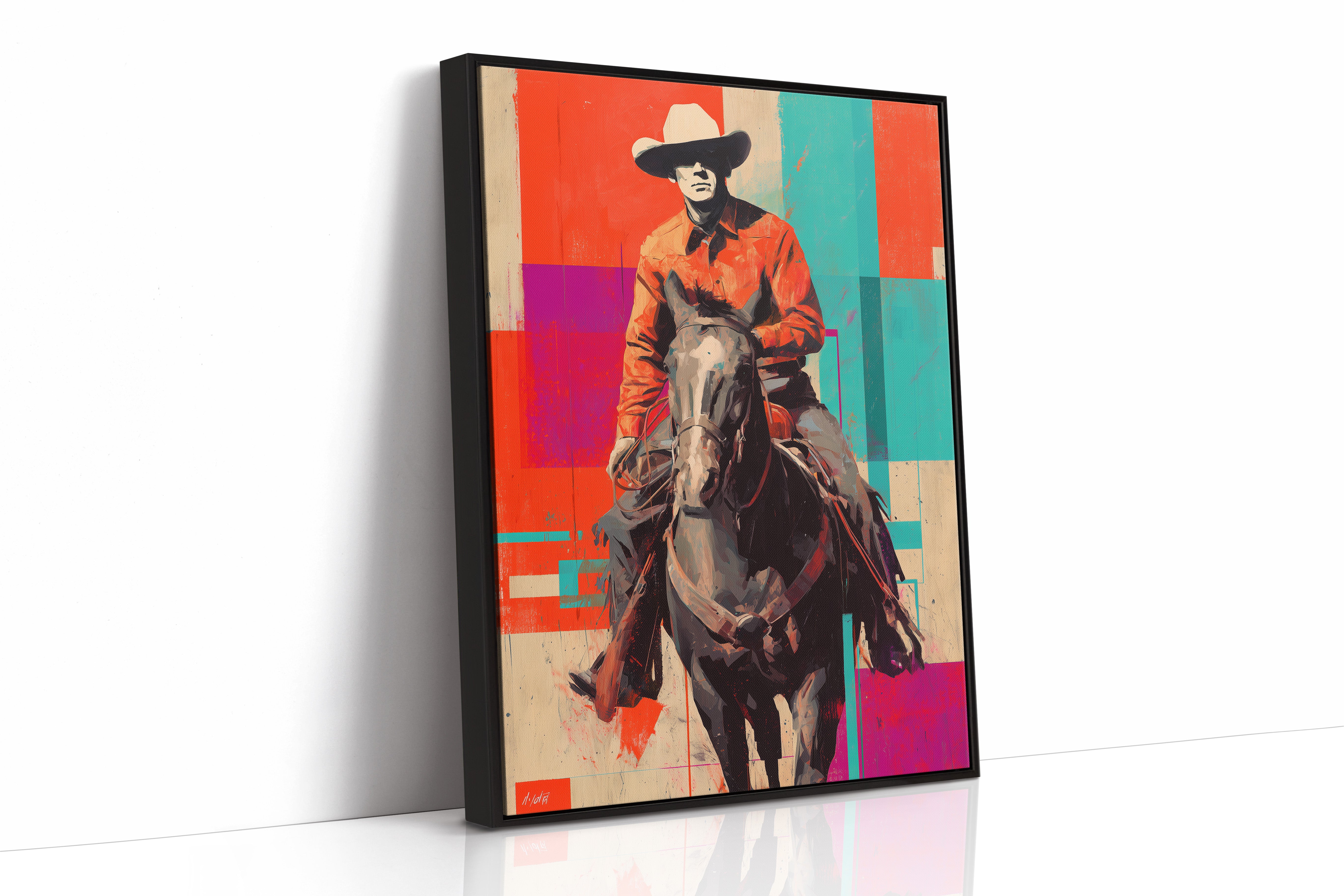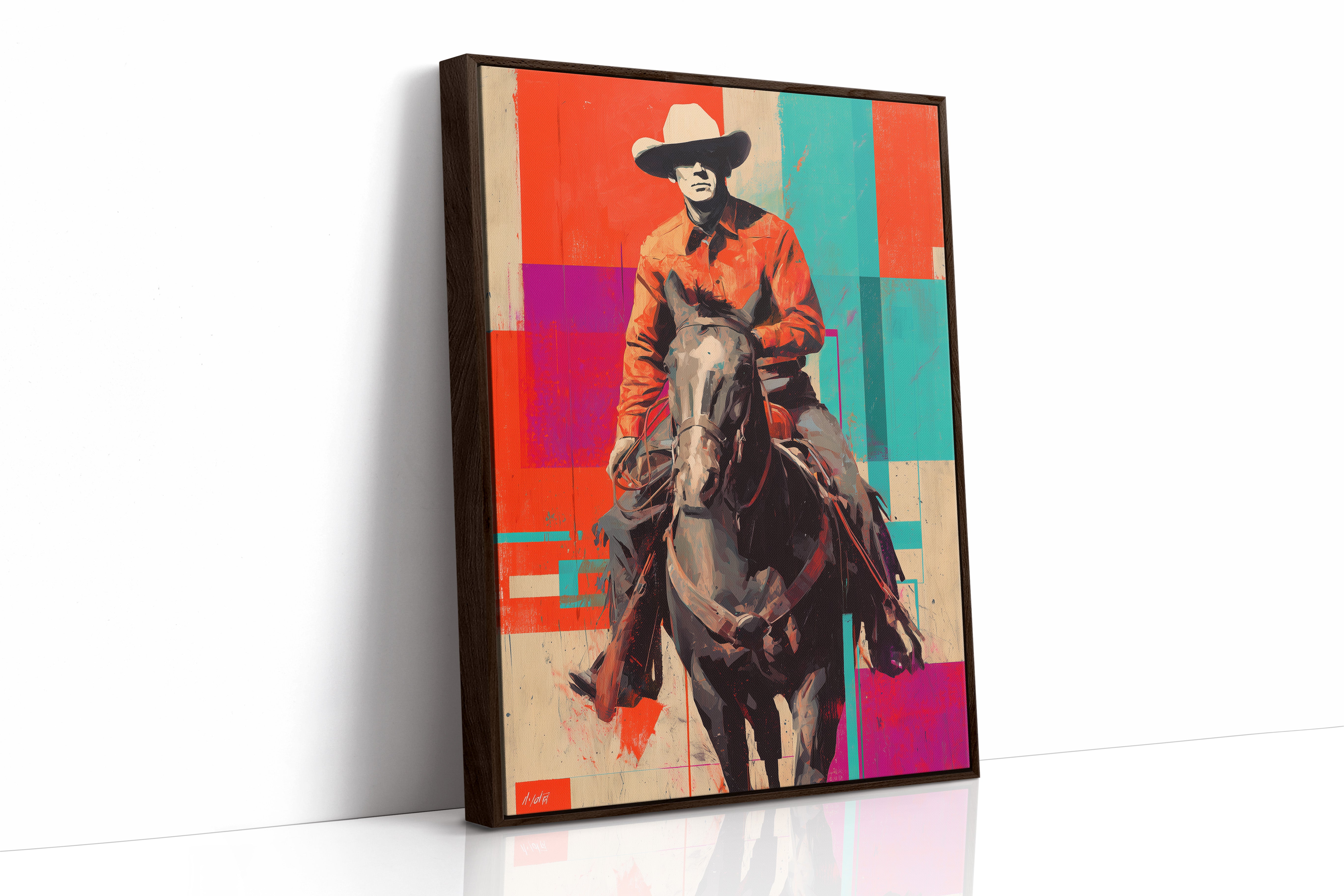 A contemporary twist on classic Western imagery emerges through bold geometric color blocks of coral, turquoise, and purple. The composition masterfully blends traditional cowboy culture with pop art sensibilities, creating a striking visual dialogue between past and present. The rider and horse silhouette stands proud against an artfully segmented background, merging rustic authenticity with modern artistic expression. Perfect for adding a sophisticated Western accent to contemporary living spaces, home offices, or upscale ranch-style interiors.