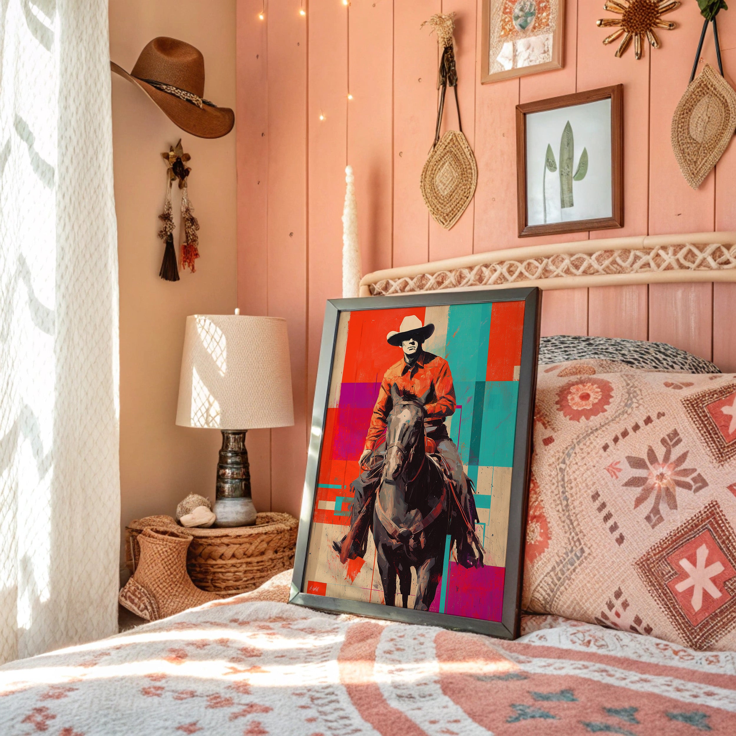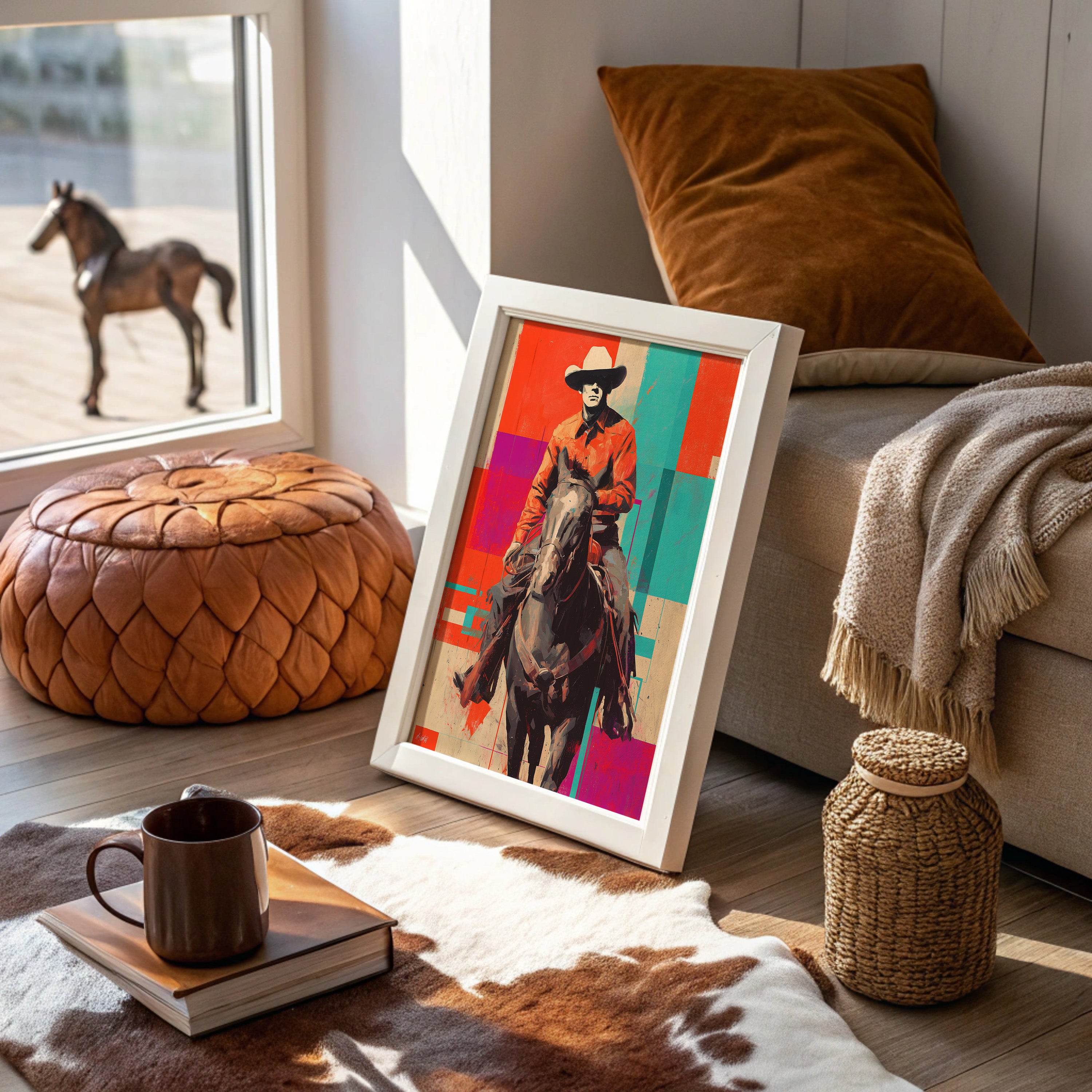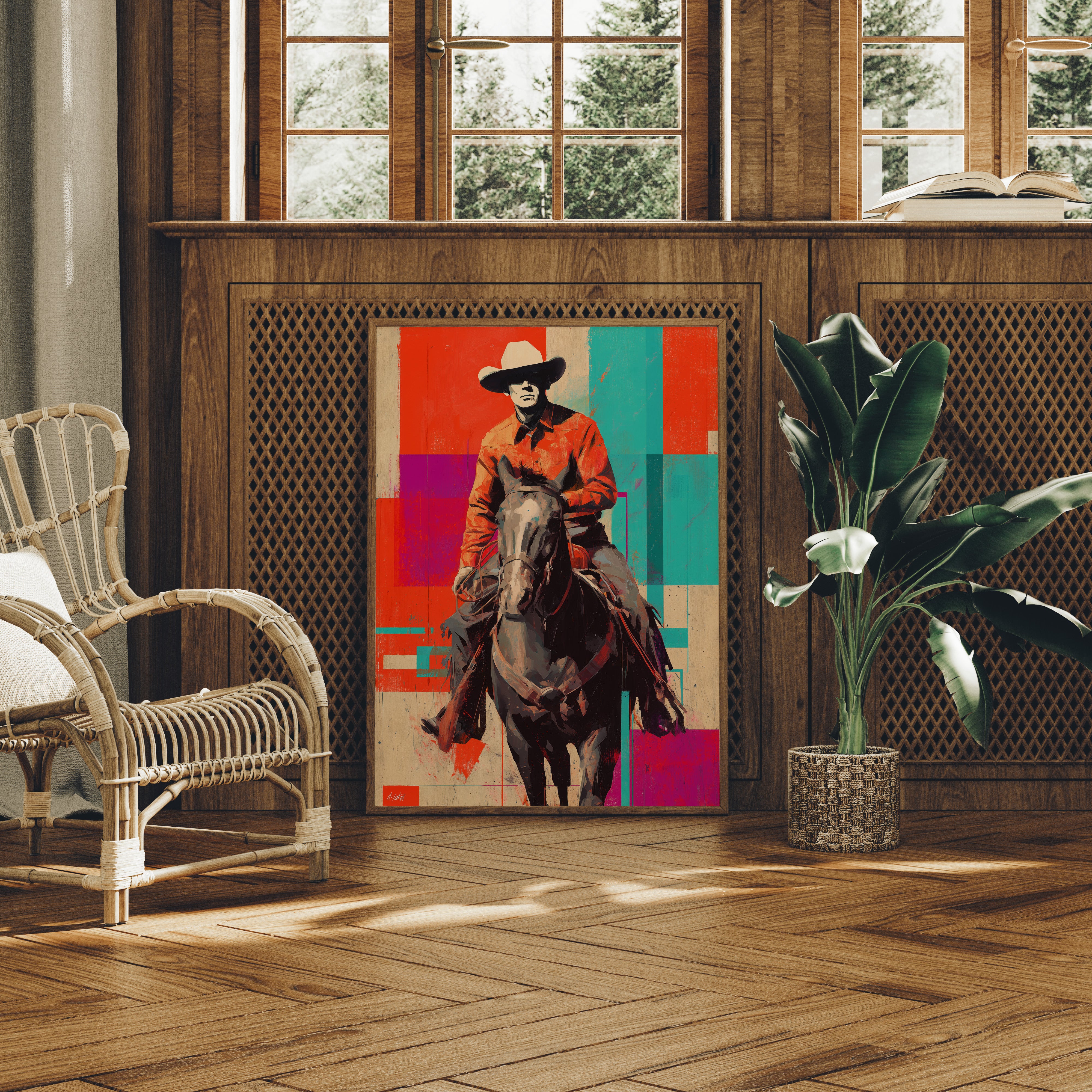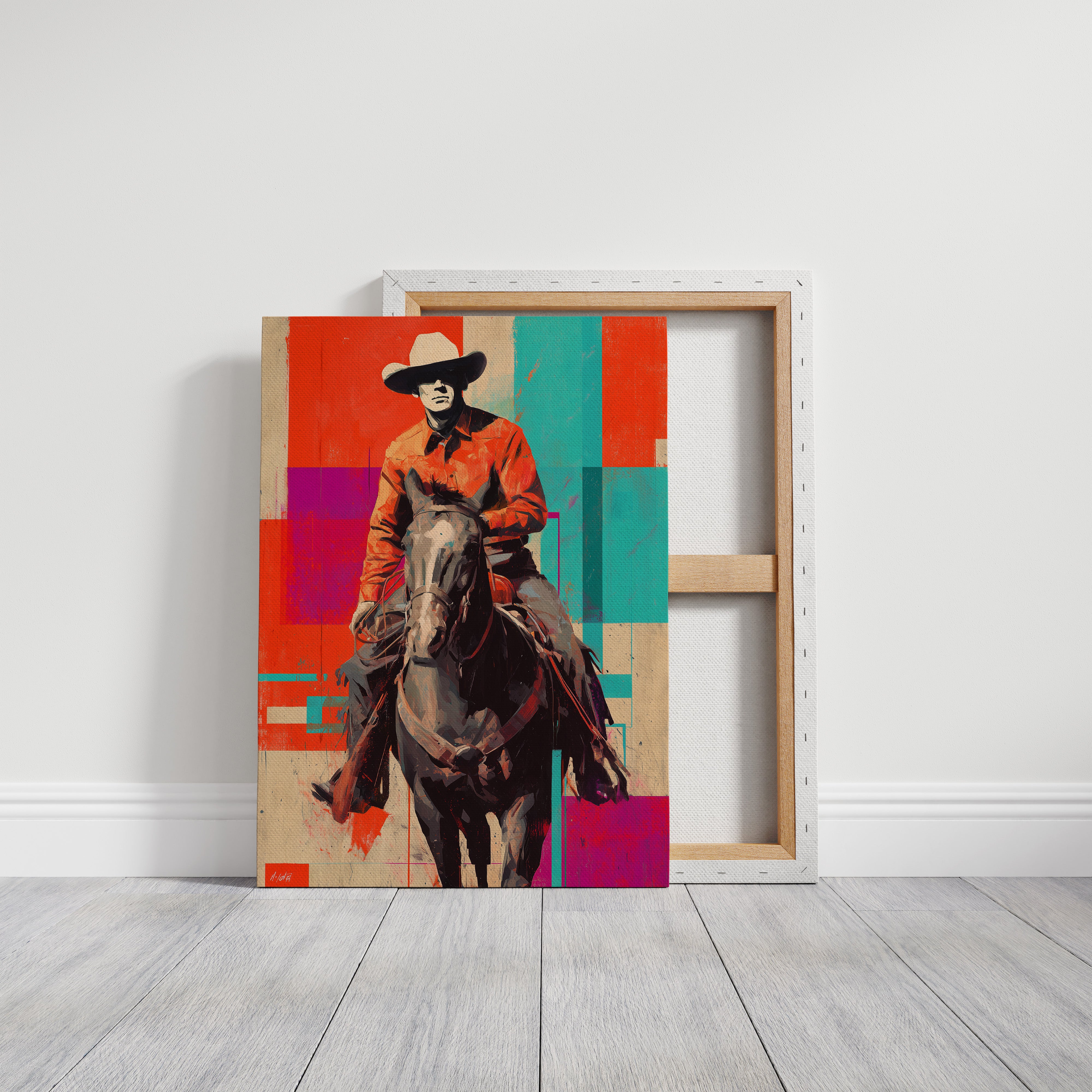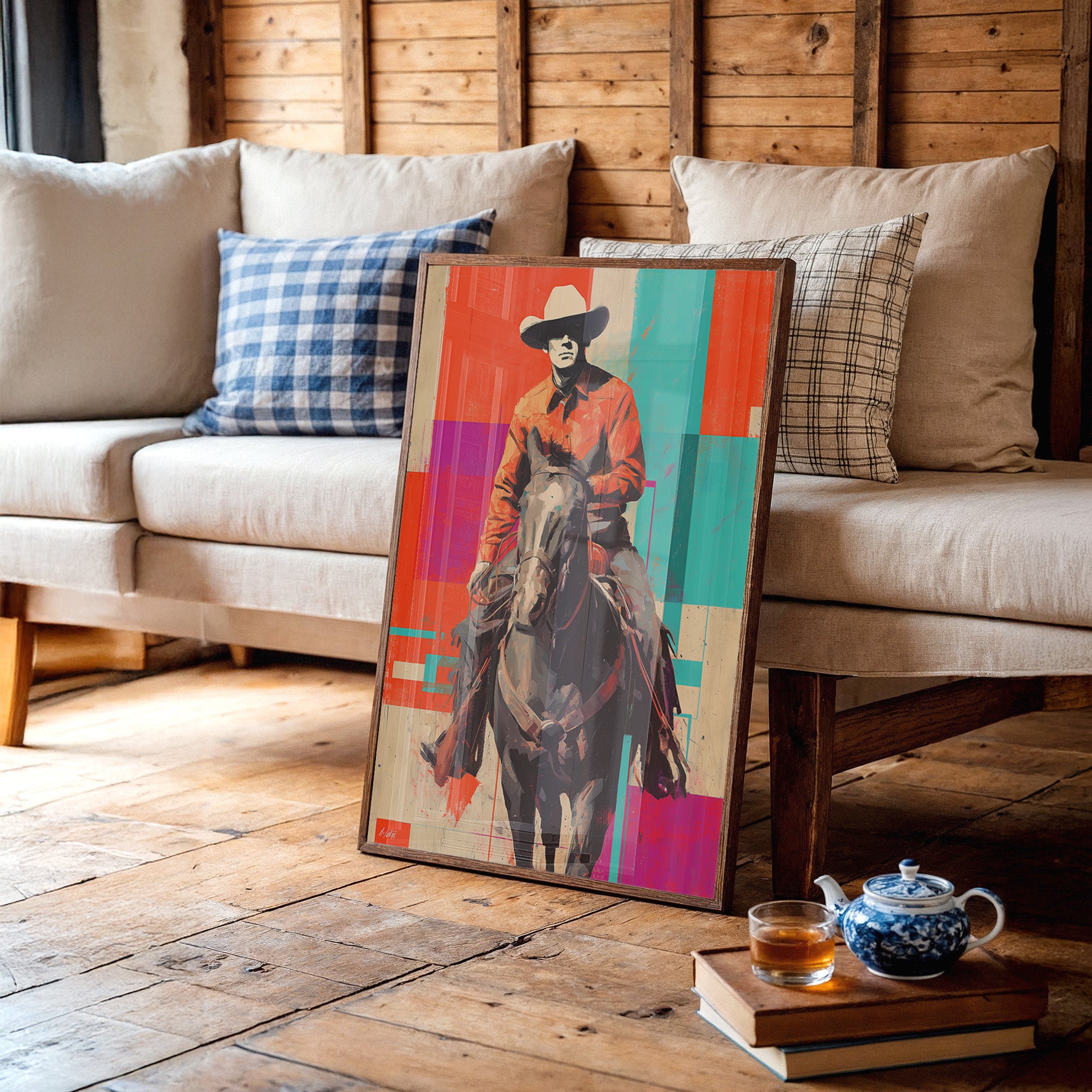A contemporary twist on classic Western imagery emerges through bold geometric color blocks of coral, turquoise, and purple. The composition masterfully blends traditional cowboy culture with pop art sensibilities, creating a striking visual dialogue between past and present. The rider and horse silhouette stands proud against an artfully segmented background, merging rustic authenticity with modern artistic expression. Perfect for adding a sophisticated Western accent to contemporary living spaces, home offices, or upscale ranch-style interiors.